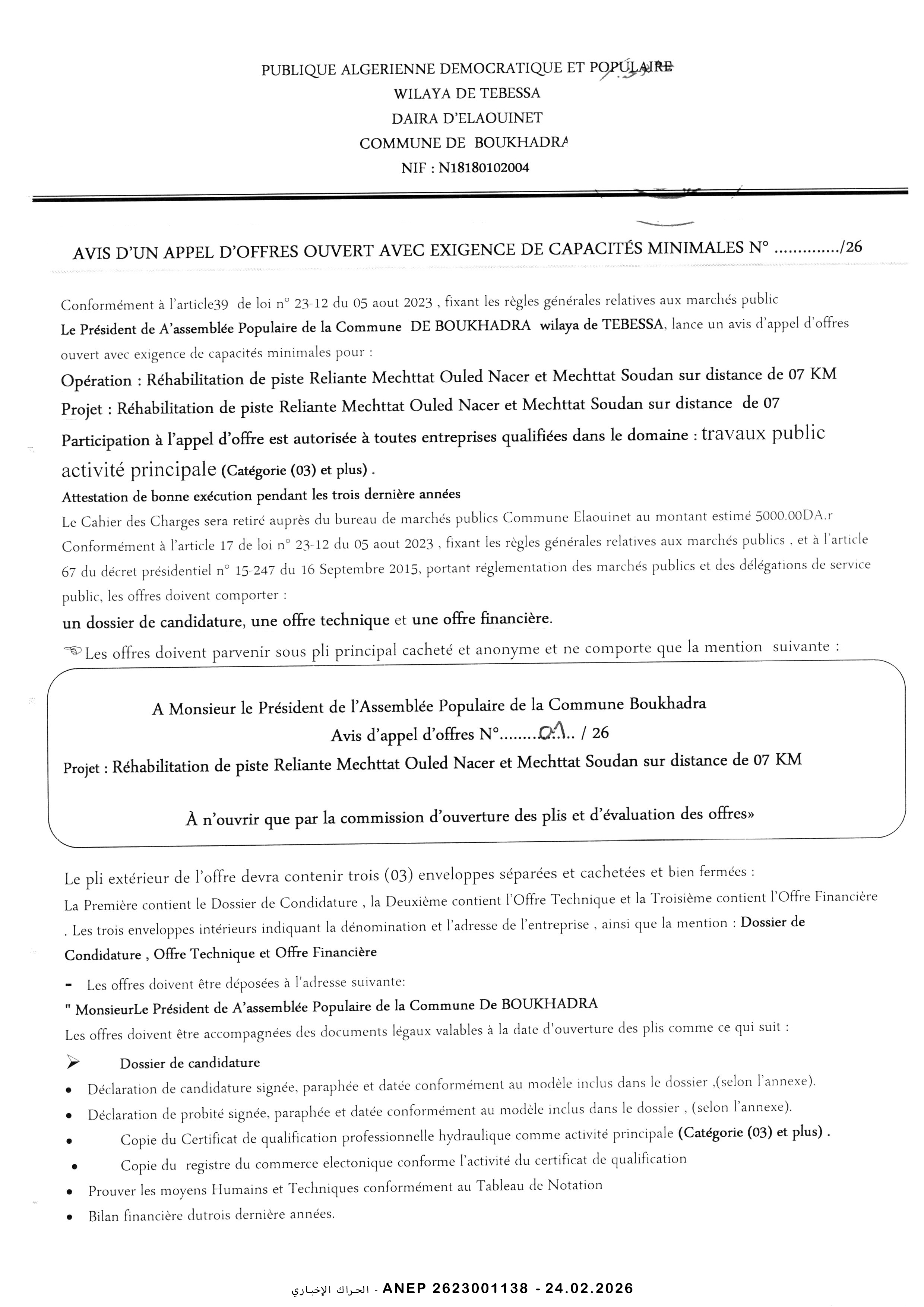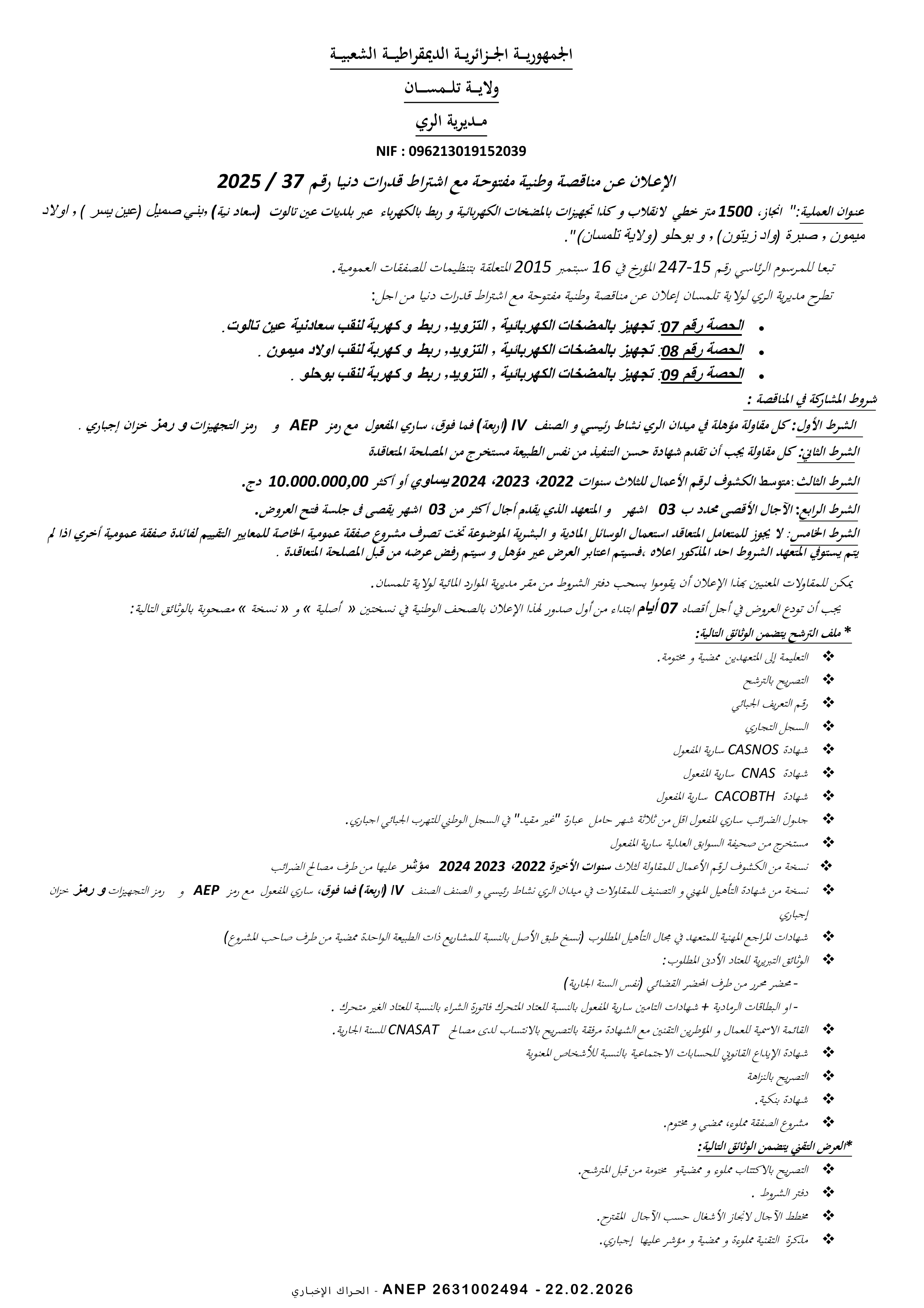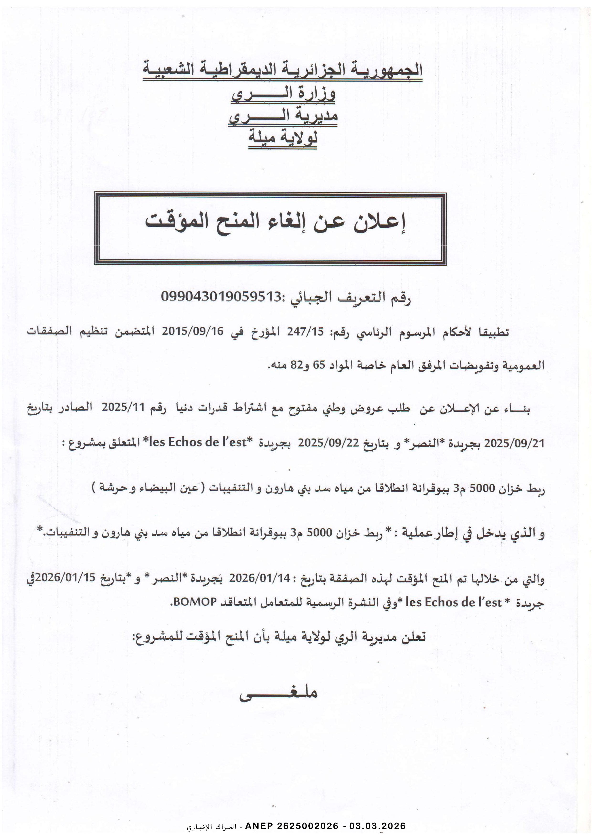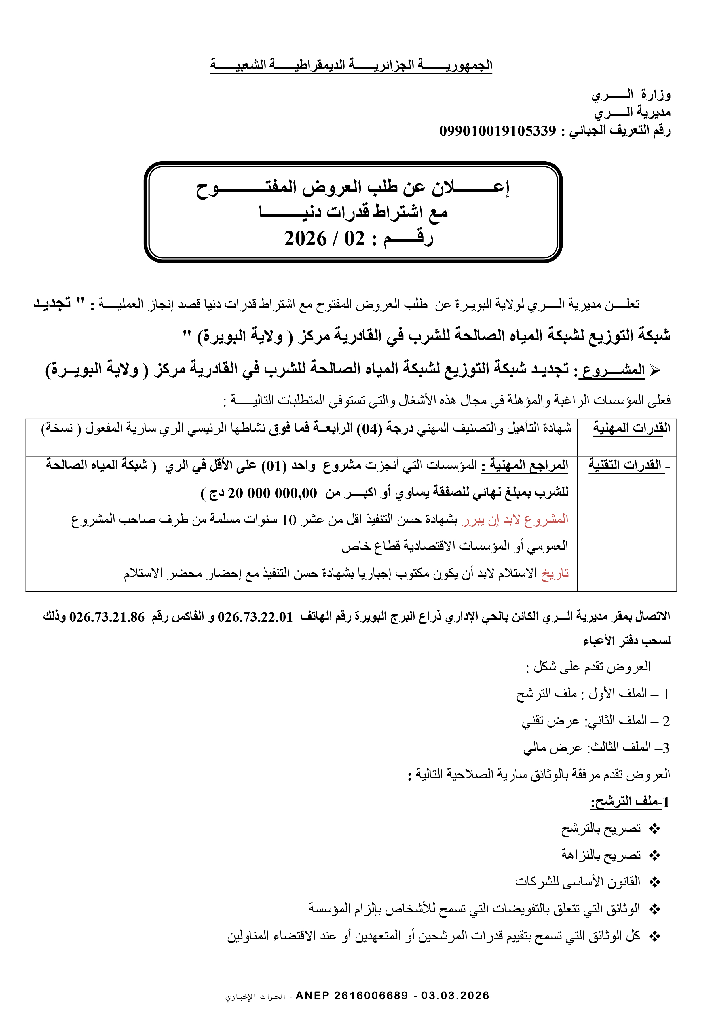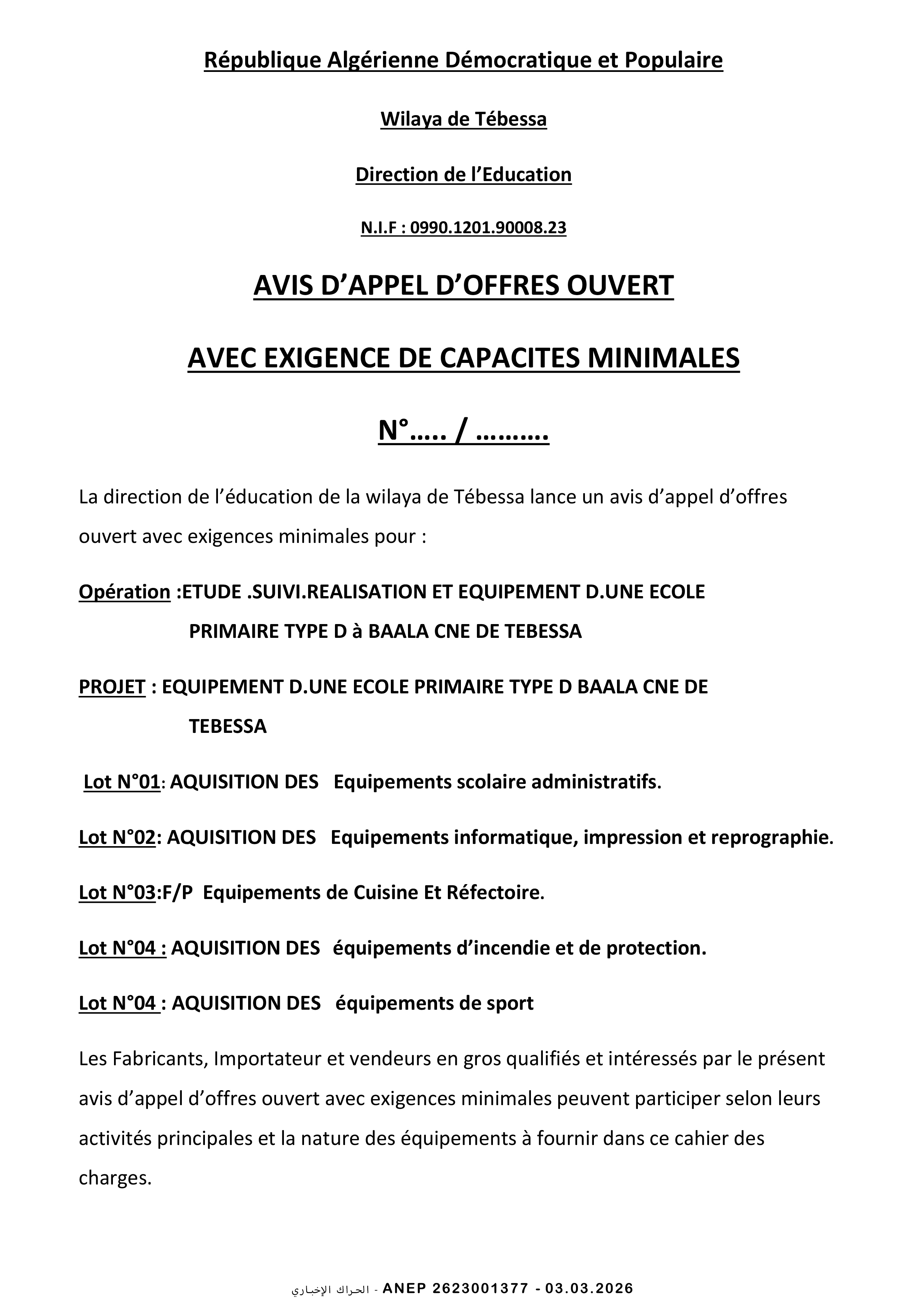 إعلان عن مناقصة وطنية مفتوحة
