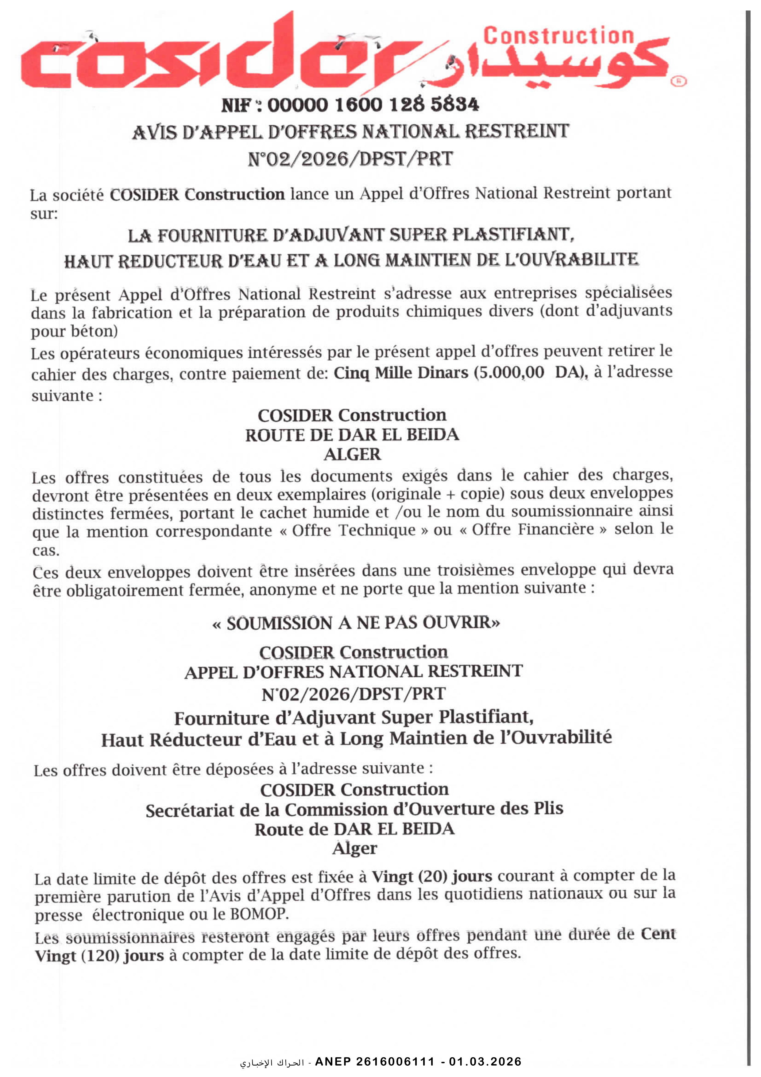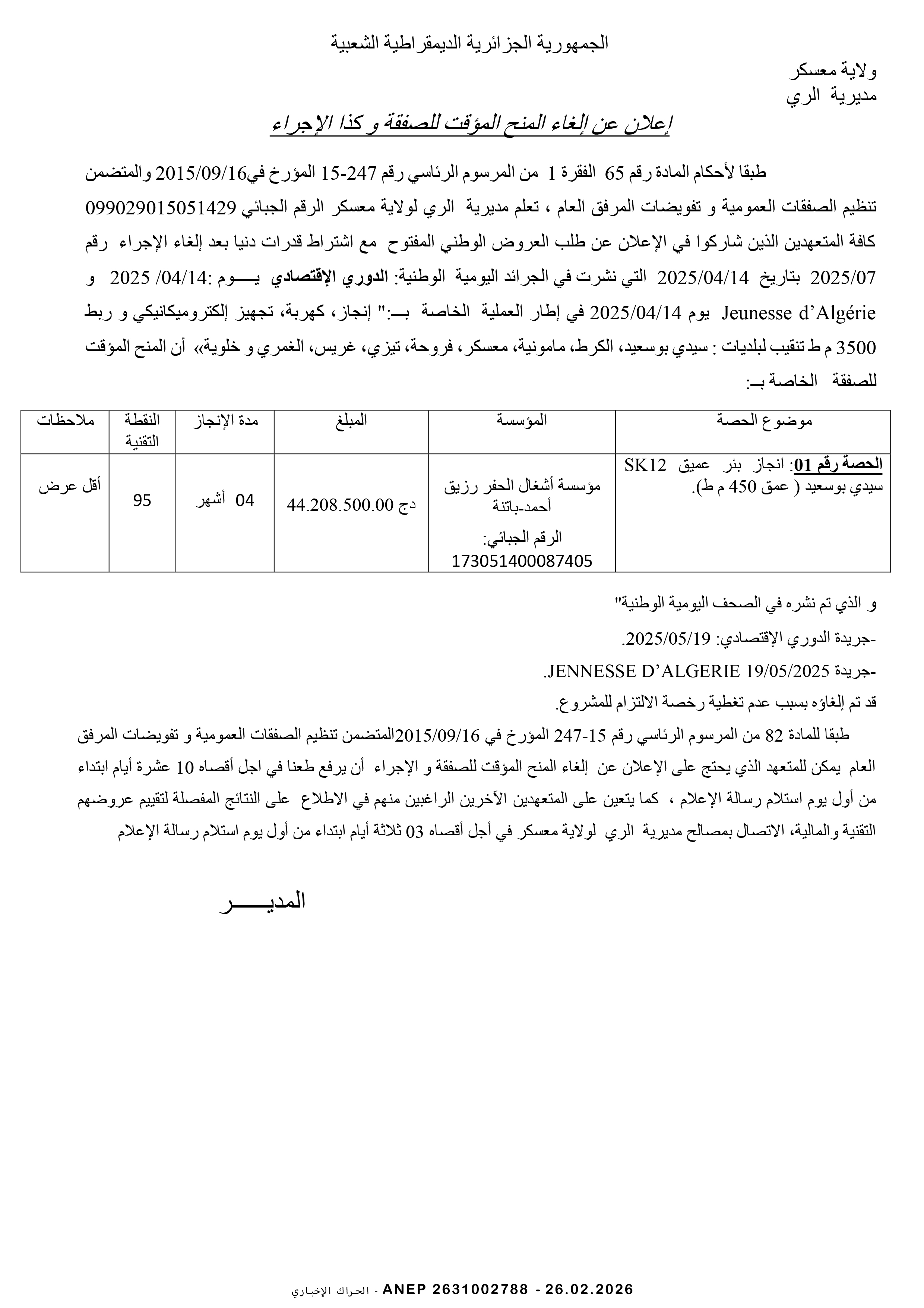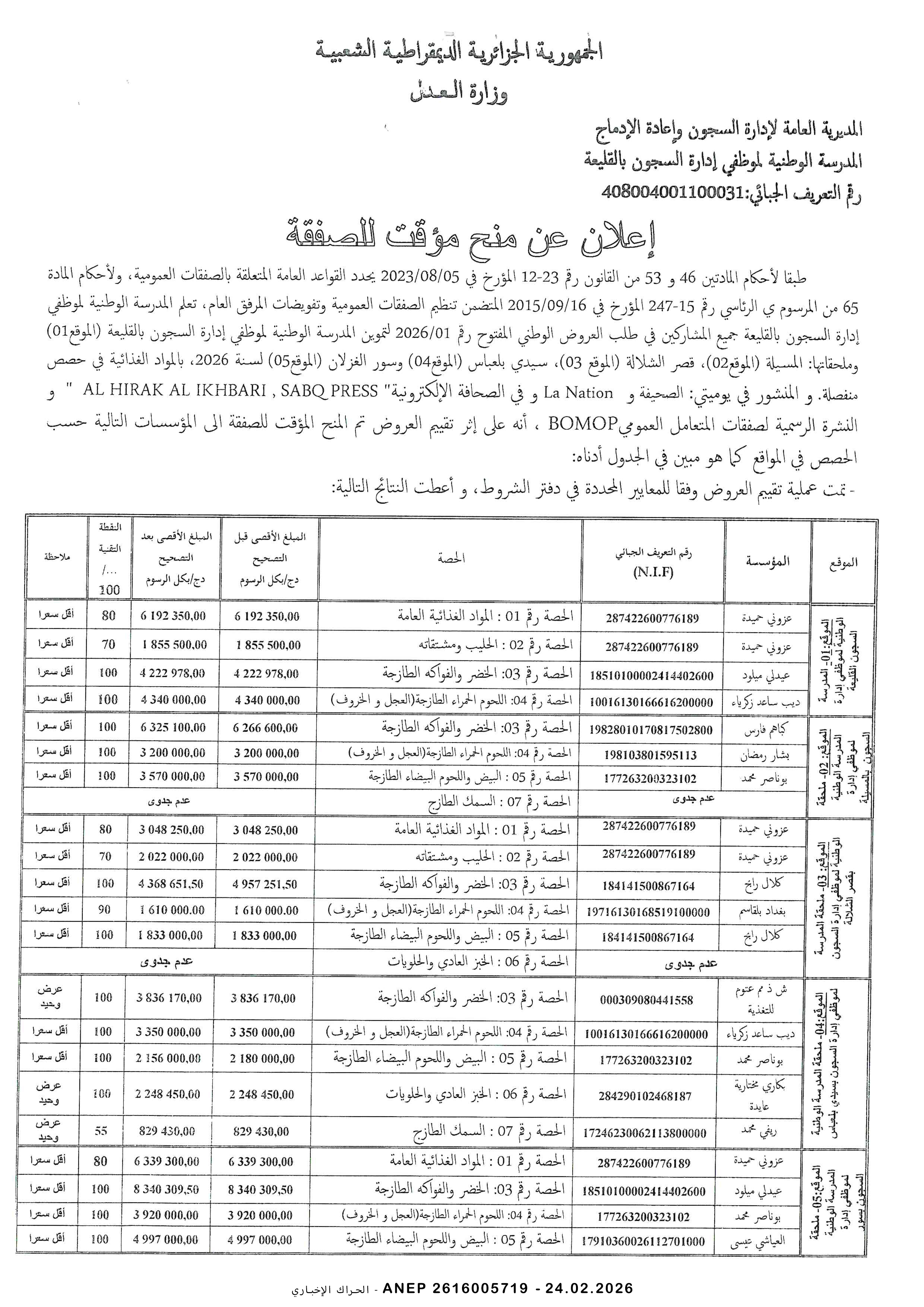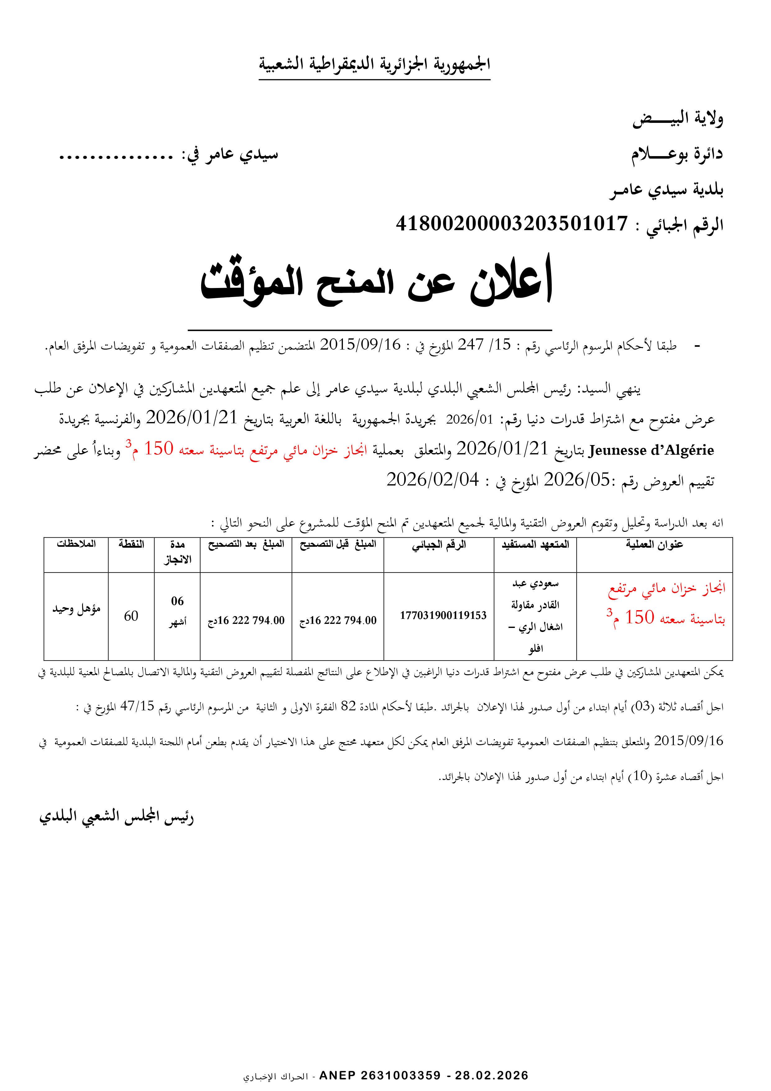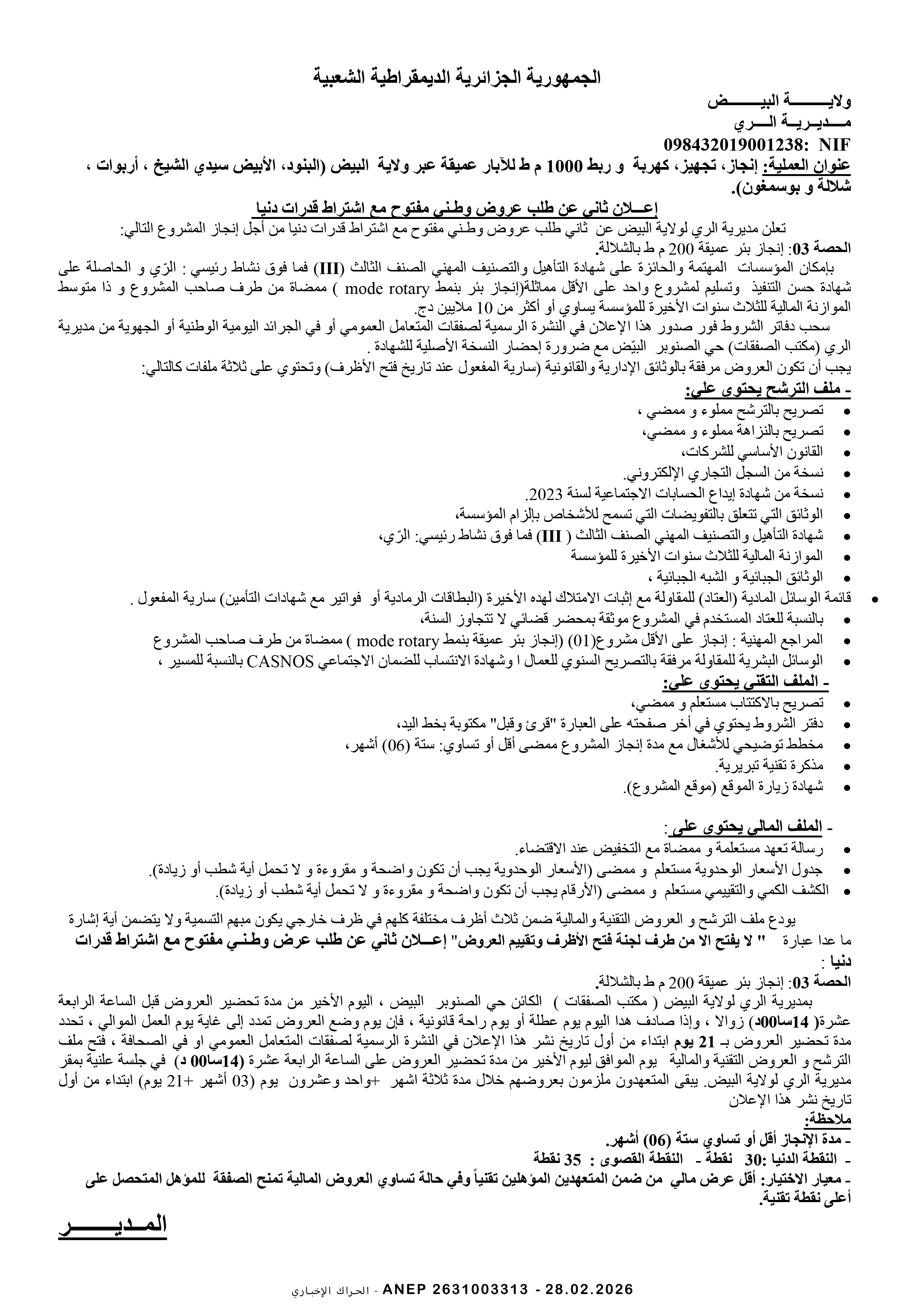 إعلان عن مناقصة وطنية مفتوحة