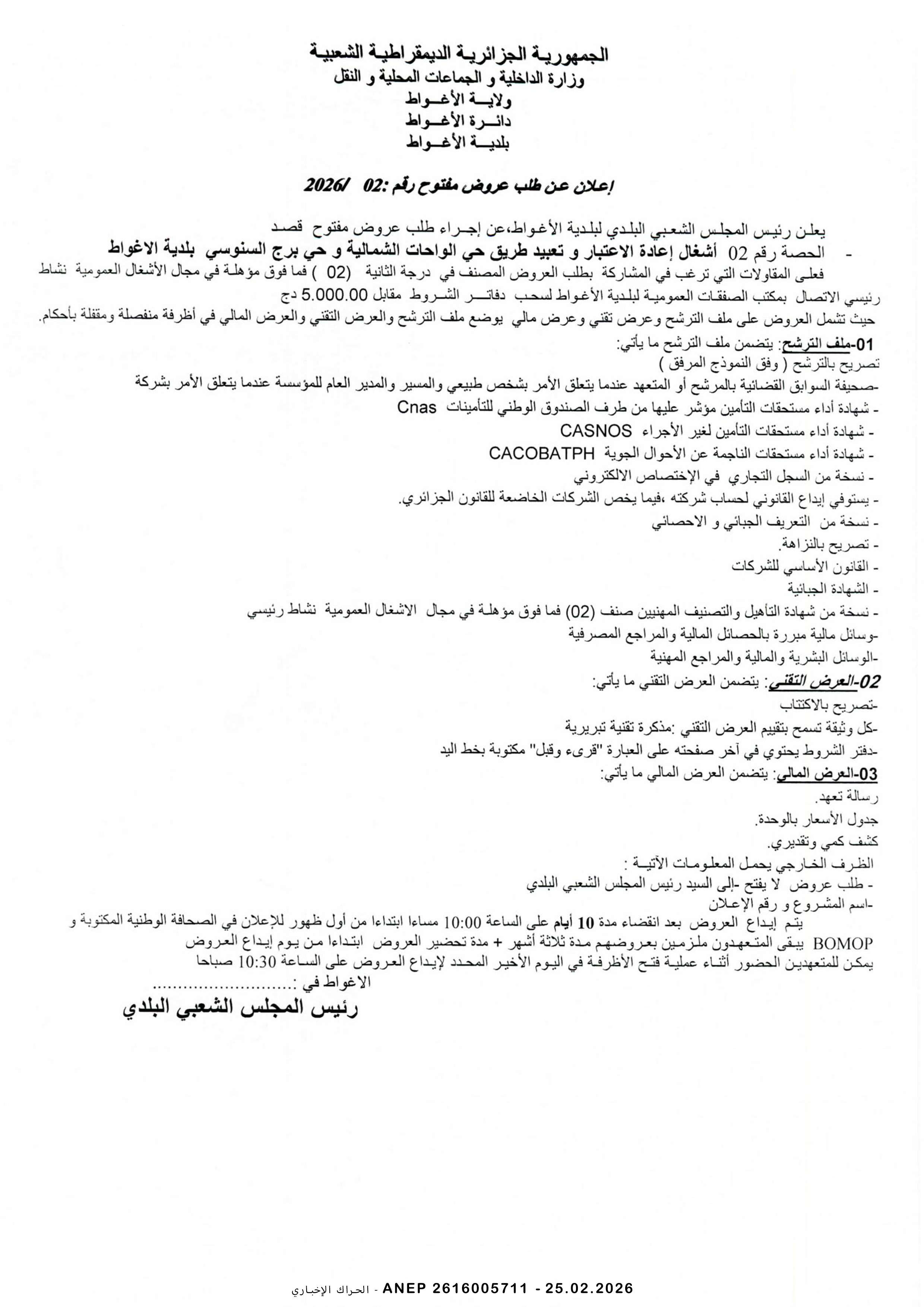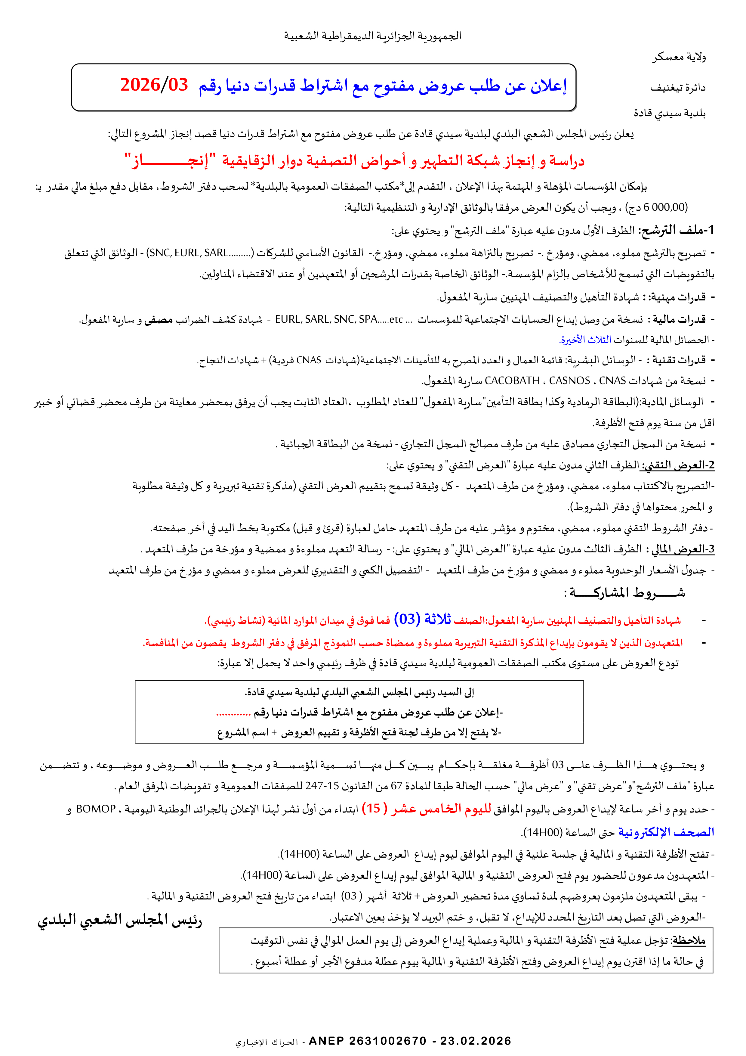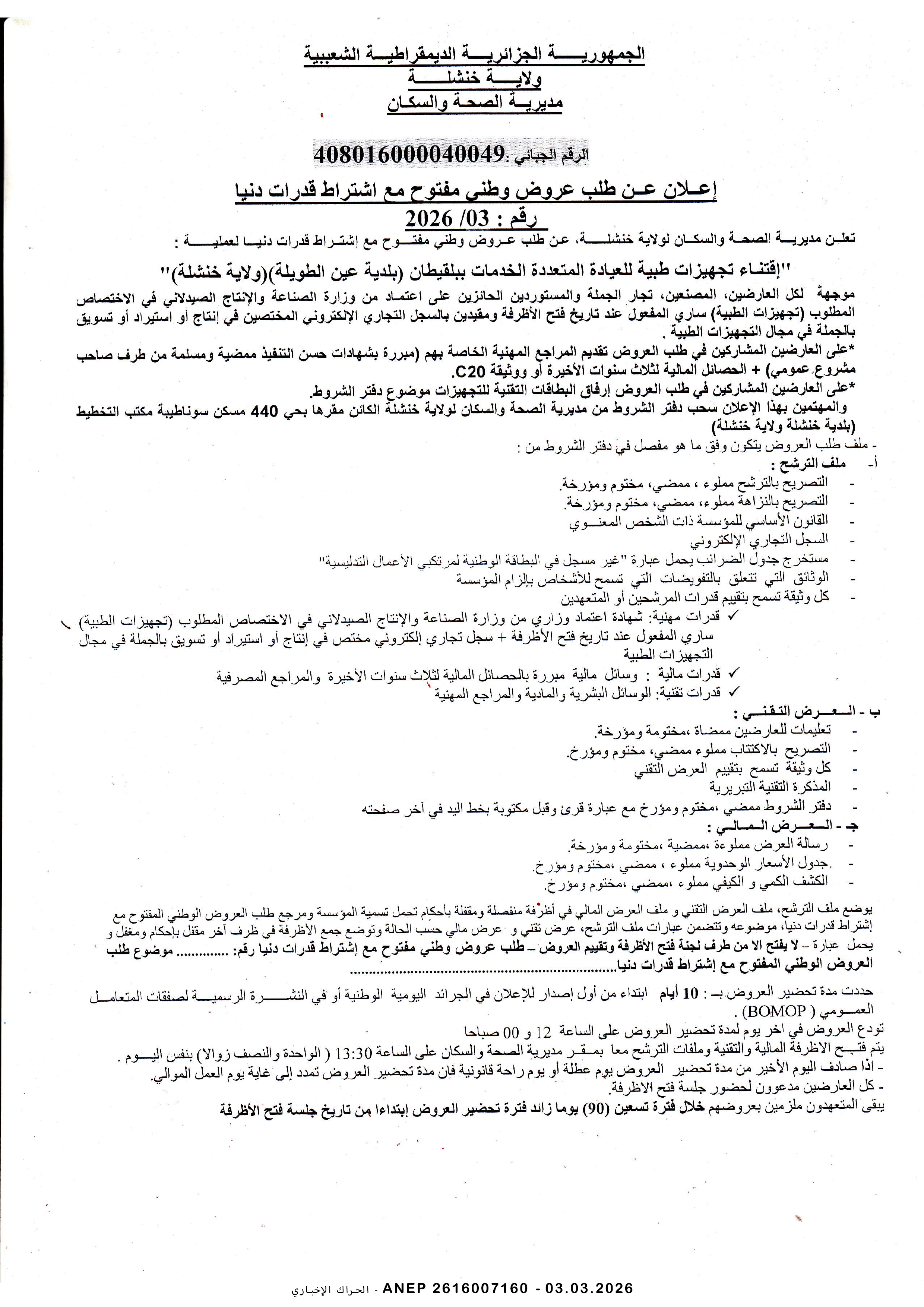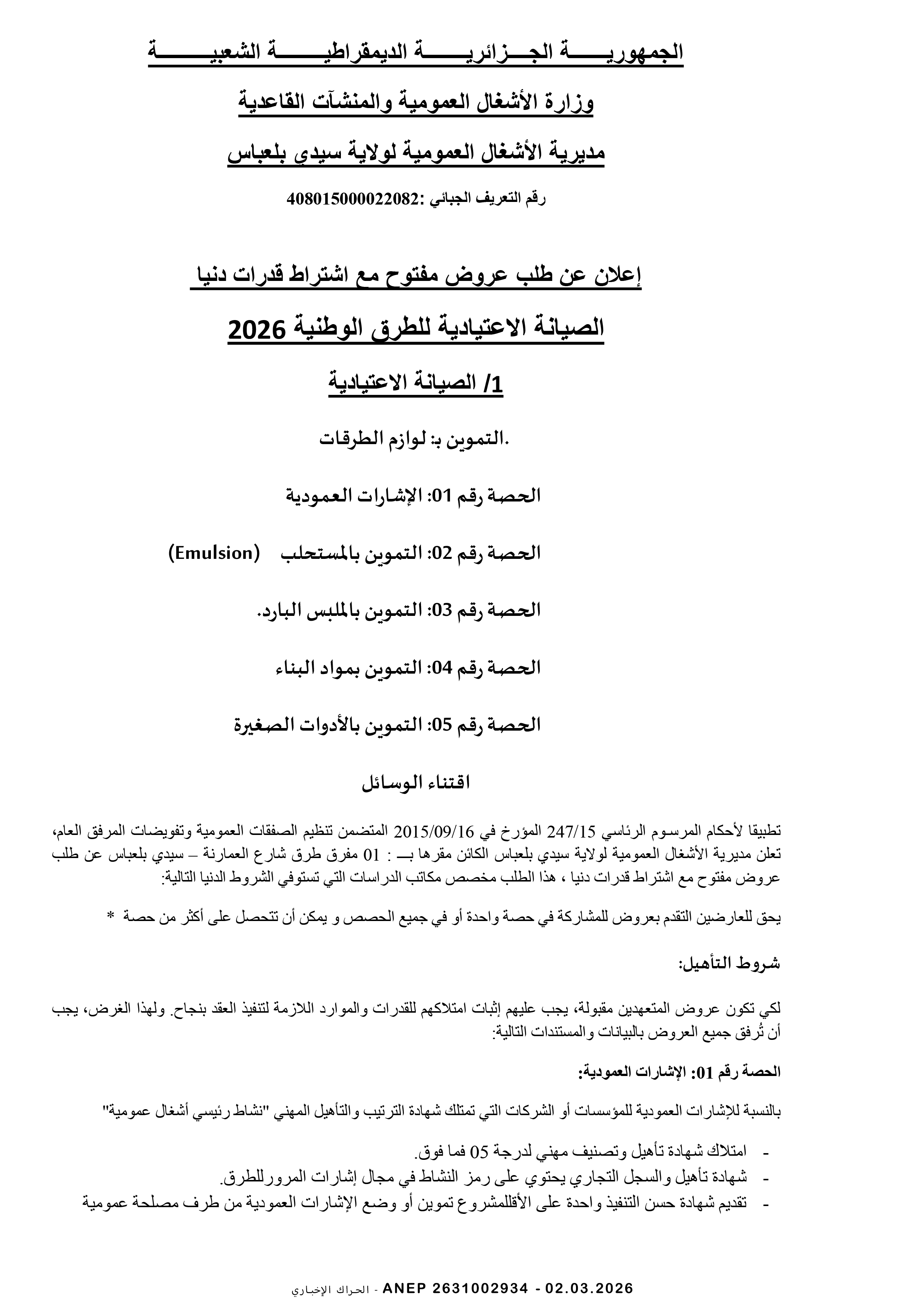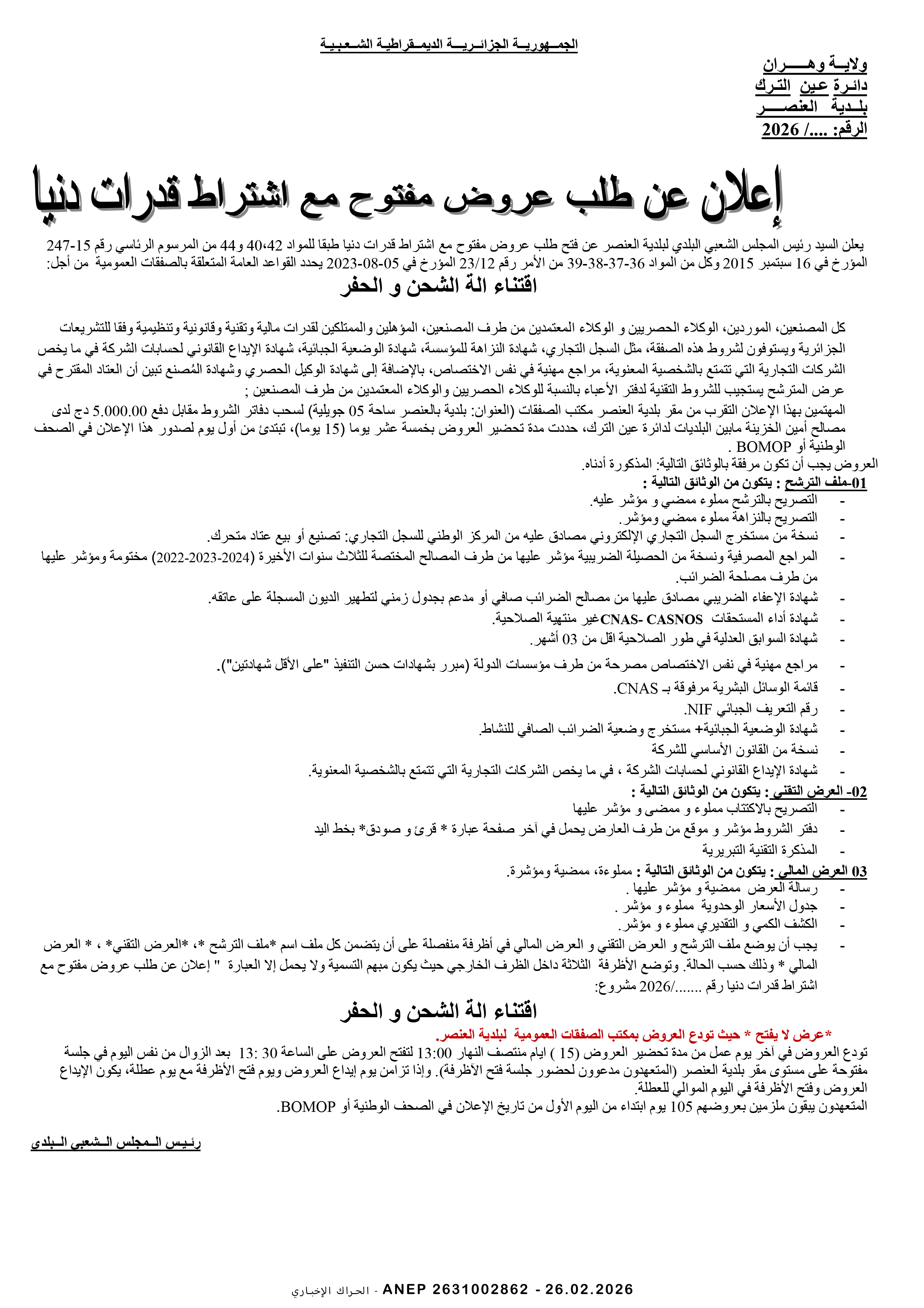 إعلان عن طلب عروض وطني مفتوح