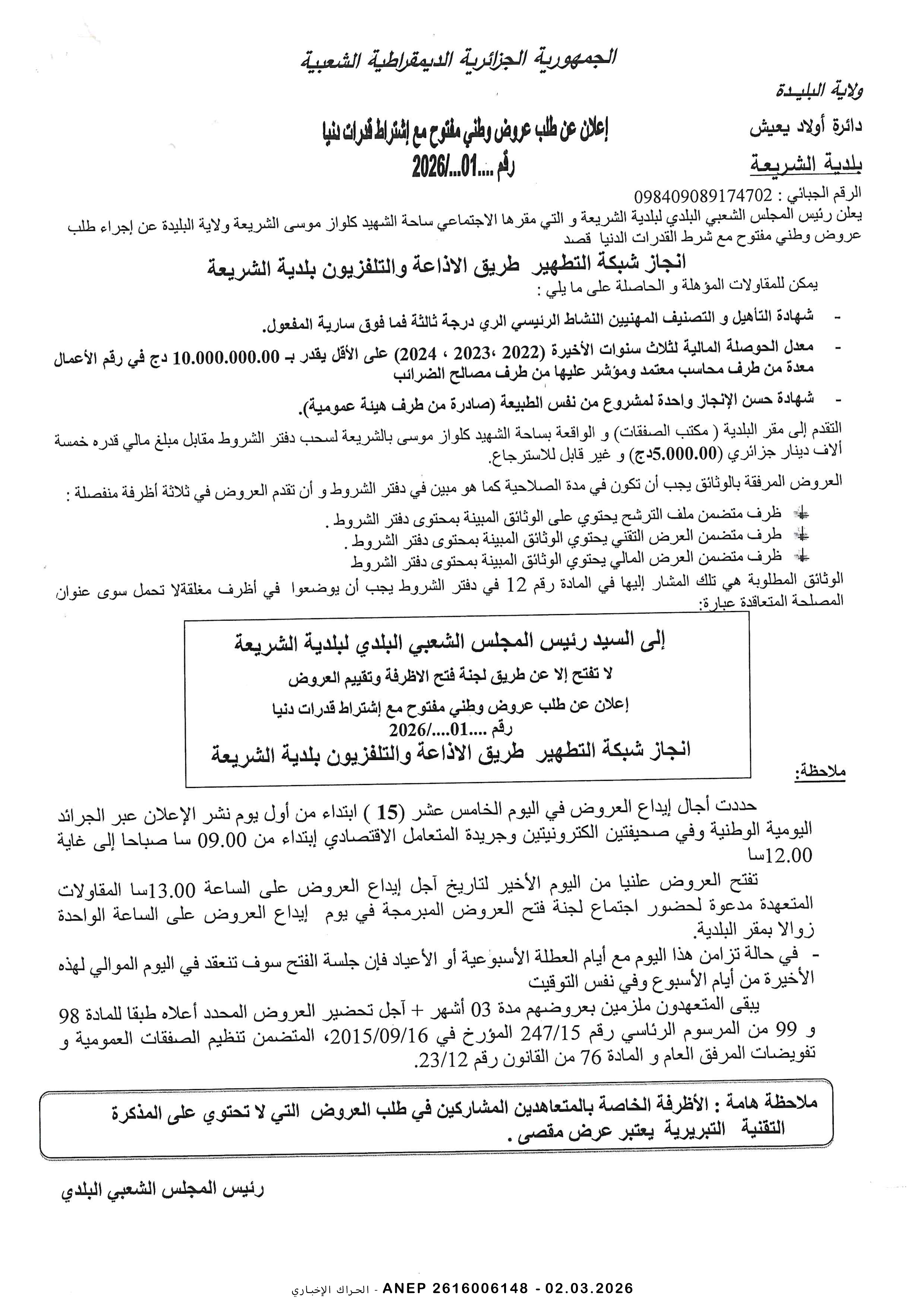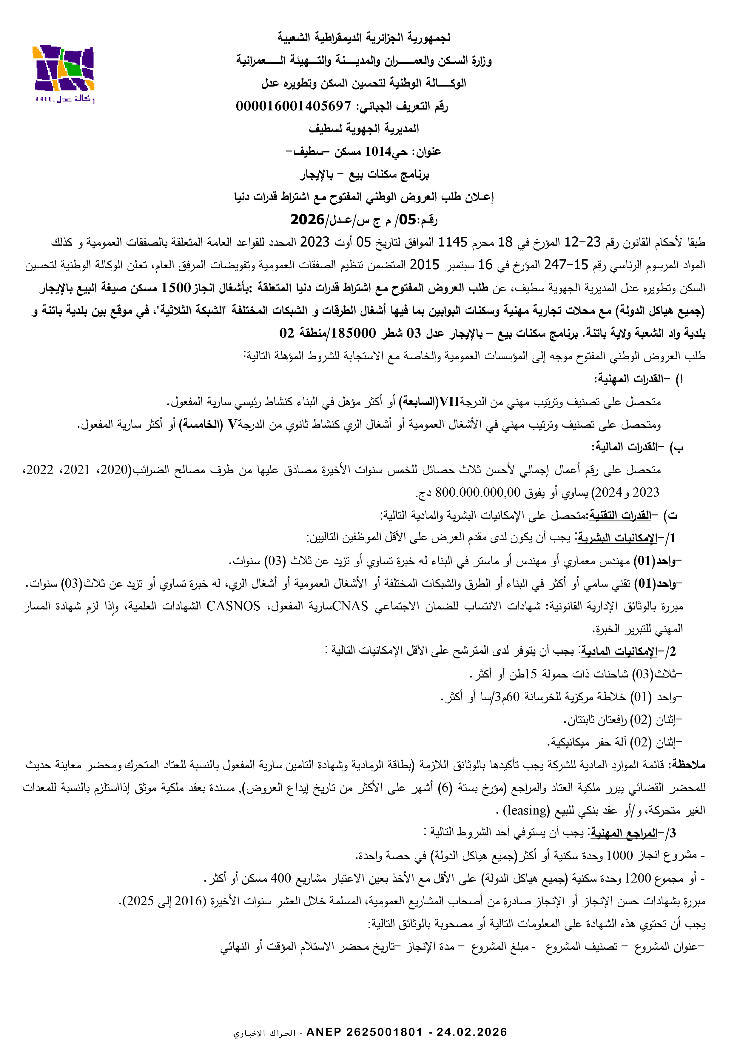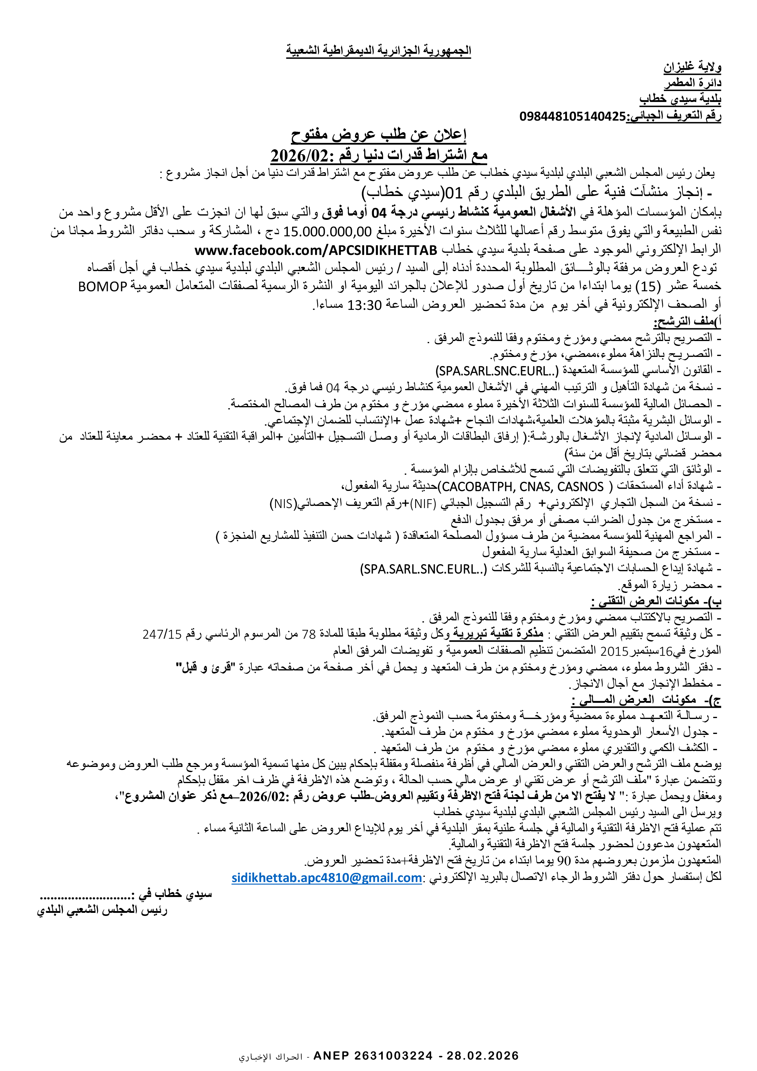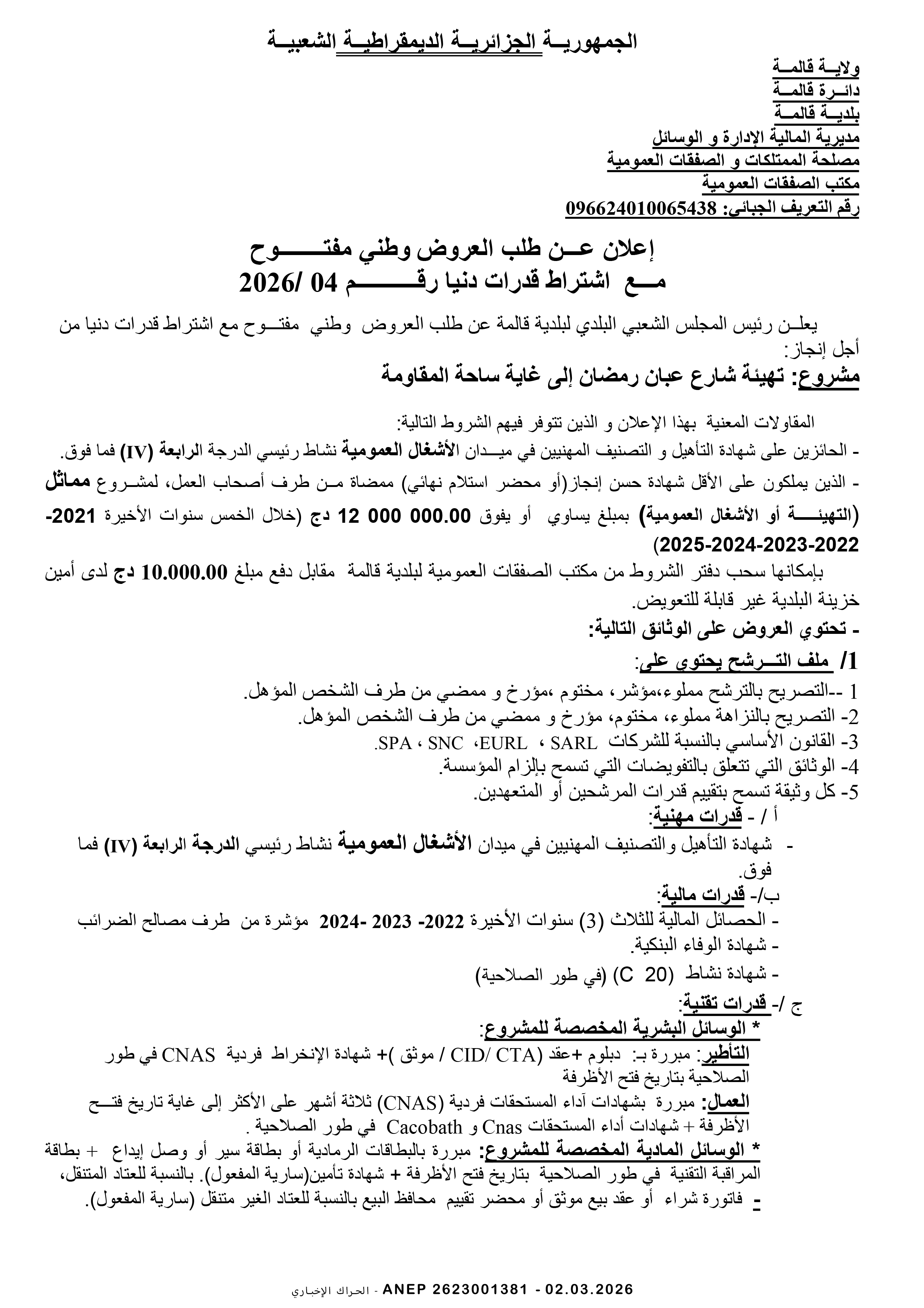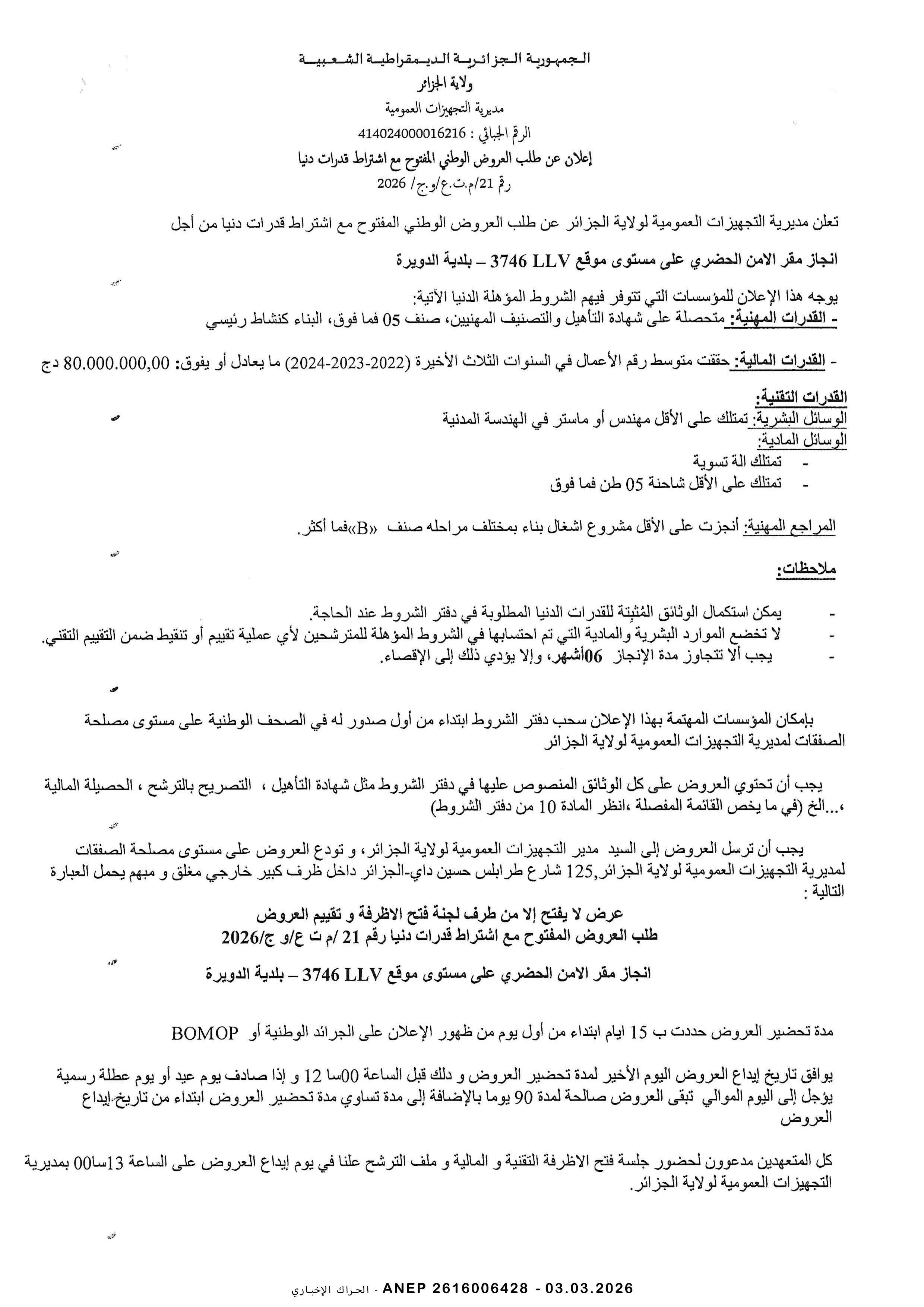 إعلان عن طلب عروض وطني مفتوح