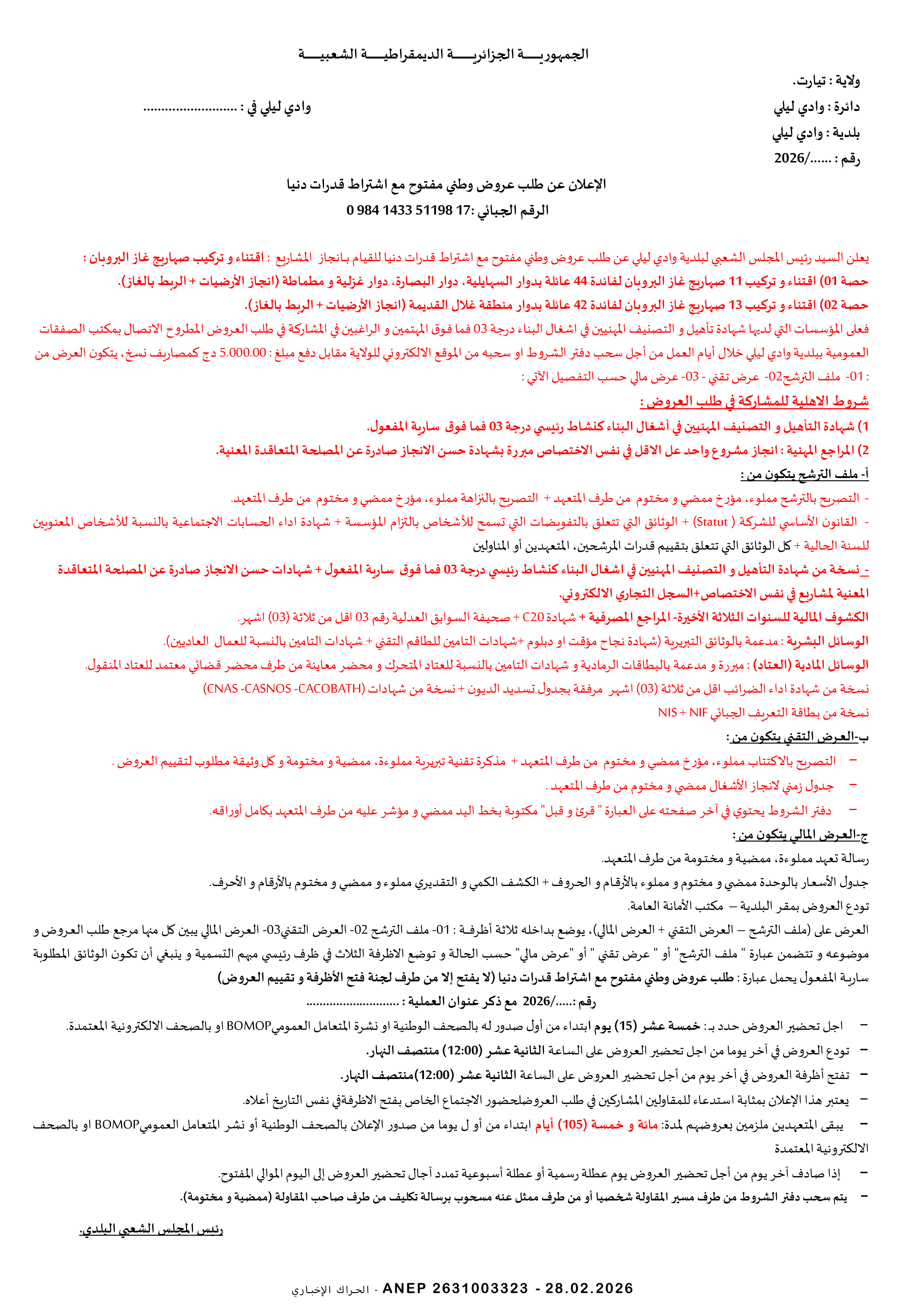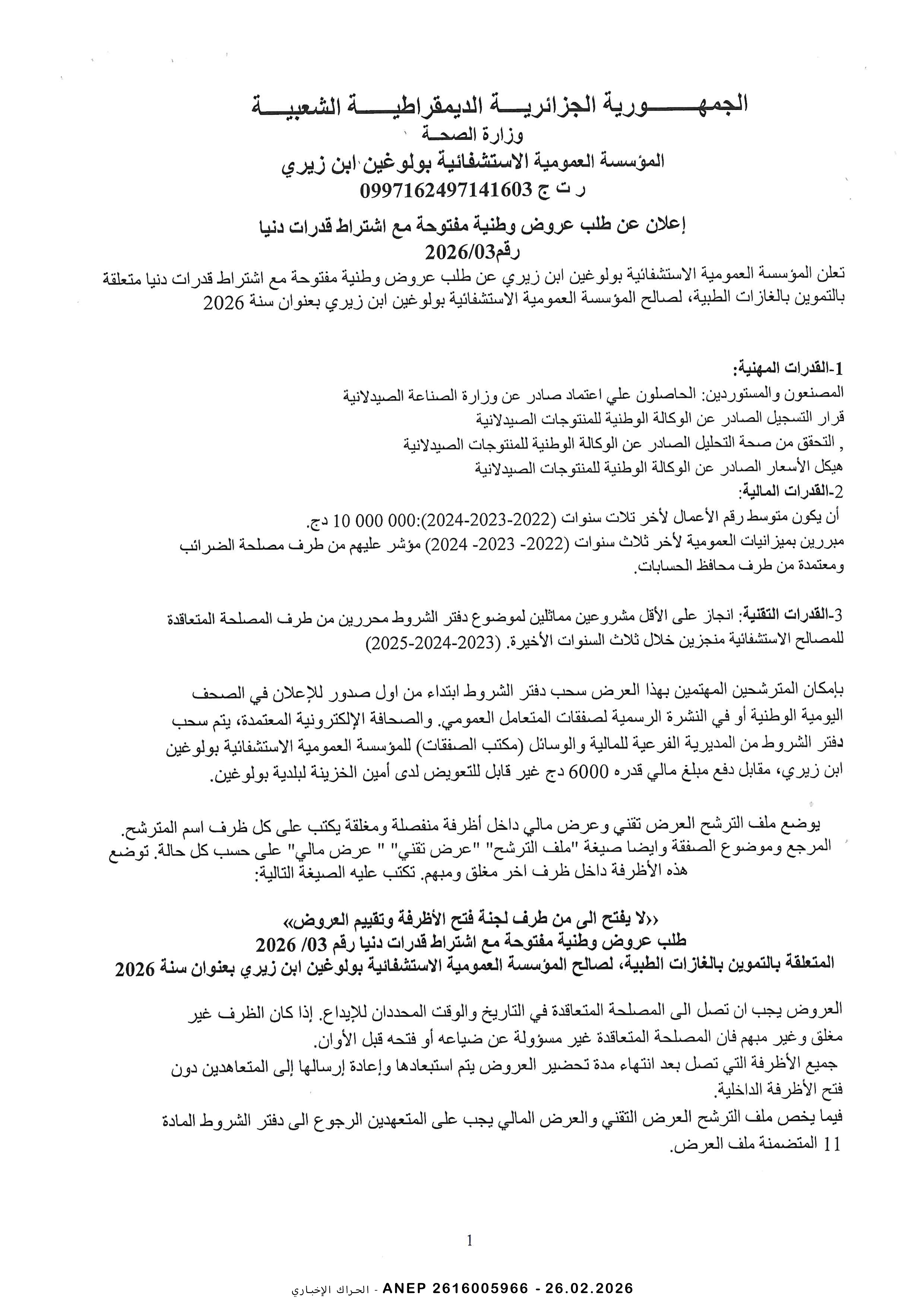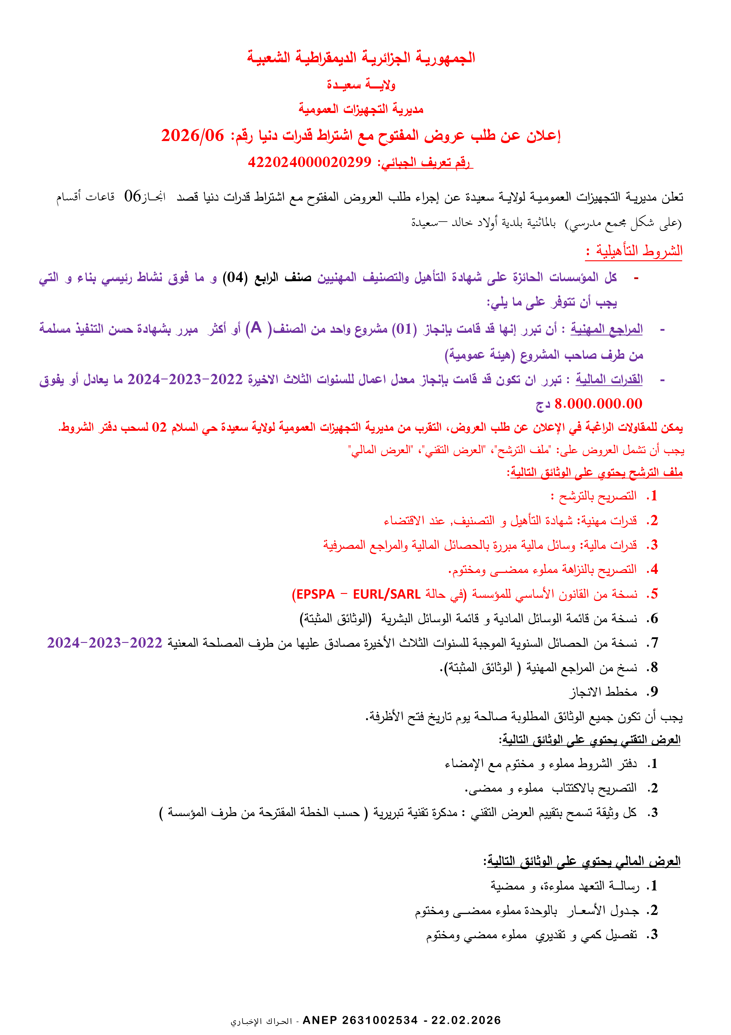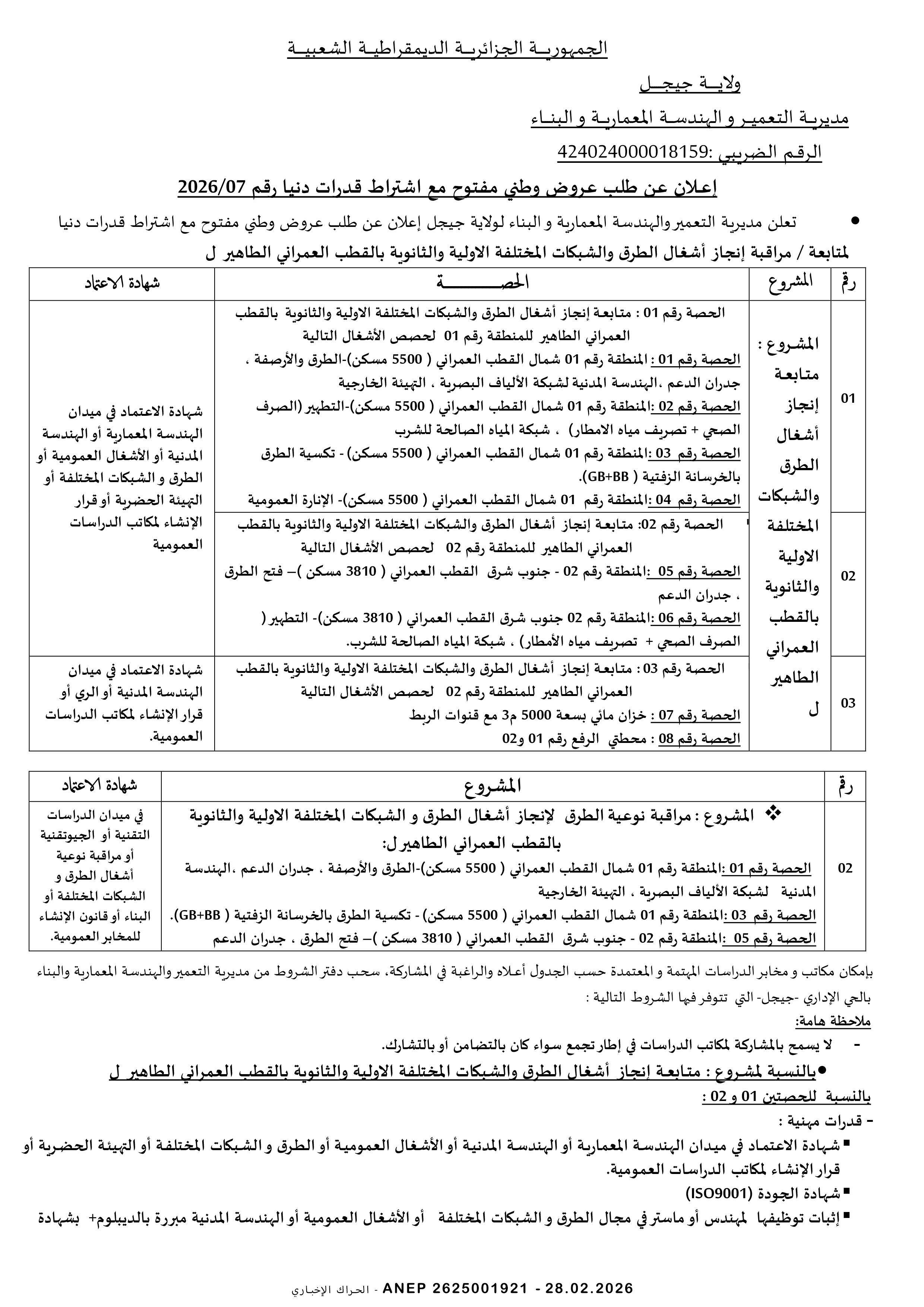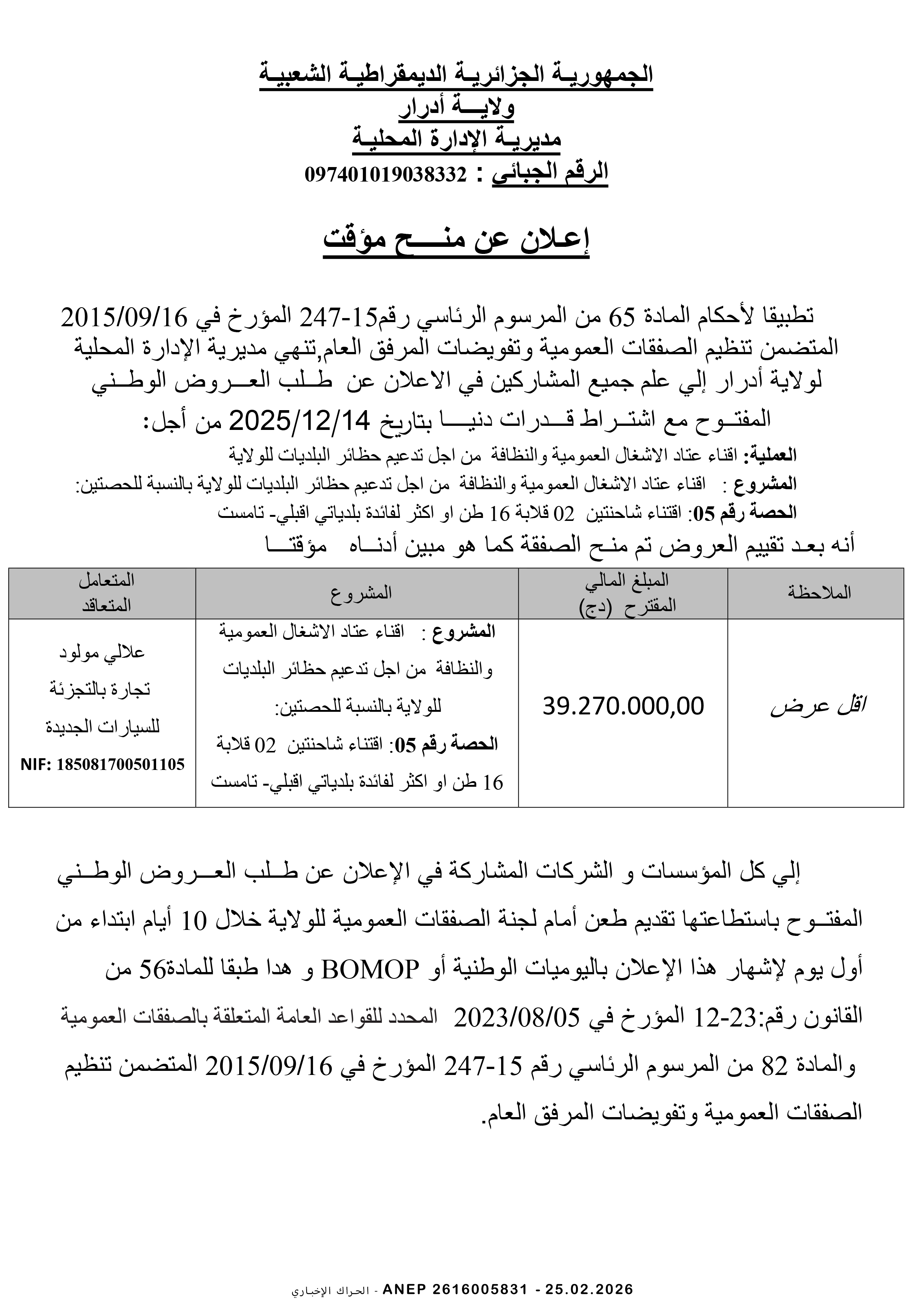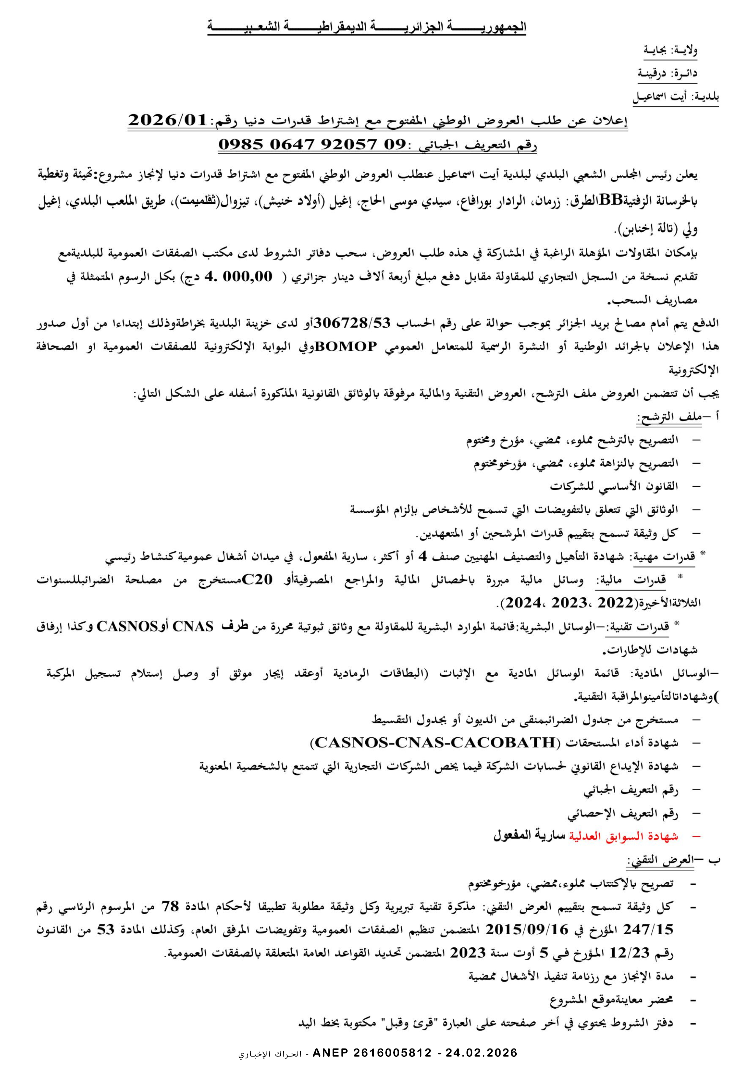 إعلان عن طلب عروض وطني مفتوح