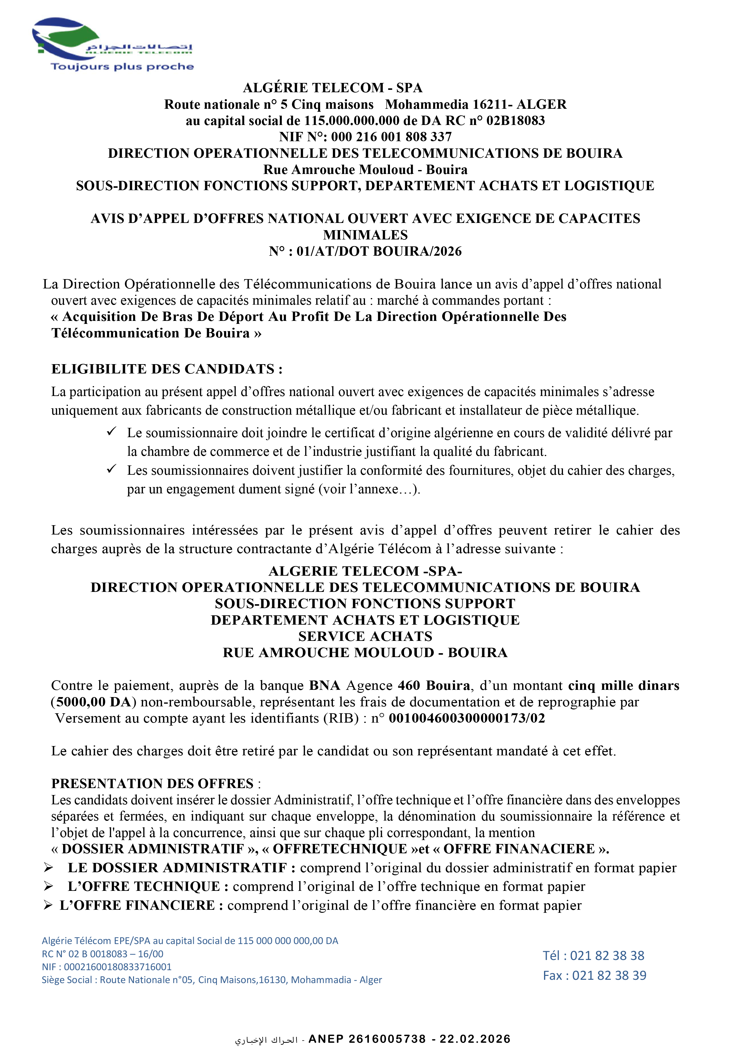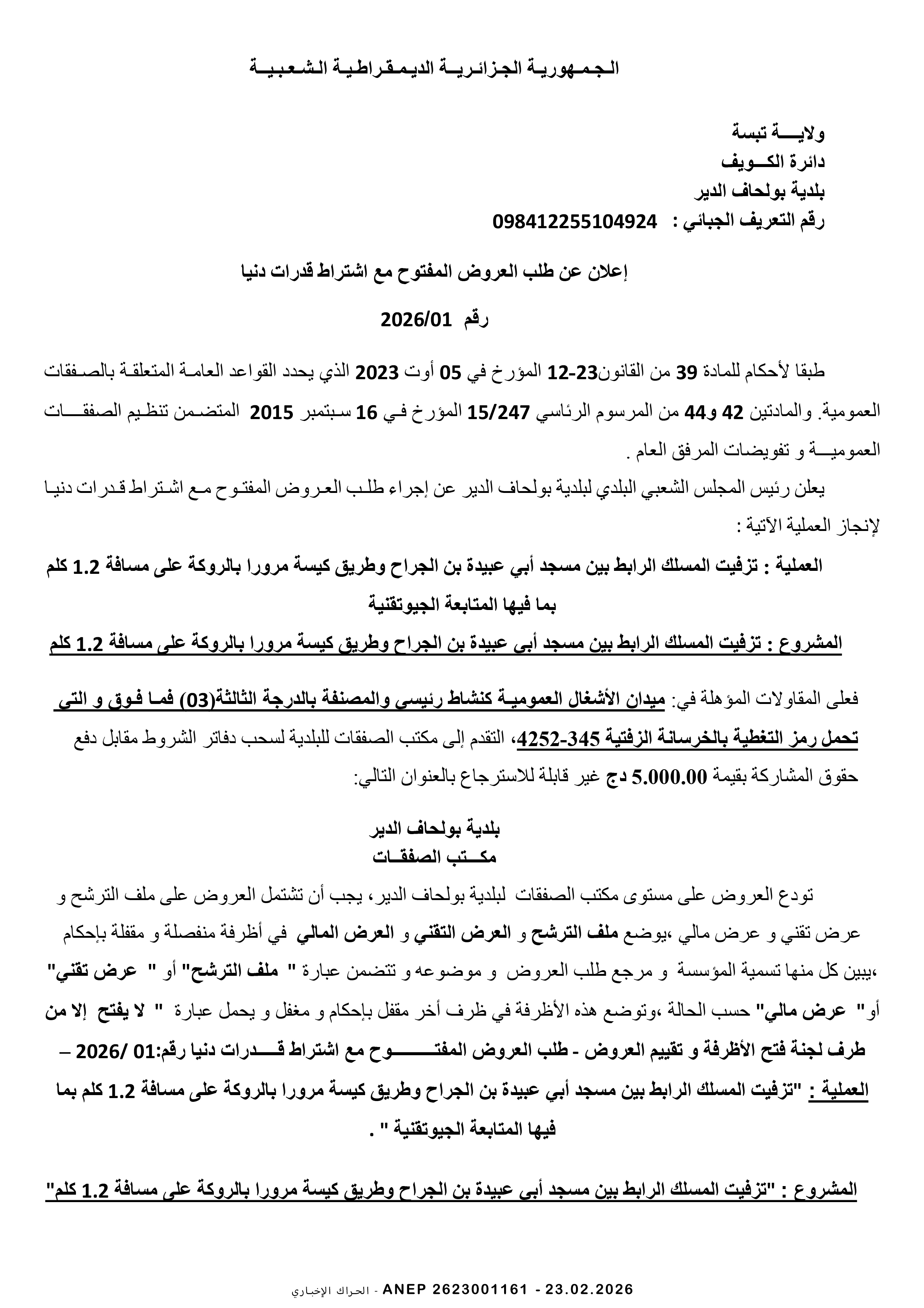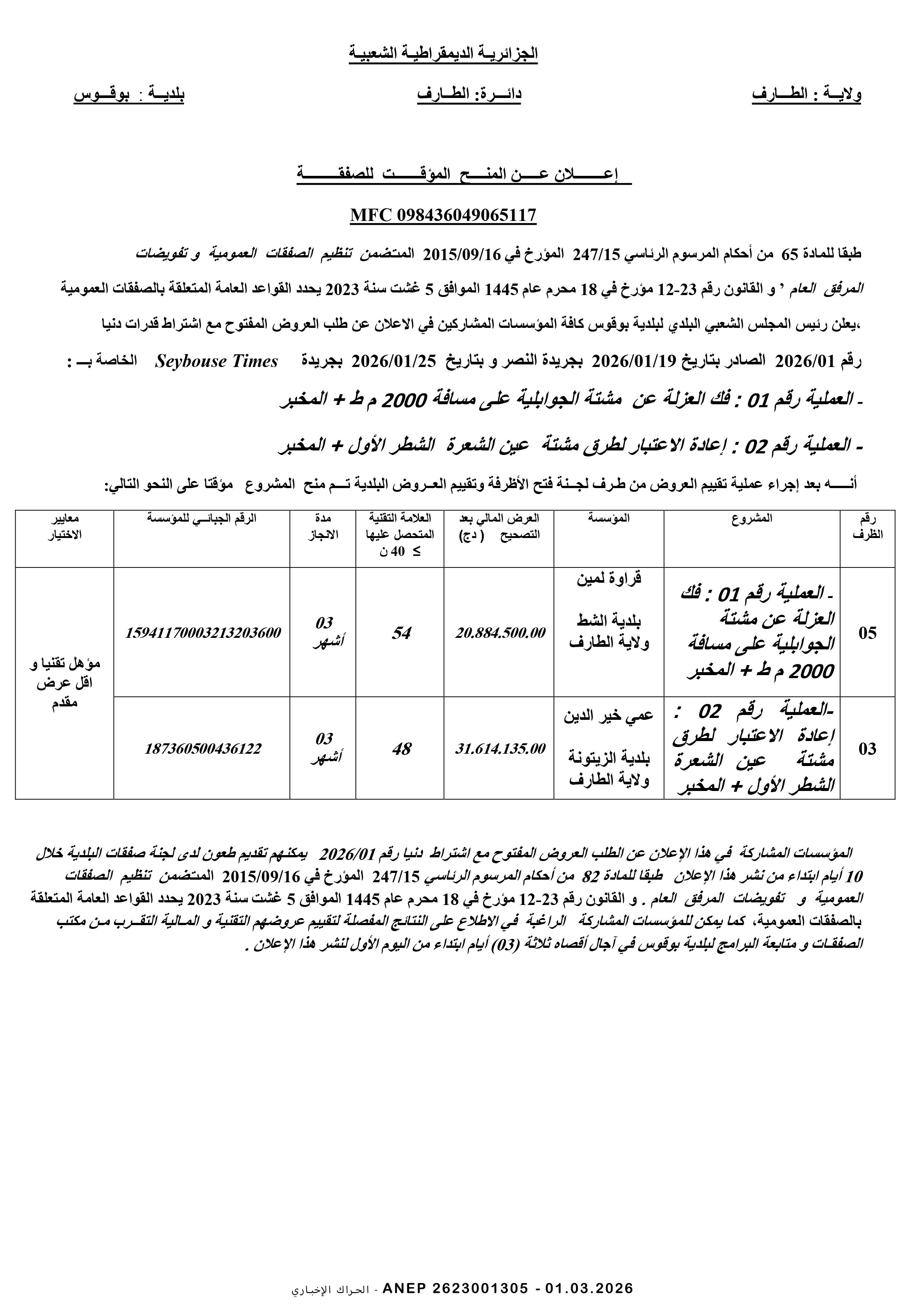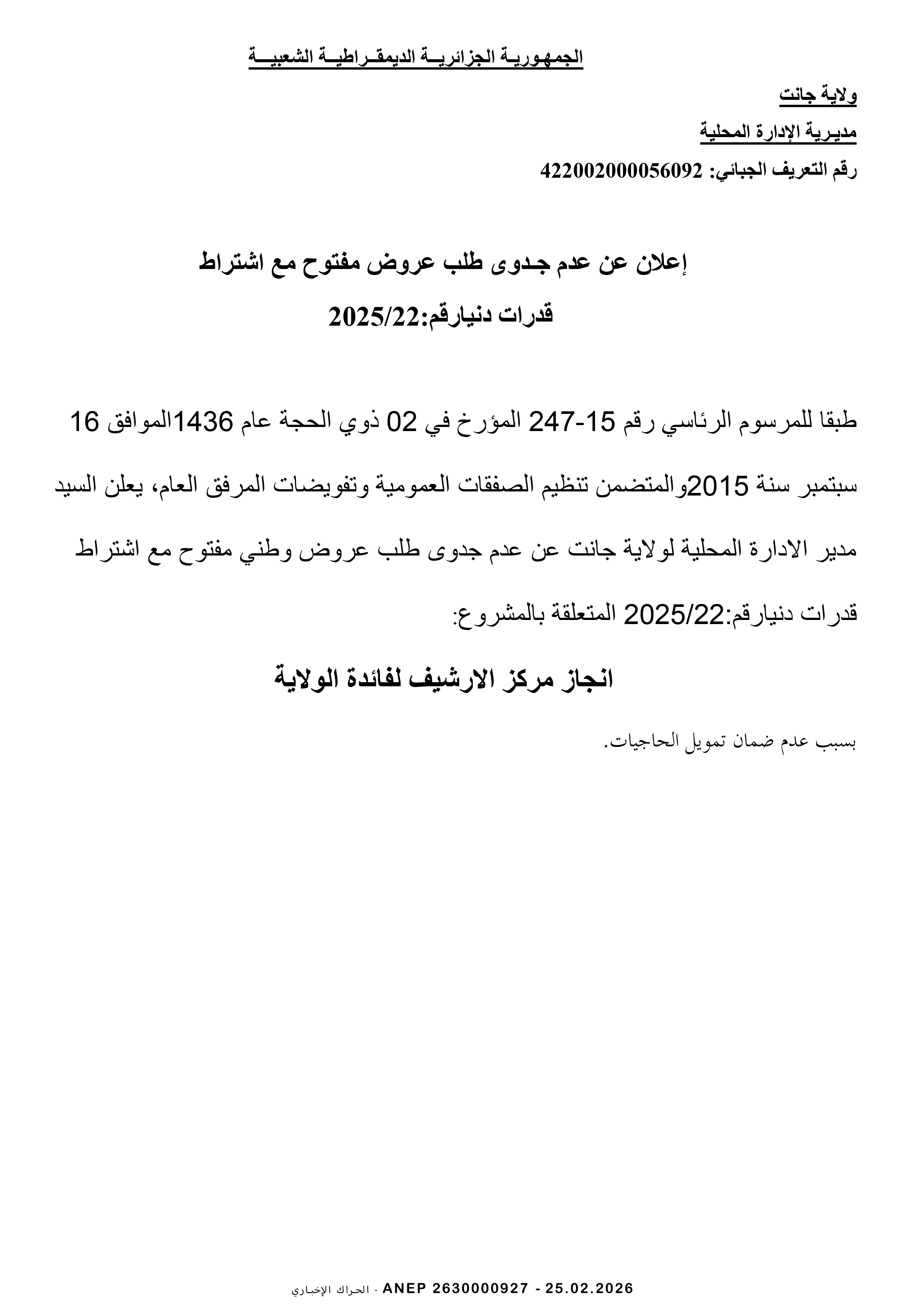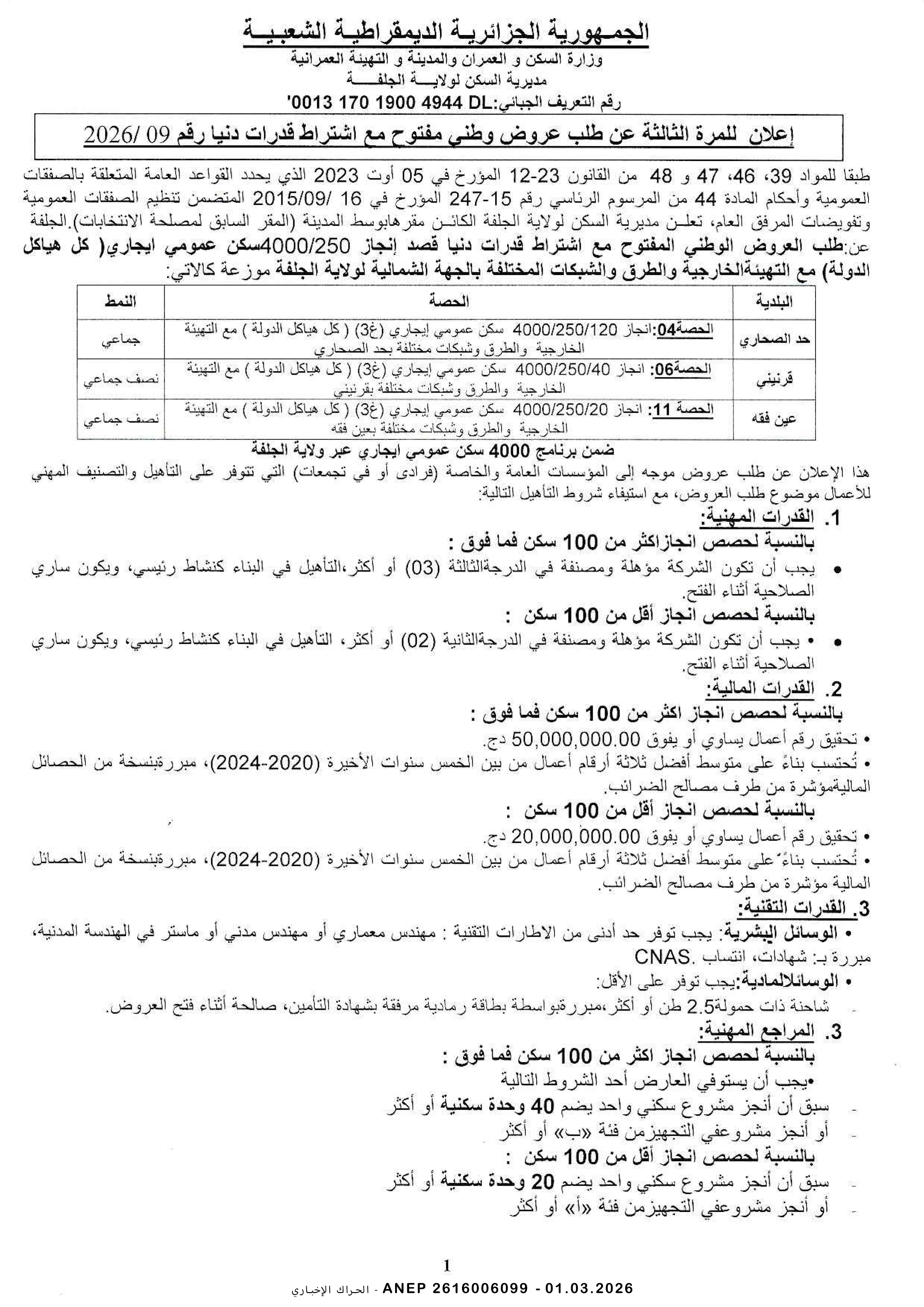 إعلان عن طلب عروض وطني مفتوح