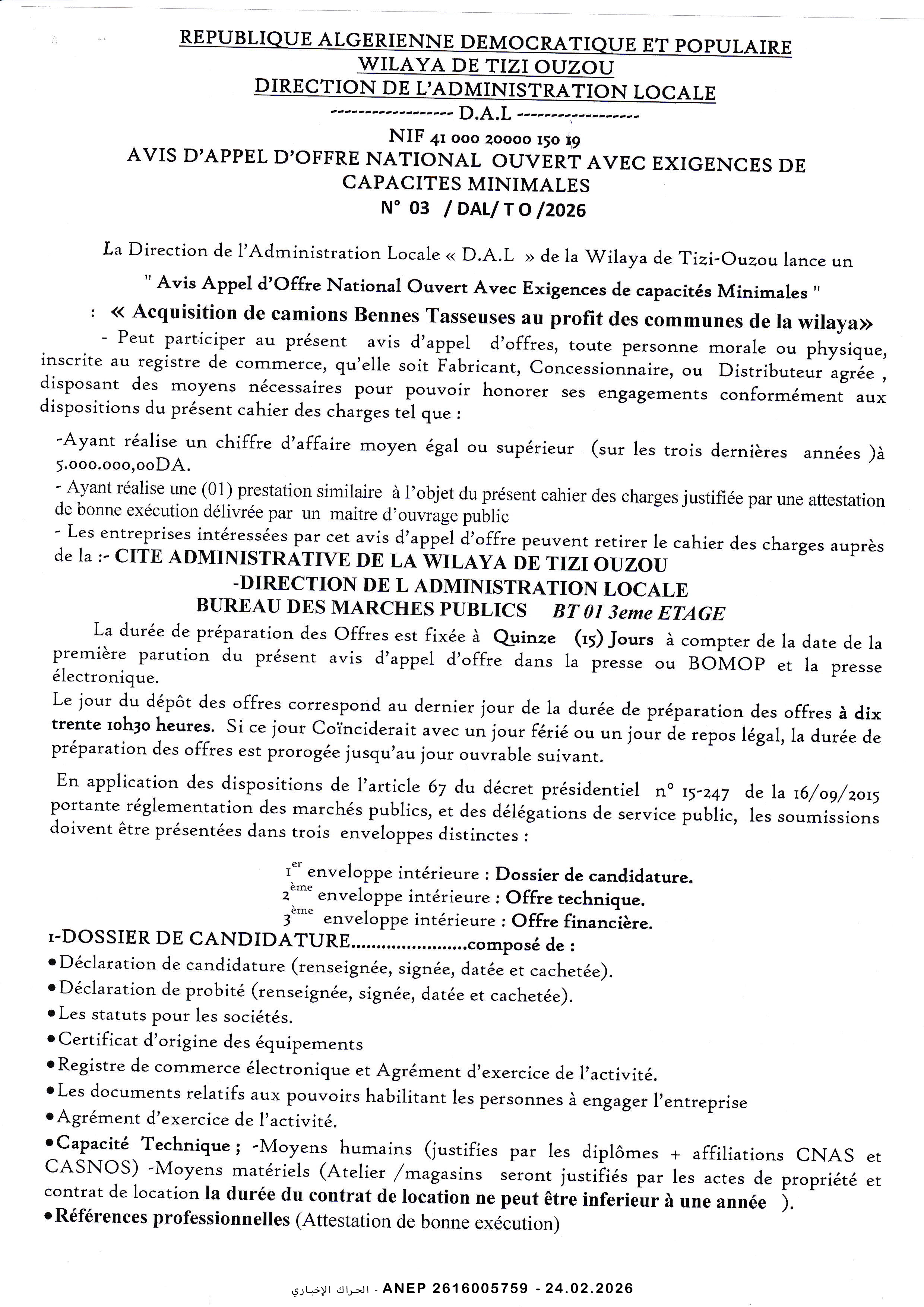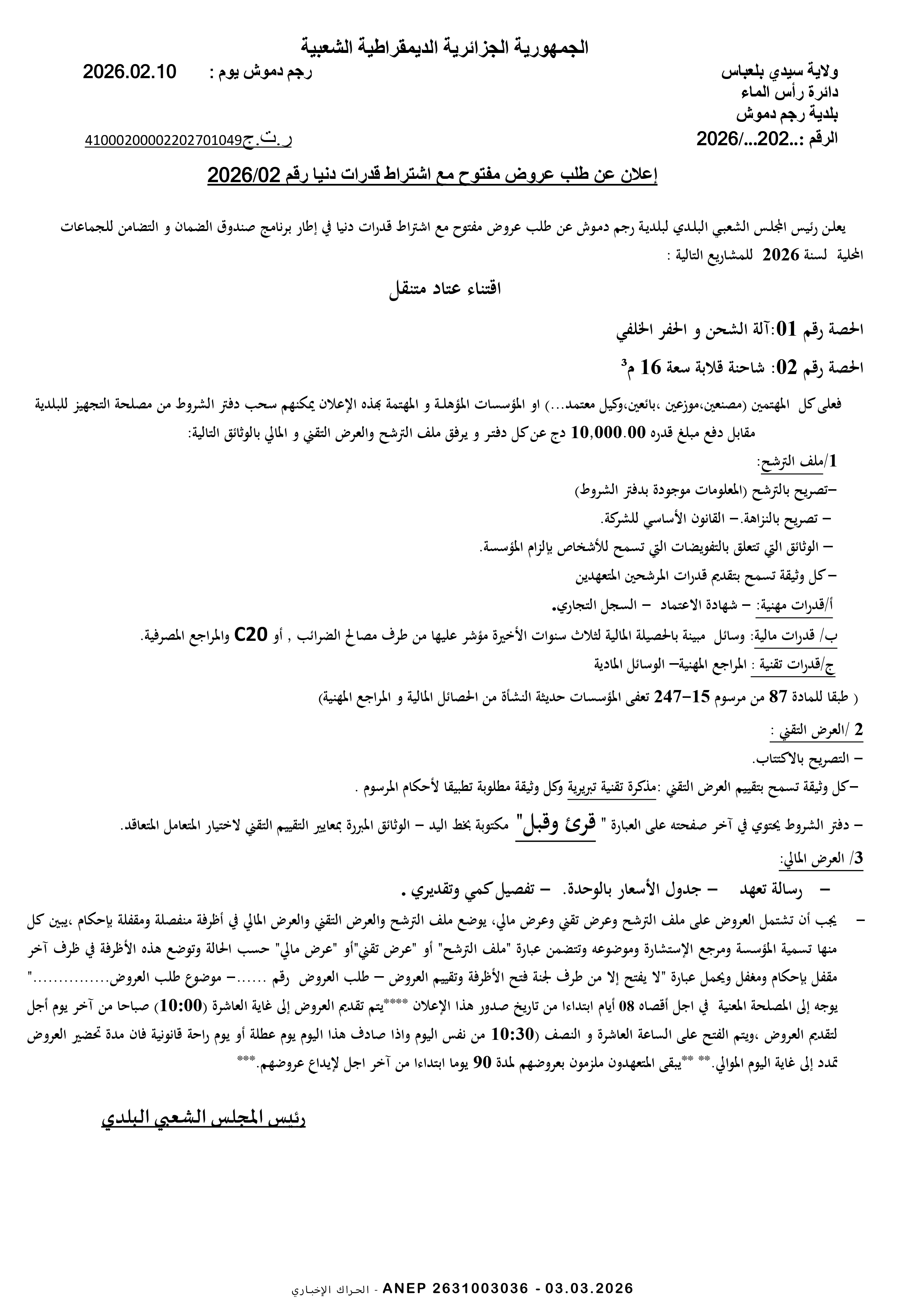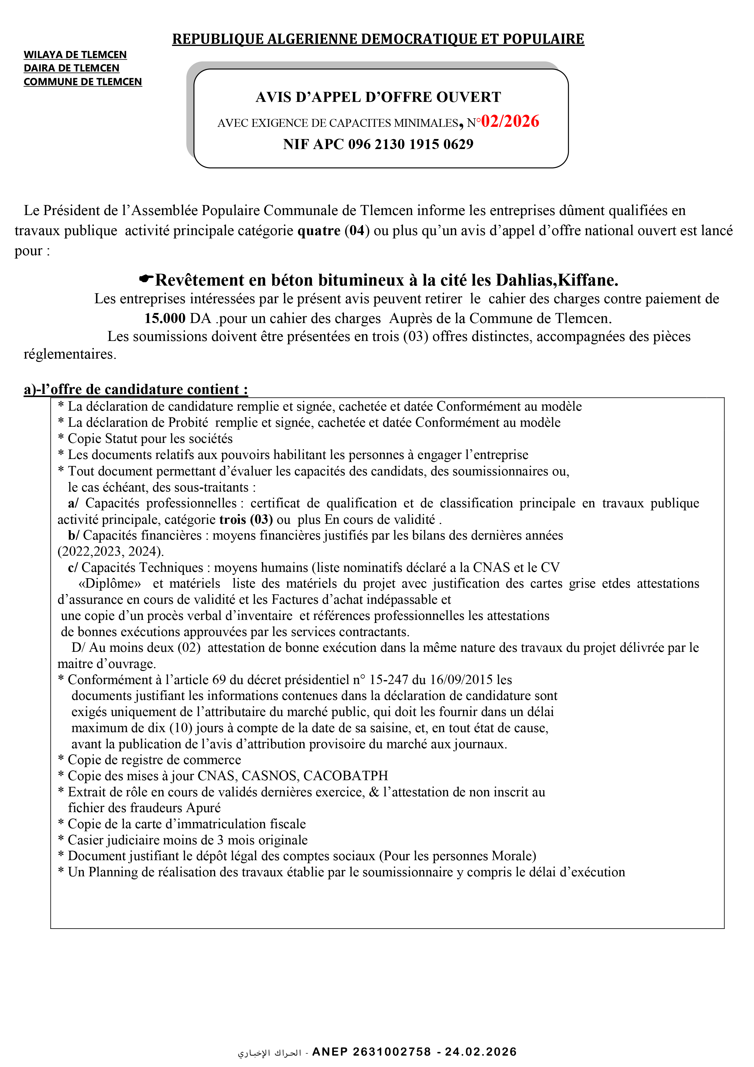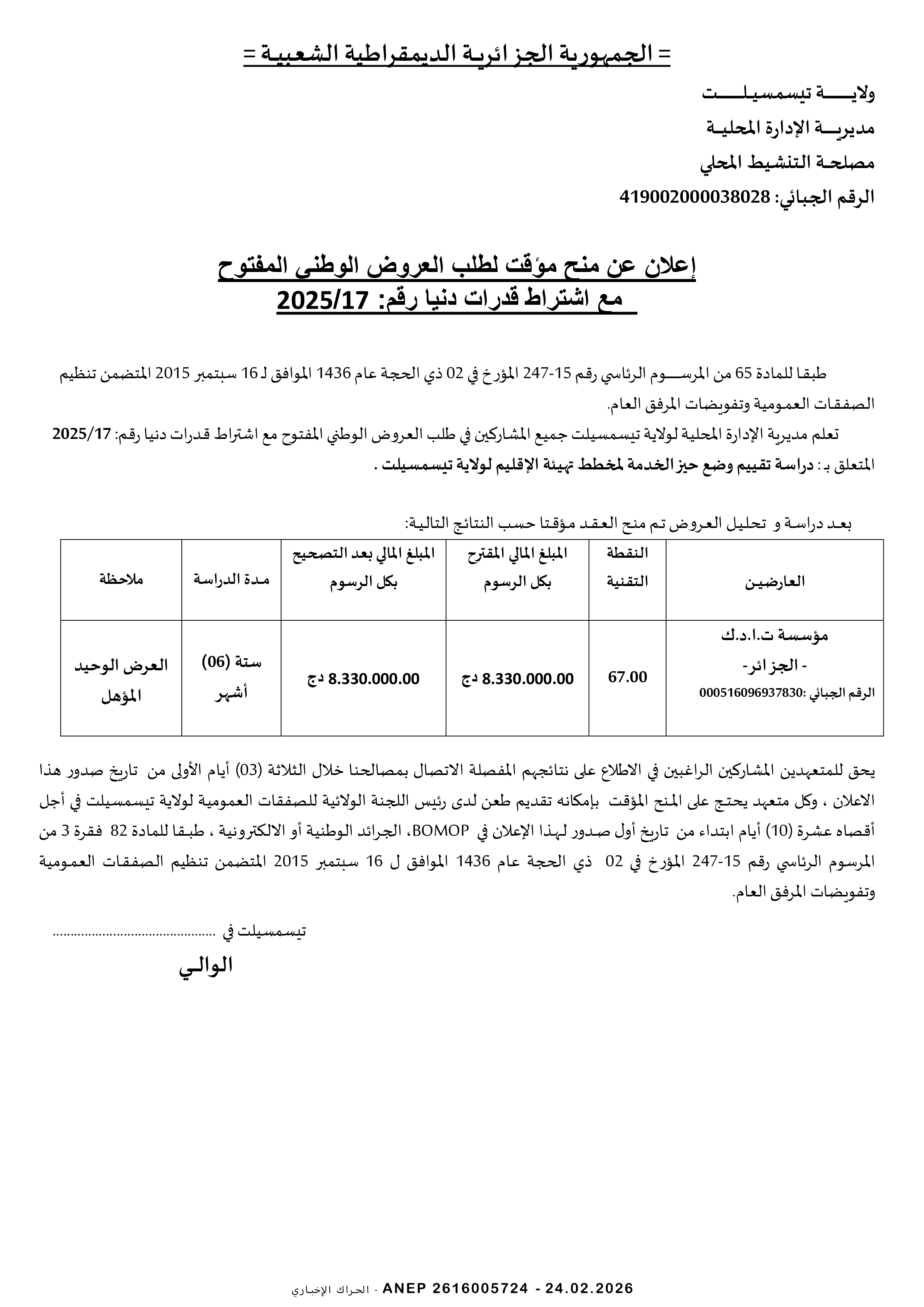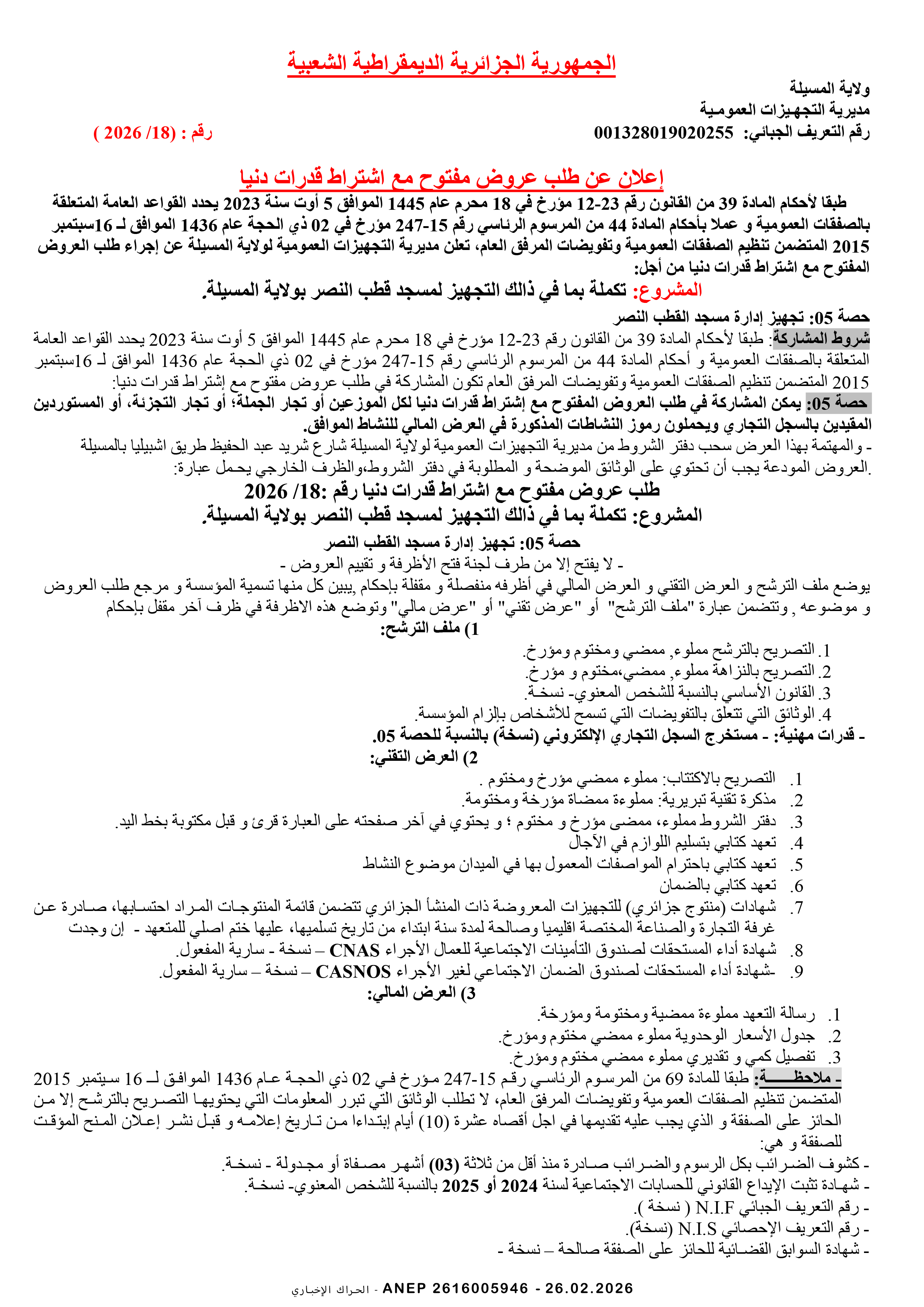 إعلان عن طلب عروض وطني مفتوح