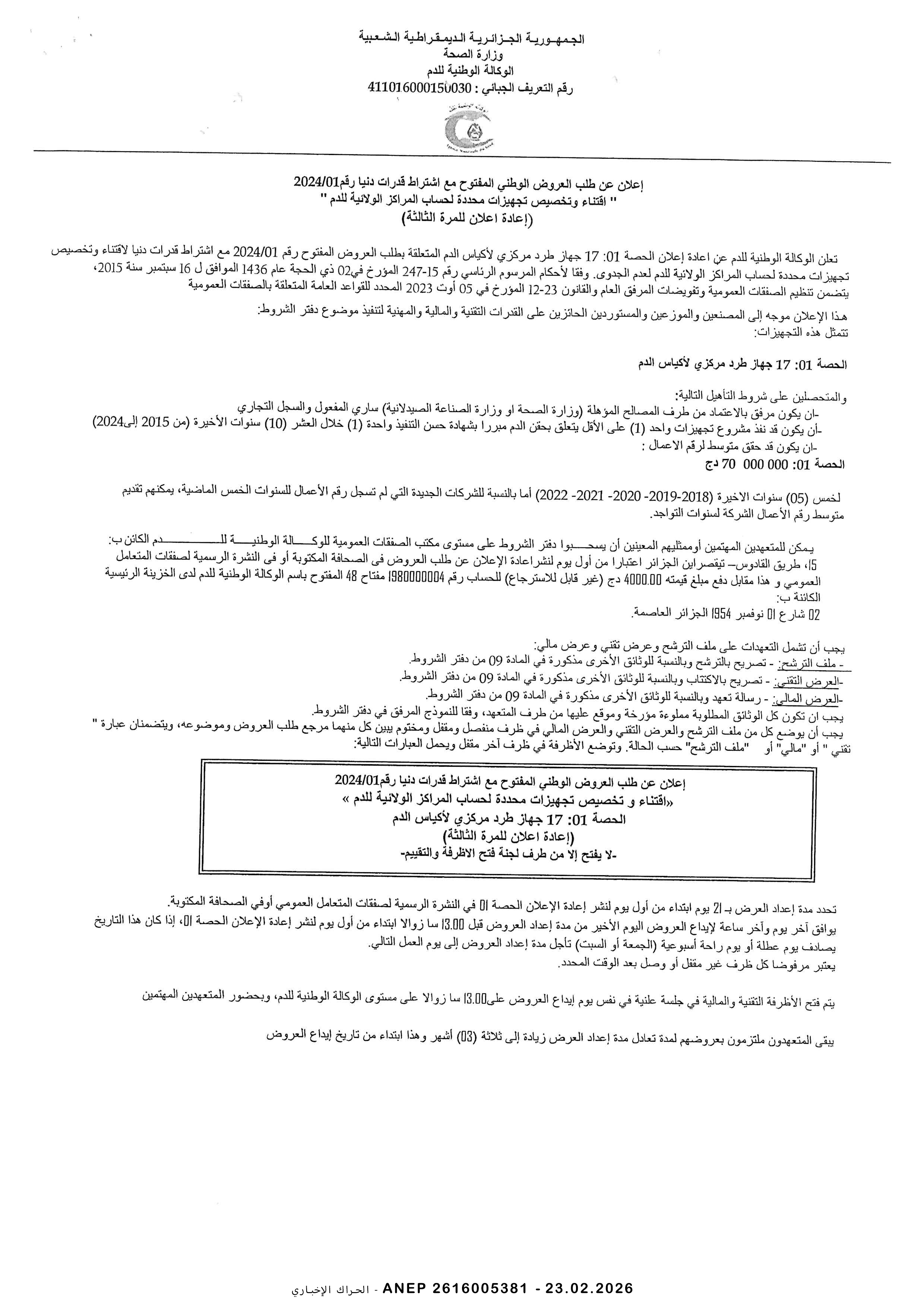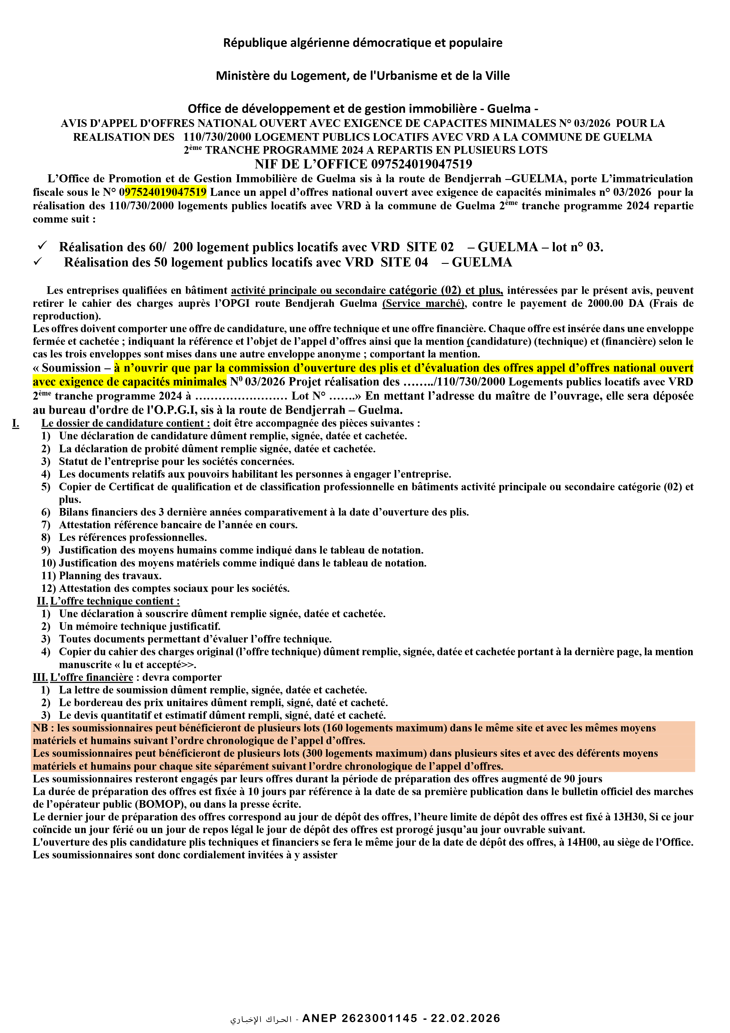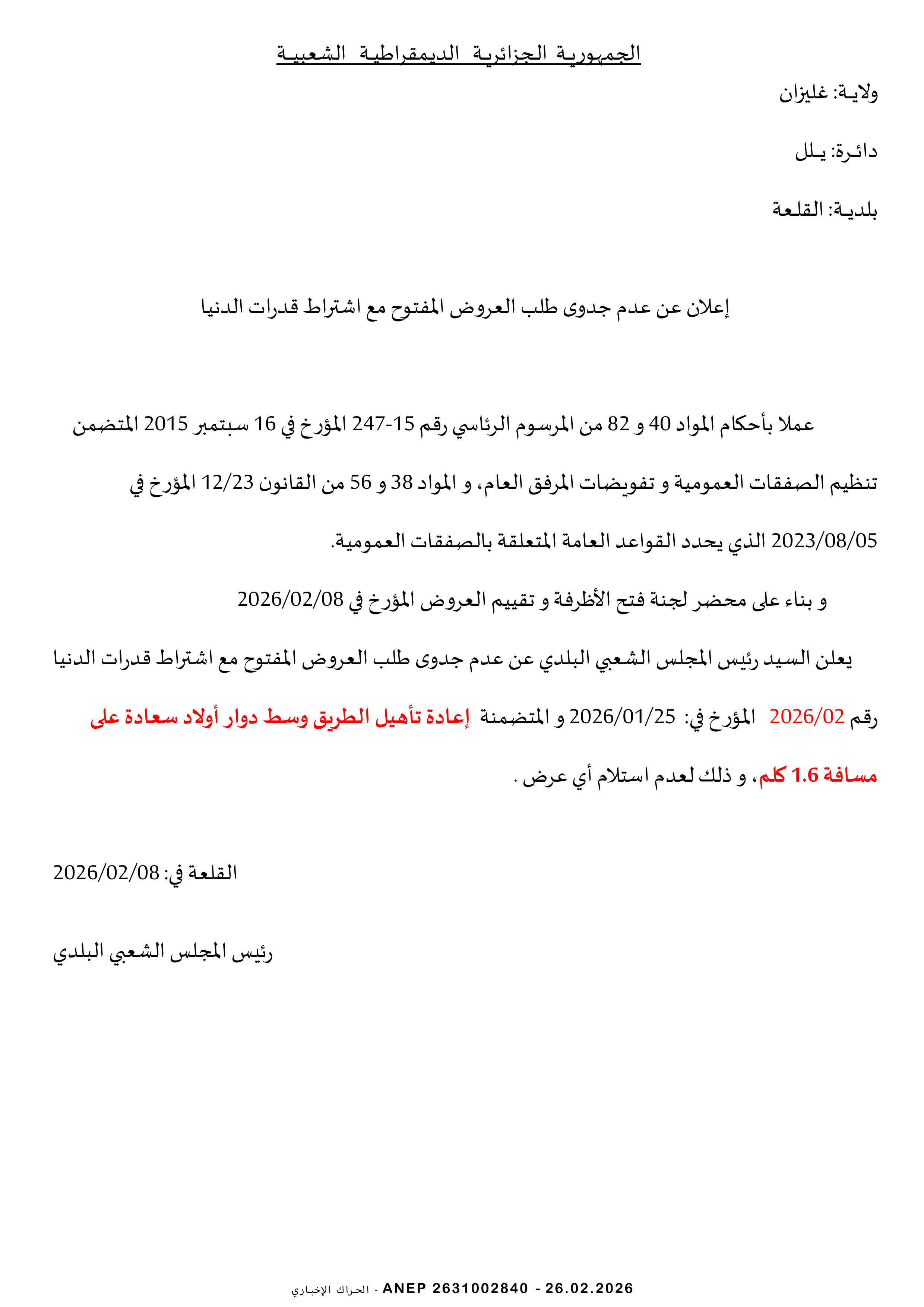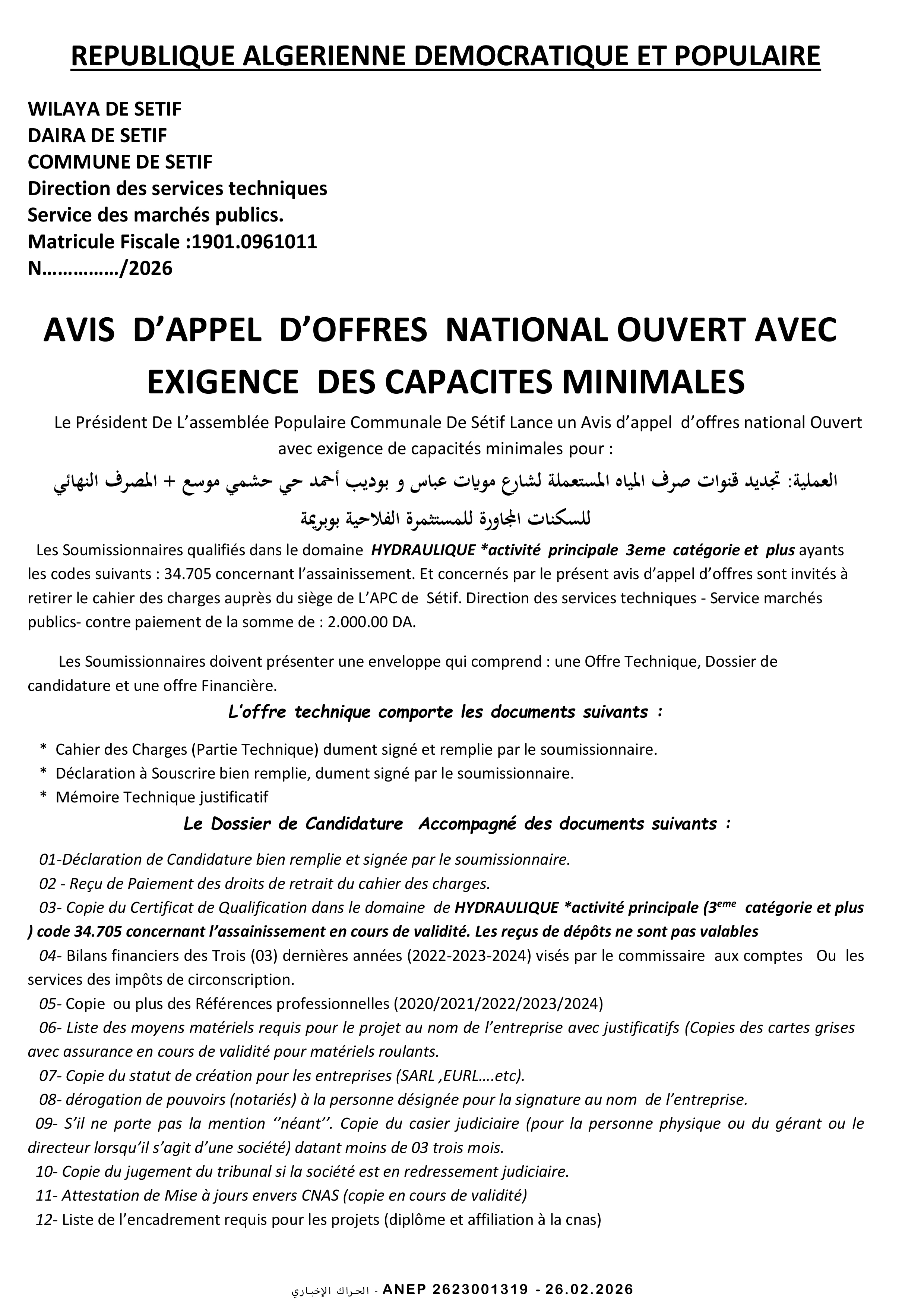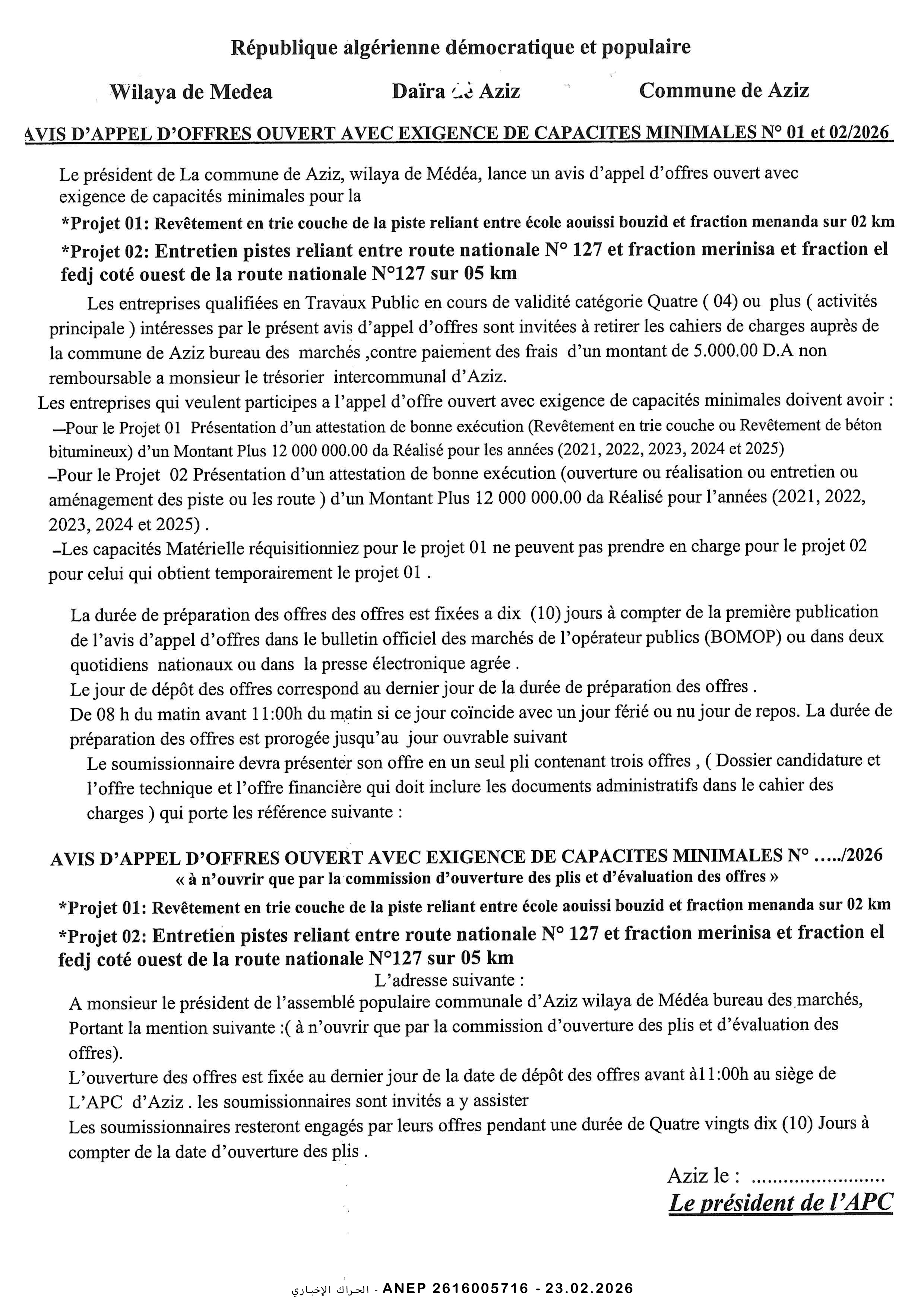 إعلان عن طلب عروض وطني مفتوح