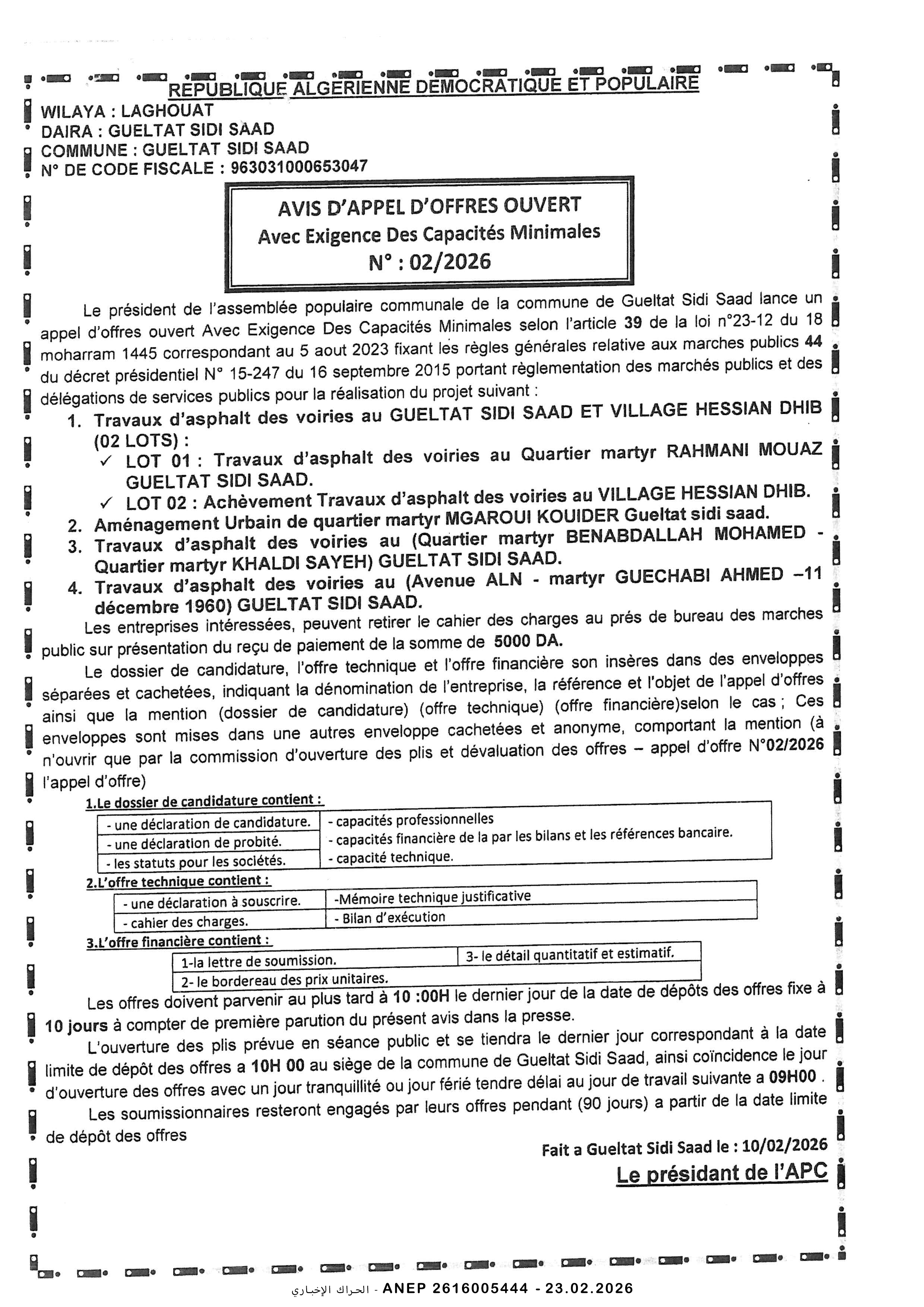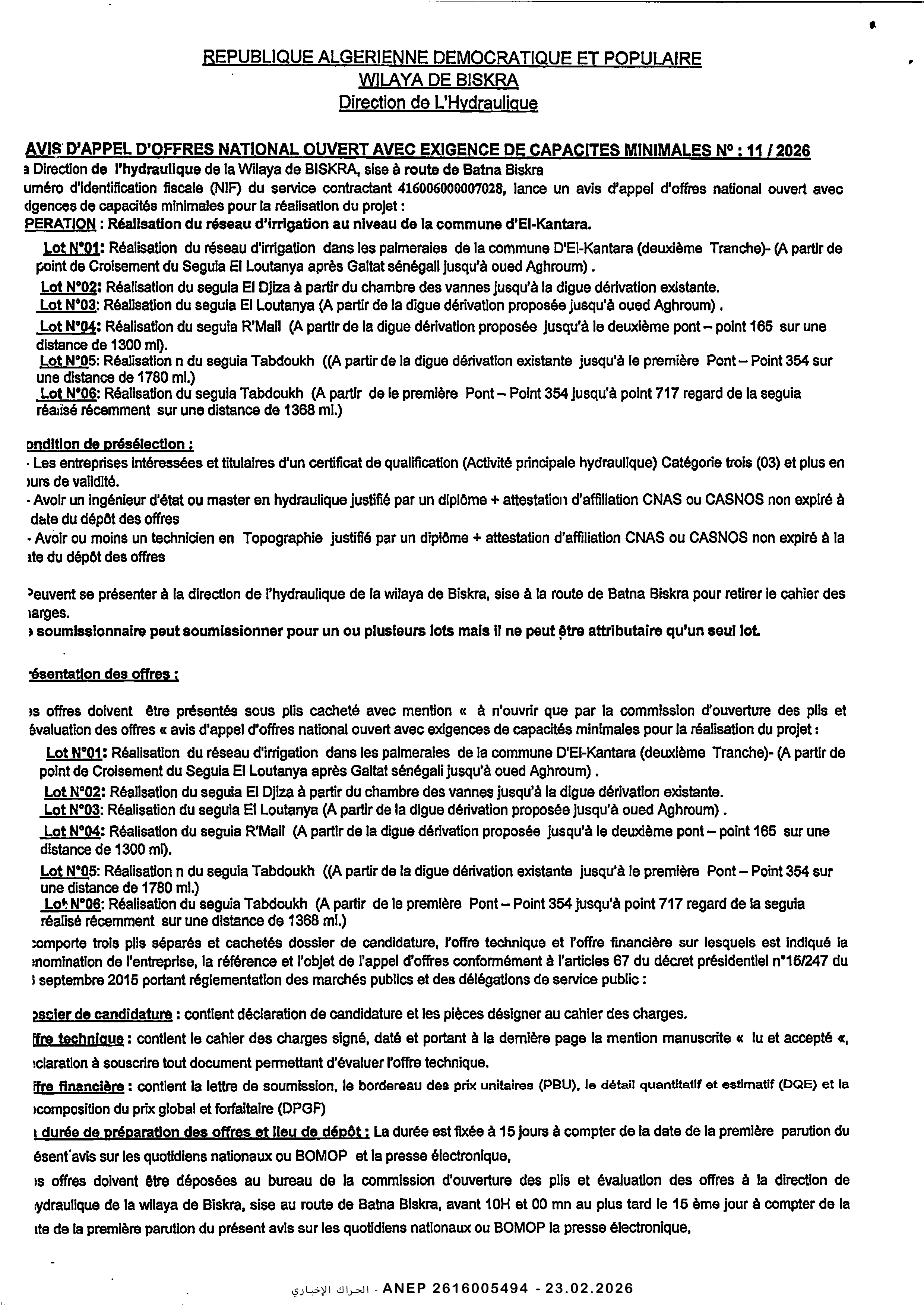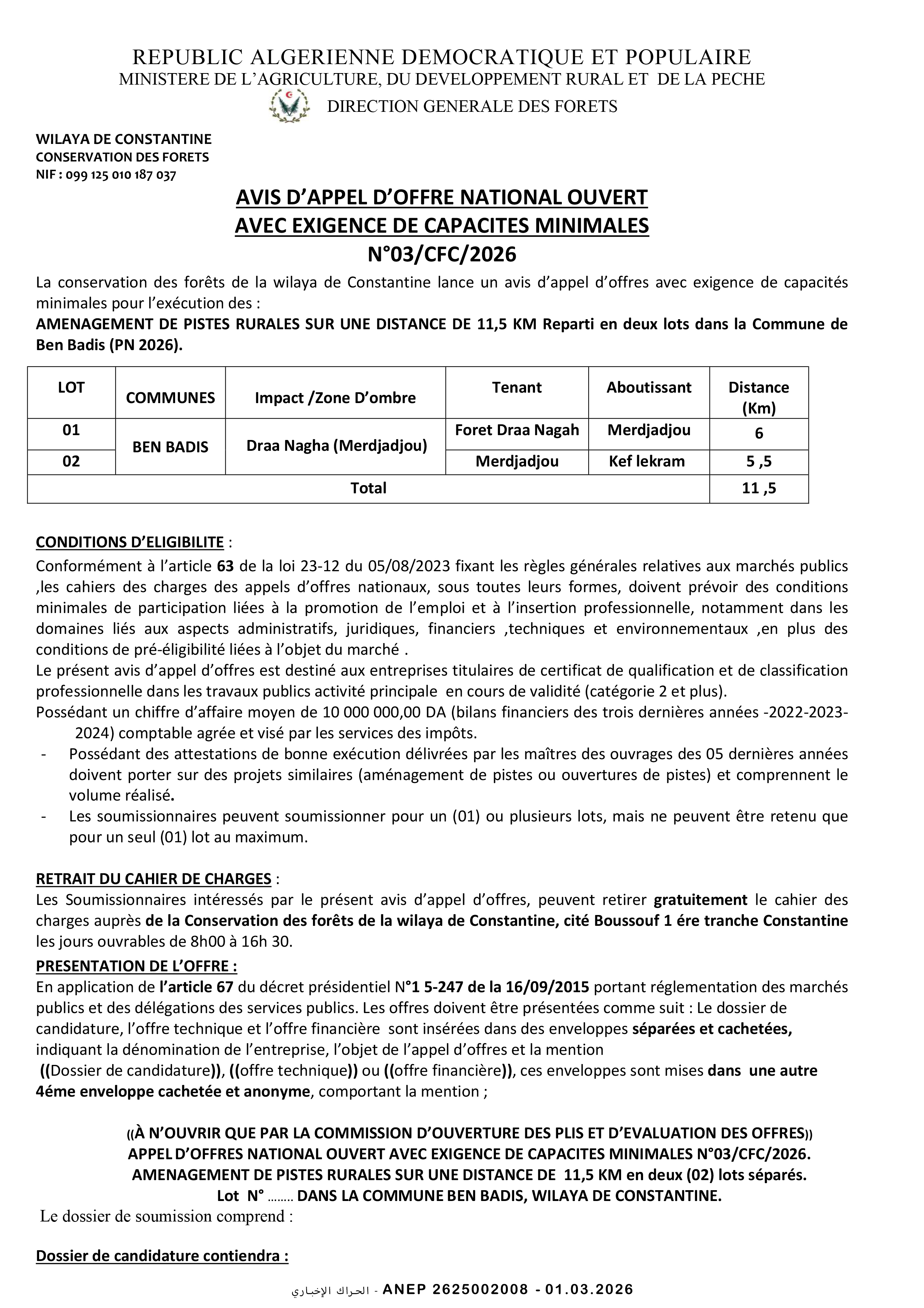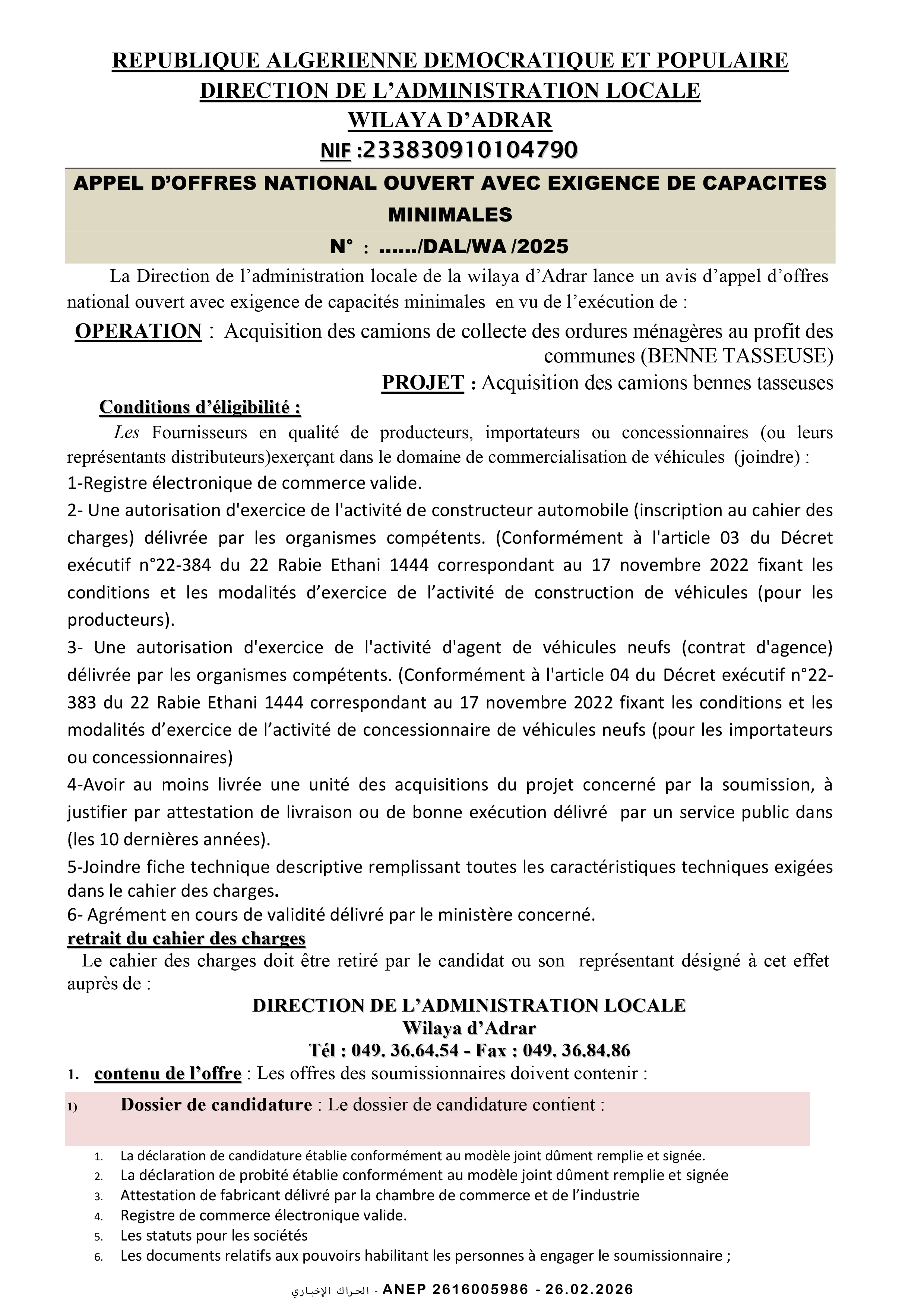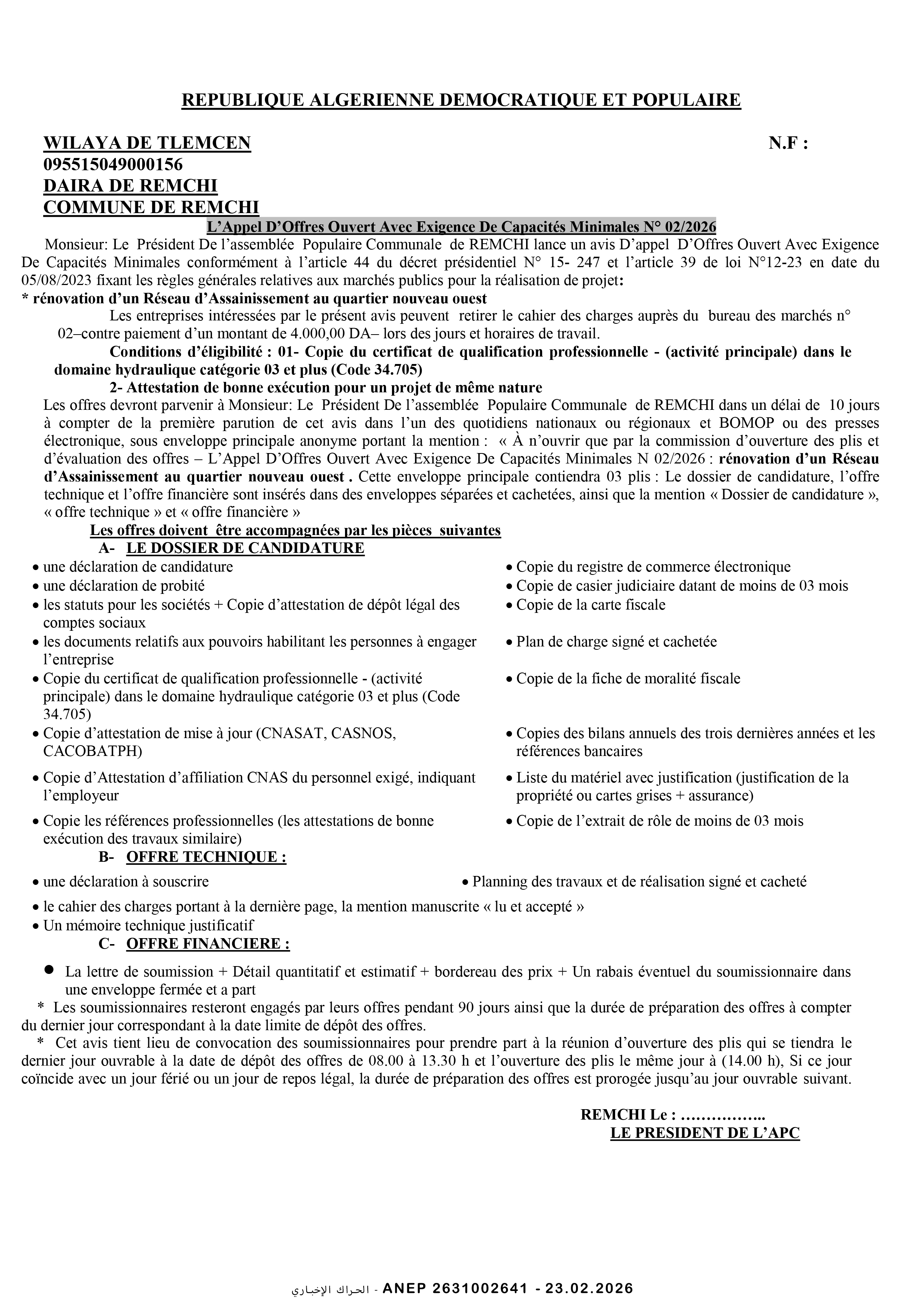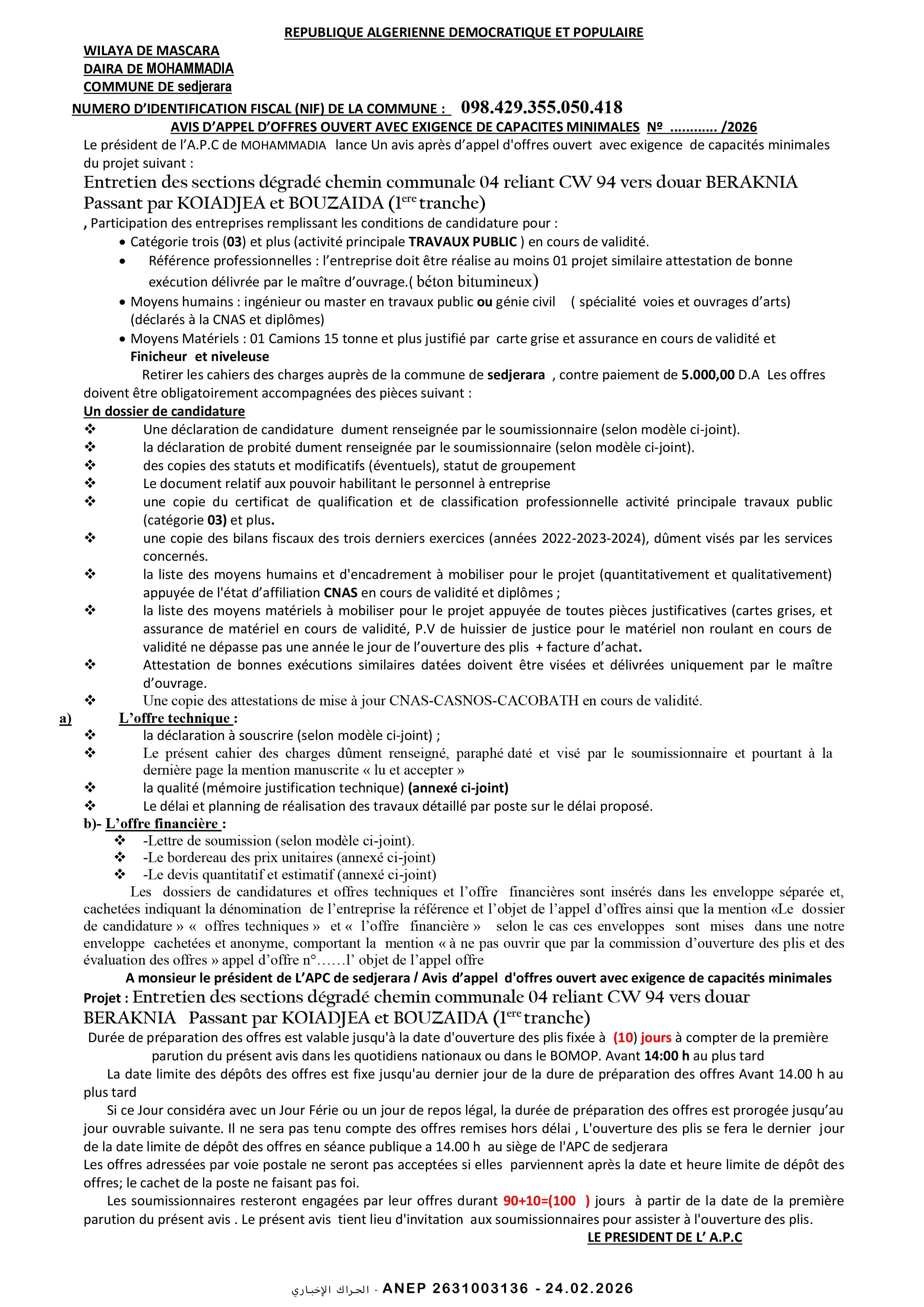 إعلان عن طلب عروض وطني مفتوح