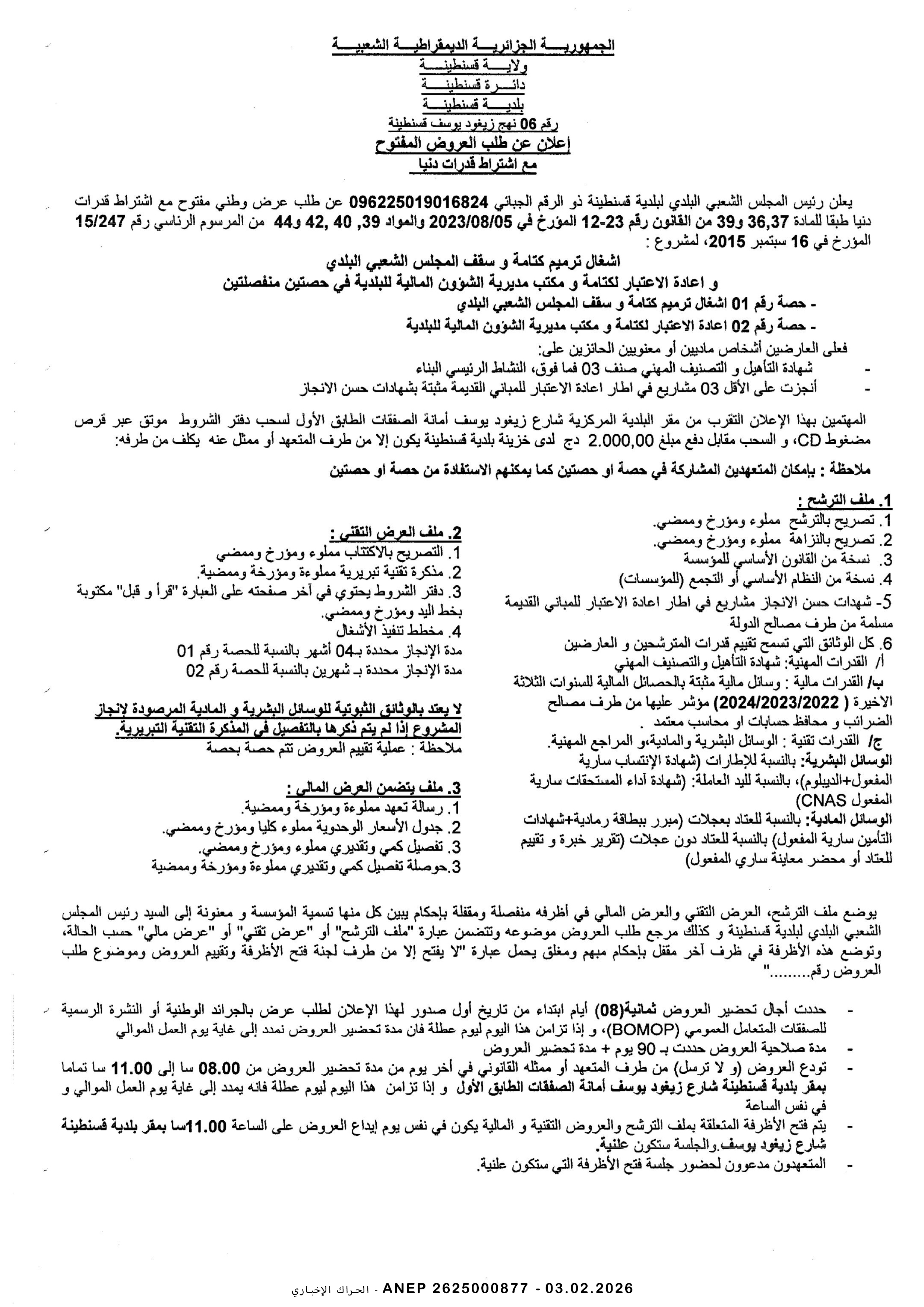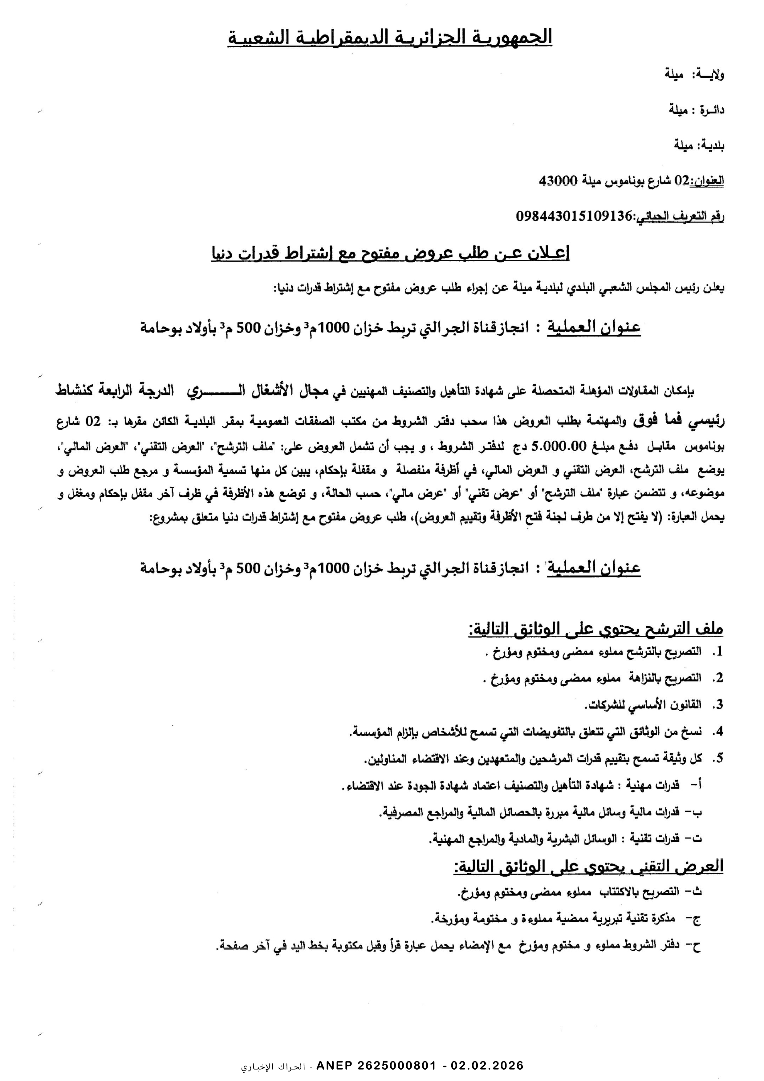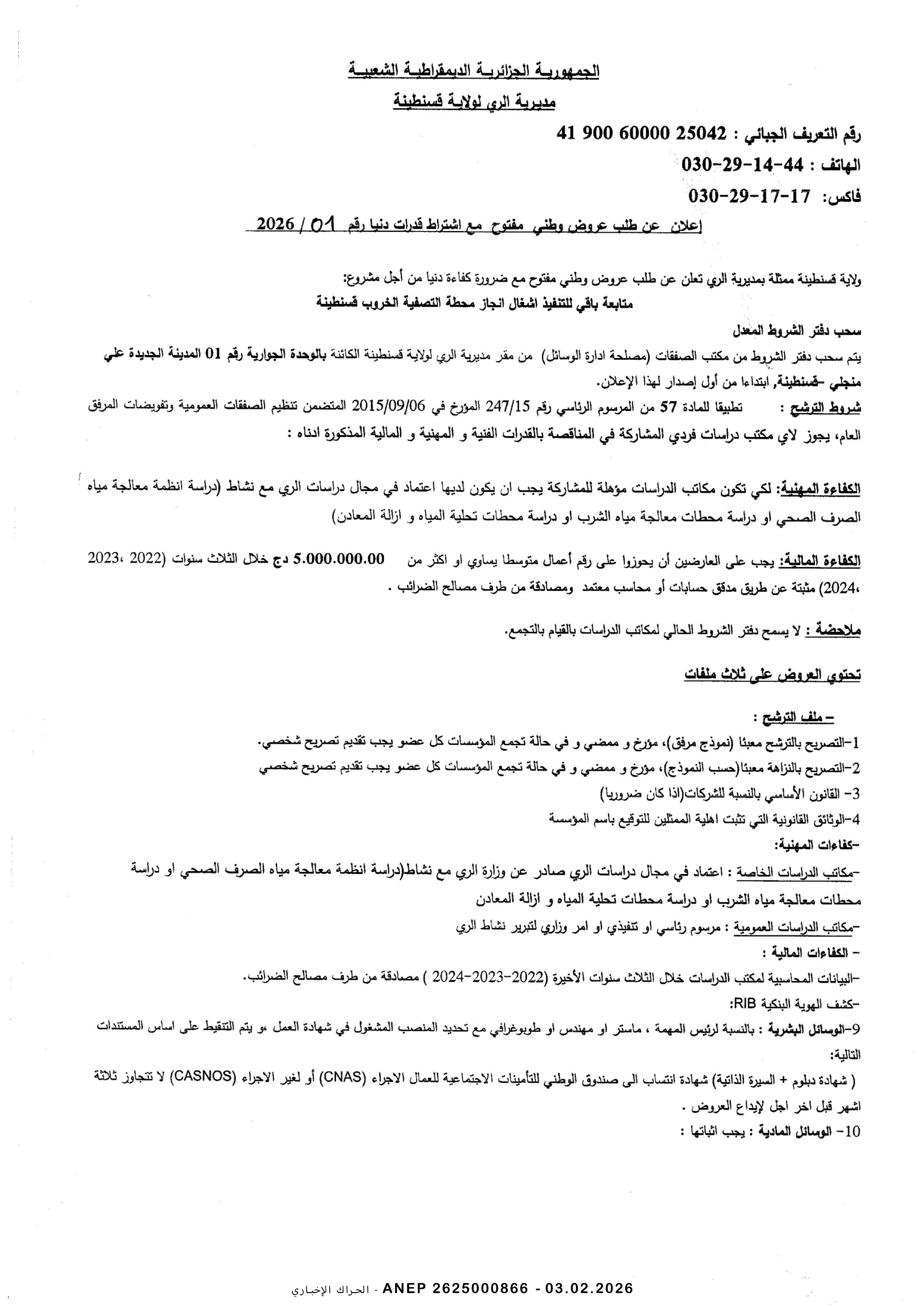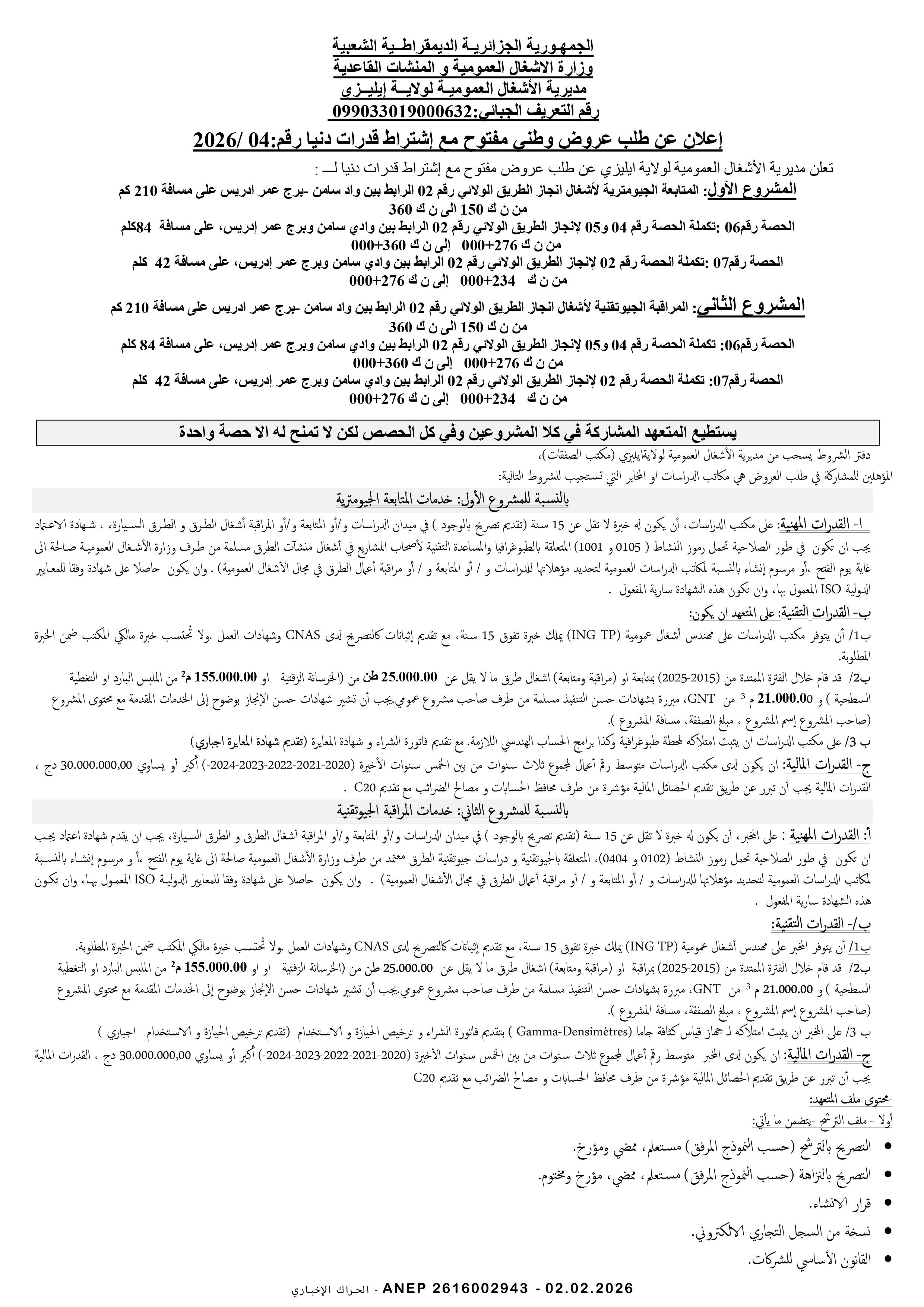 إعلان عن طلب عروض وطني مفتوح مع اشتراط قدرات دنيا رقم 2026/02