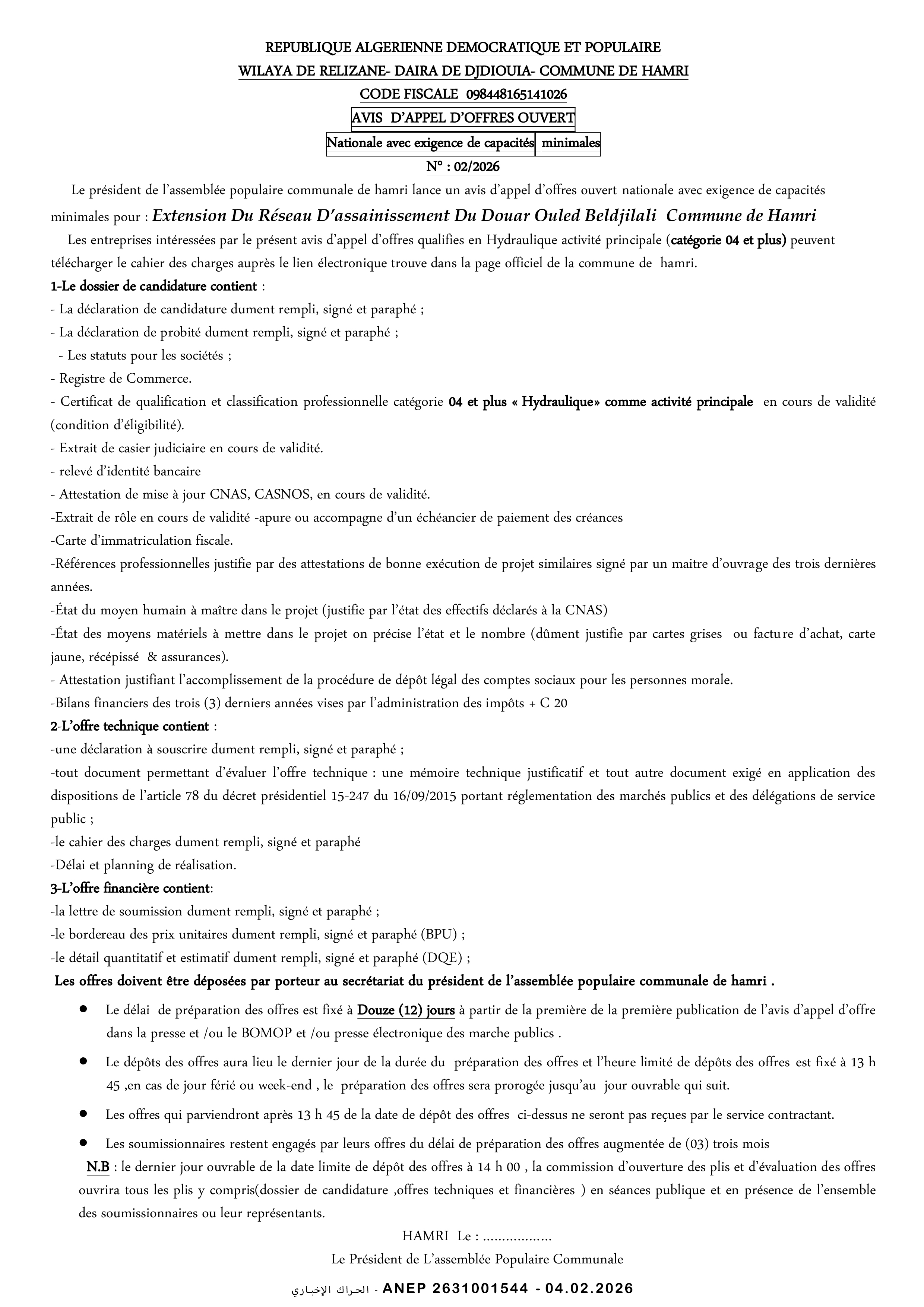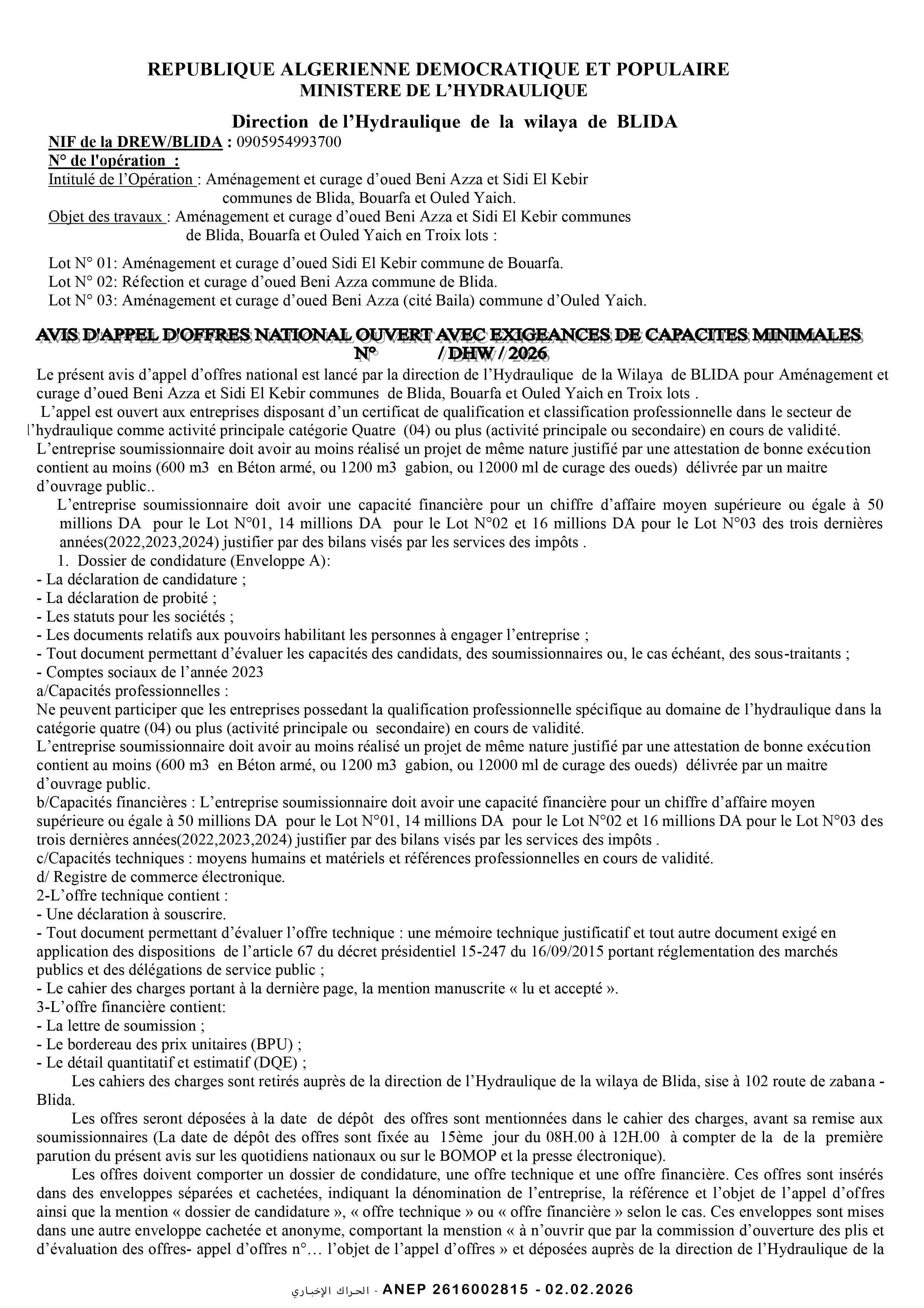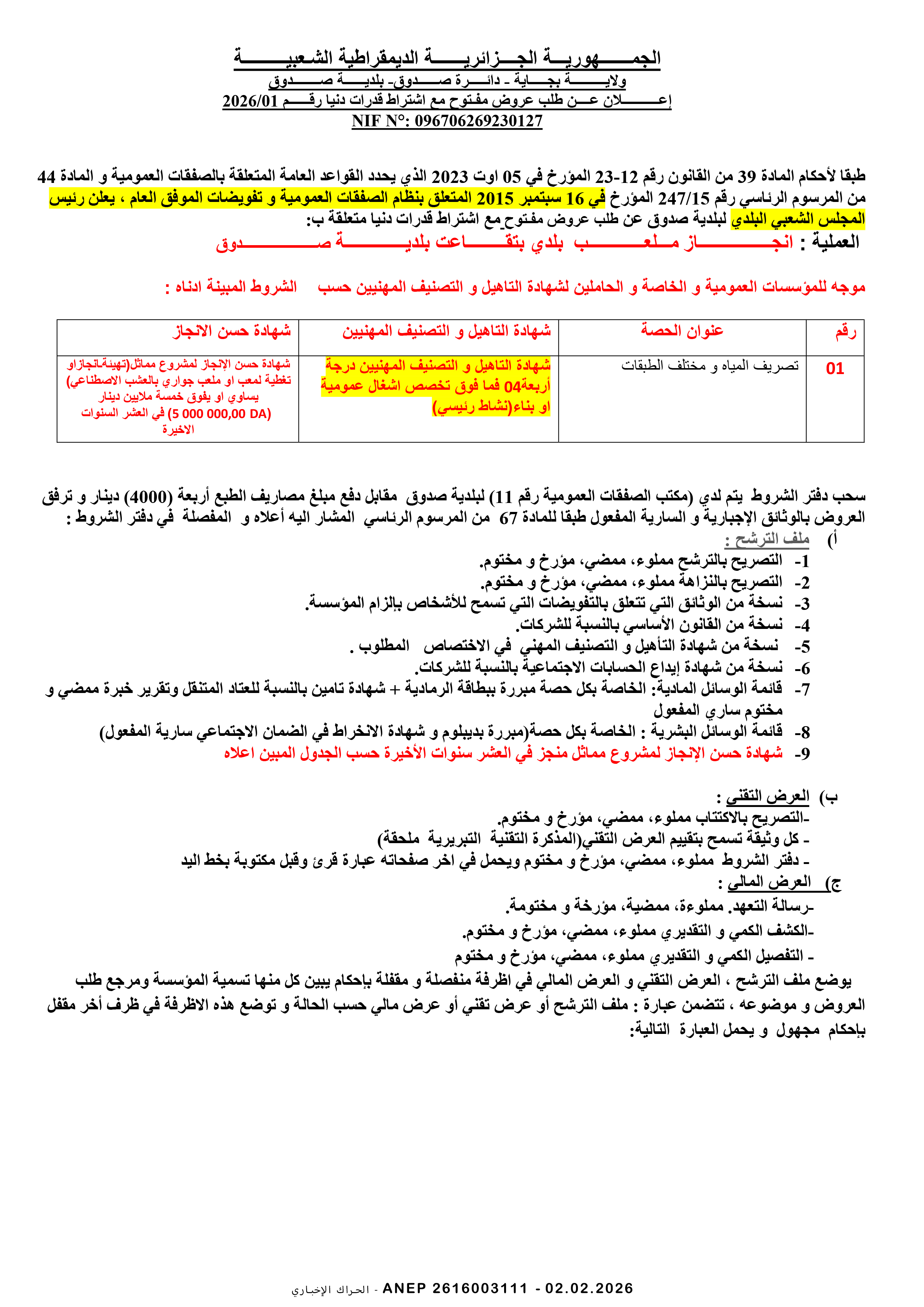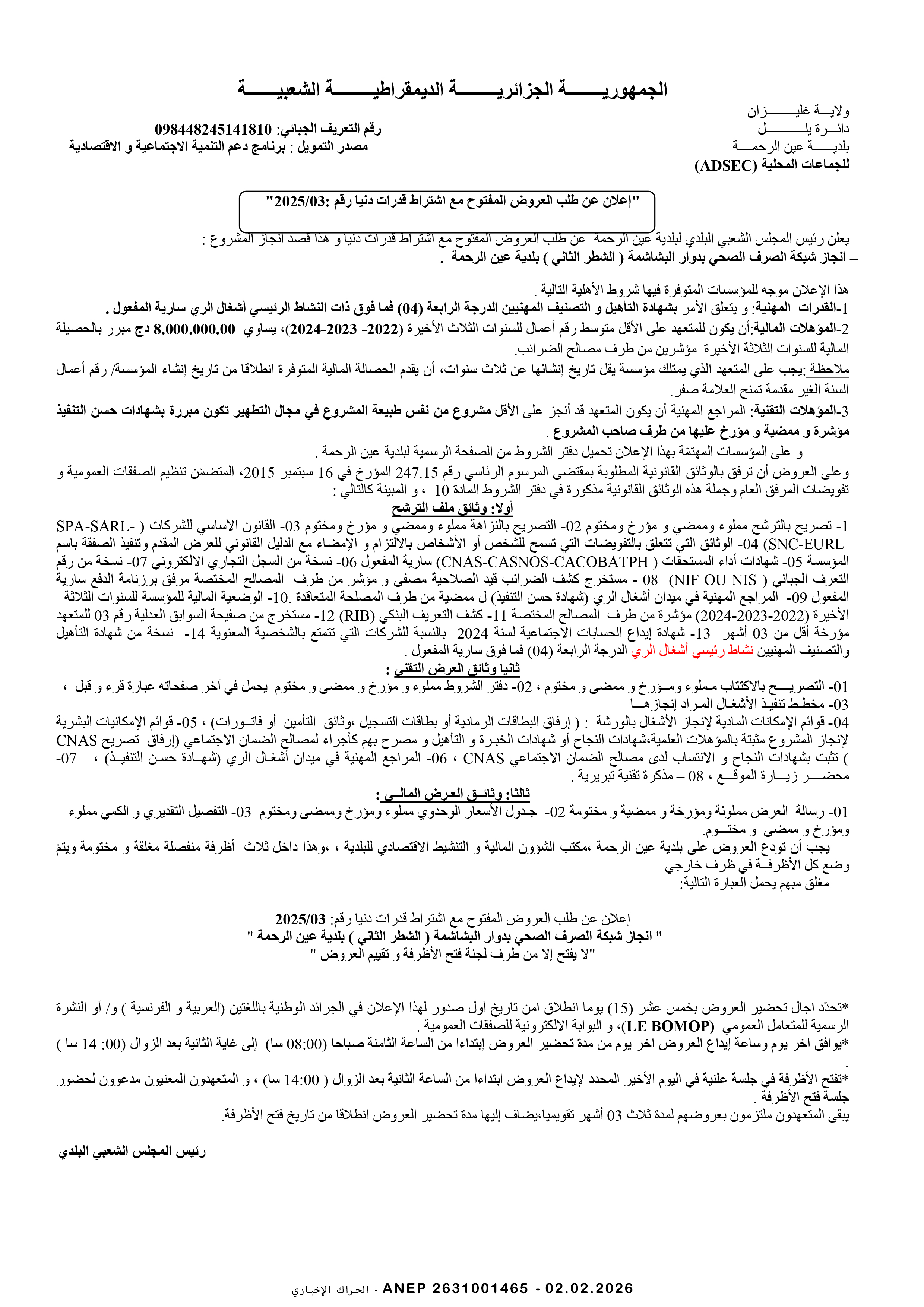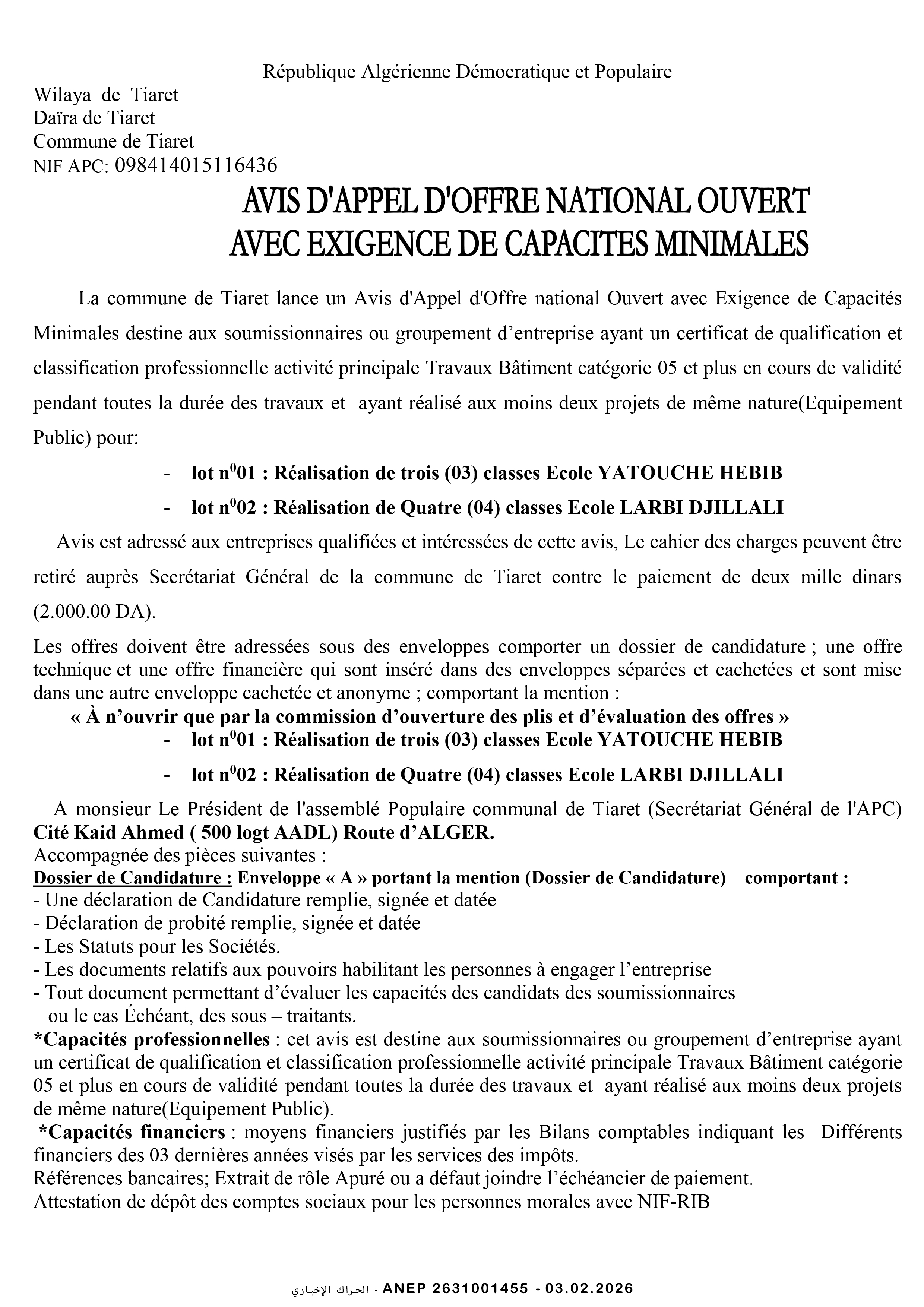 إعلان عن طلب عروض وطني مفتوح مع اشتراط قدرات دنيا رقم 2026/02