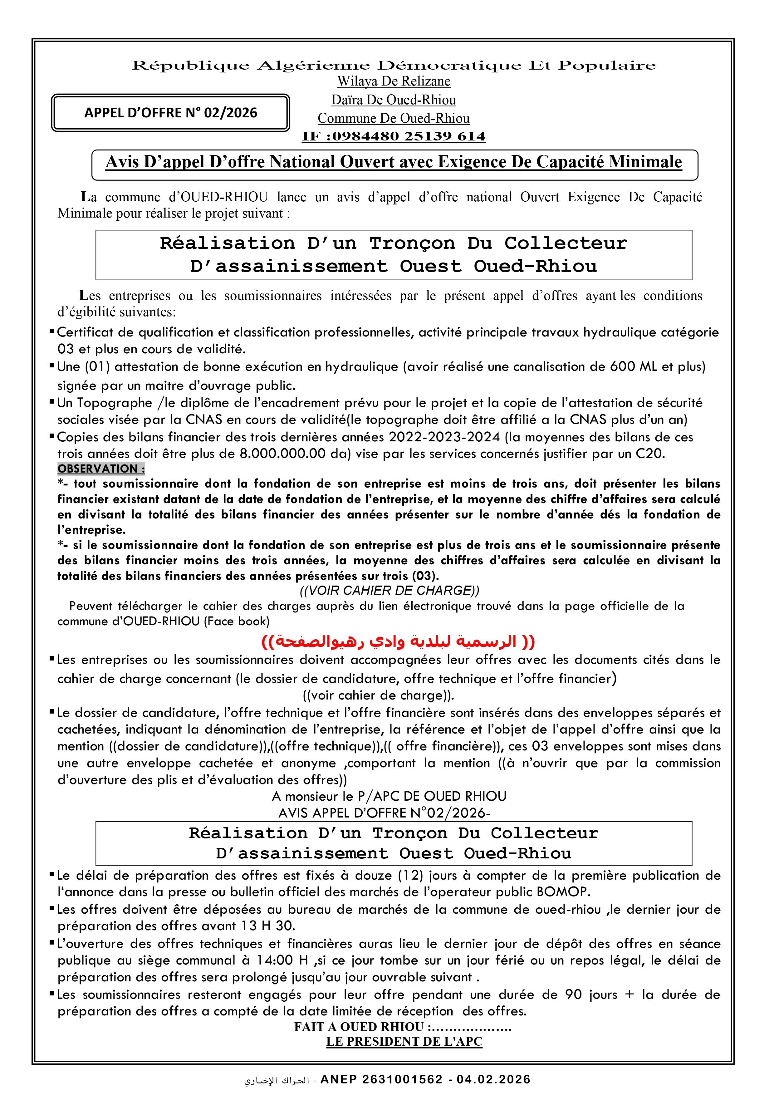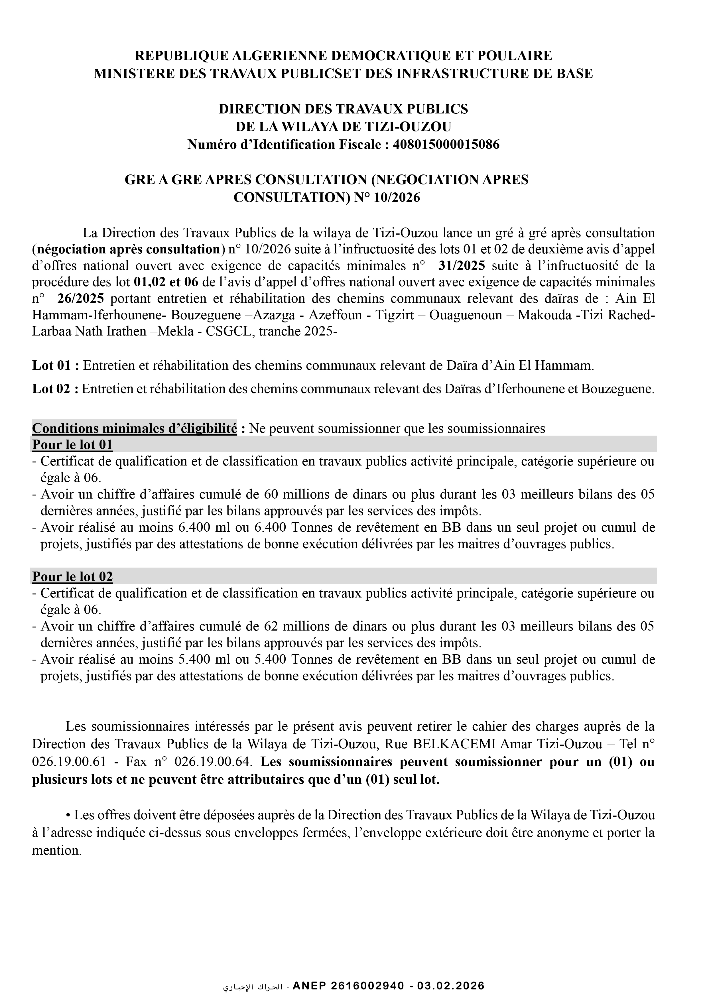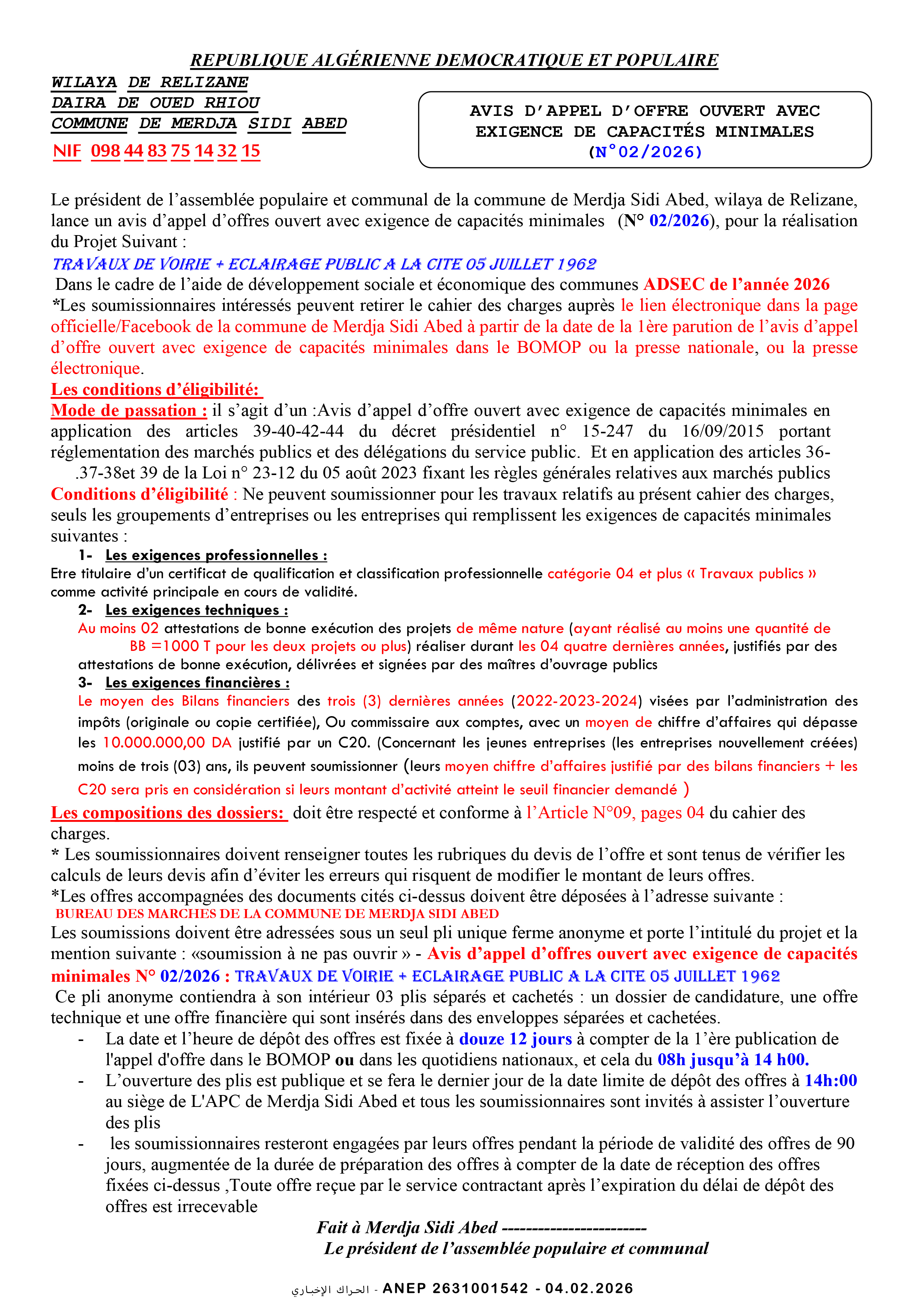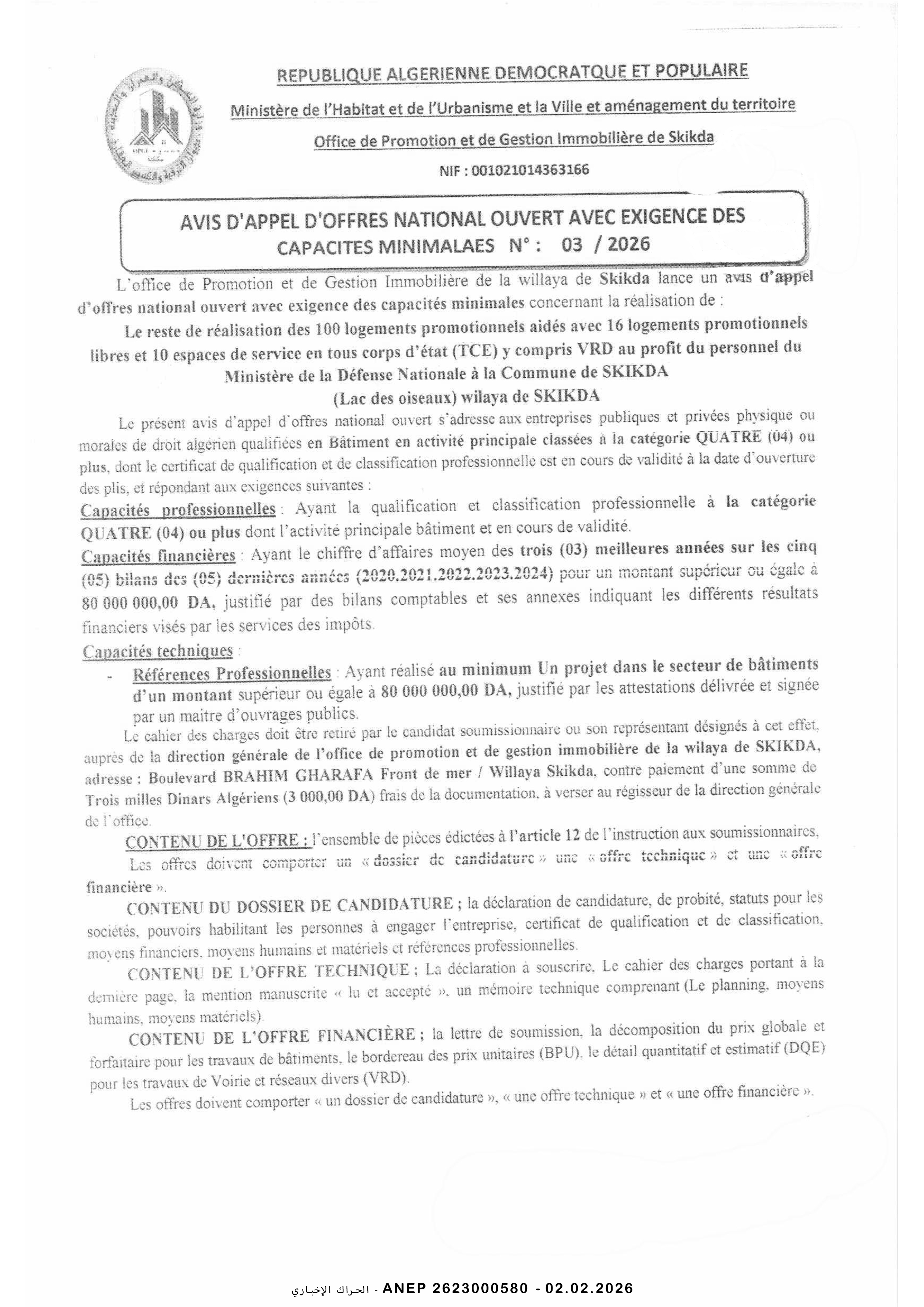 إعلان عن طلب عروض وطني مفتوح مع اشتراط قدرات دنيا رقم 2026/02