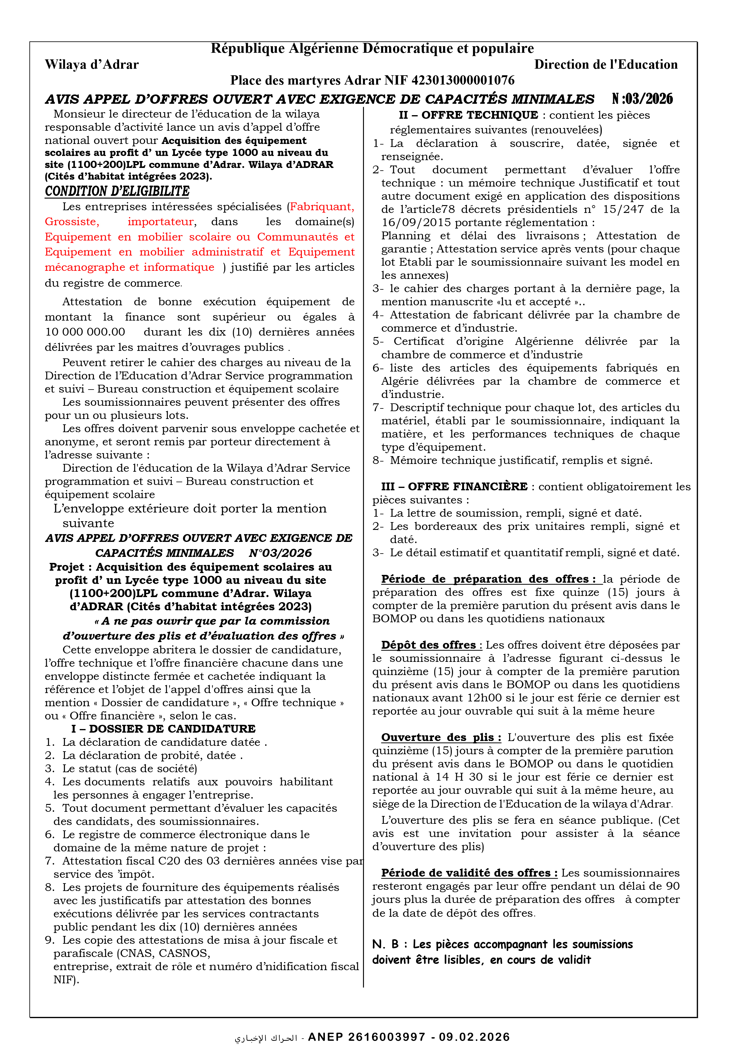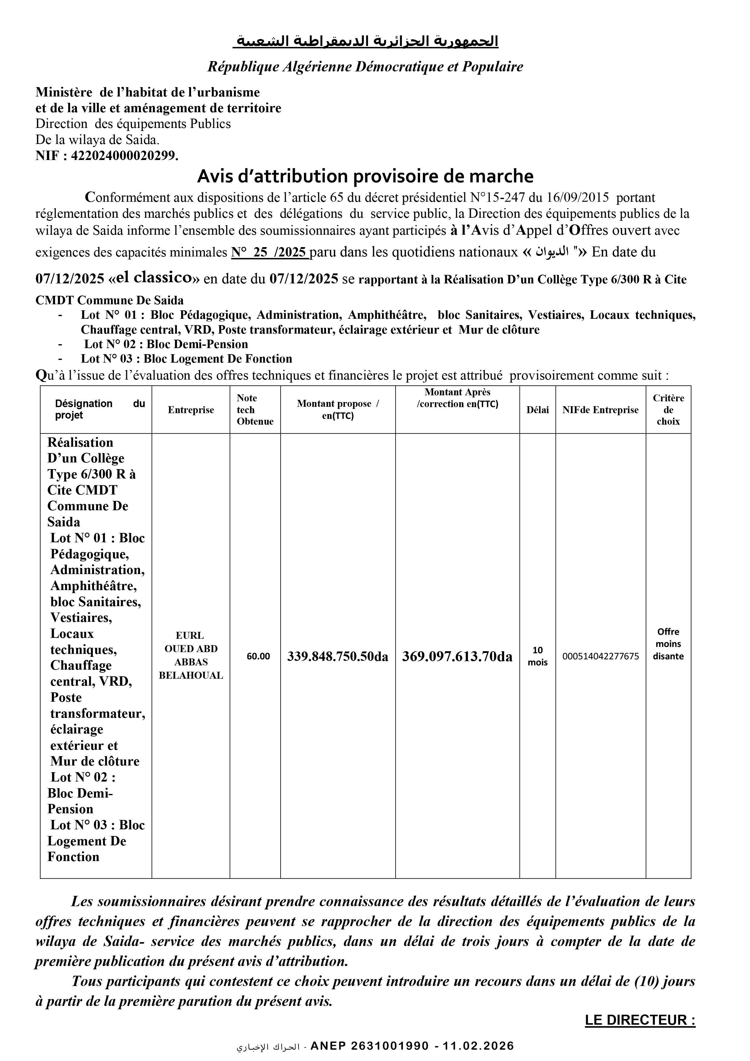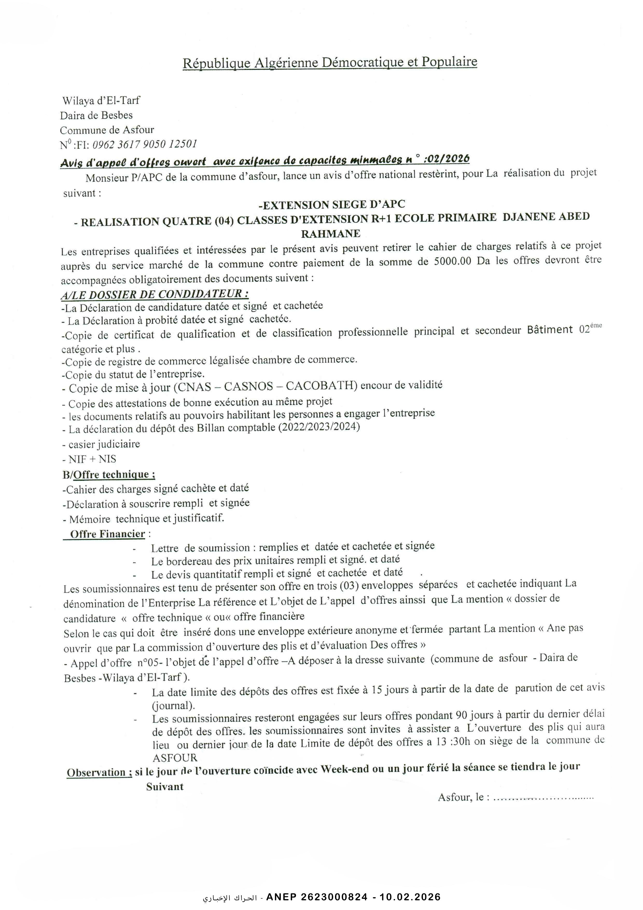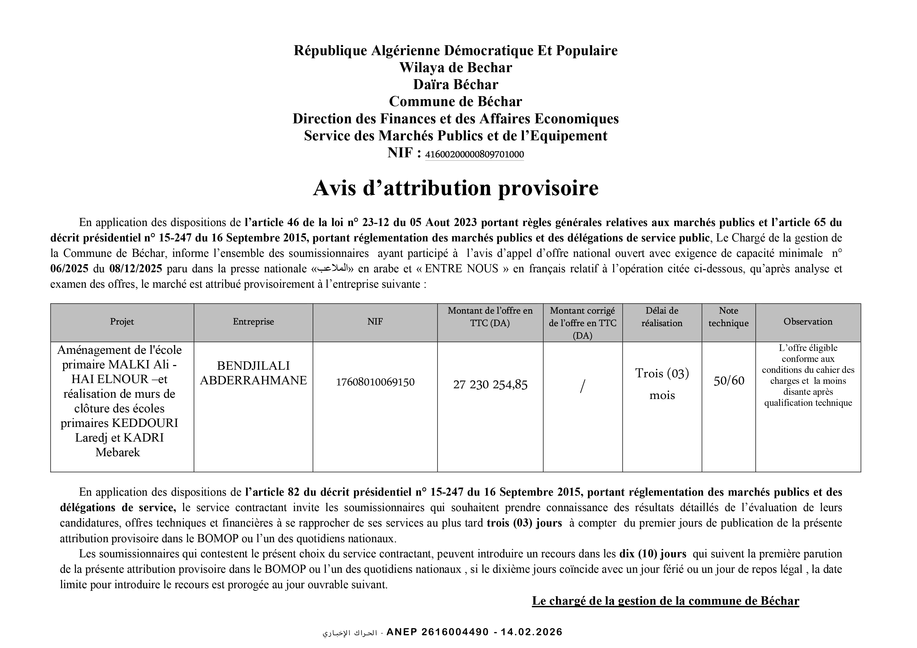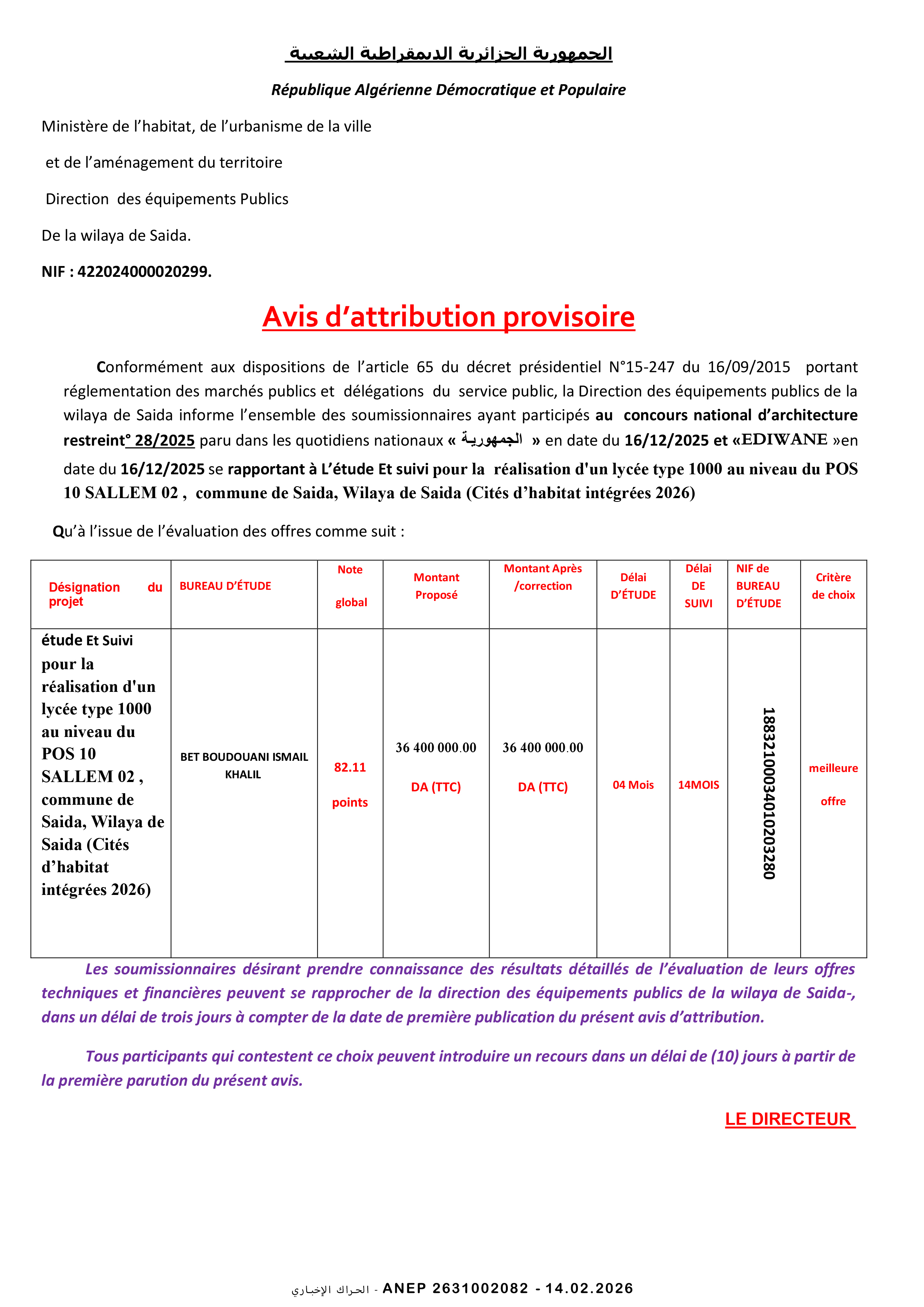 دراسة و متابعة لانجاز ابتدائية صنف 02 بلدية عين الصفراء ولاية النعامة