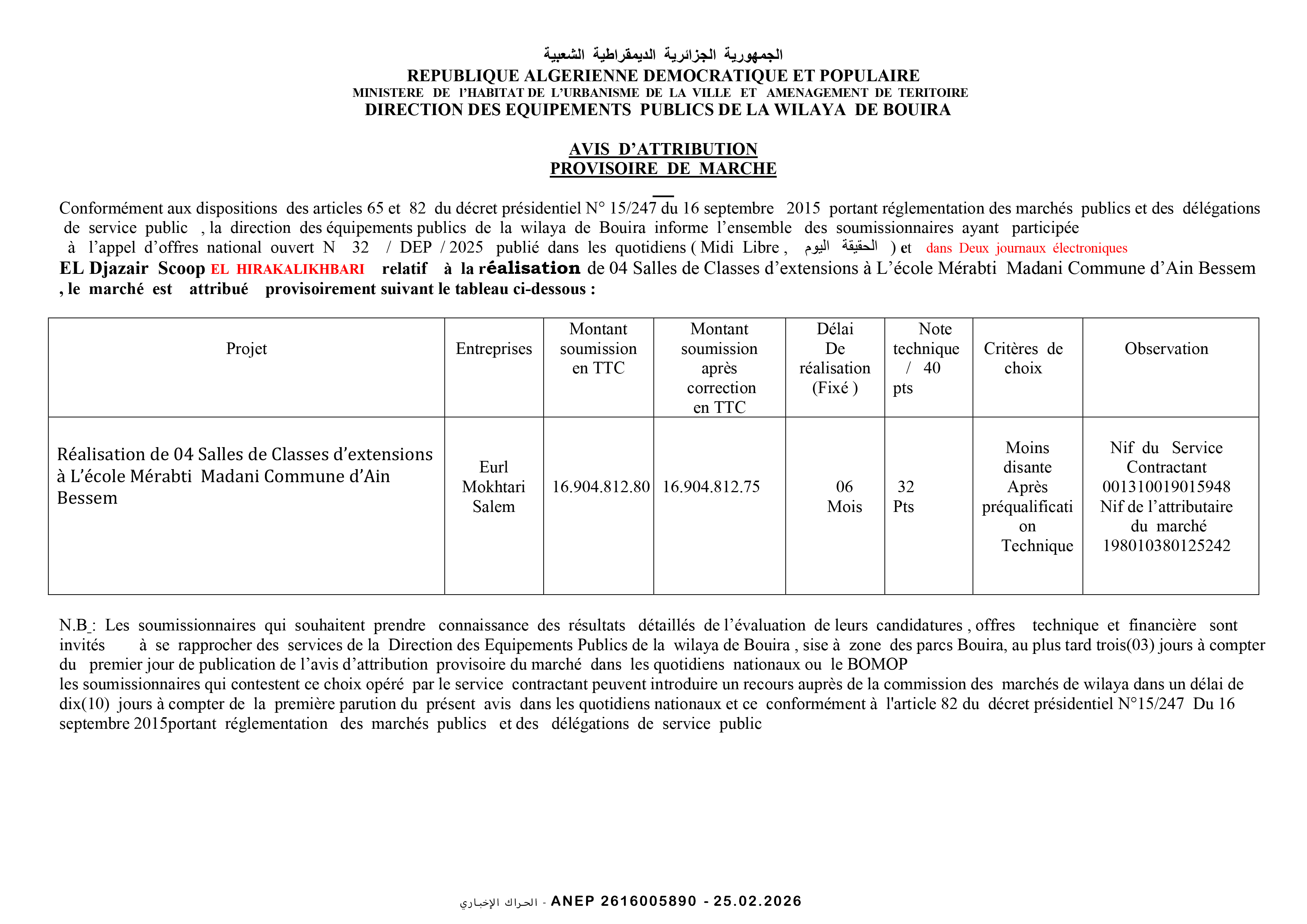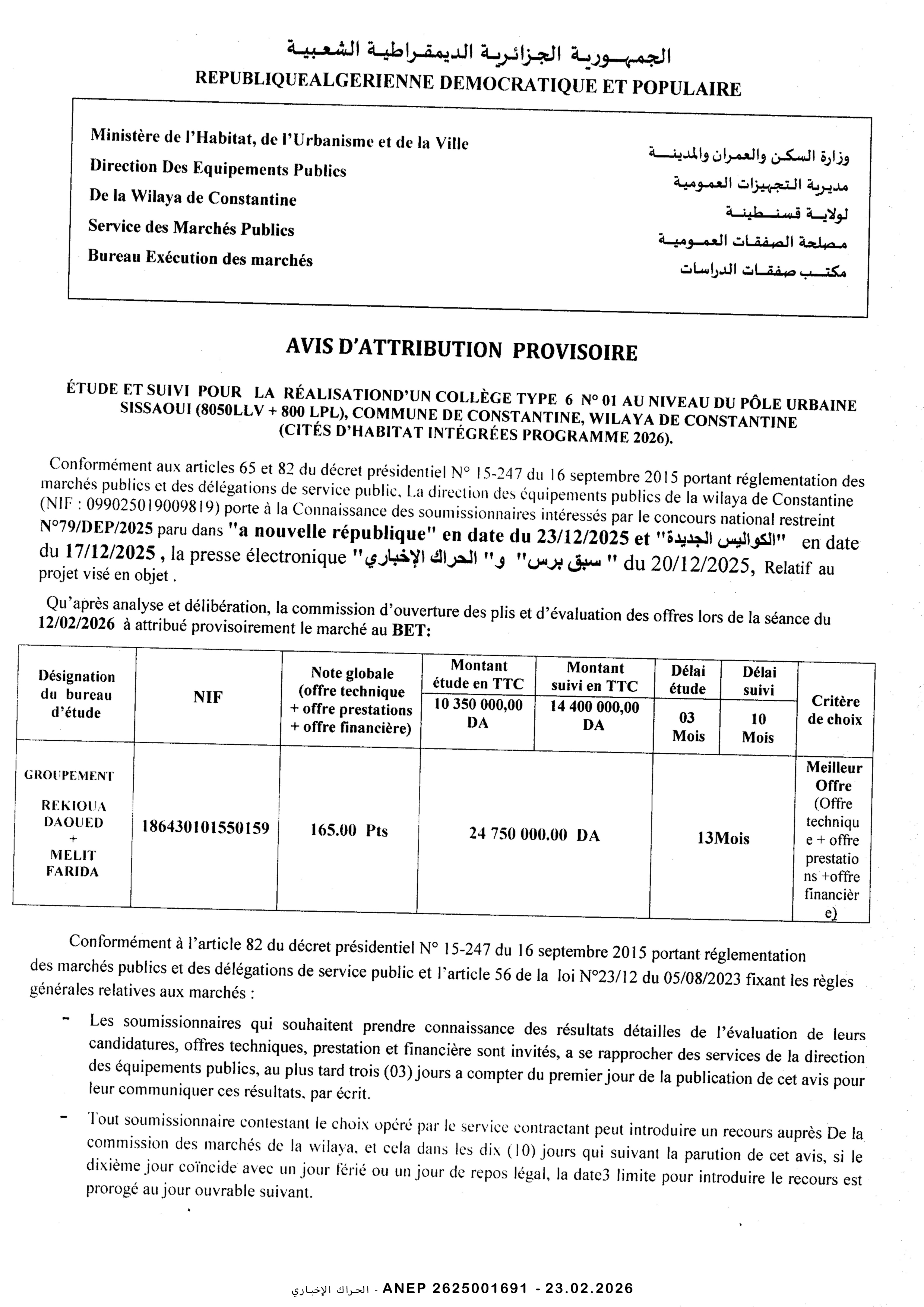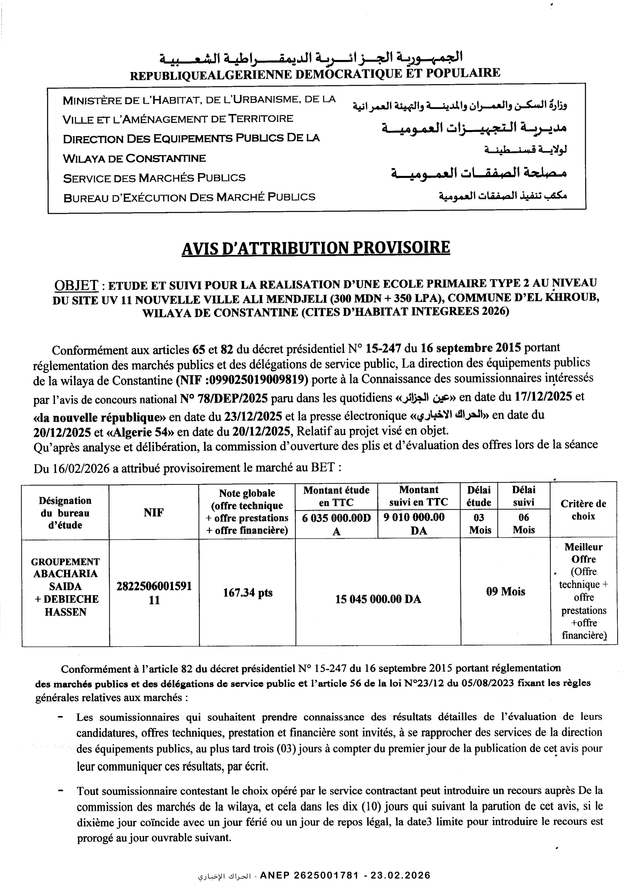 دراسة و متابعة لانجاز ابتدائية صنف 02 بلدية الخروب ولاية قسنطينة