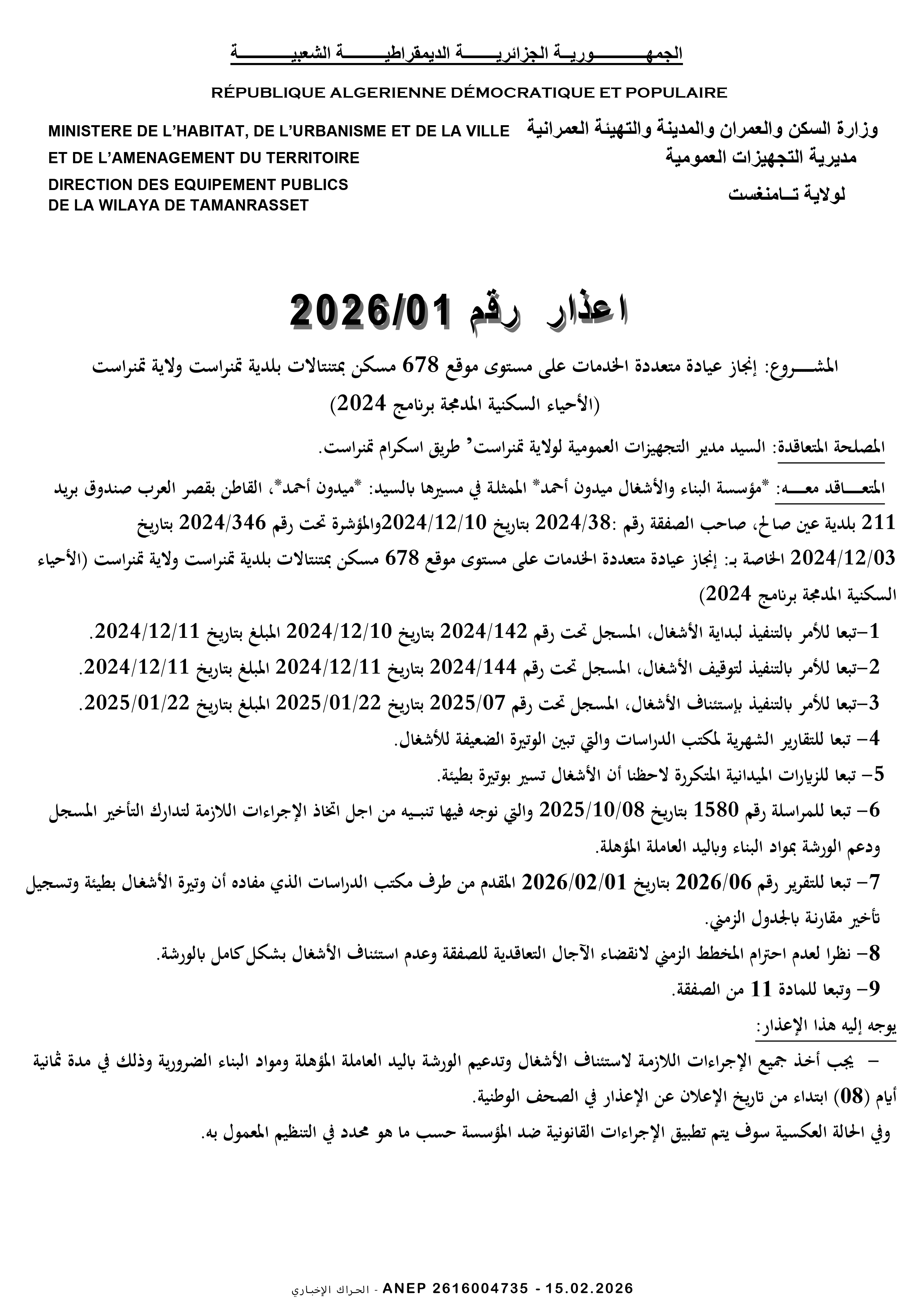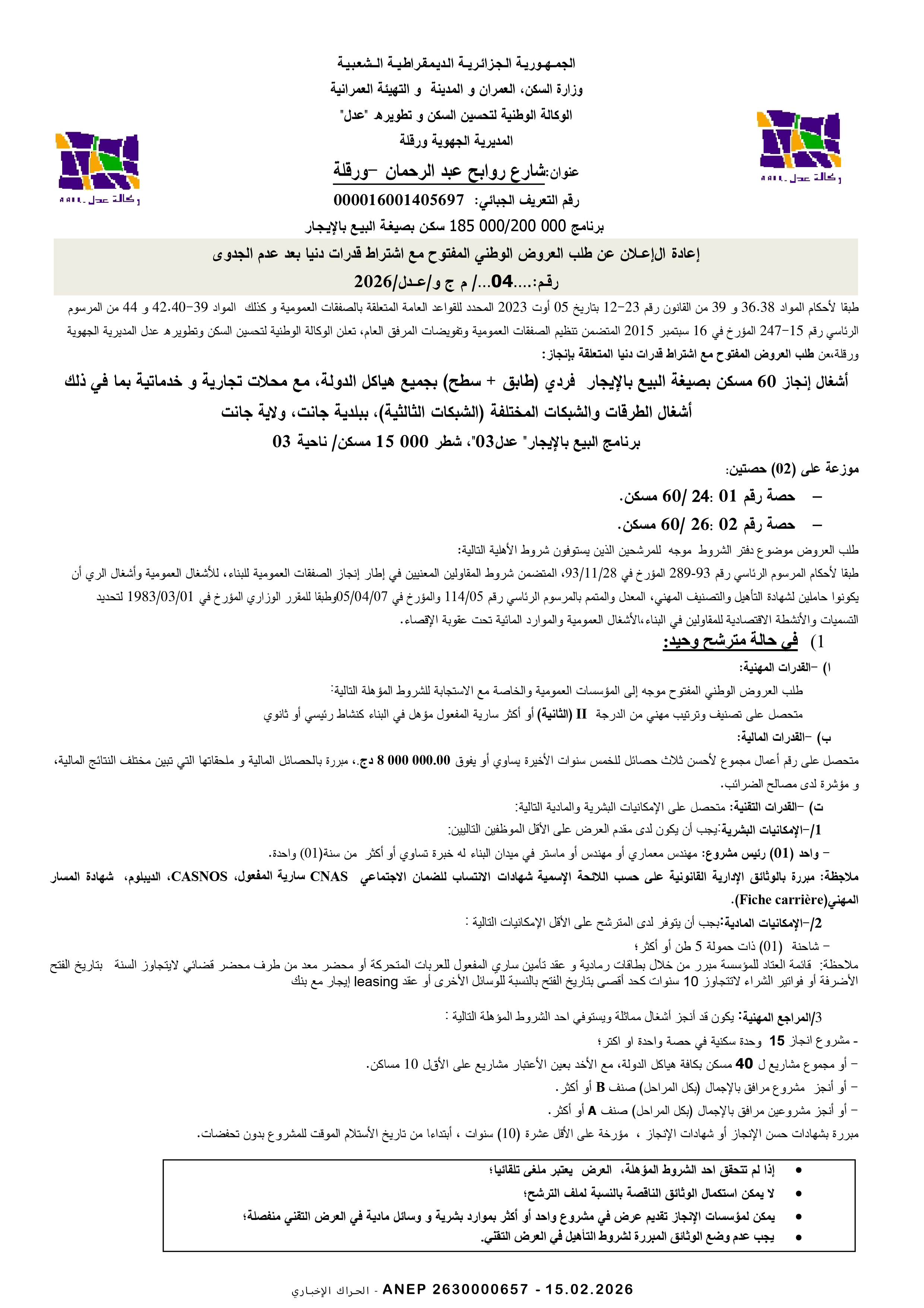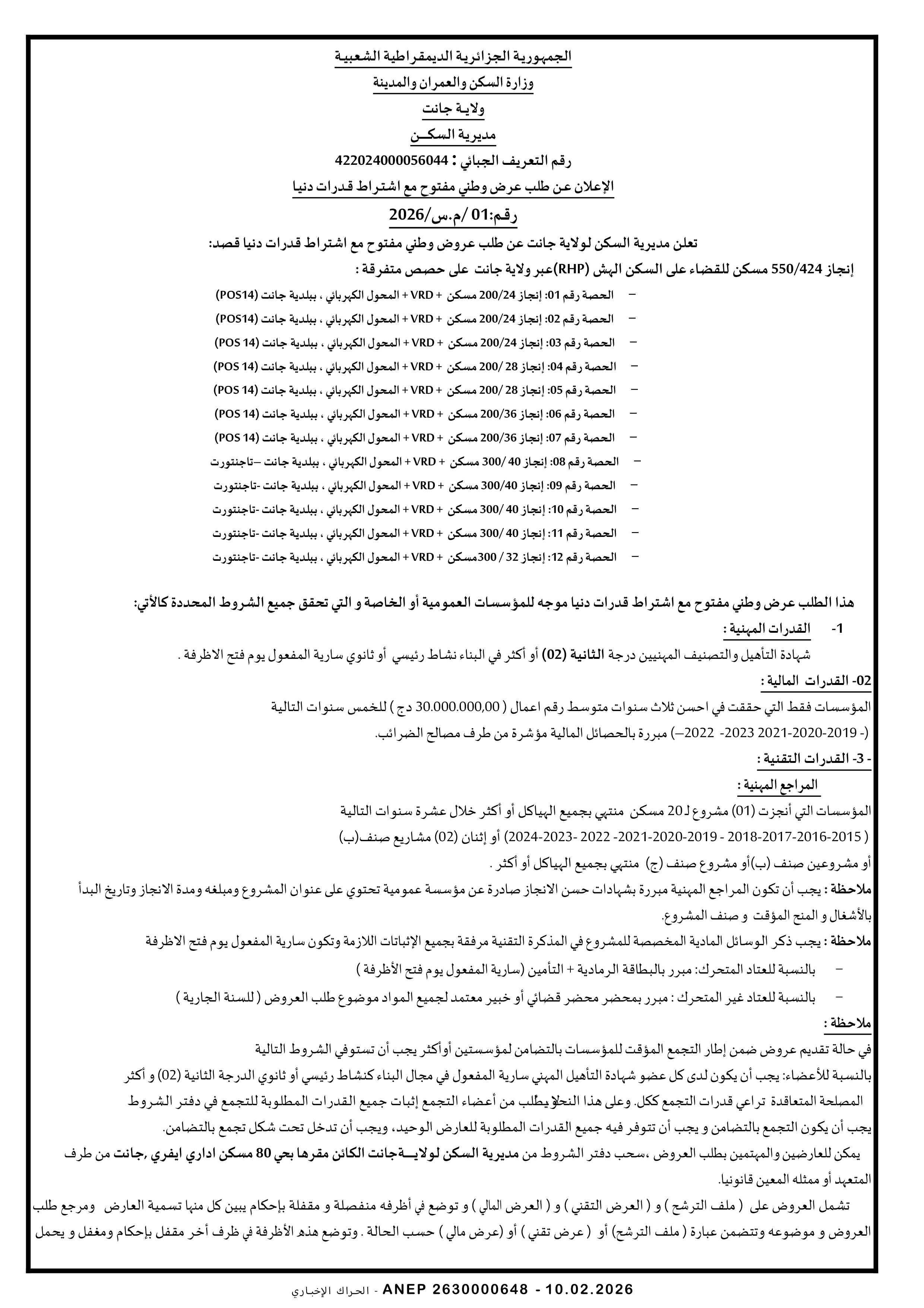 إنجاز 60 مسكن بصيغة بيع بالايجار مع محلات و أشغال الشبكات بلدية جانت ولاية جانت