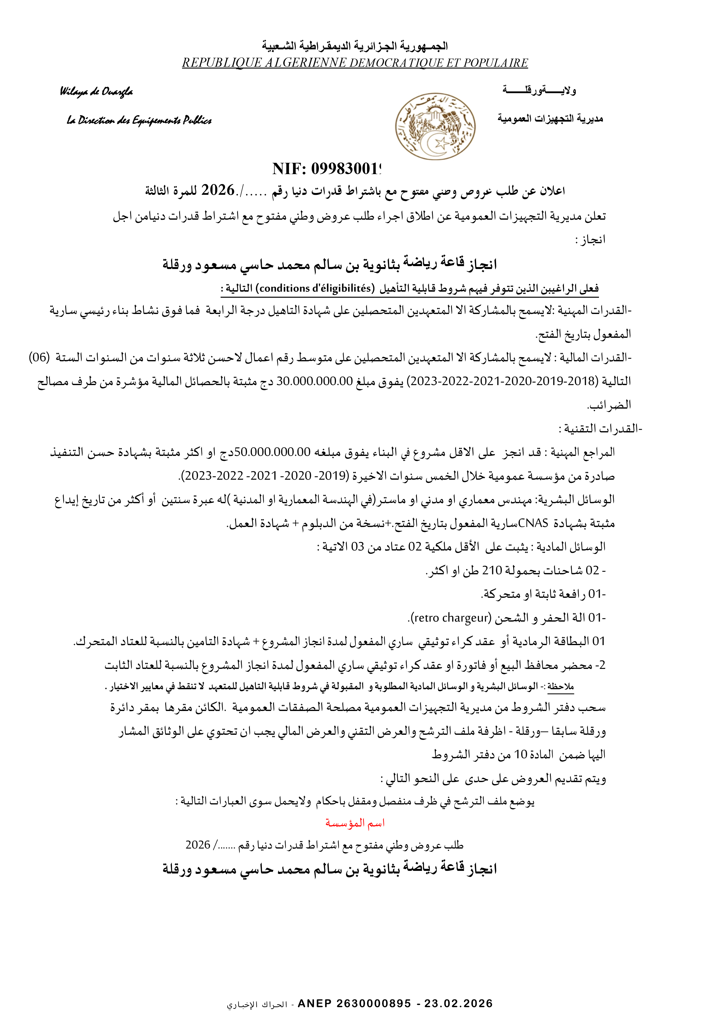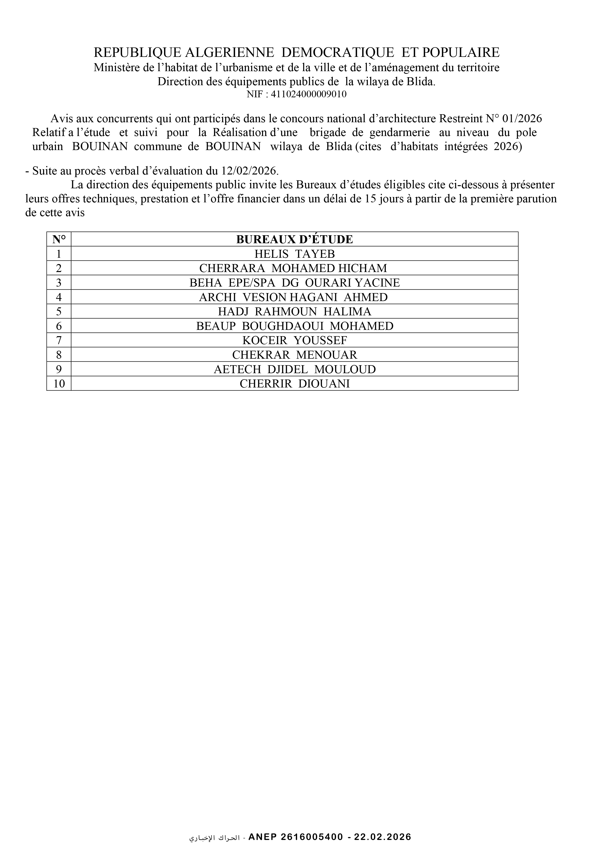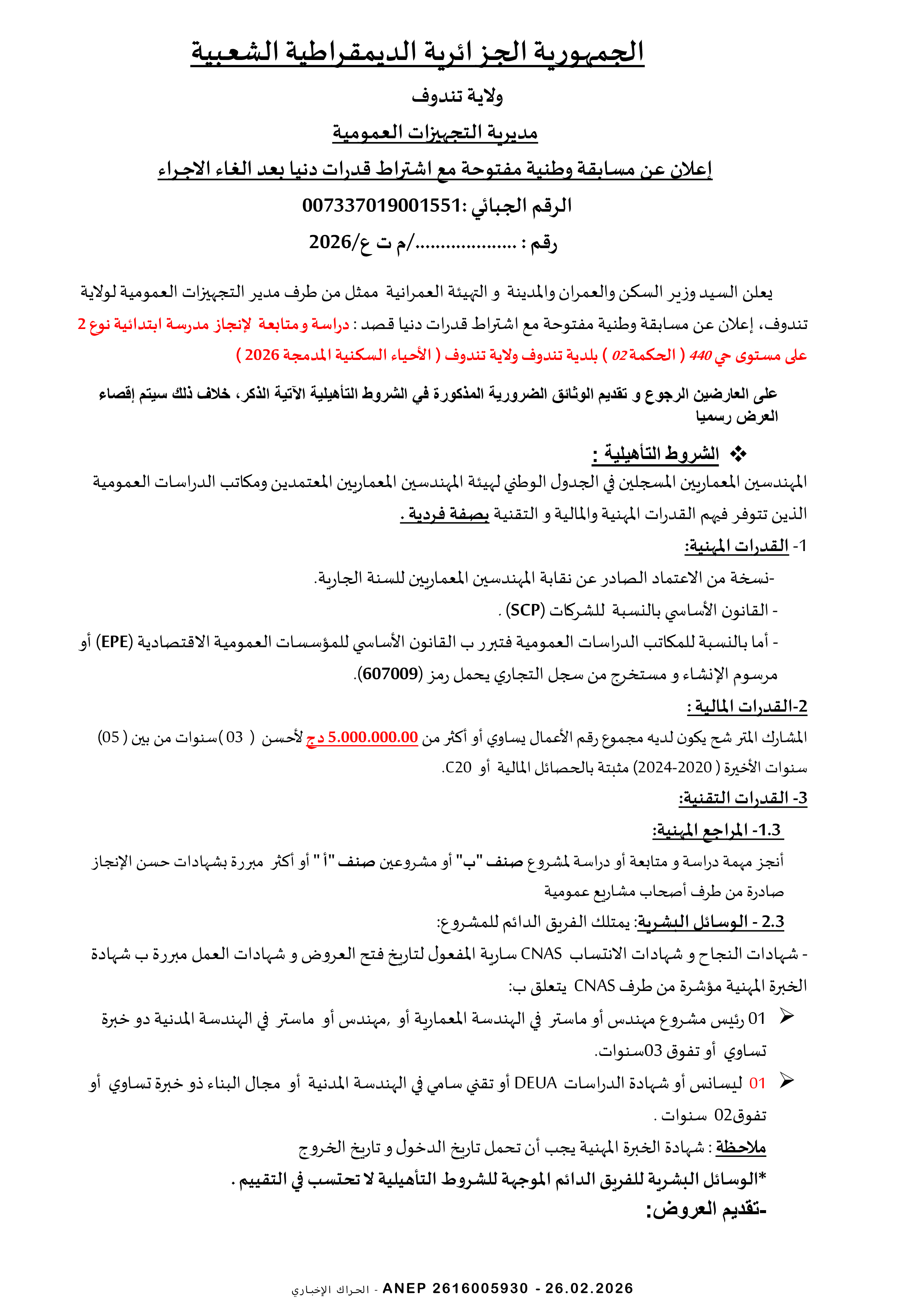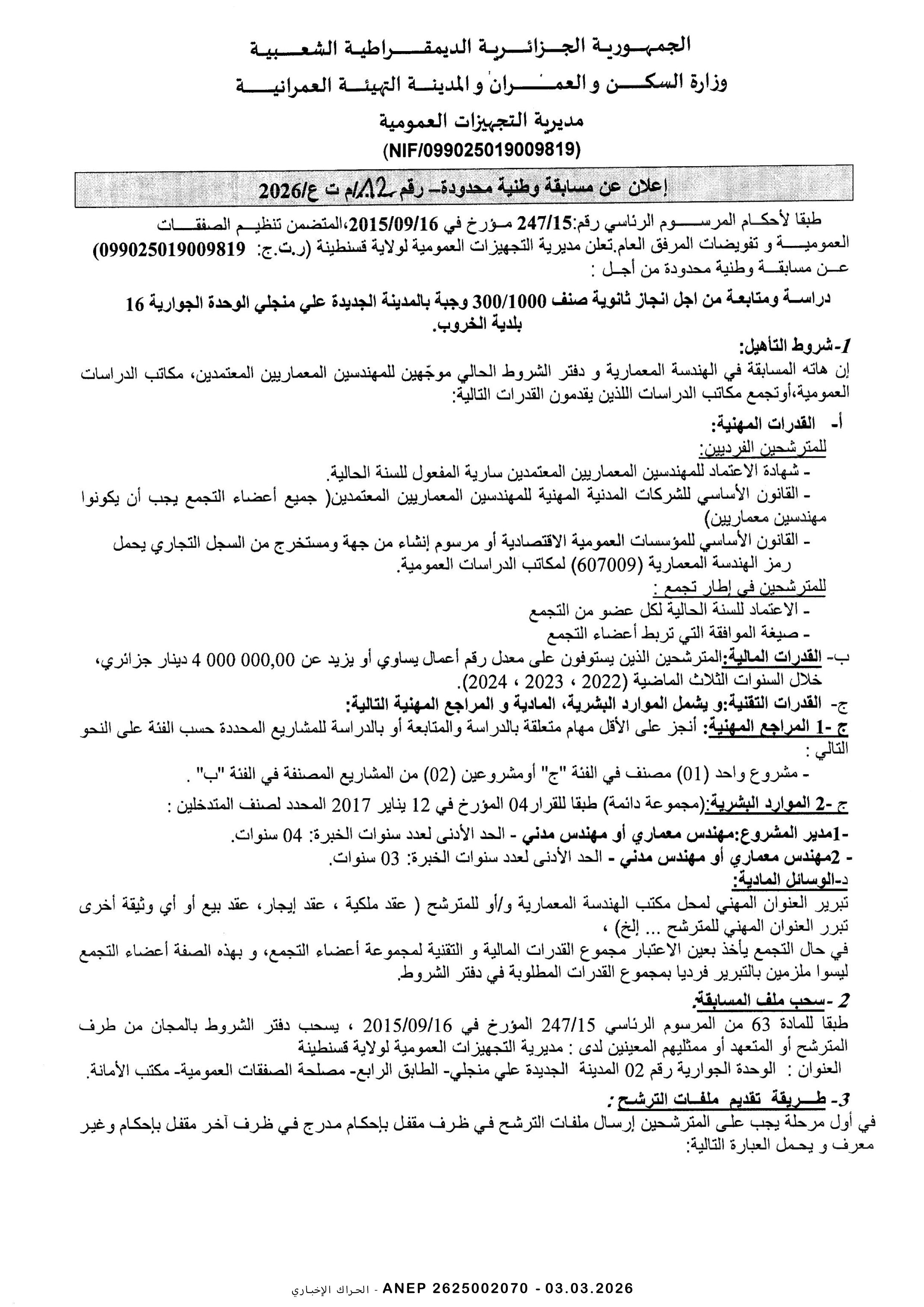 إعلان مسابقة وطنية محدودة