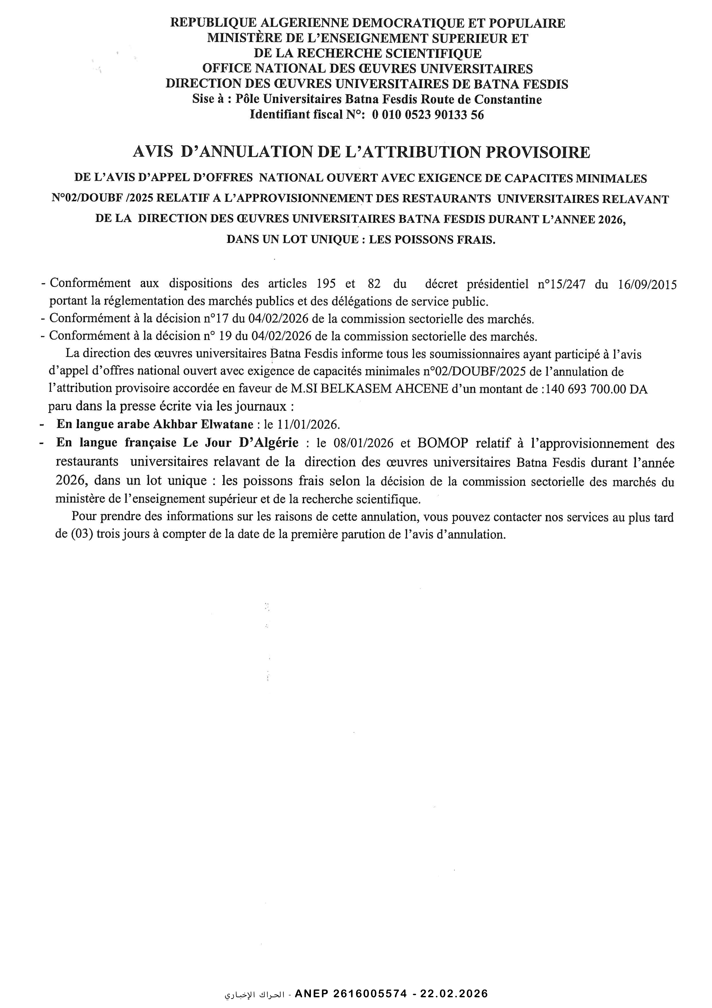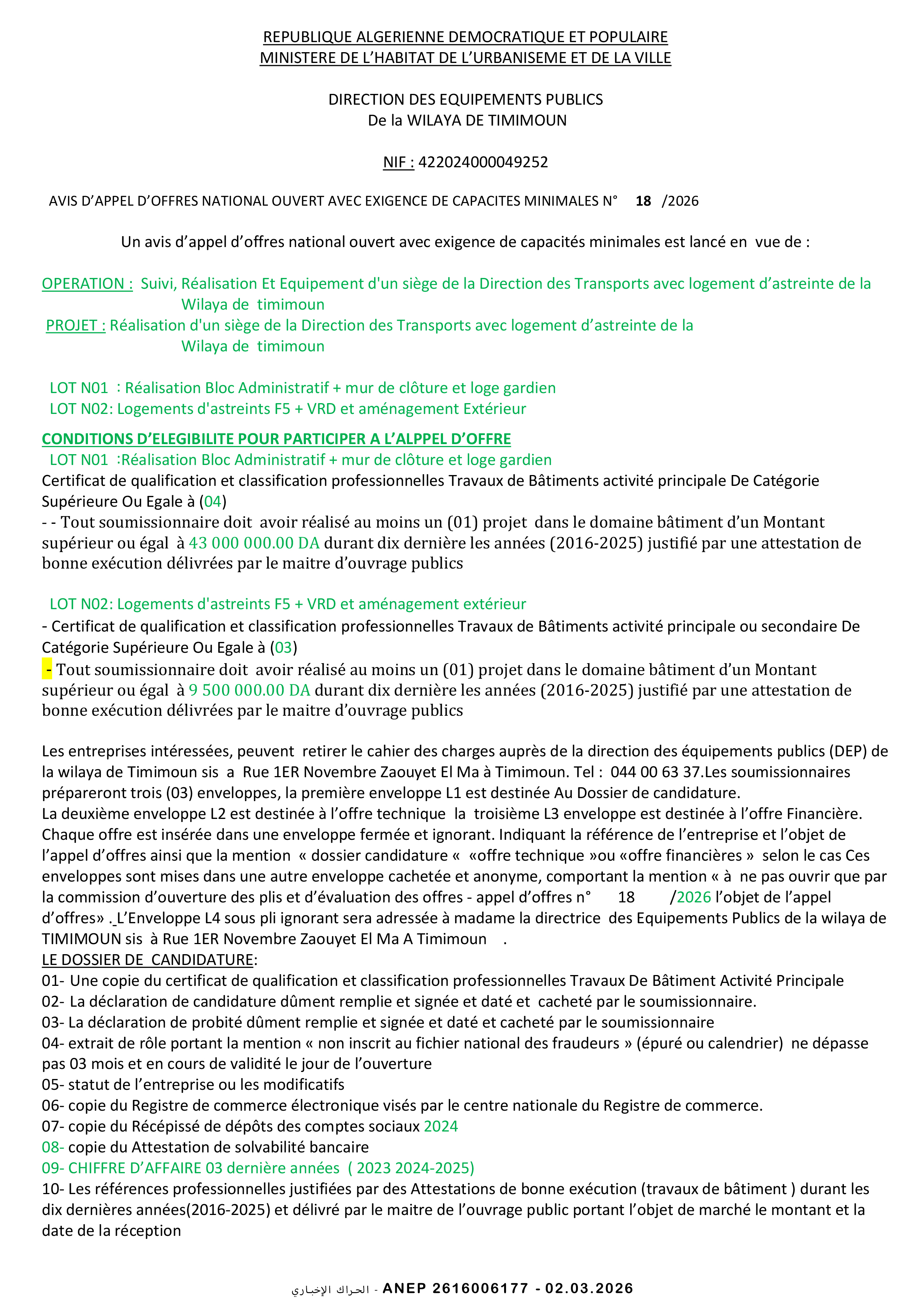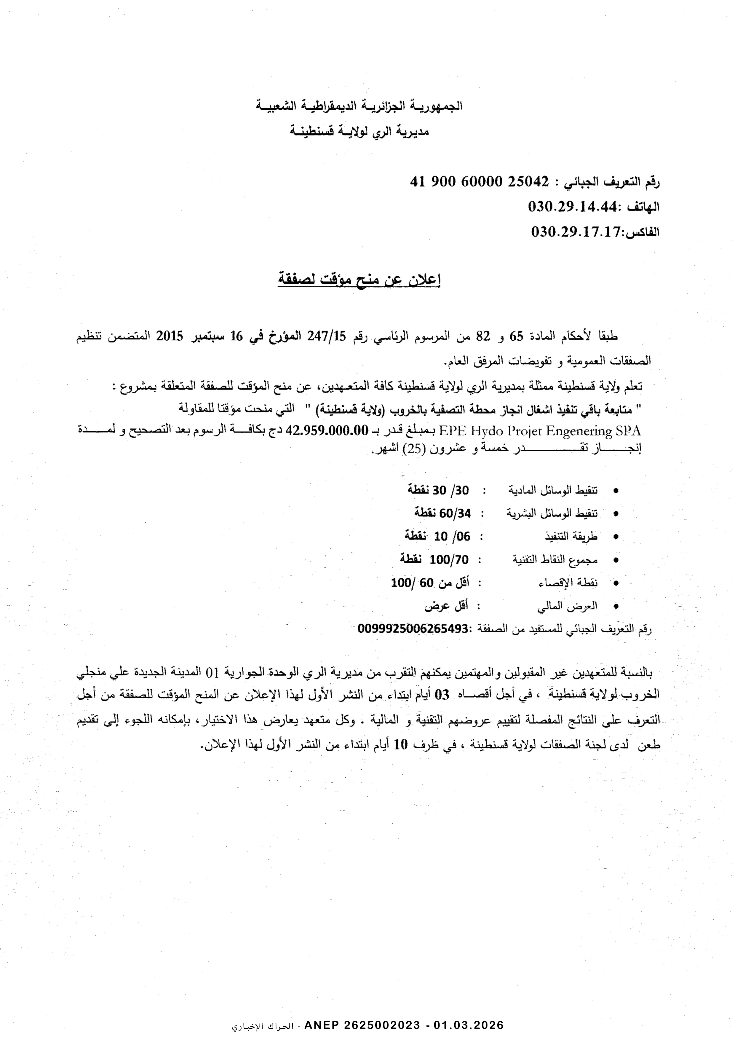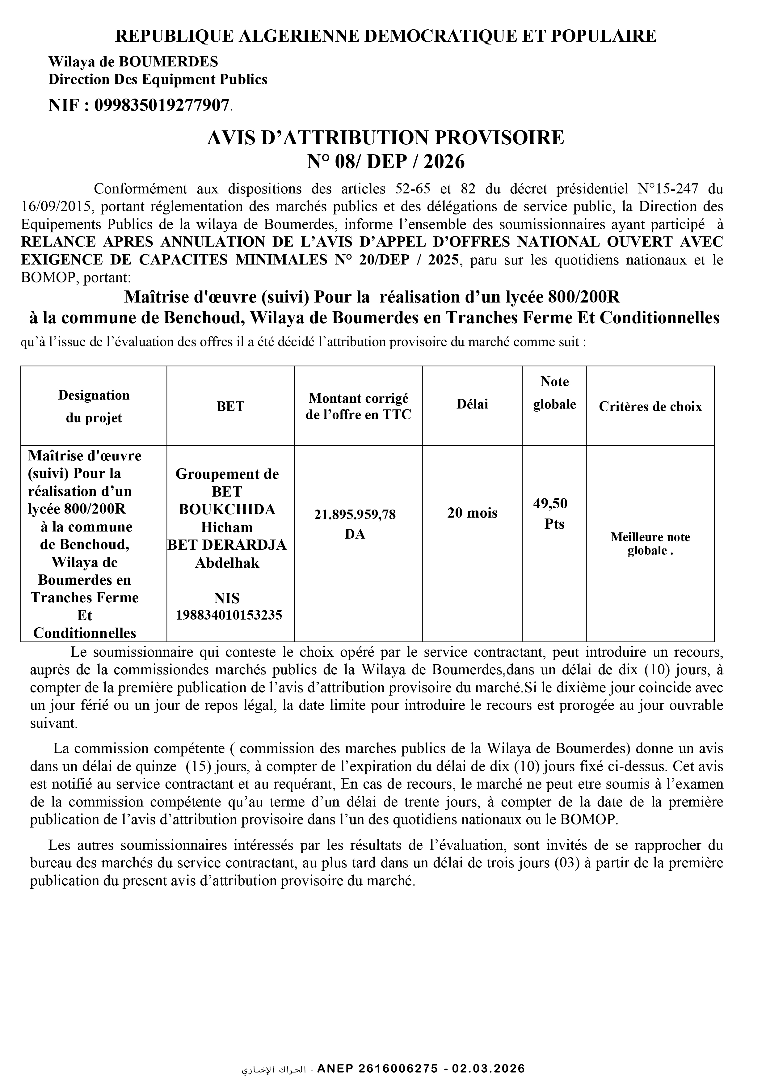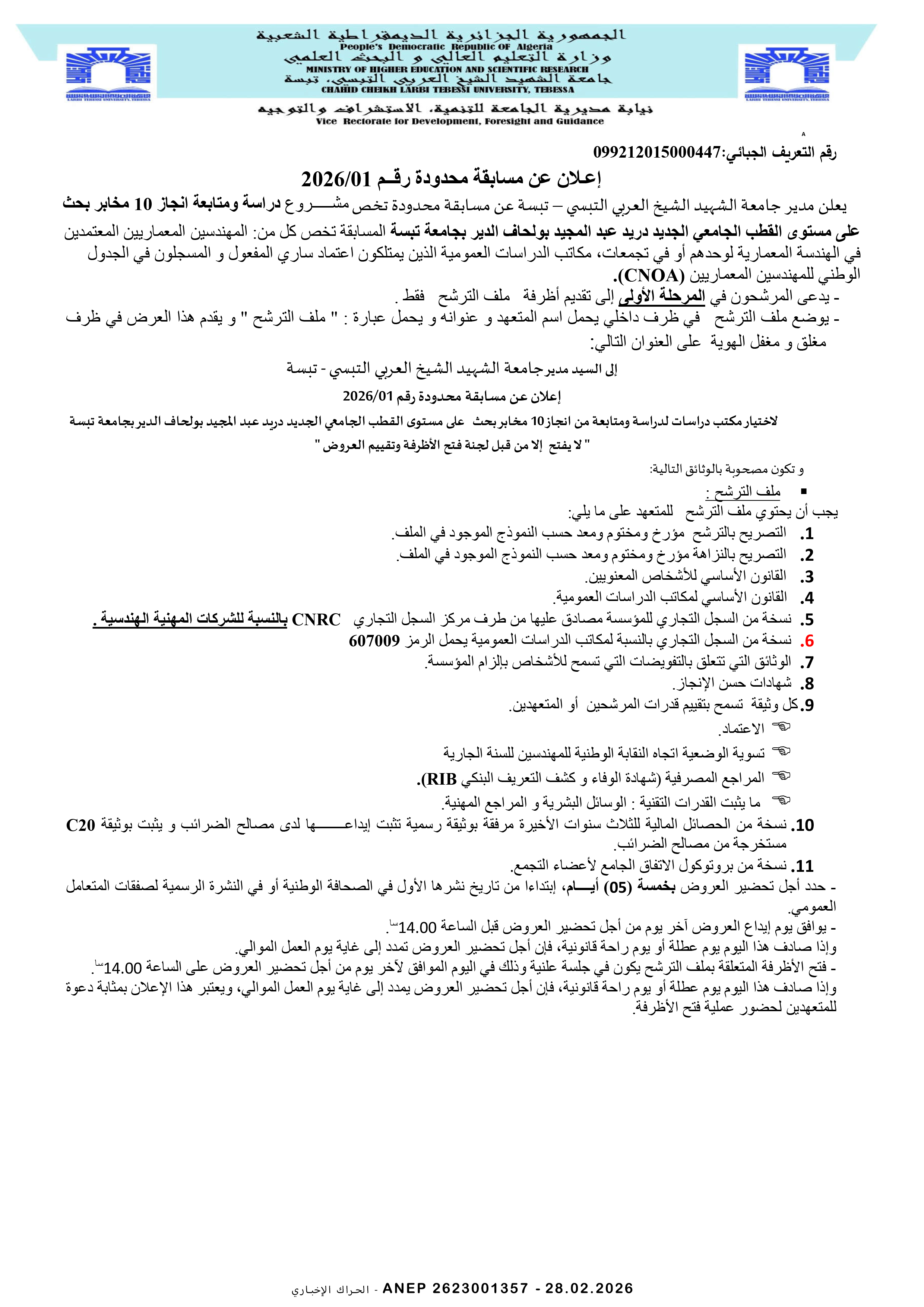 إعلان مسابقة وطنية محدودة