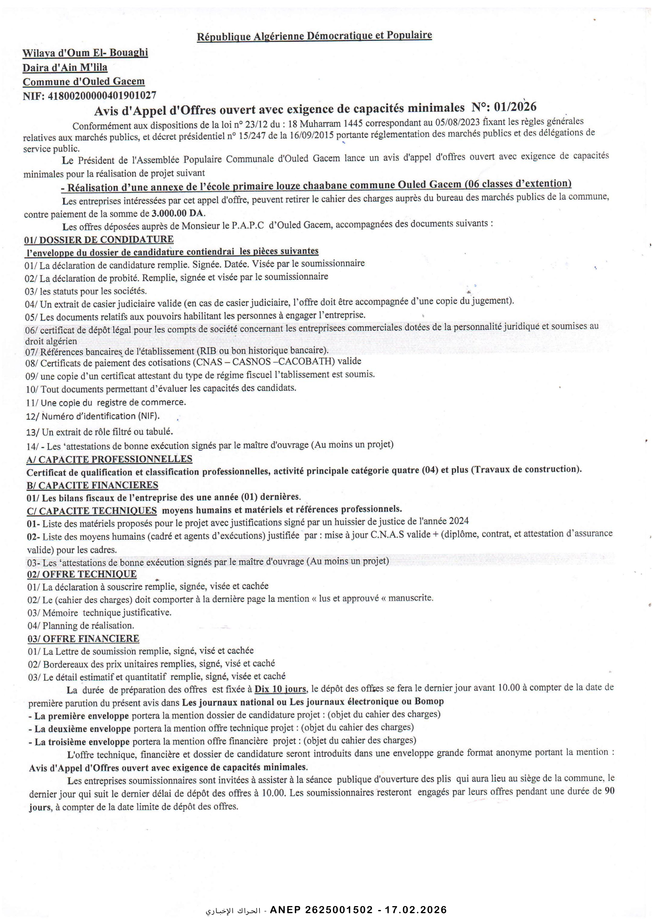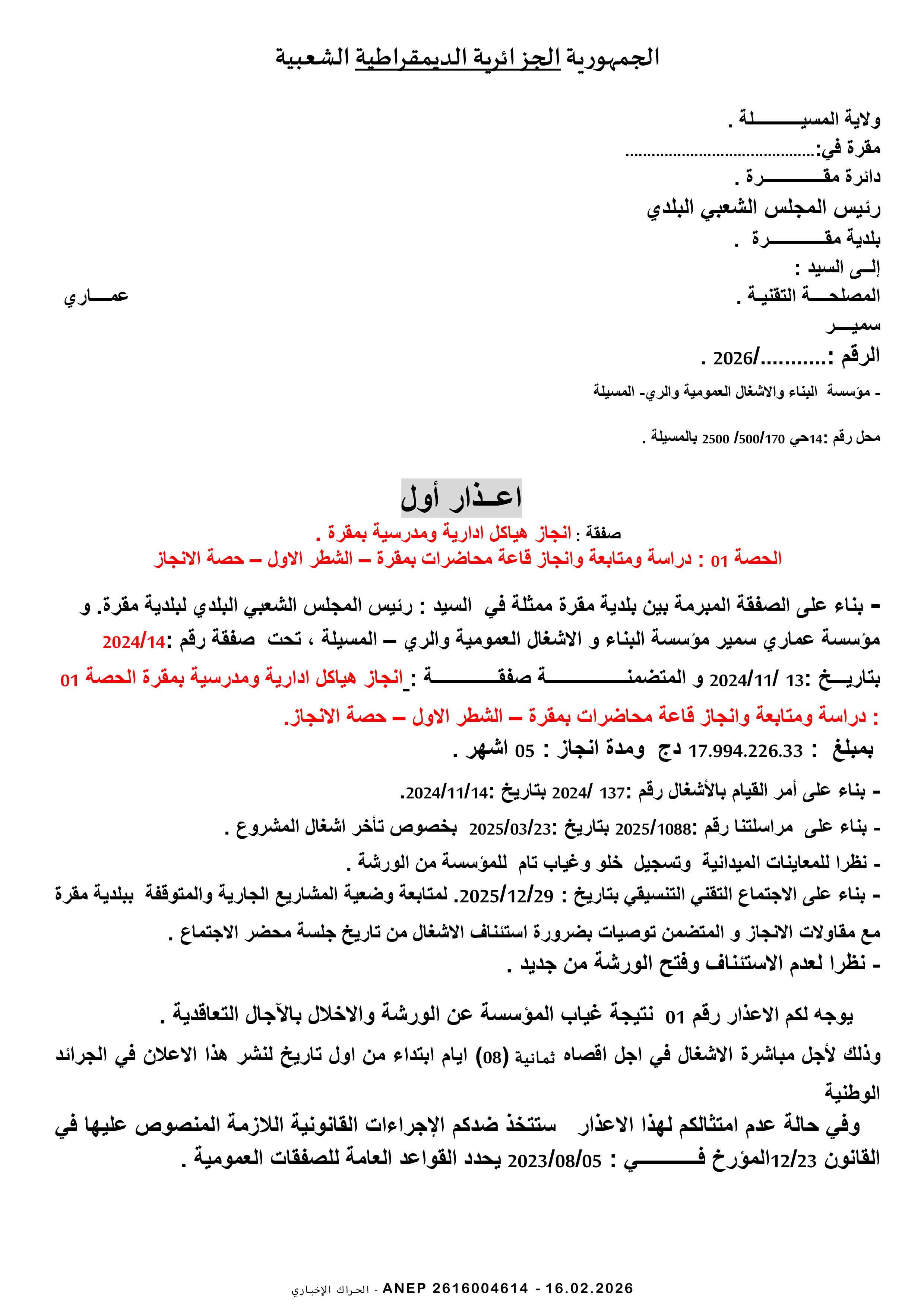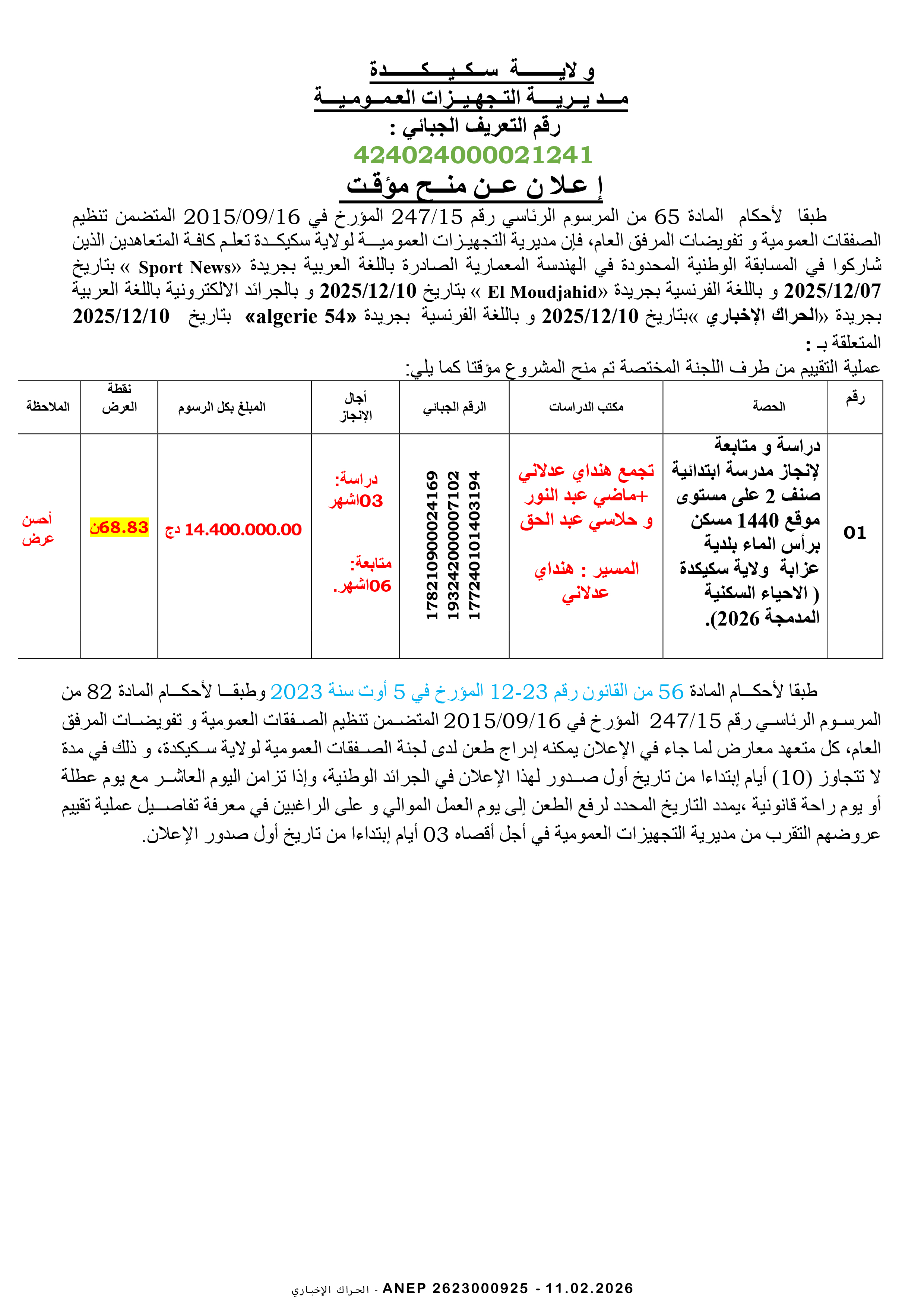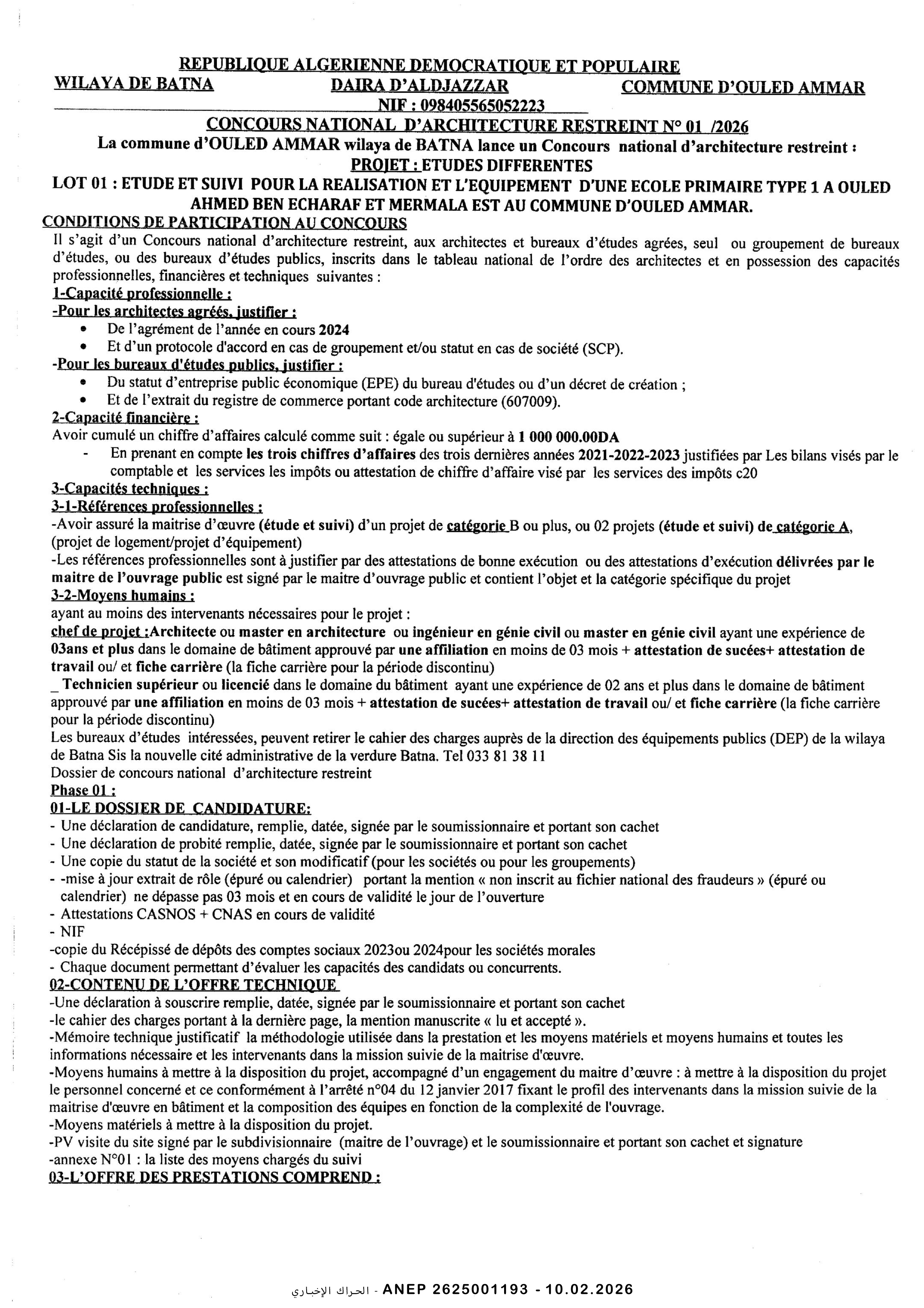 دراسة و متابعة لانجاز ابتدائية صنف 01 رقم 02 بلدية أولاد عمار