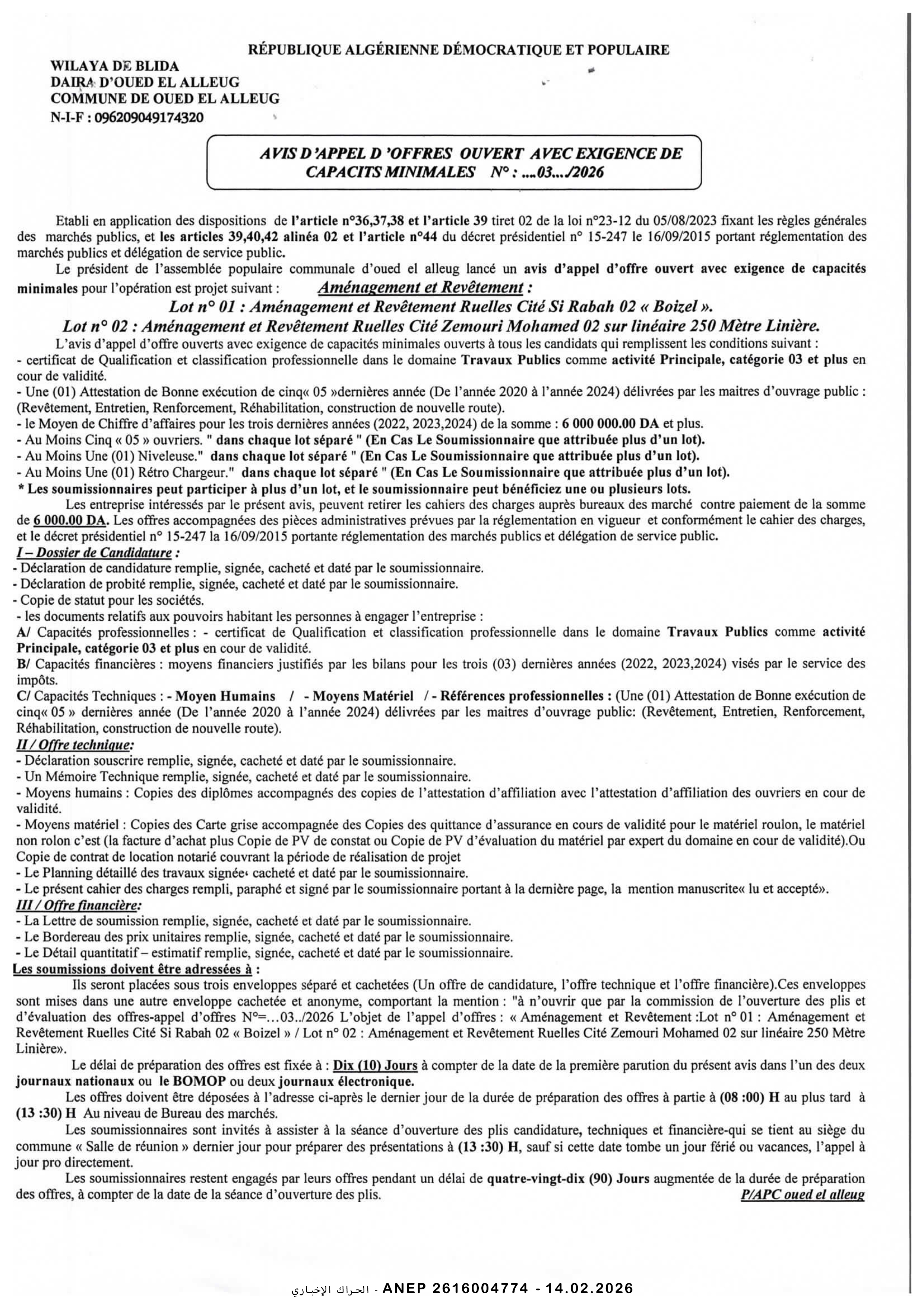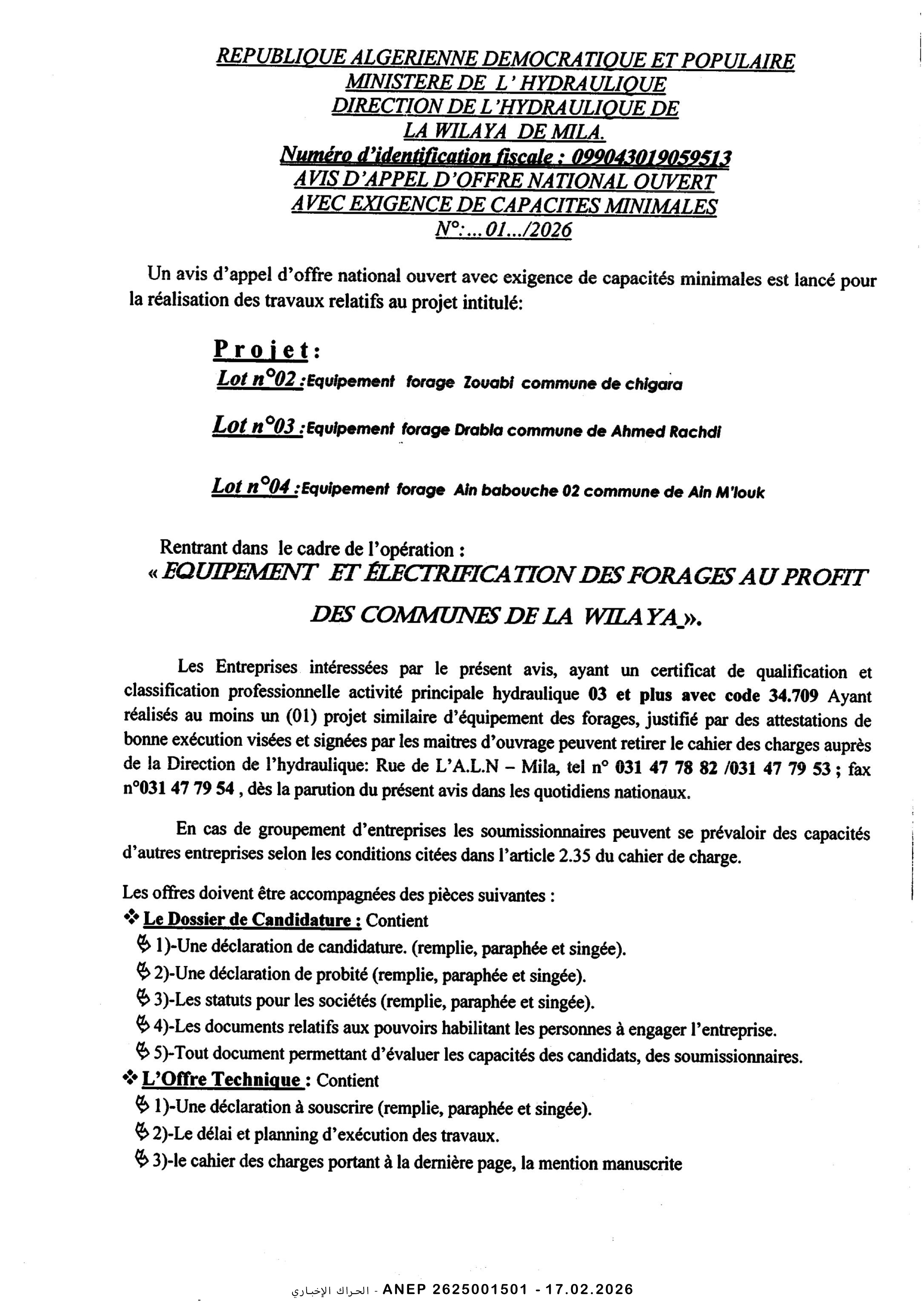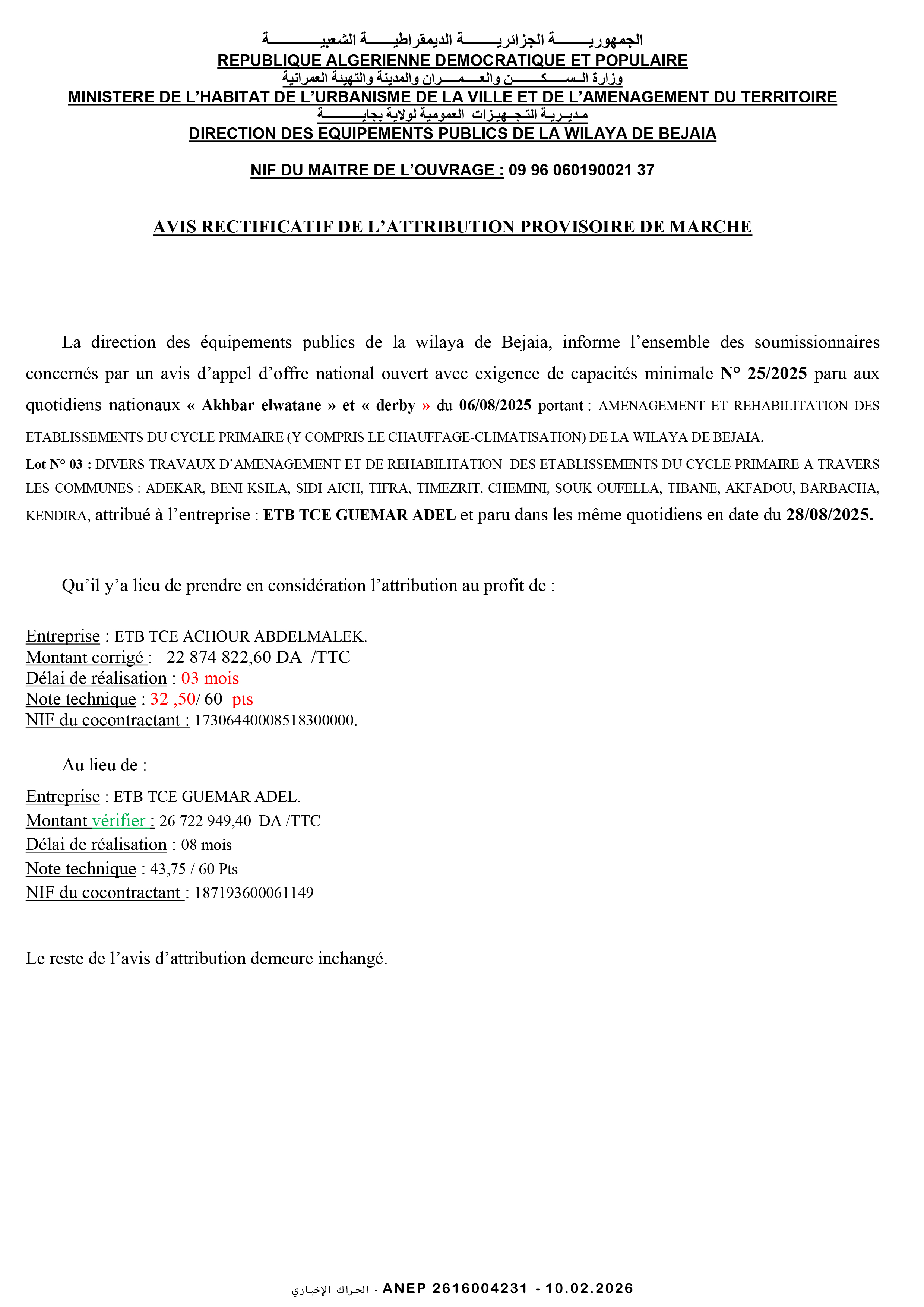 دراسة و متابعة لانجاز ابتدائية صنف 01 رقم 02 بلدية أولاد عمار