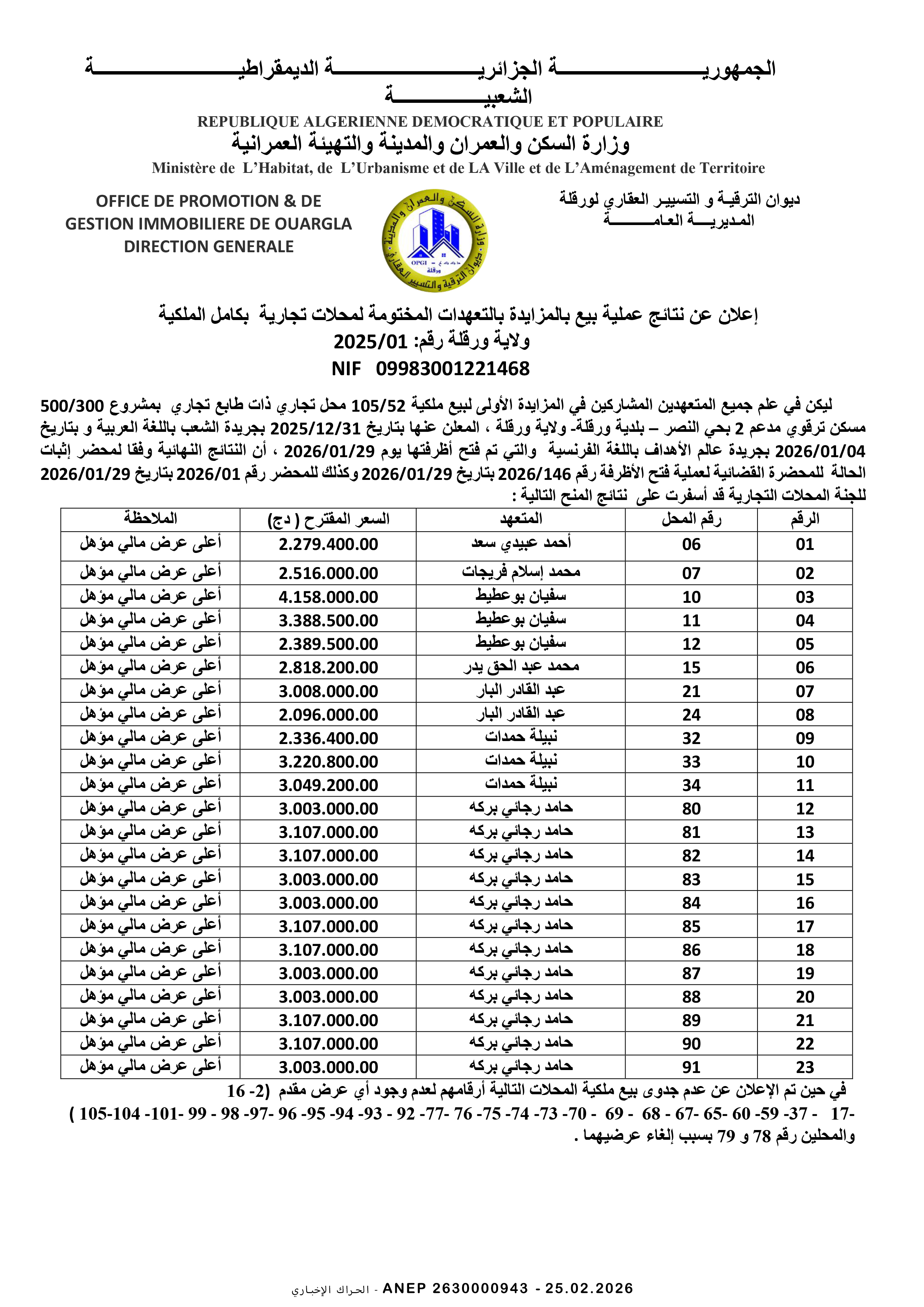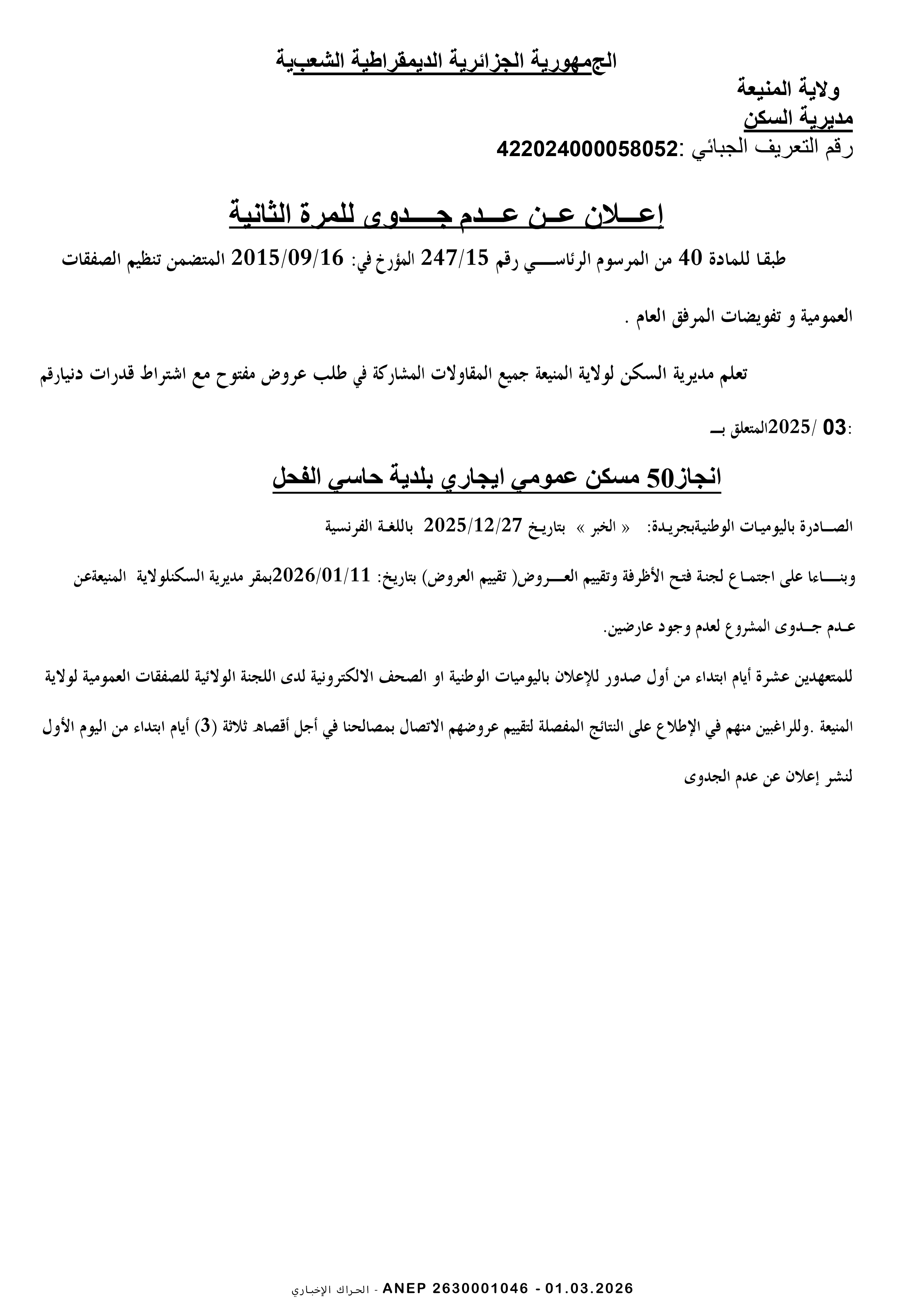 مديرية السكن ولاية المنيعة