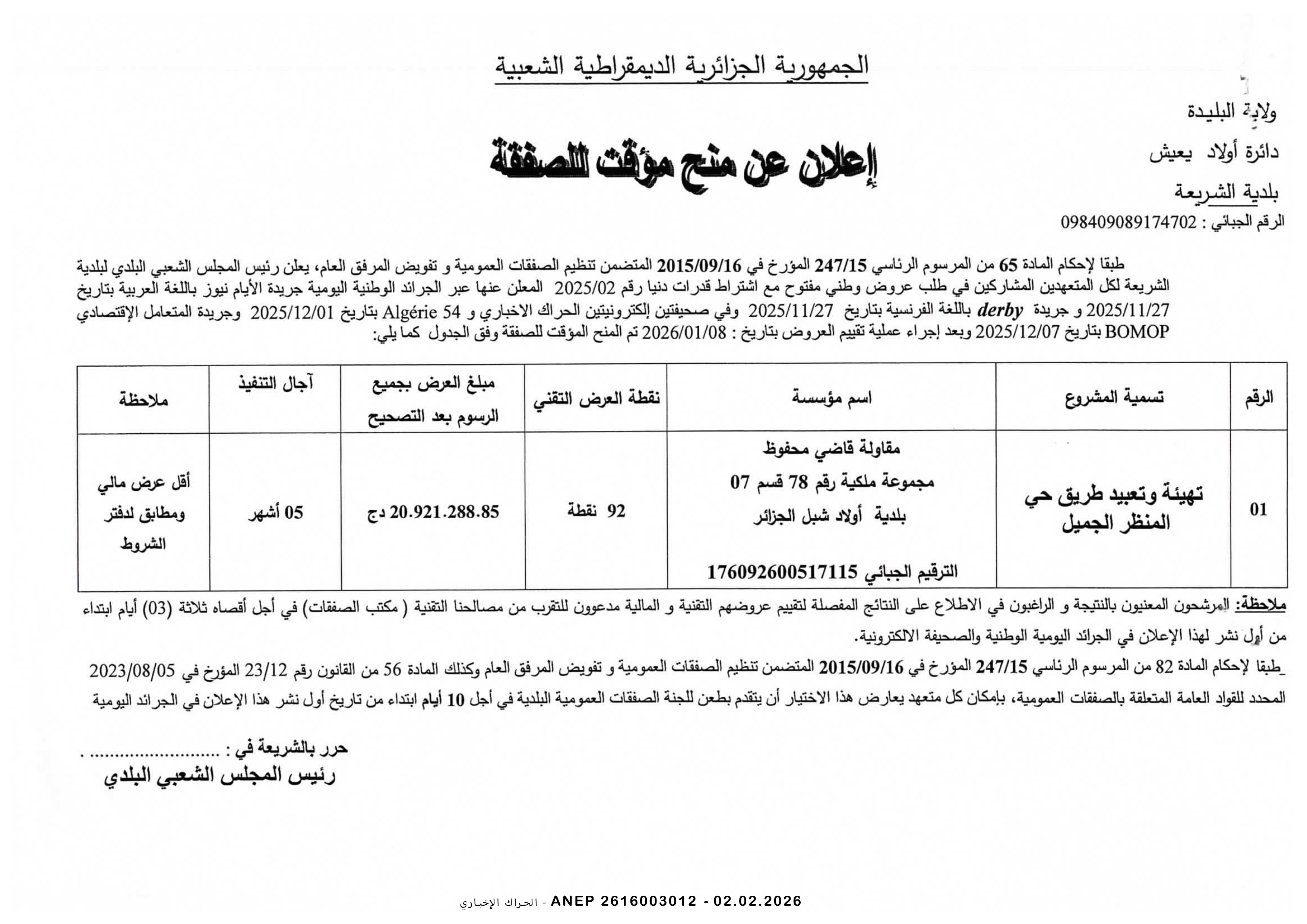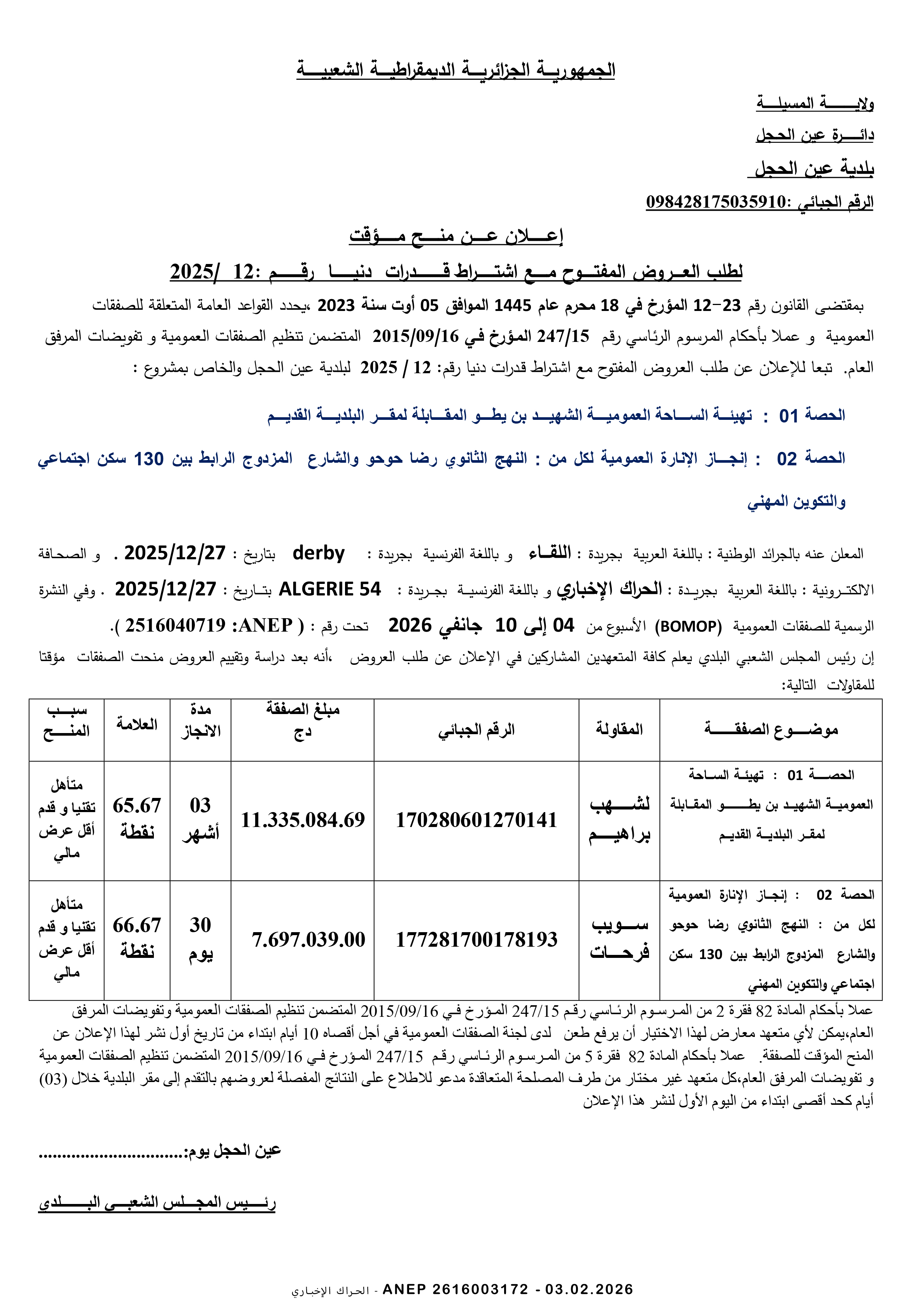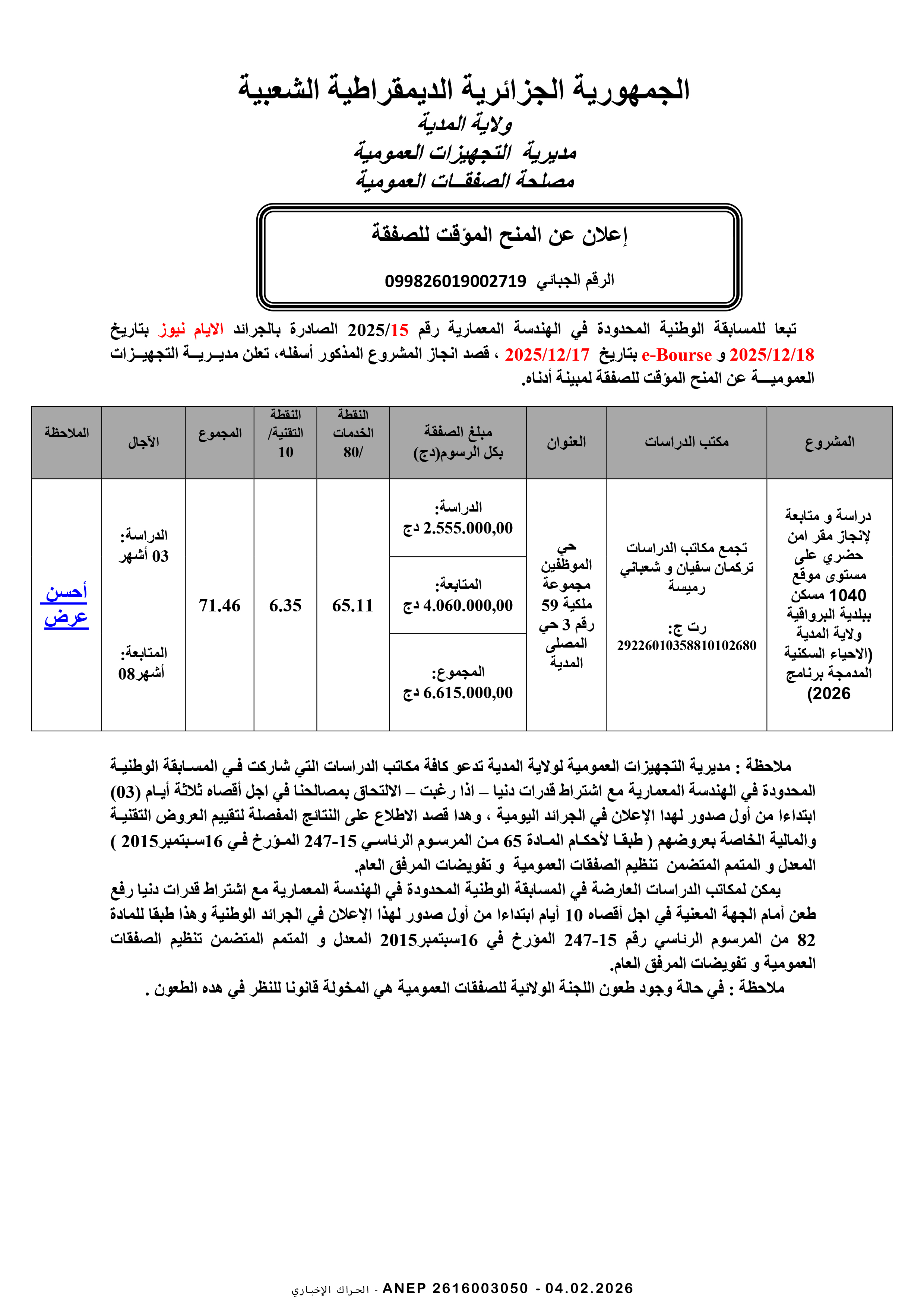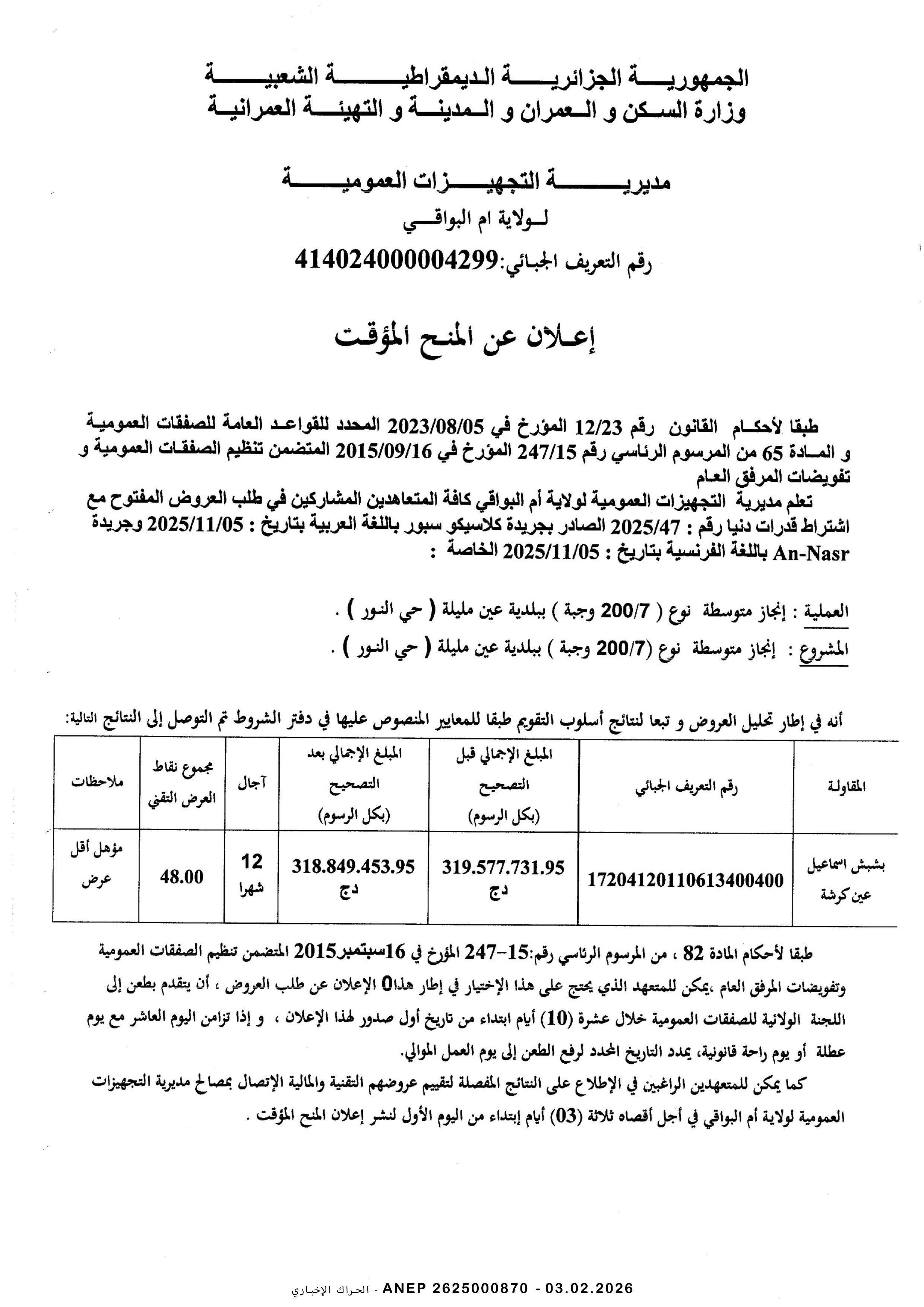 إعلان عن المنح المؤقت للصفقة