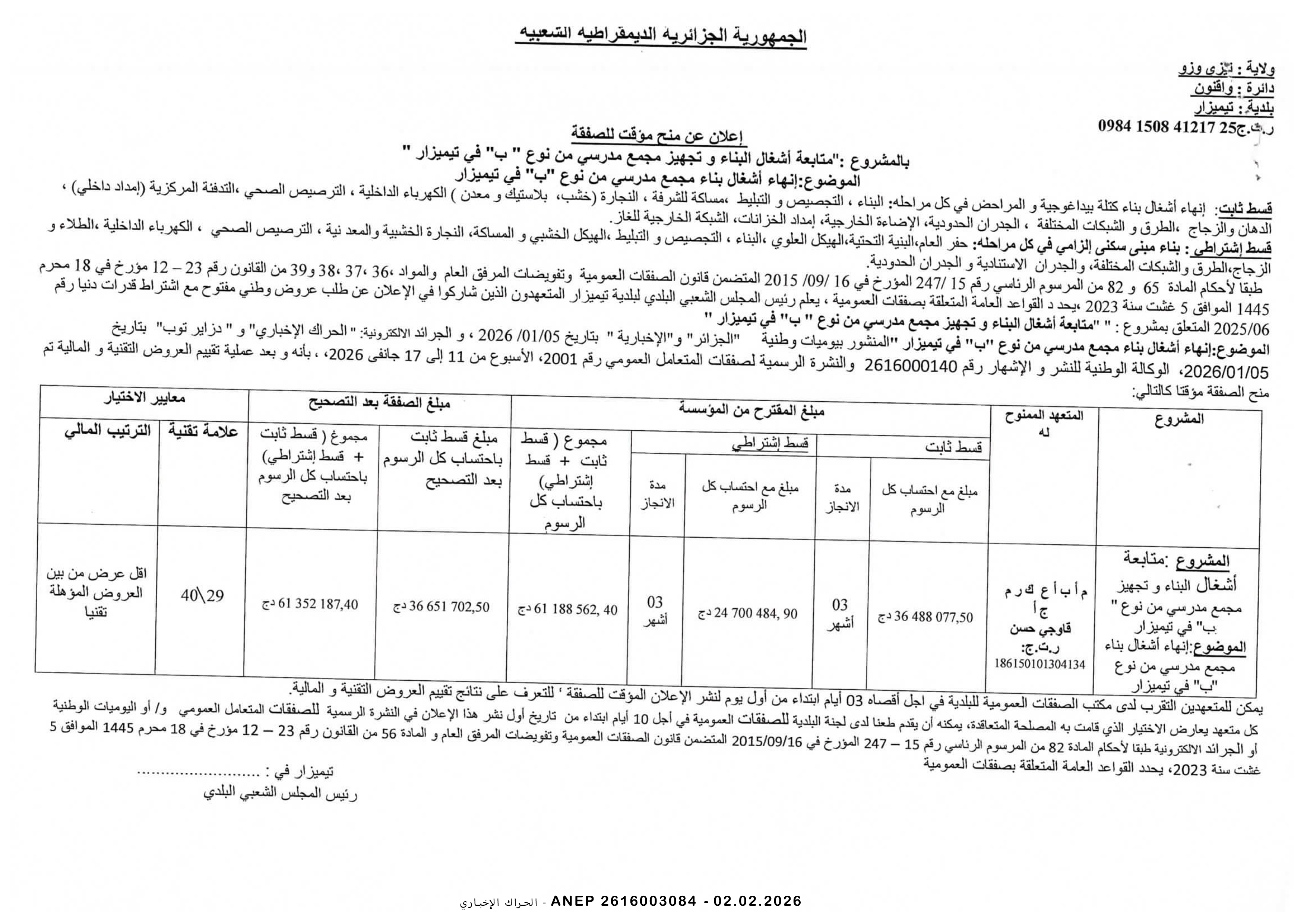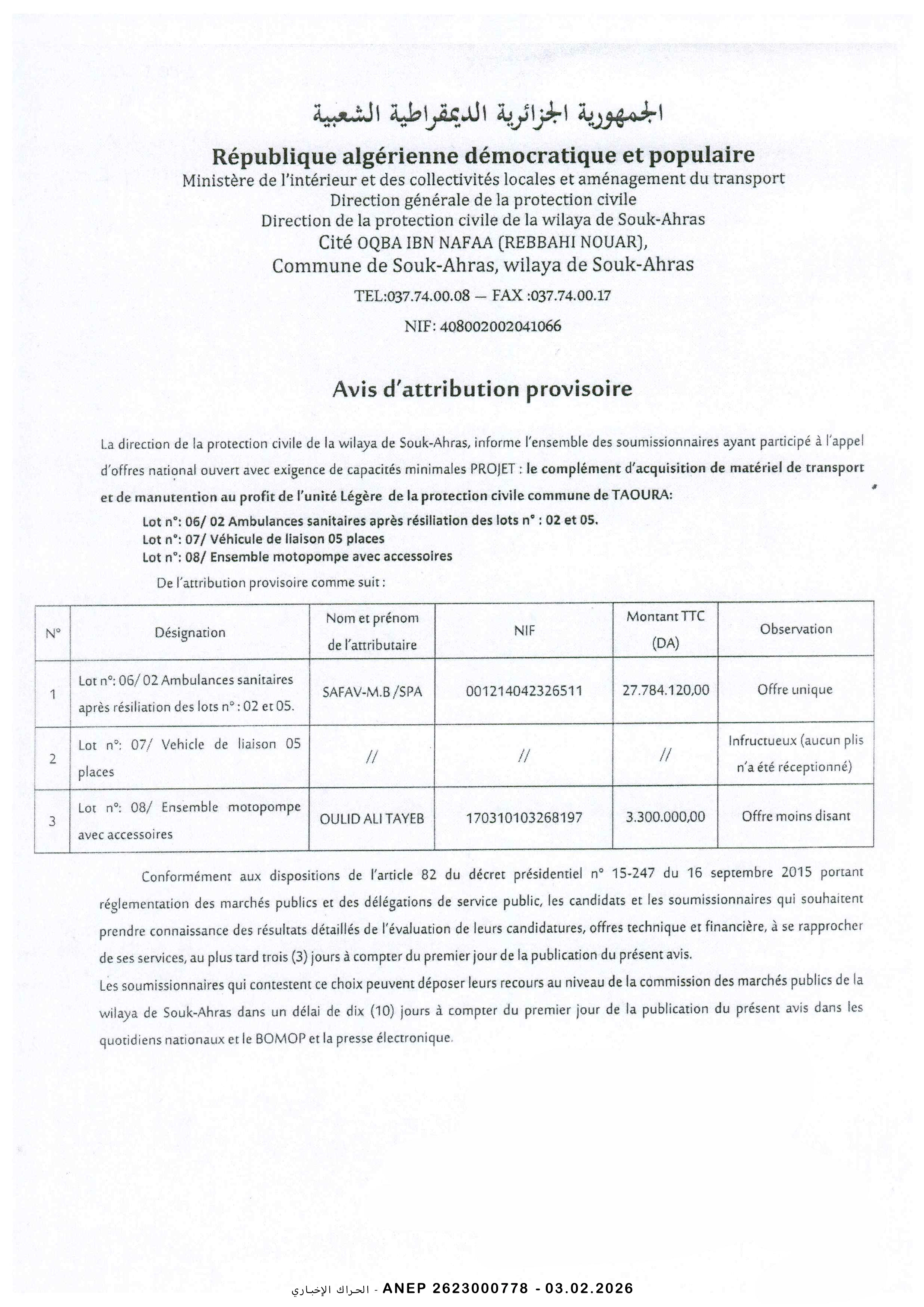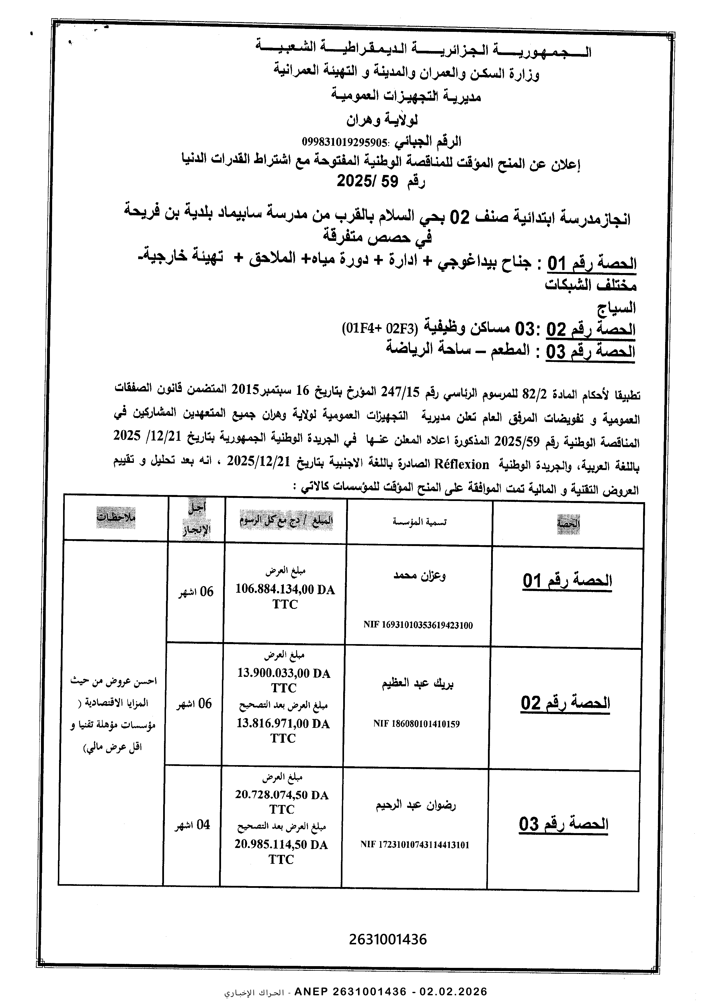 إعلان عن المنح المؤقت للصفقة