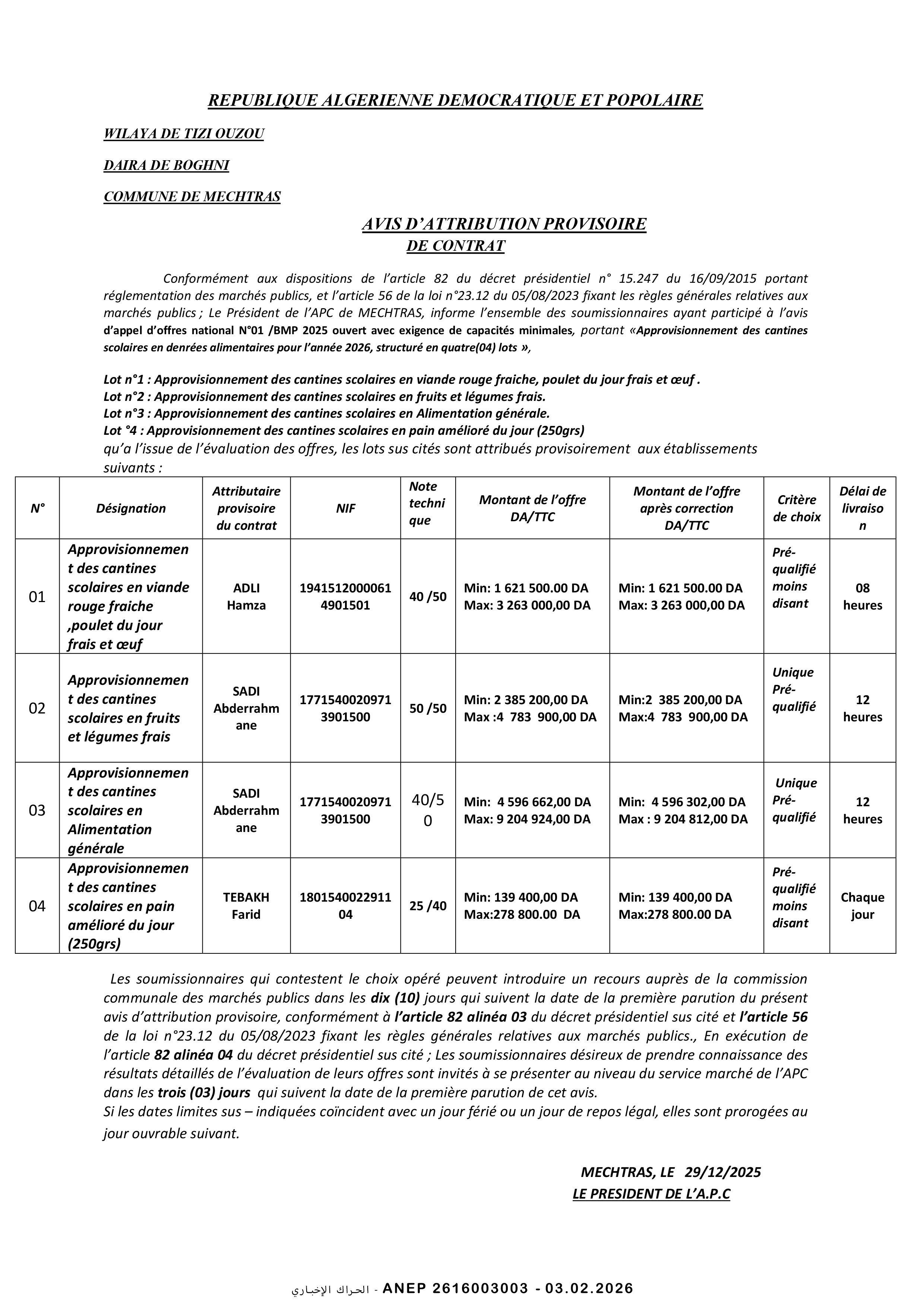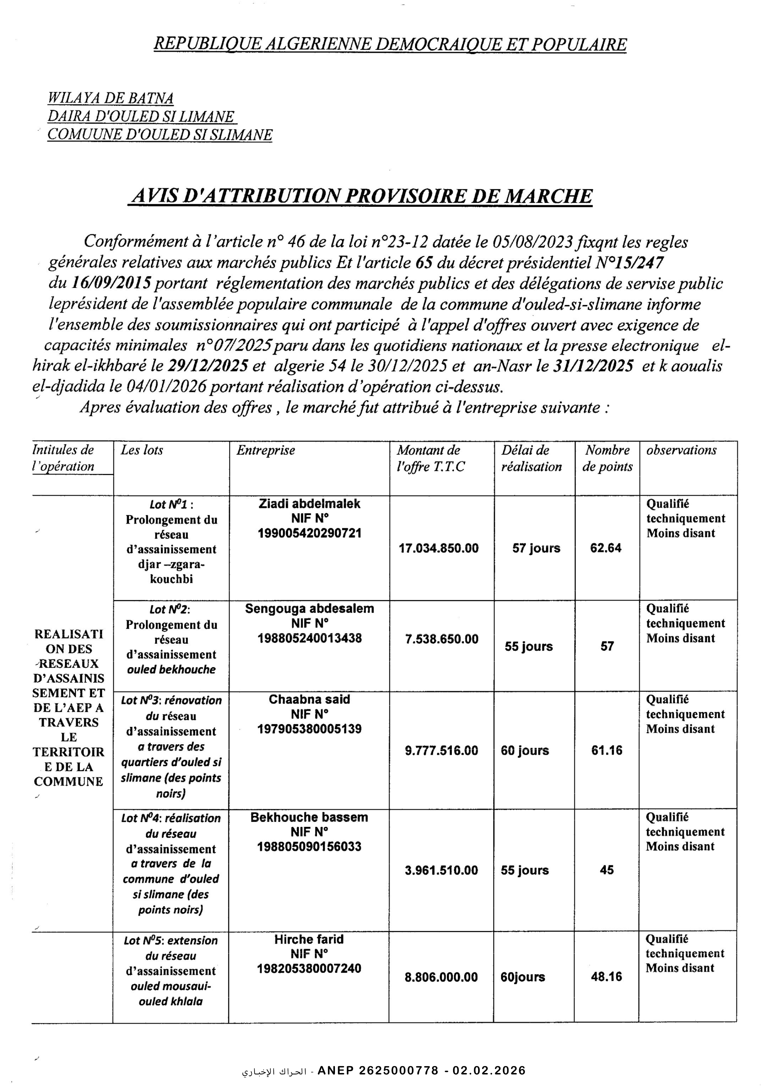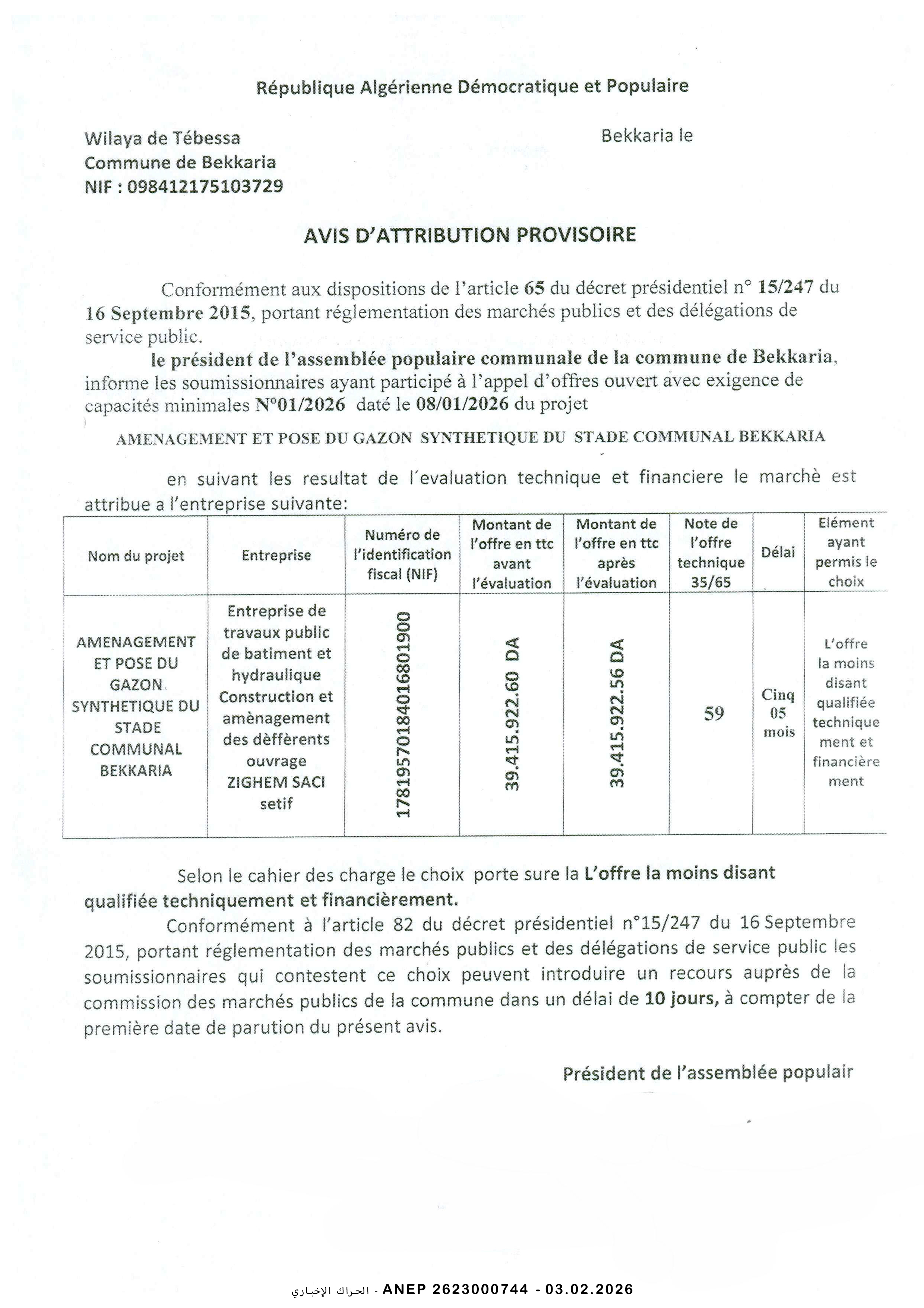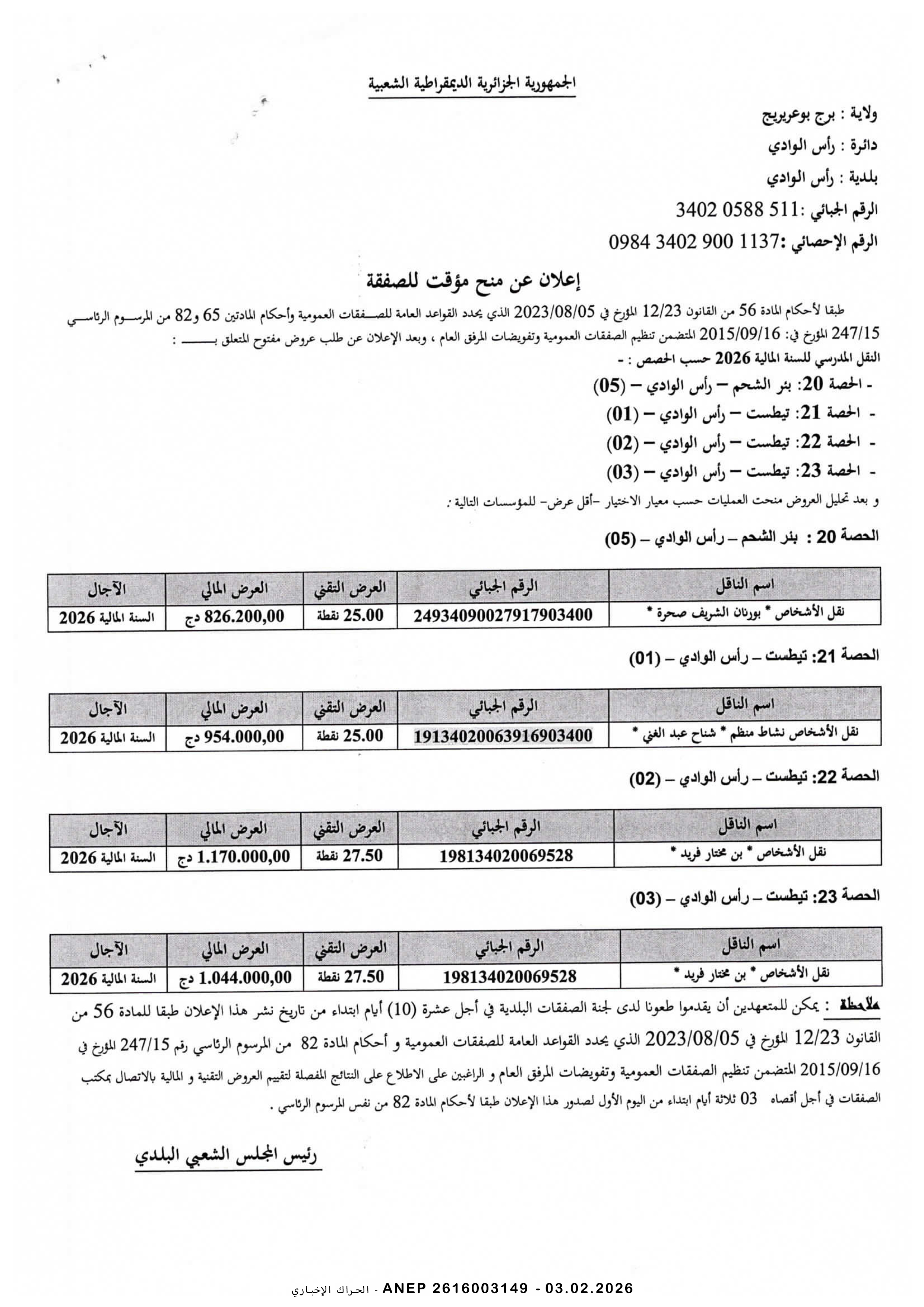 إعلان عن المنح المؤقت للصفقة