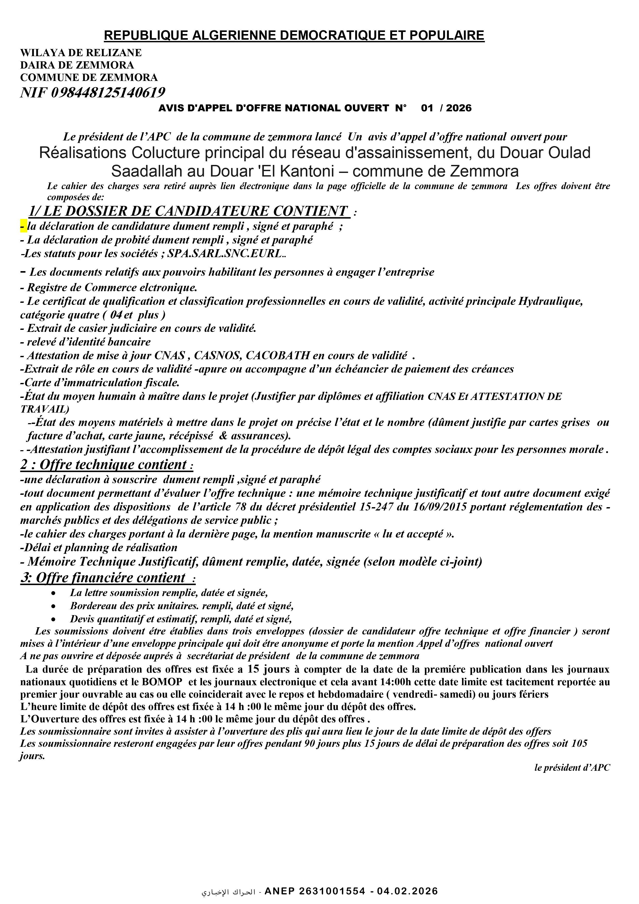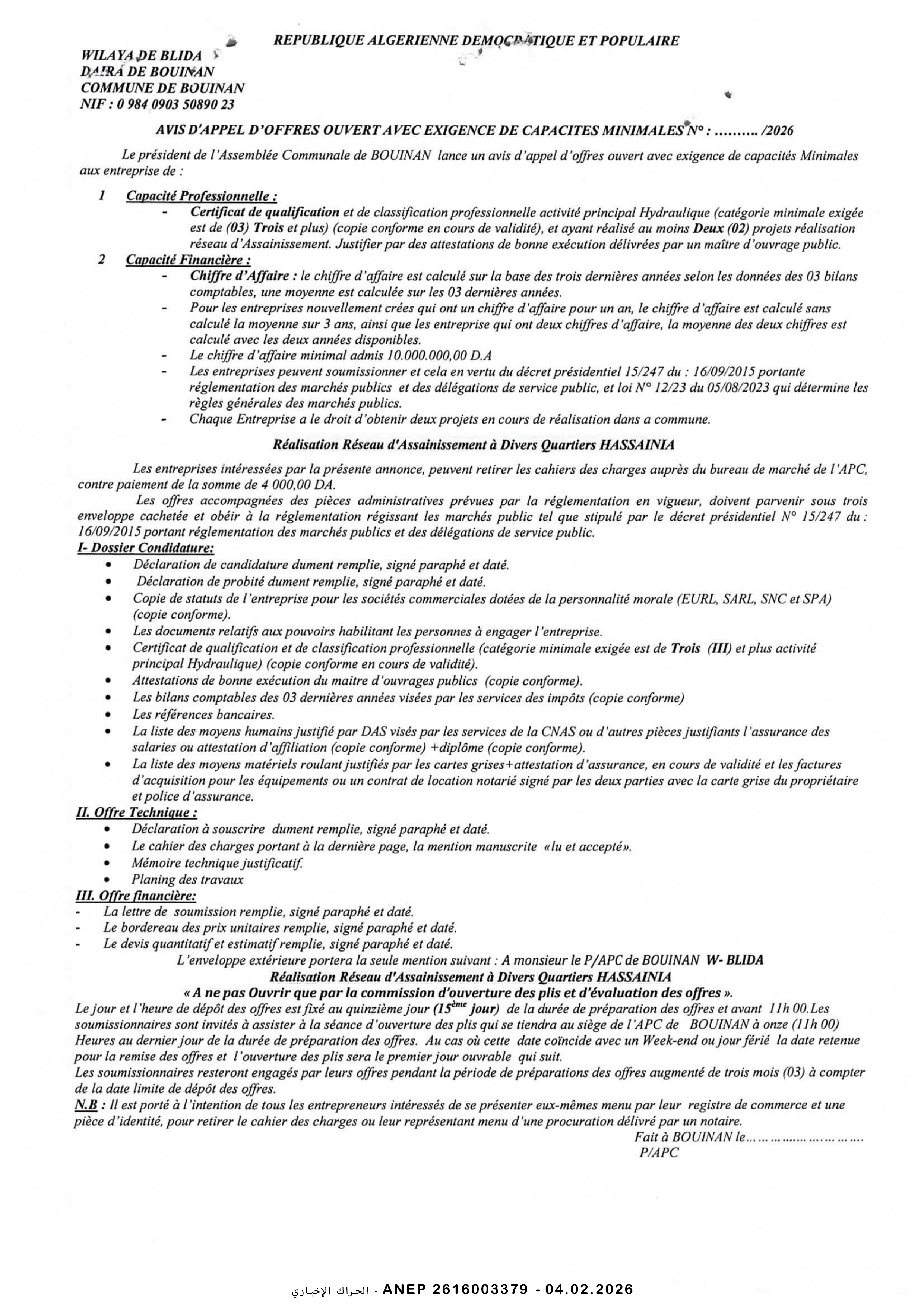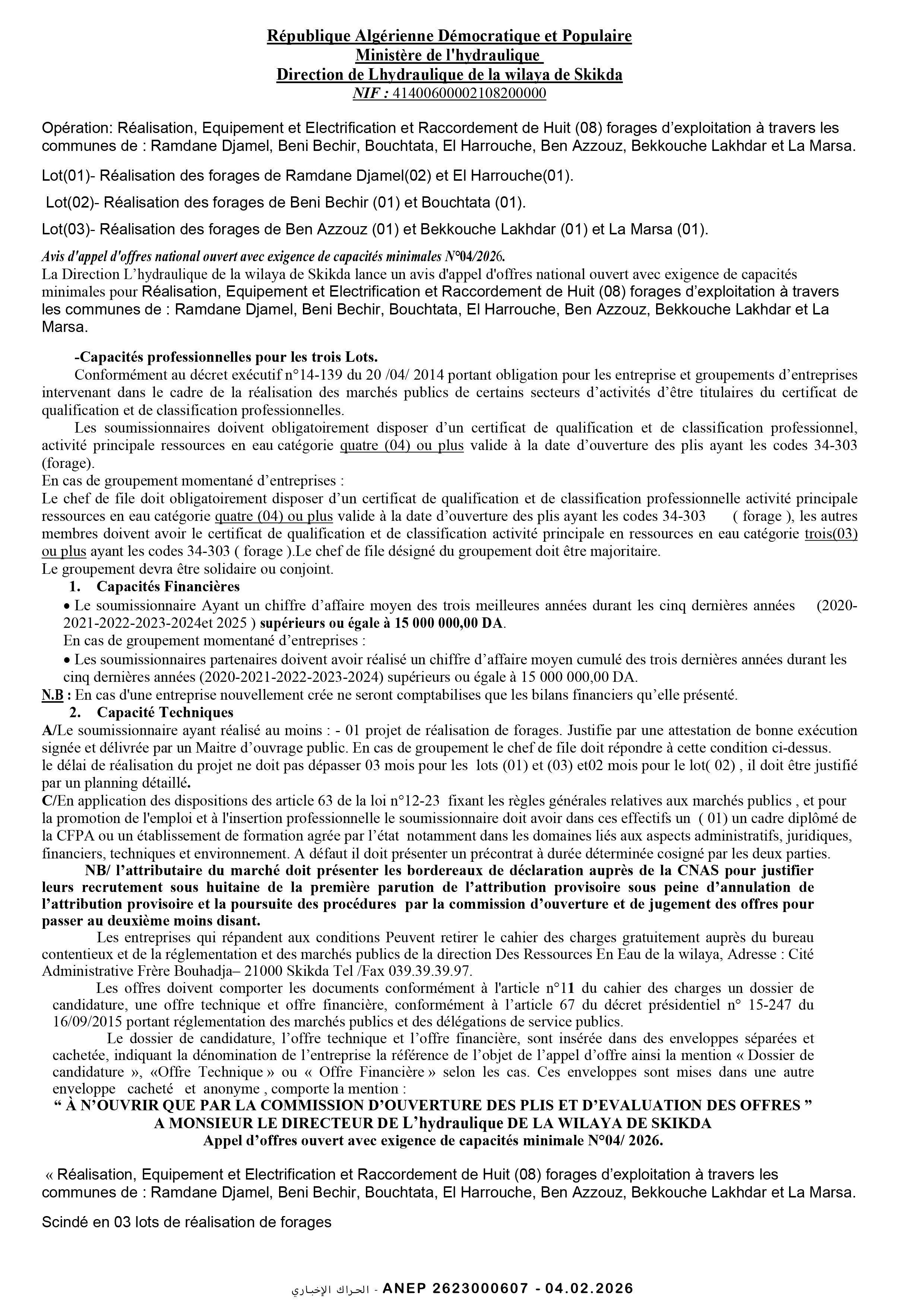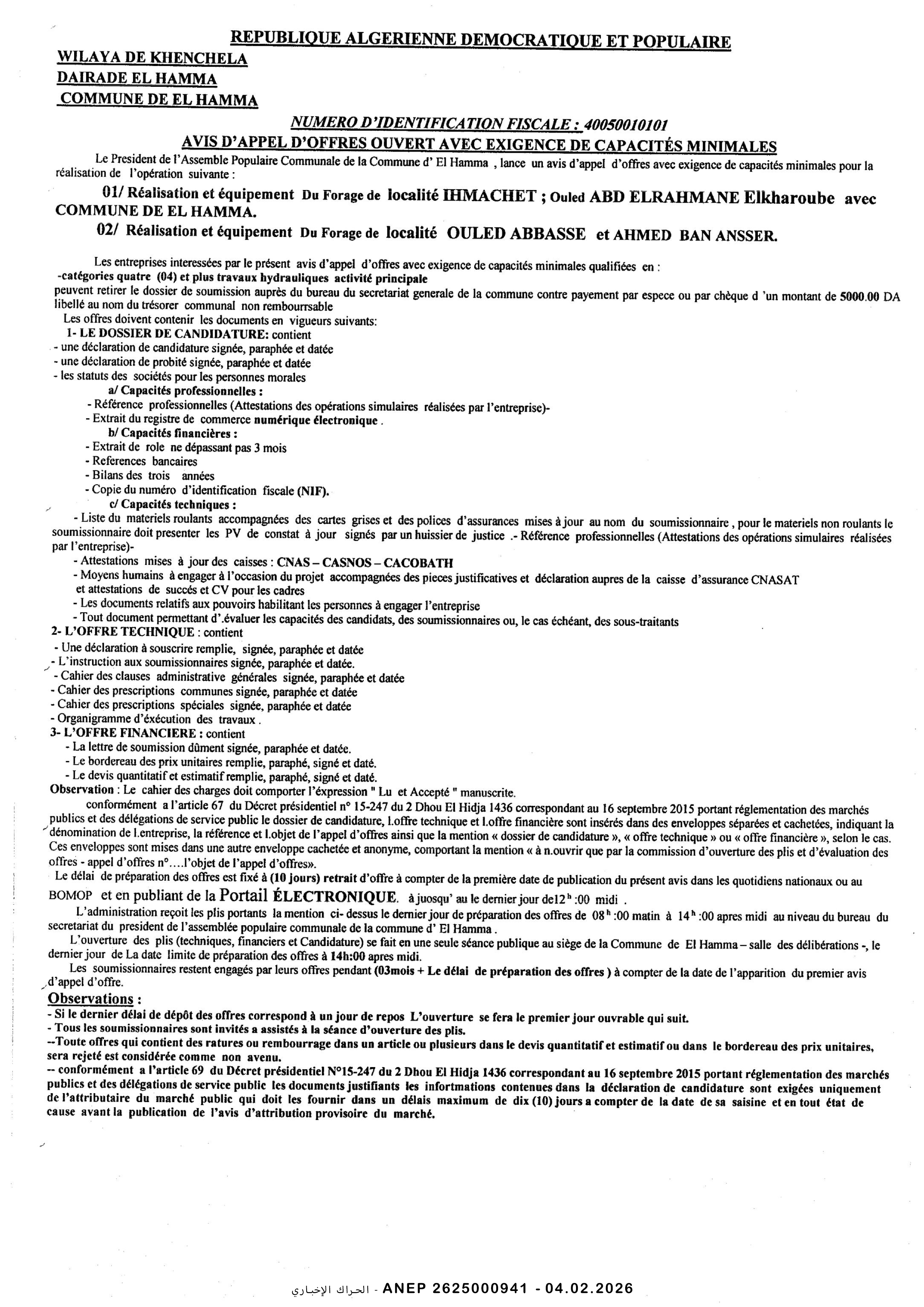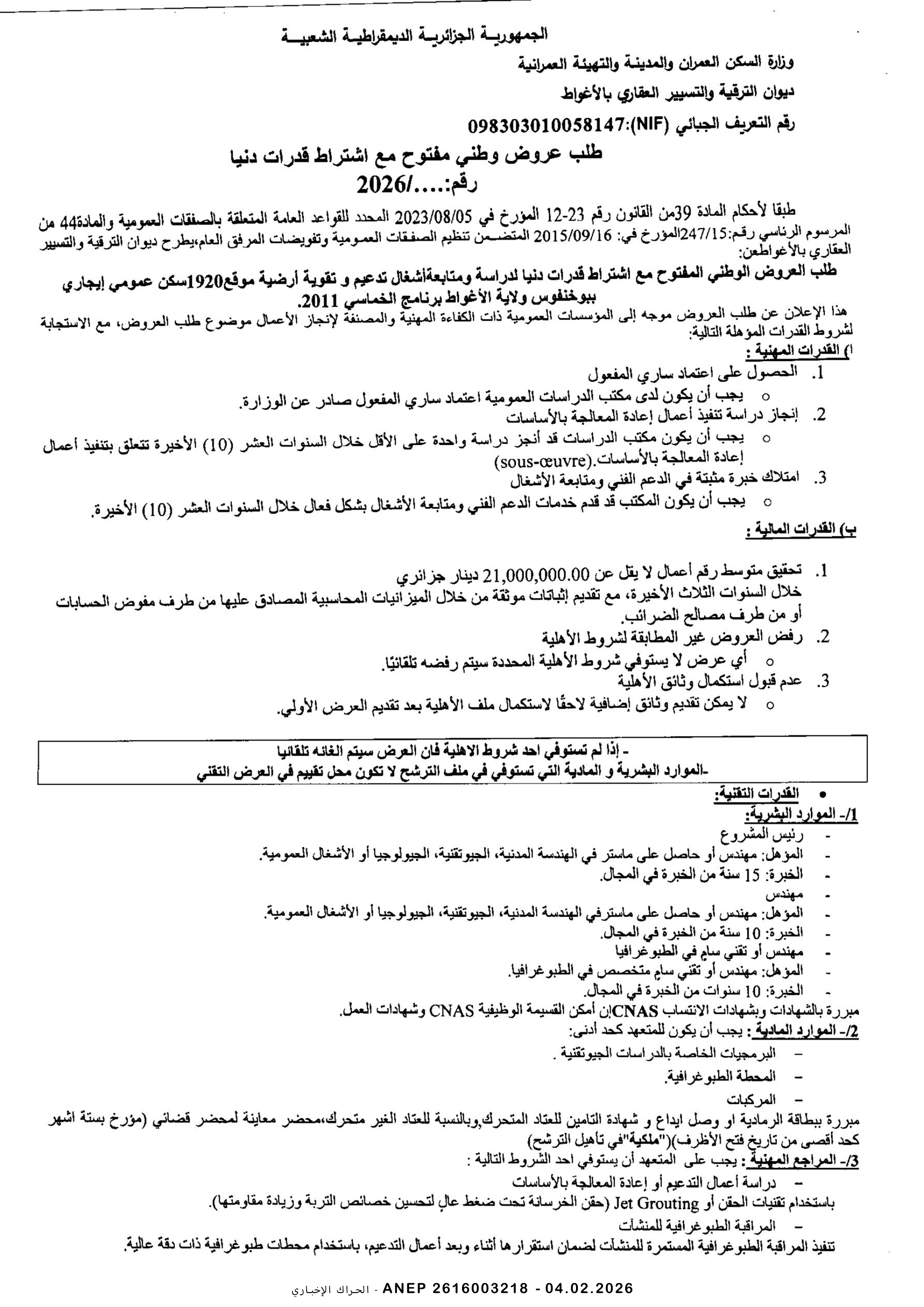 إعلان عن طلب عروض وطني مفتوح مع اشتراط قدرات دنيا رقم 2026/04
