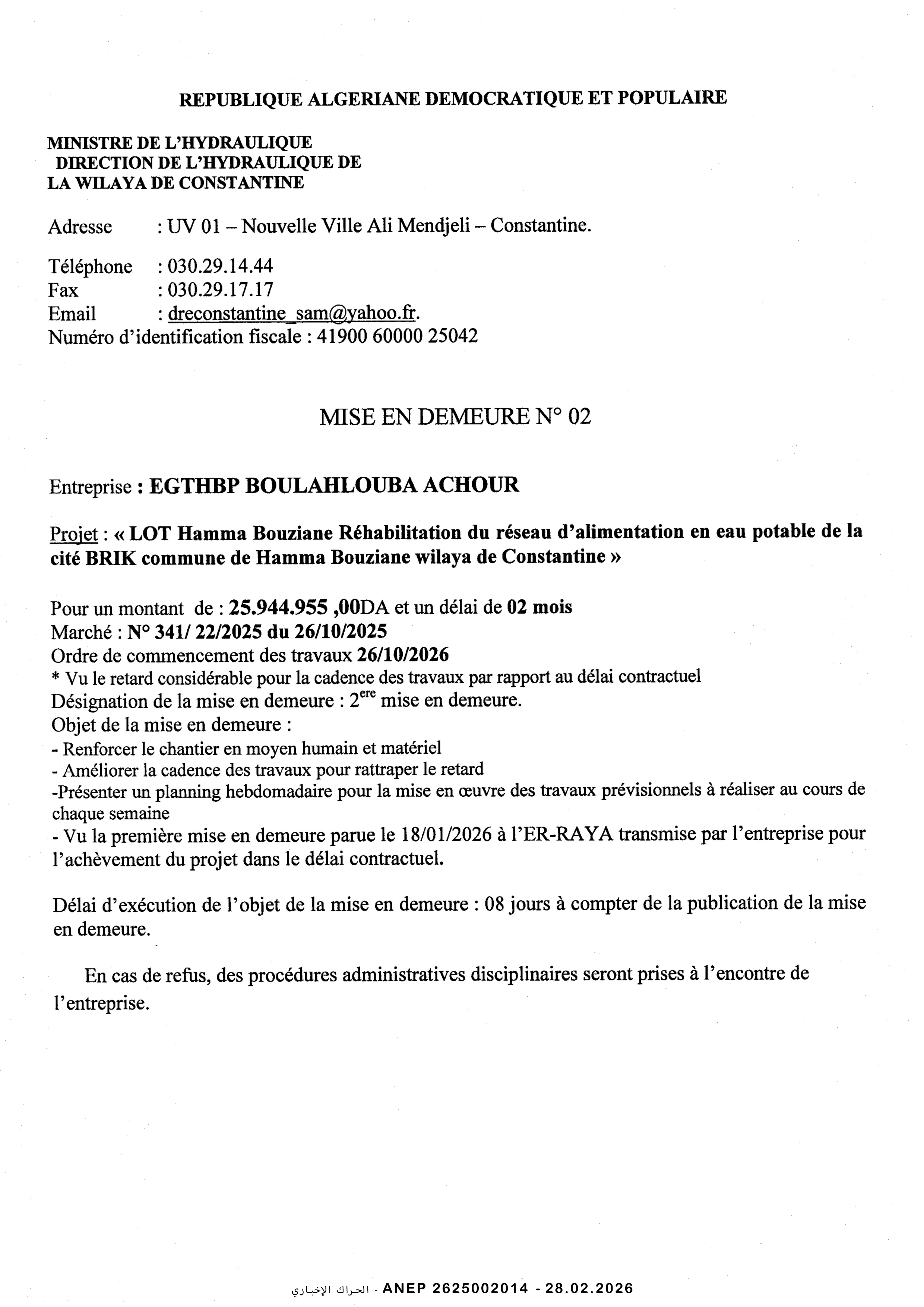 ربط خزان 5000 متر مكعب بوقرانة انطلاقا من مياه سد بني هارون و التنقيبات ( عين البيضاء و حرشة)