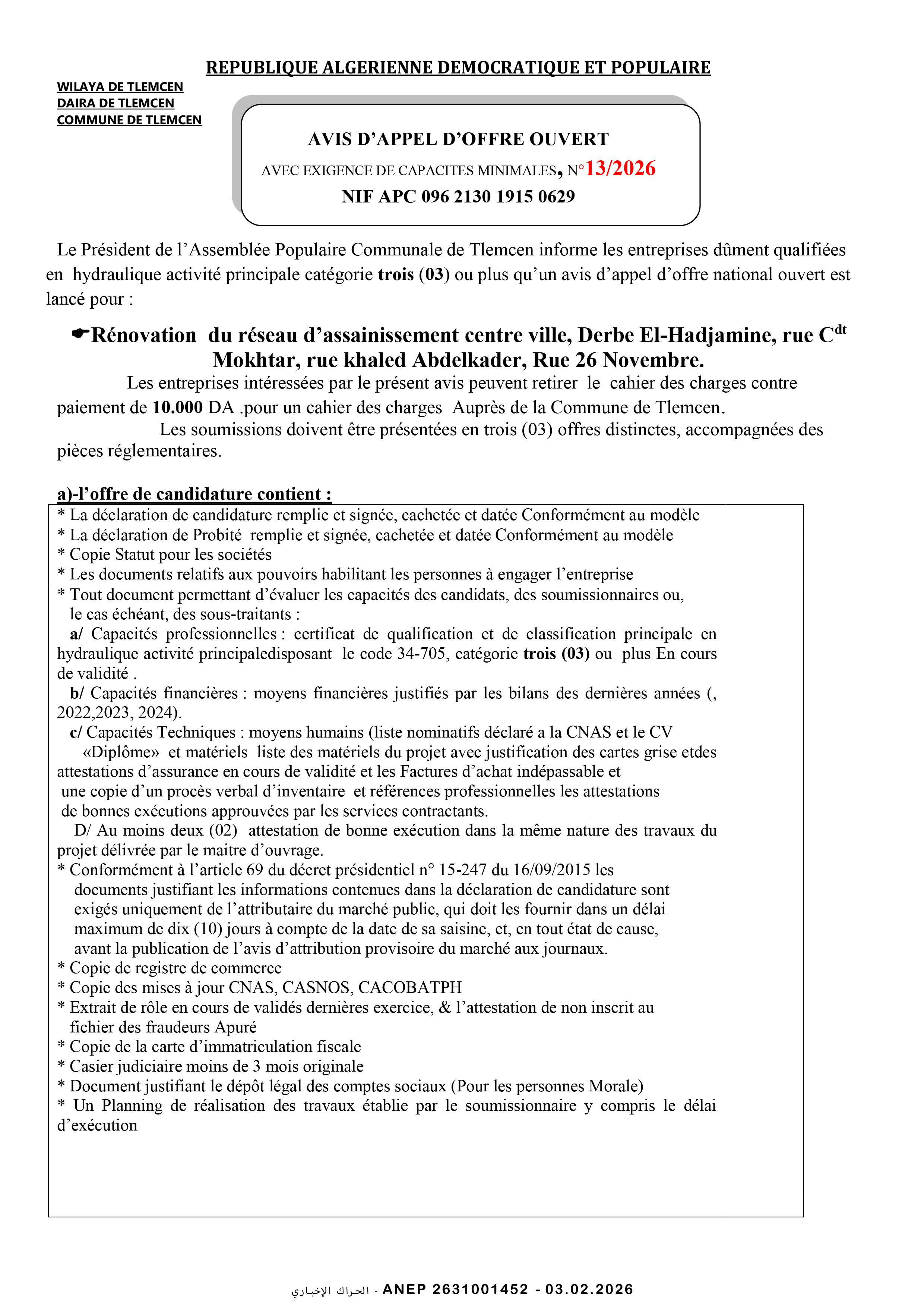 إعلان عن طلب عروض وطني مفتوح مع اشتراط قدرات دنيا رقم 2026/13