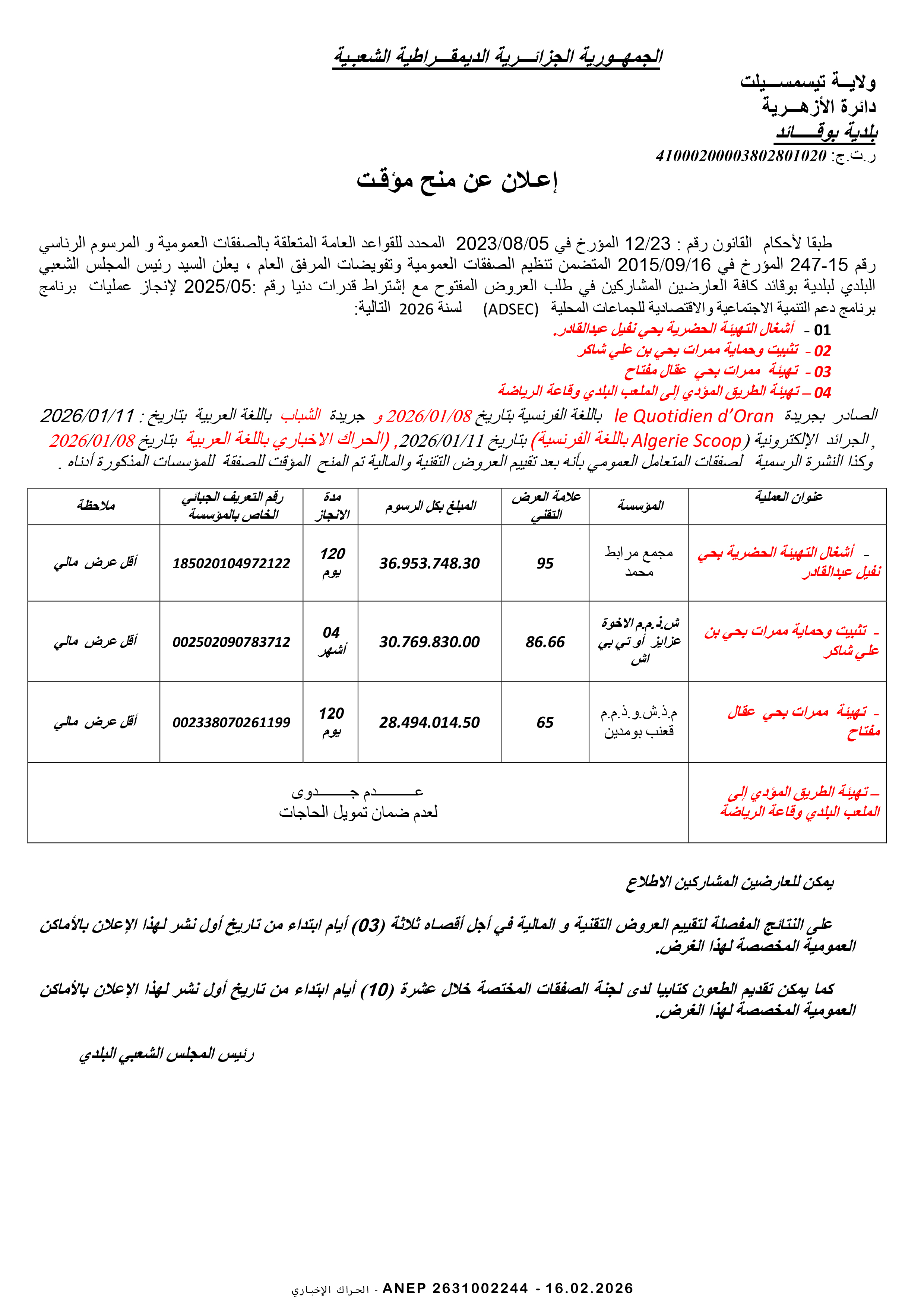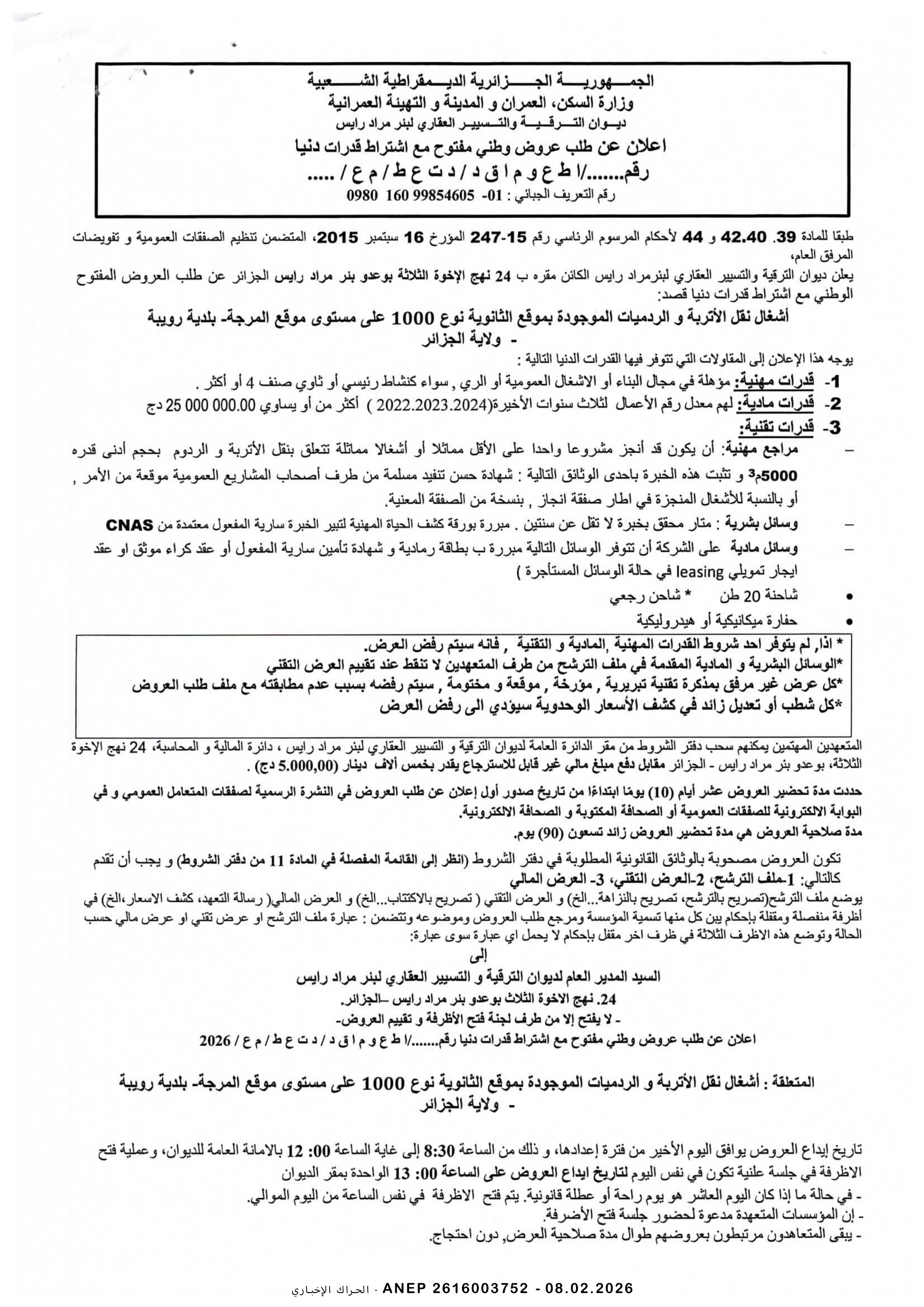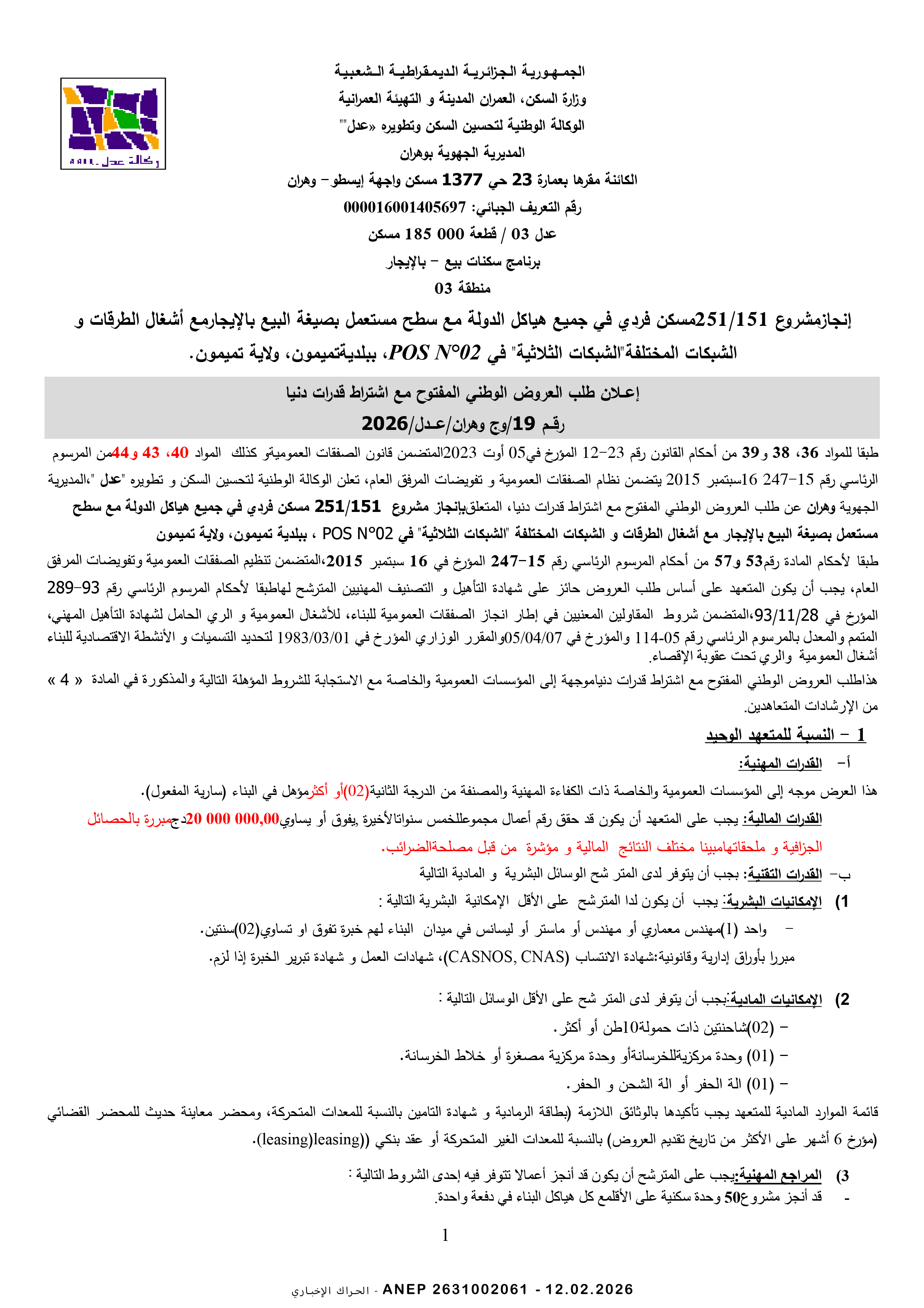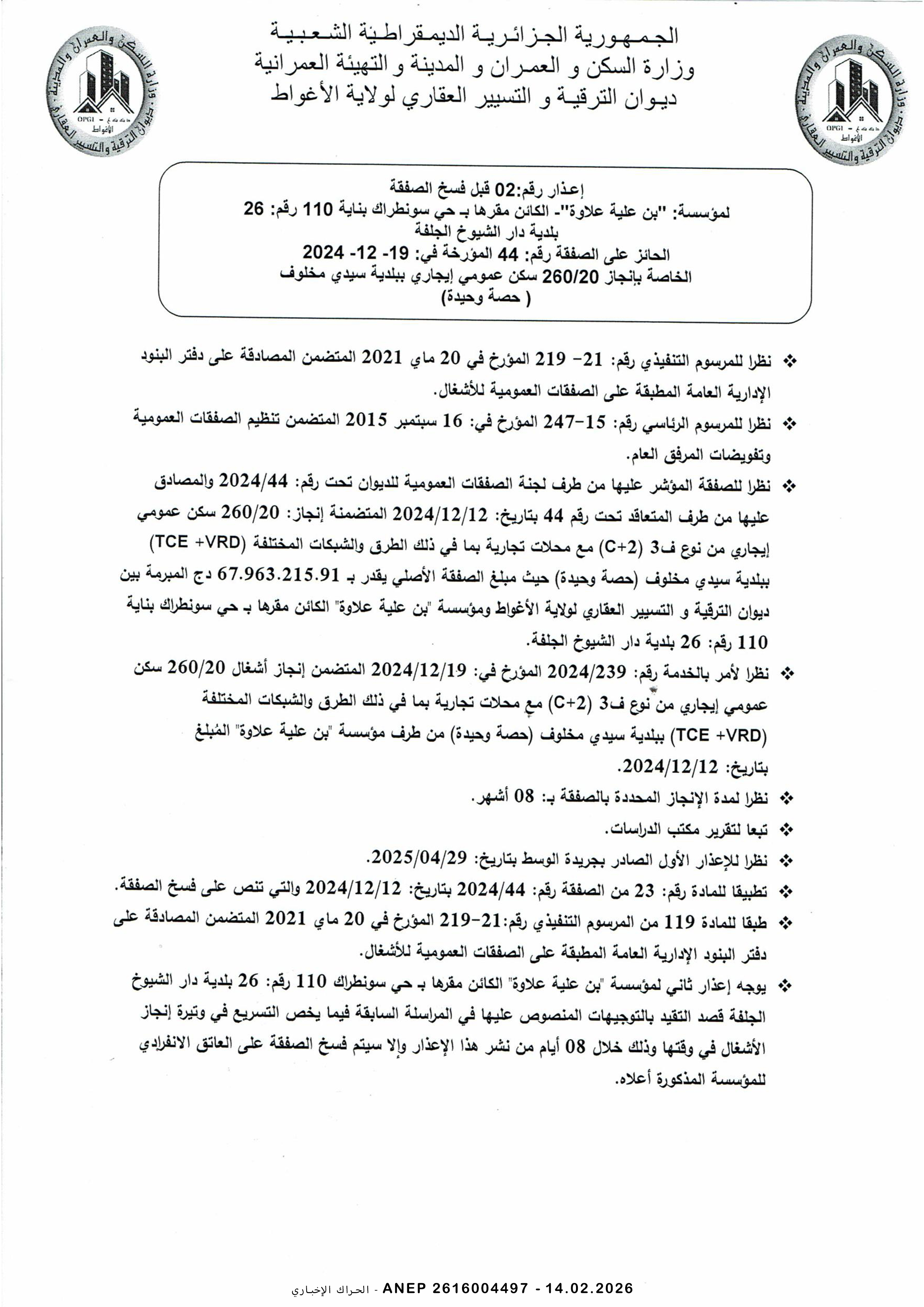إنجاز 300/20 مسكن عمومي إيجاري مع ربط كل الشبكات و المرافق بلدية بني يخلف ولاية بني عباس
