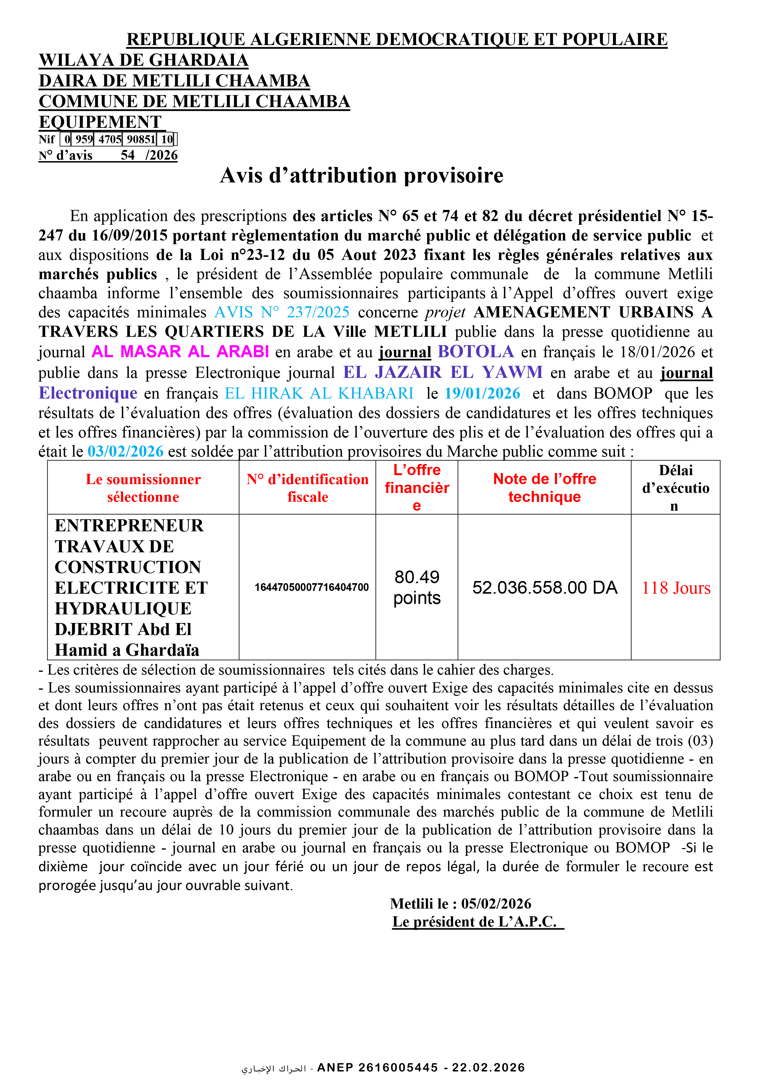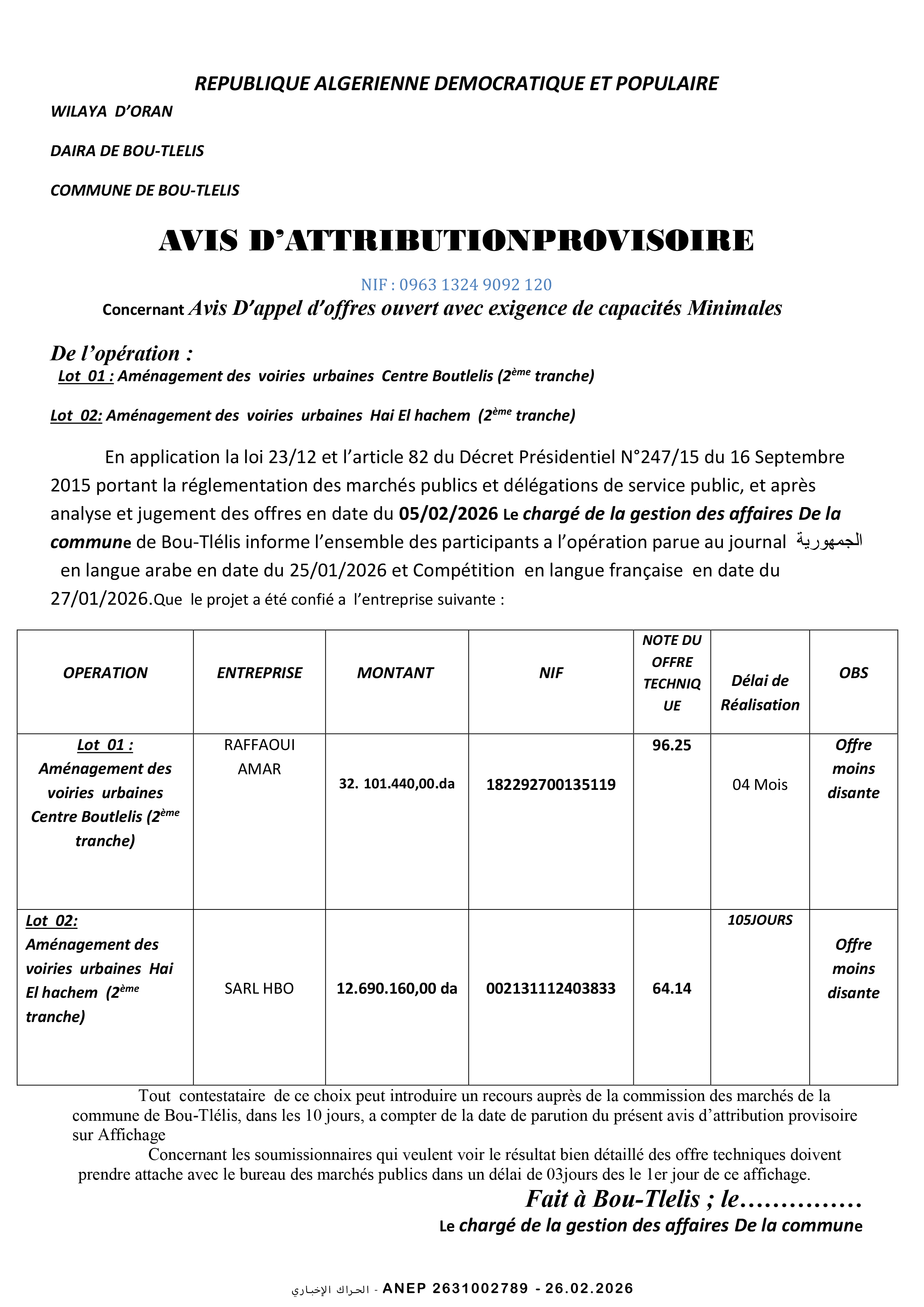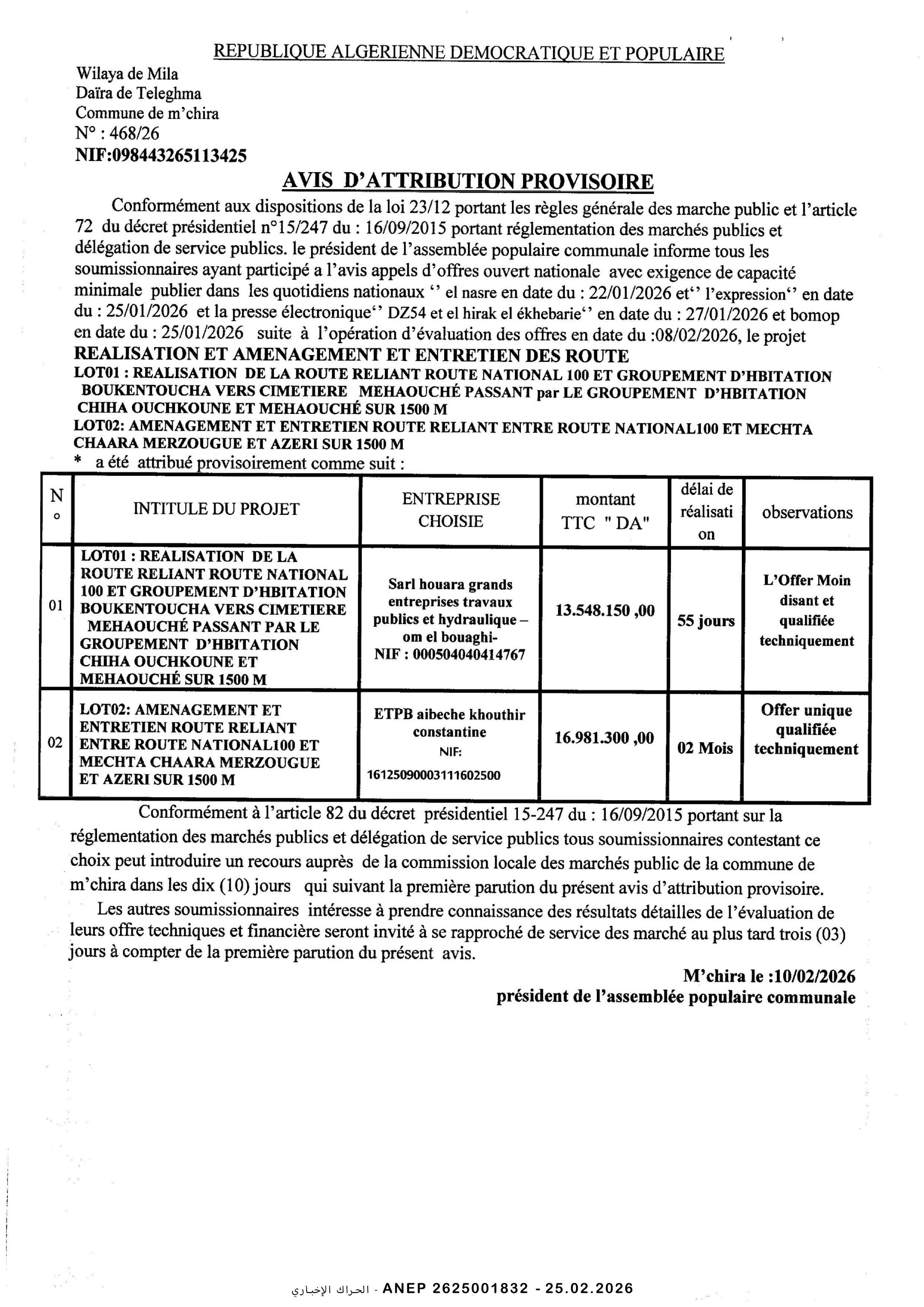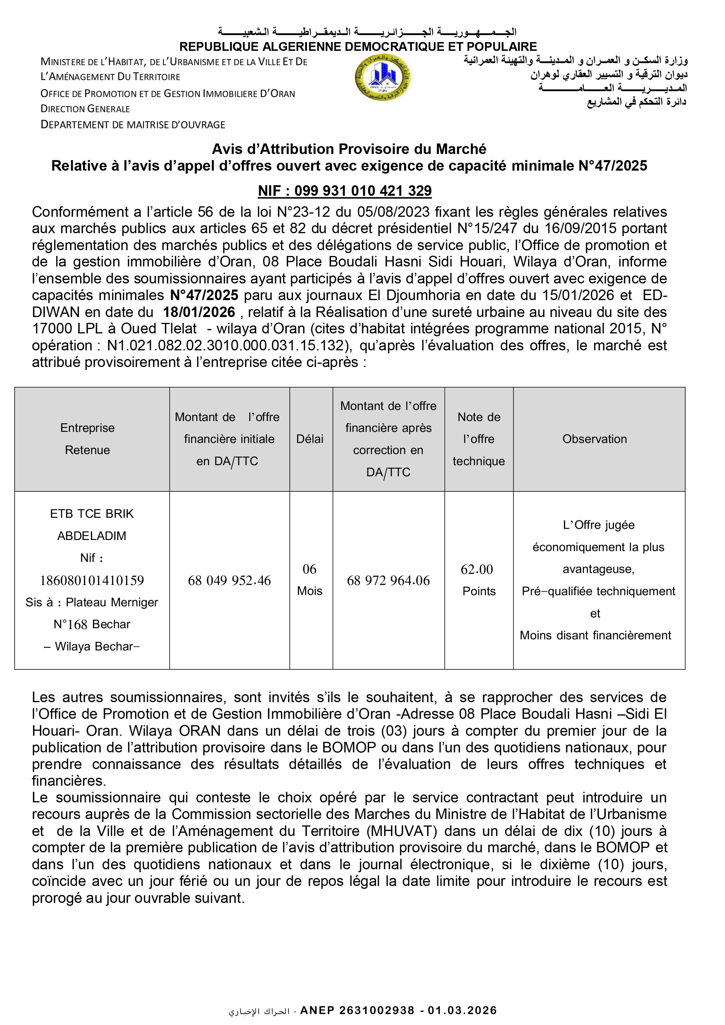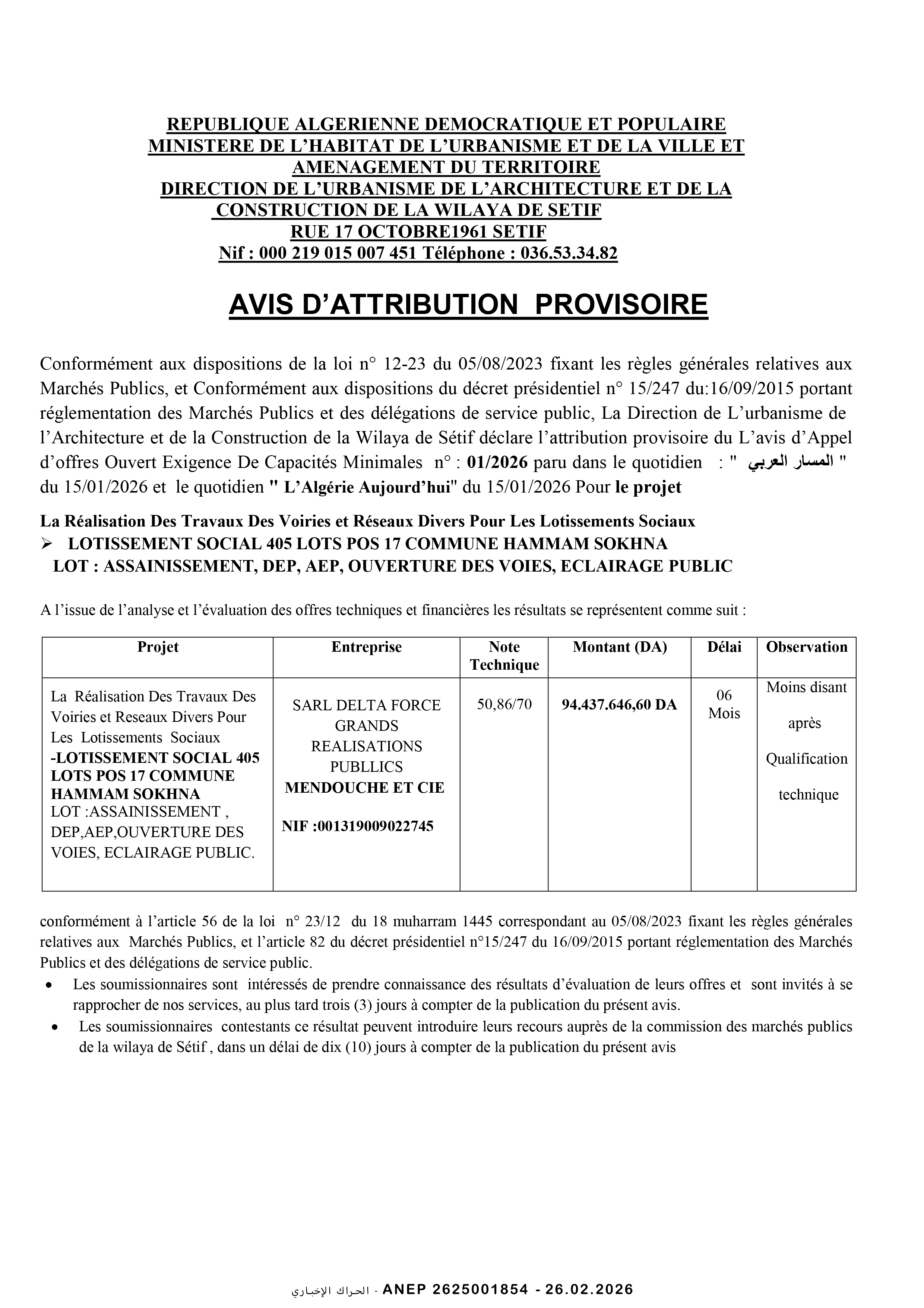 إنجاز 1500 مسكن صيغة البيع بالايجار مع محلات و أشغال كل المرافق و الشبكات بلدية باتنة