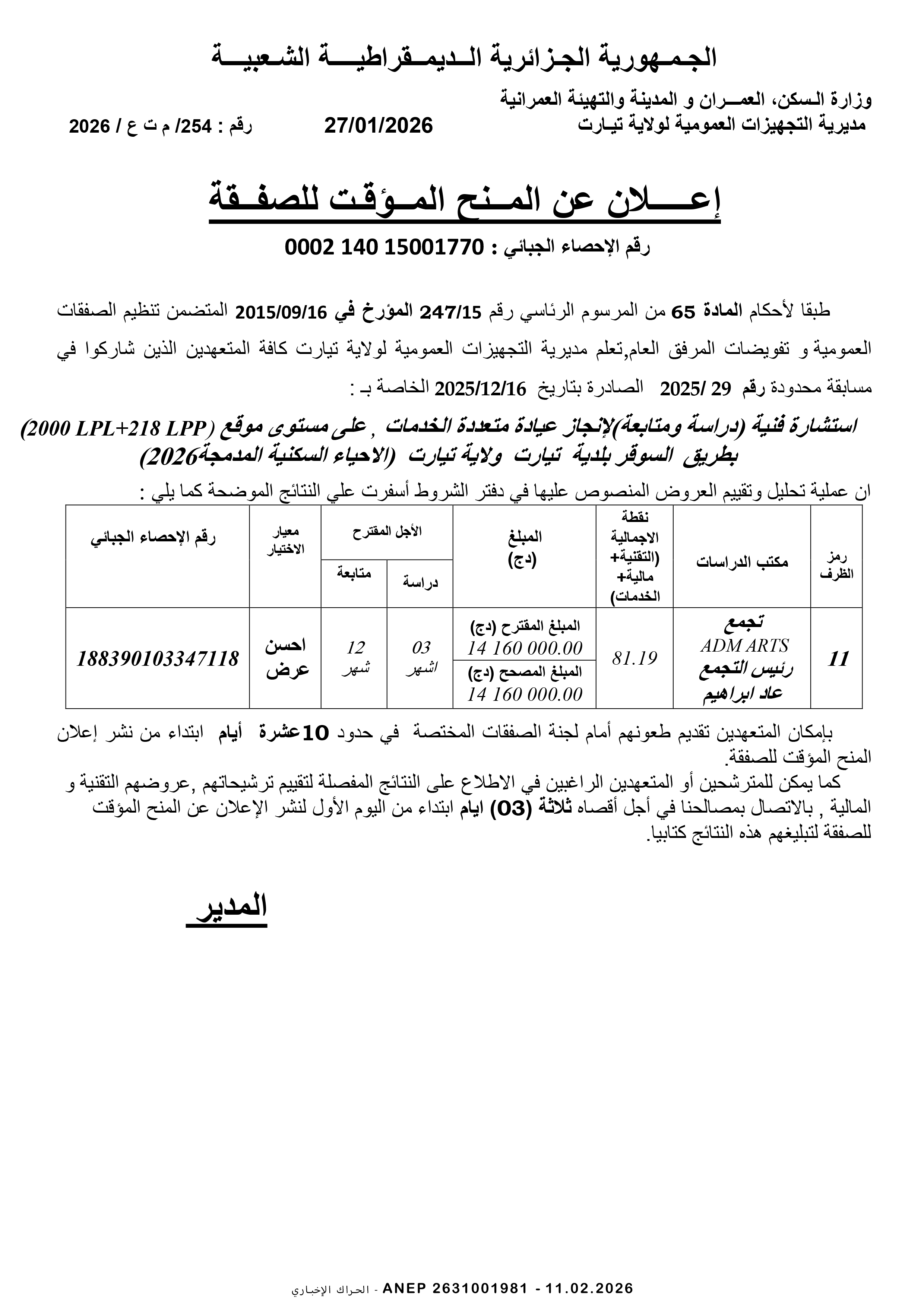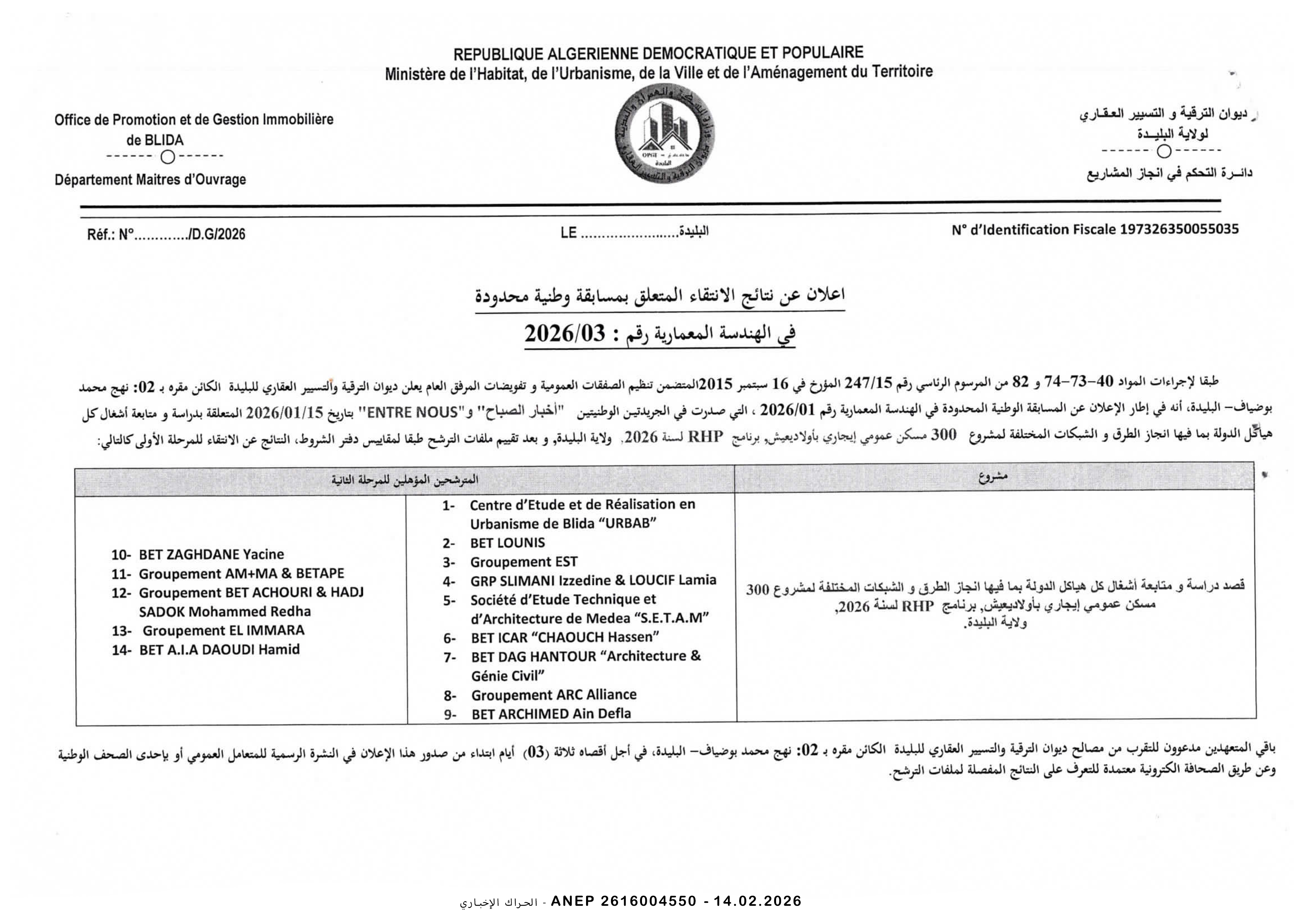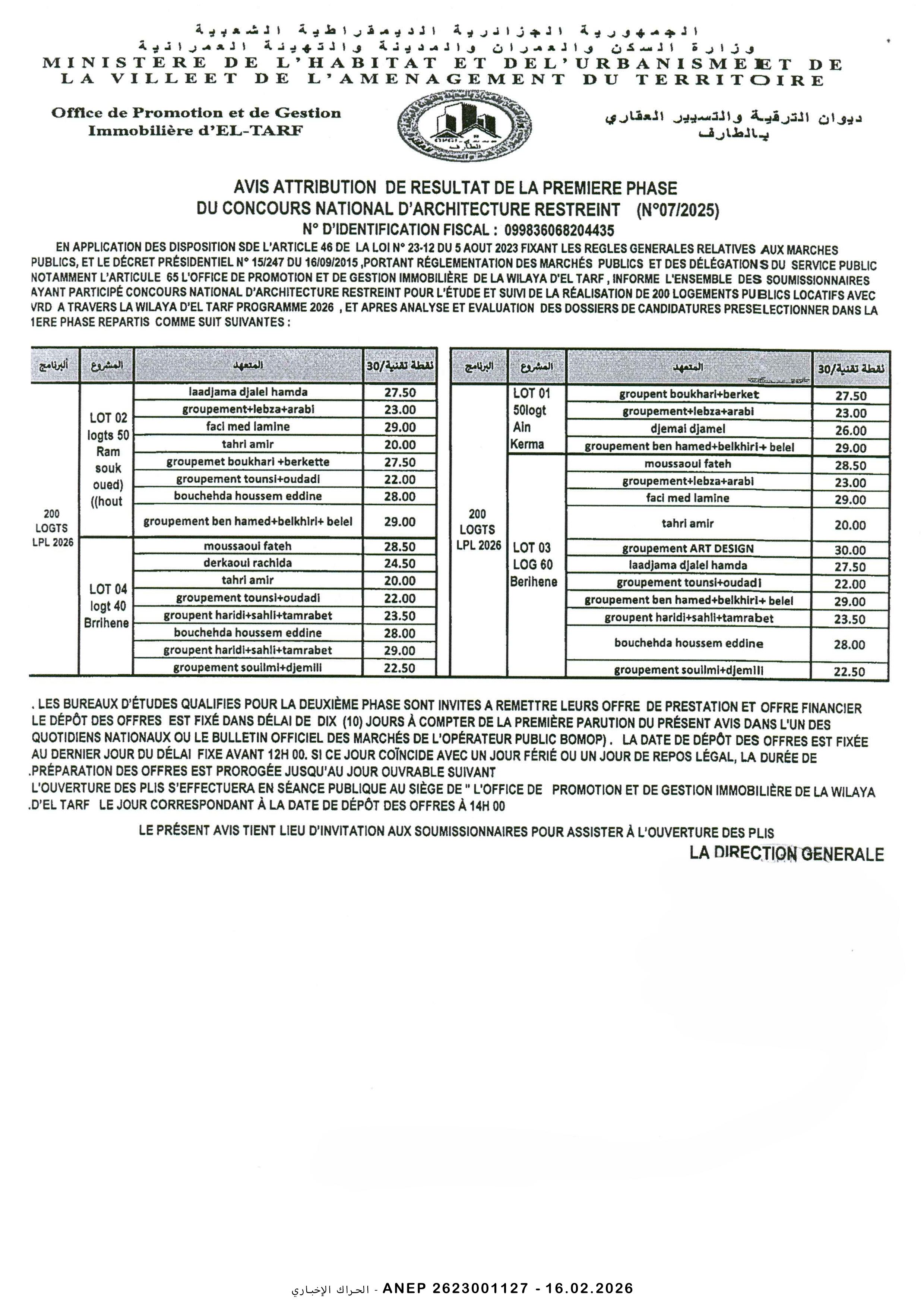 إعلان عن نتائج مسابقة وطنية في الهندسة المعمارية محدودة