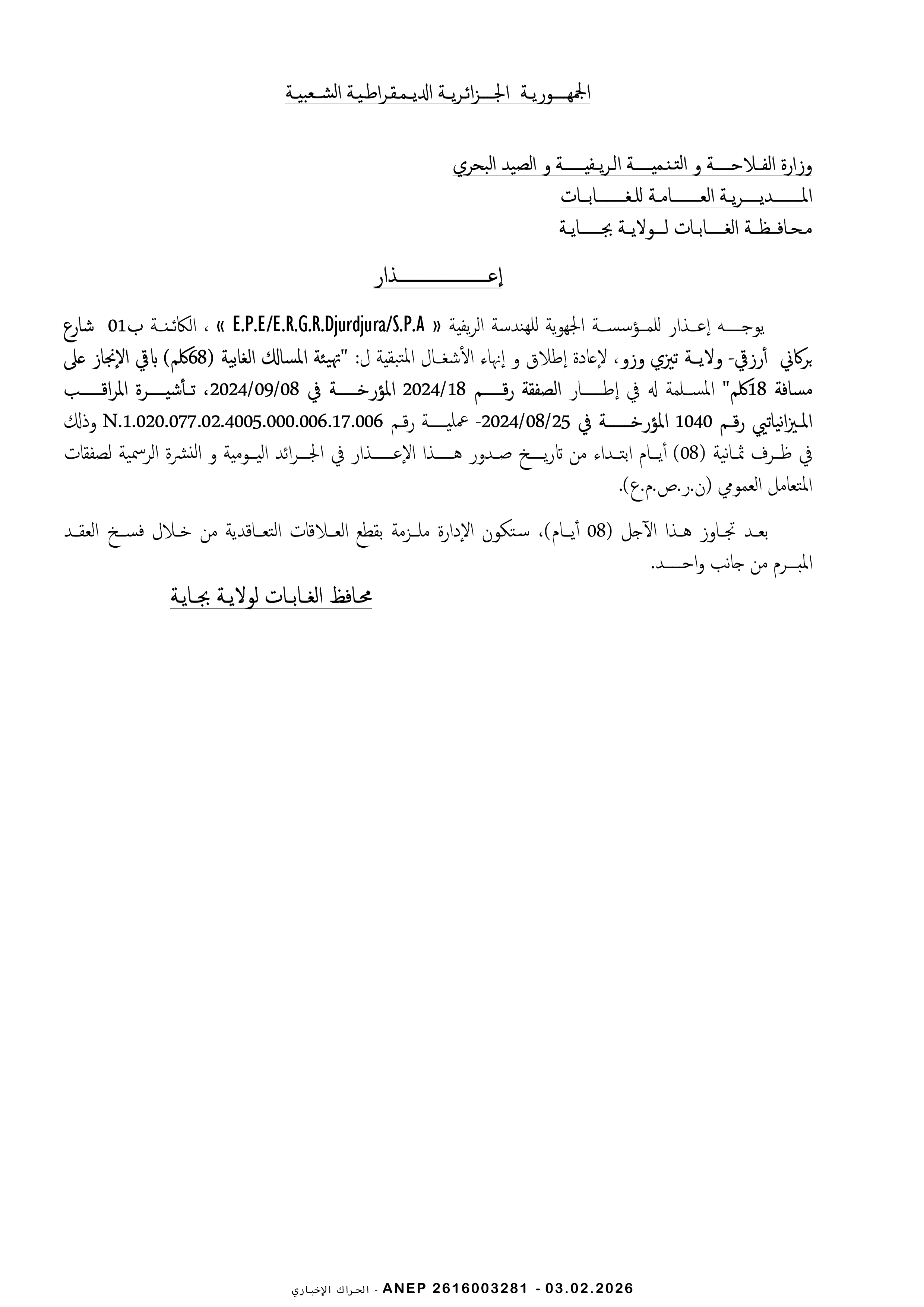 إعذار رقم 01 لمؤسسة E.P.E/E.R.G.R.DJURDJURA /S.P.A