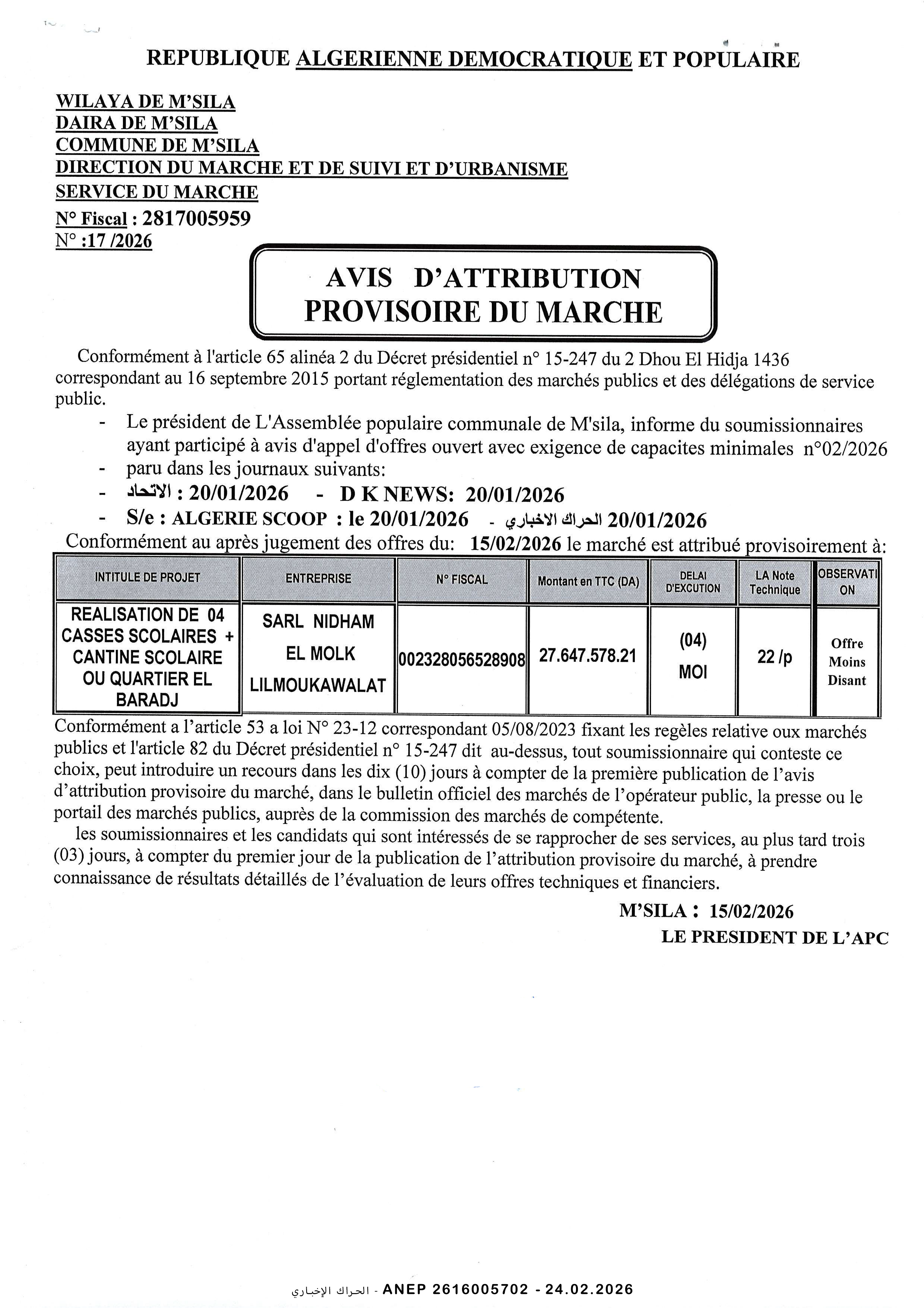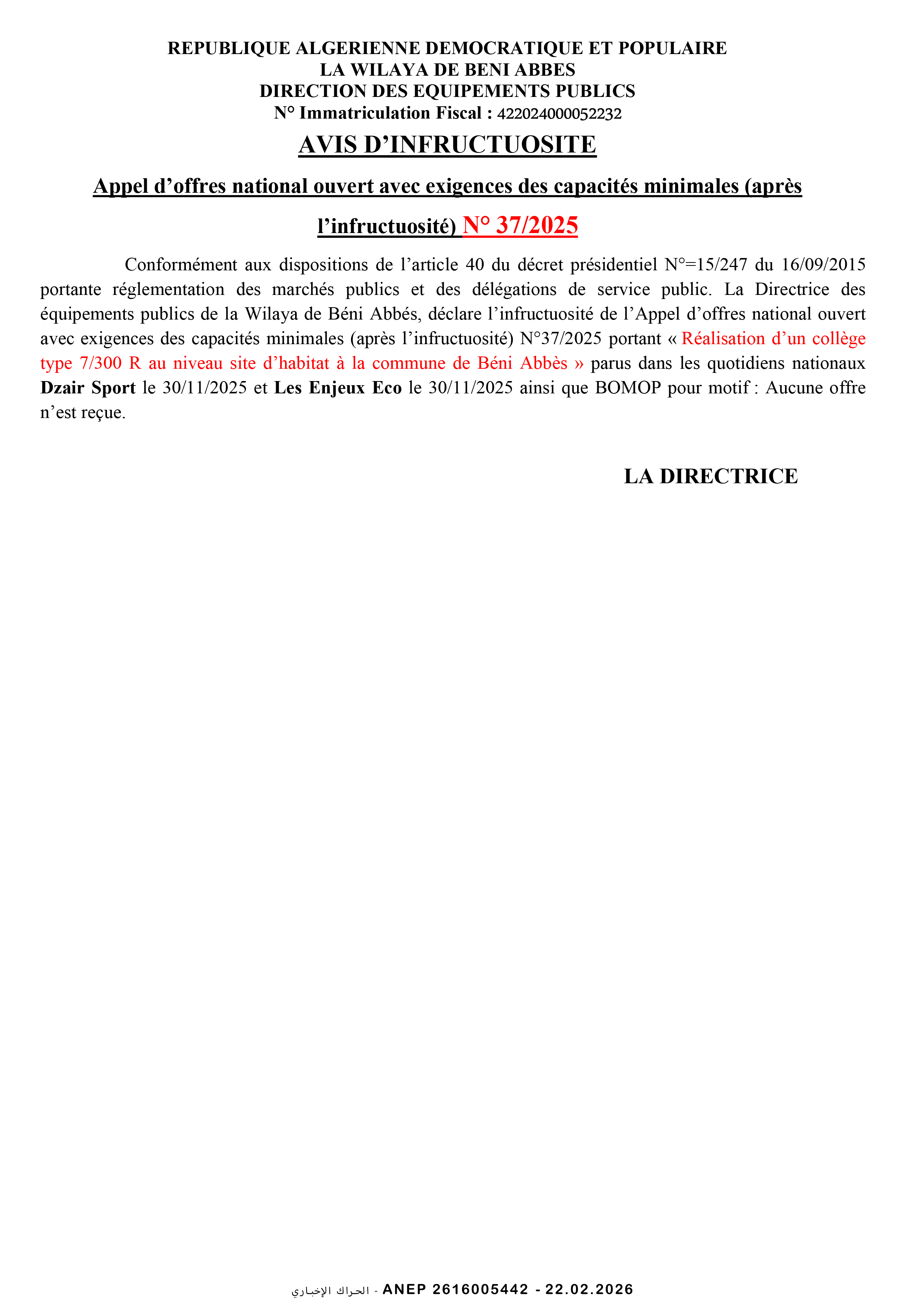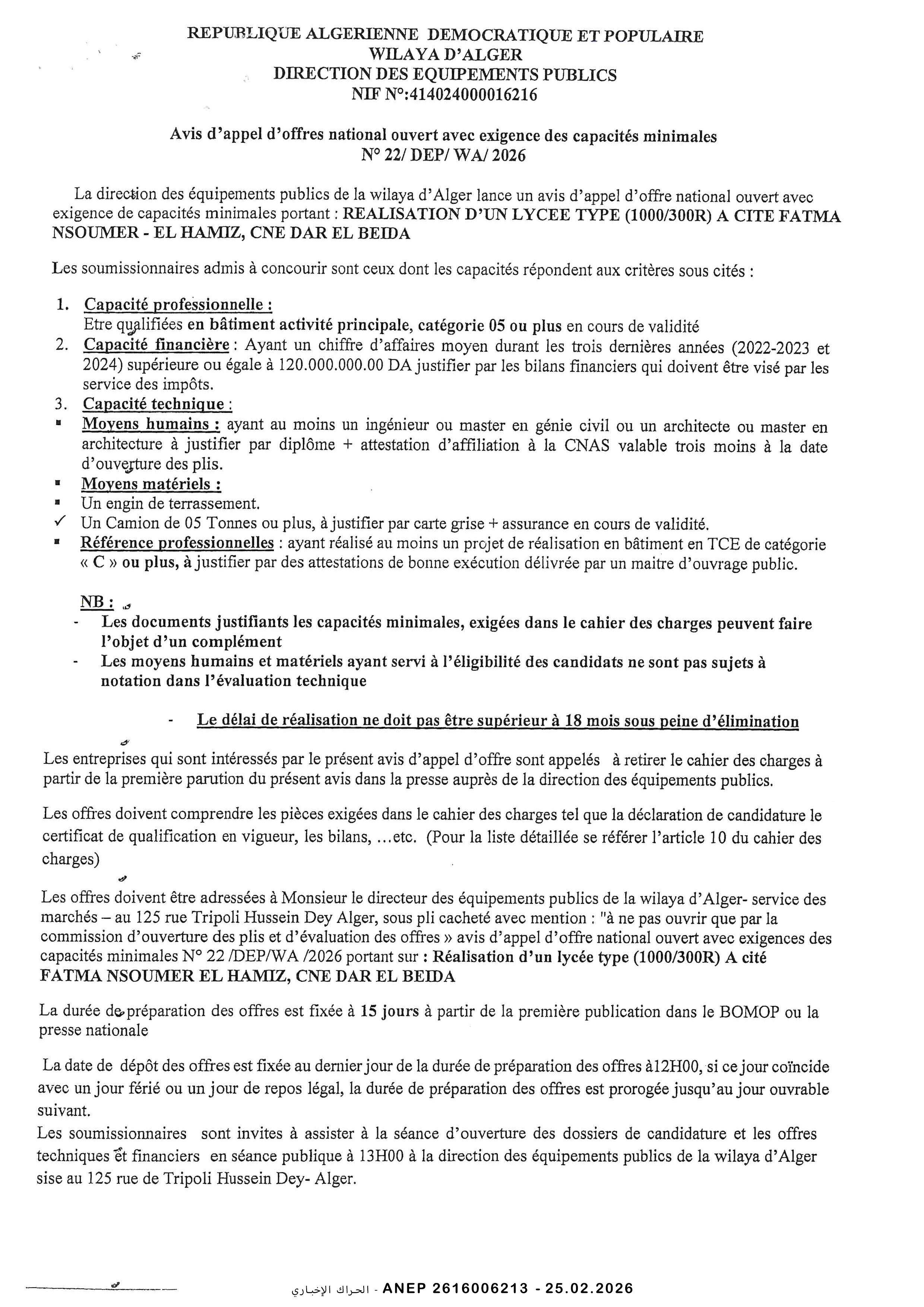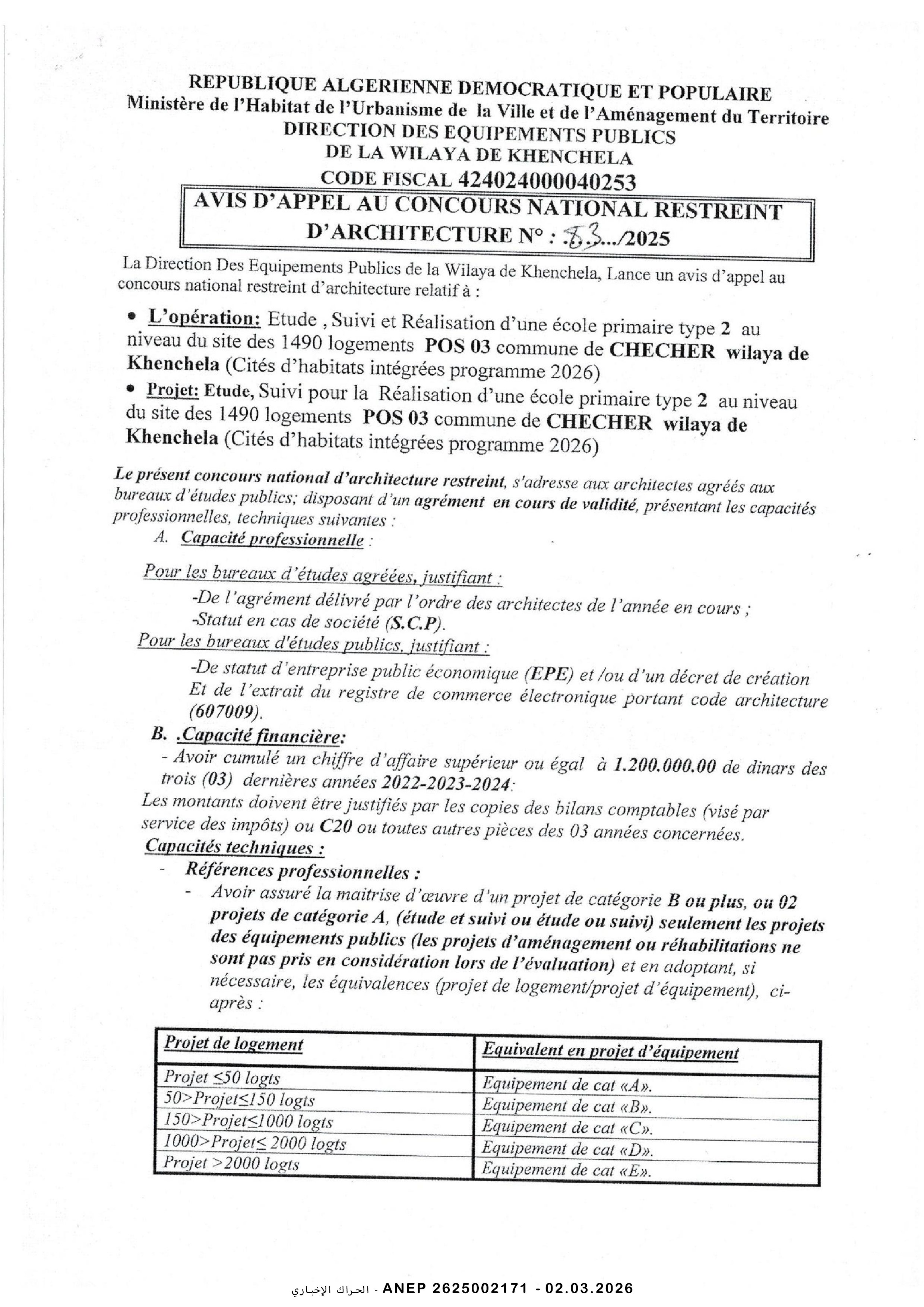 إعلان عن مسابقة وطنية محدودة