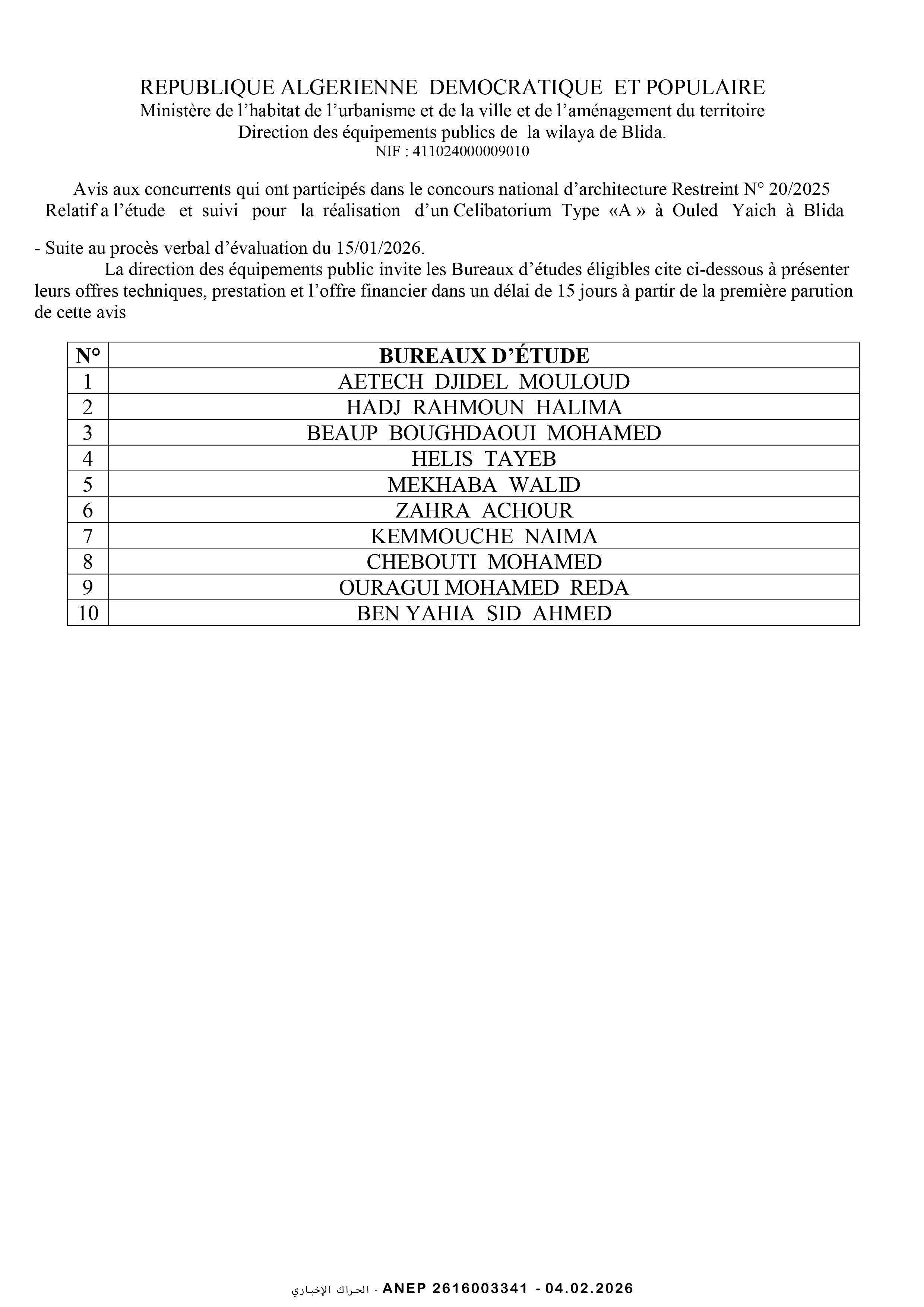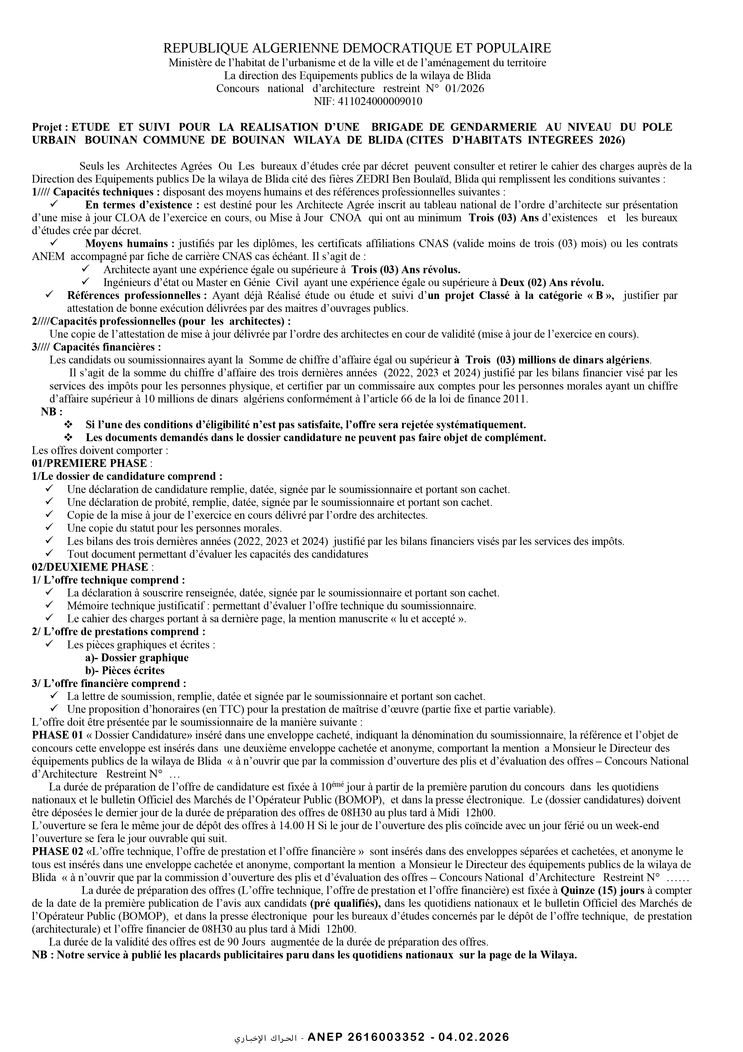 إعلان عن مسابقة الهندسة المعمارية محدودة رقم 2026/01