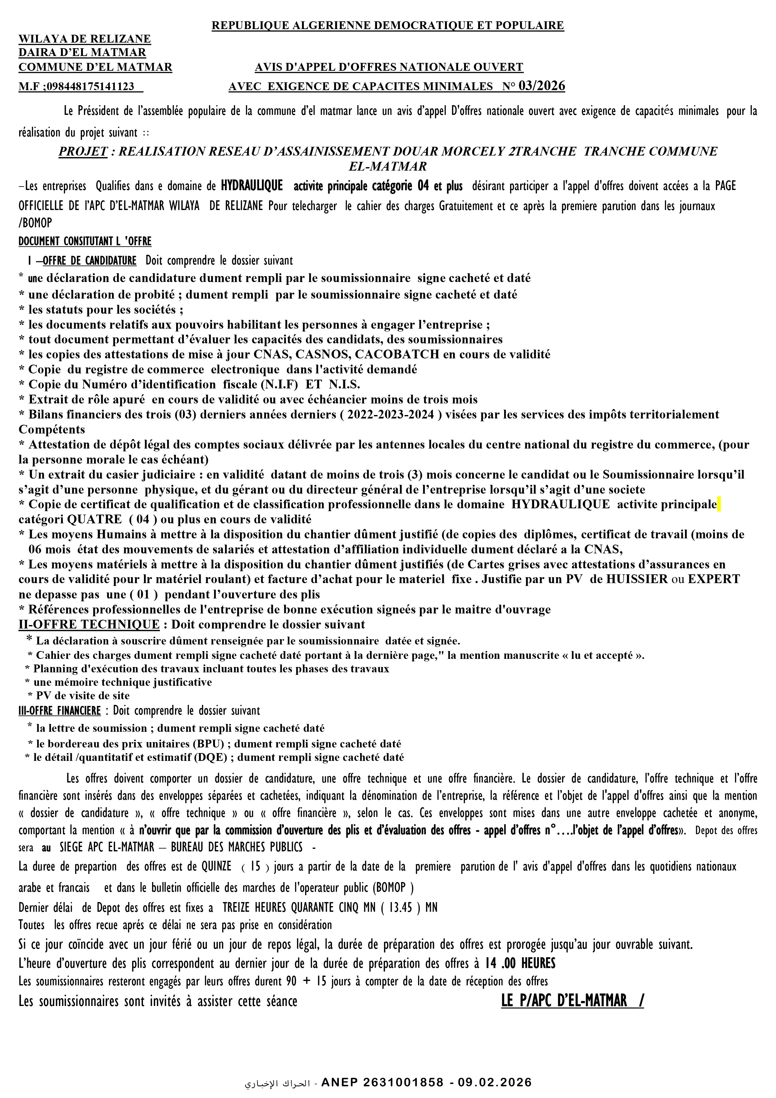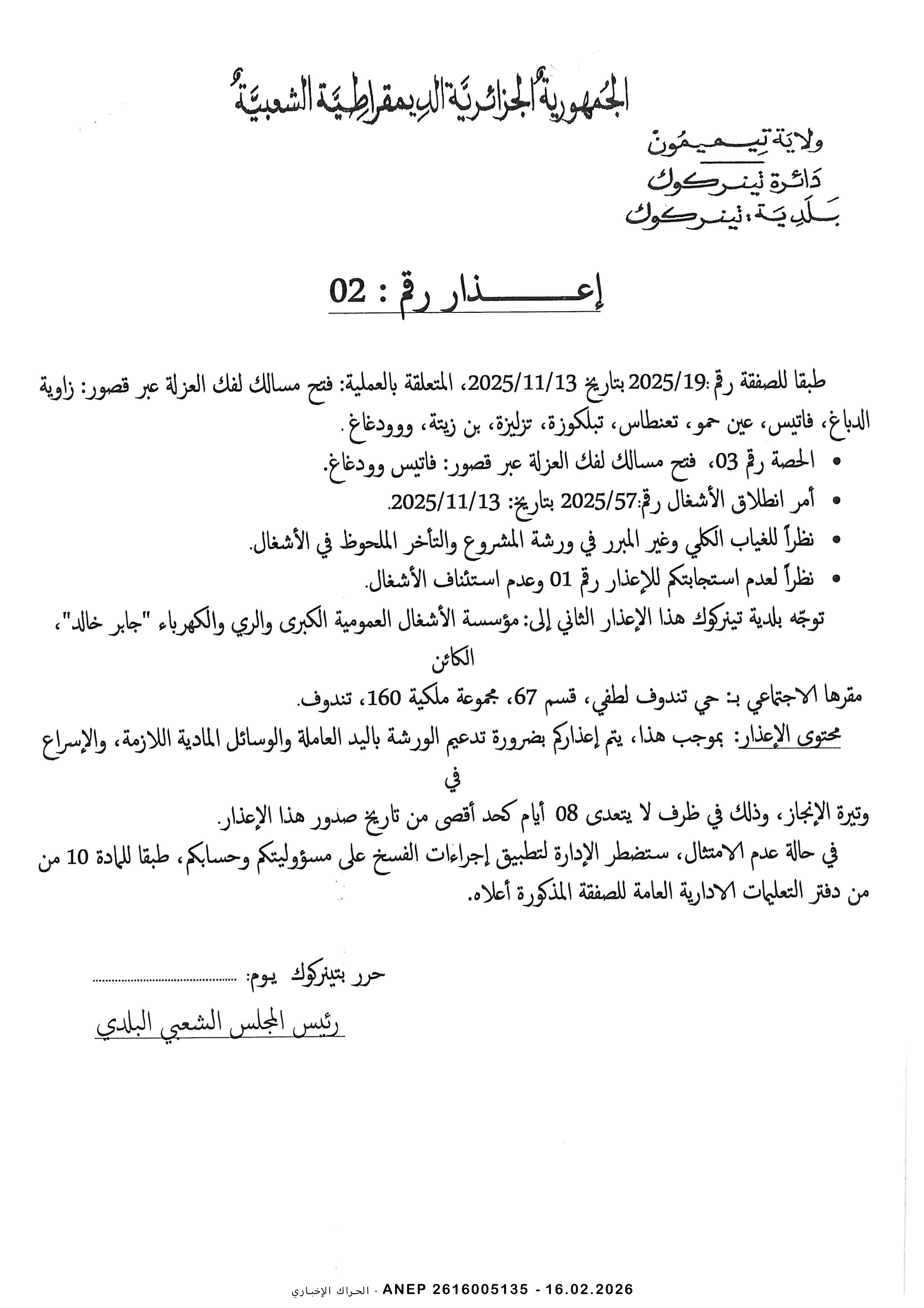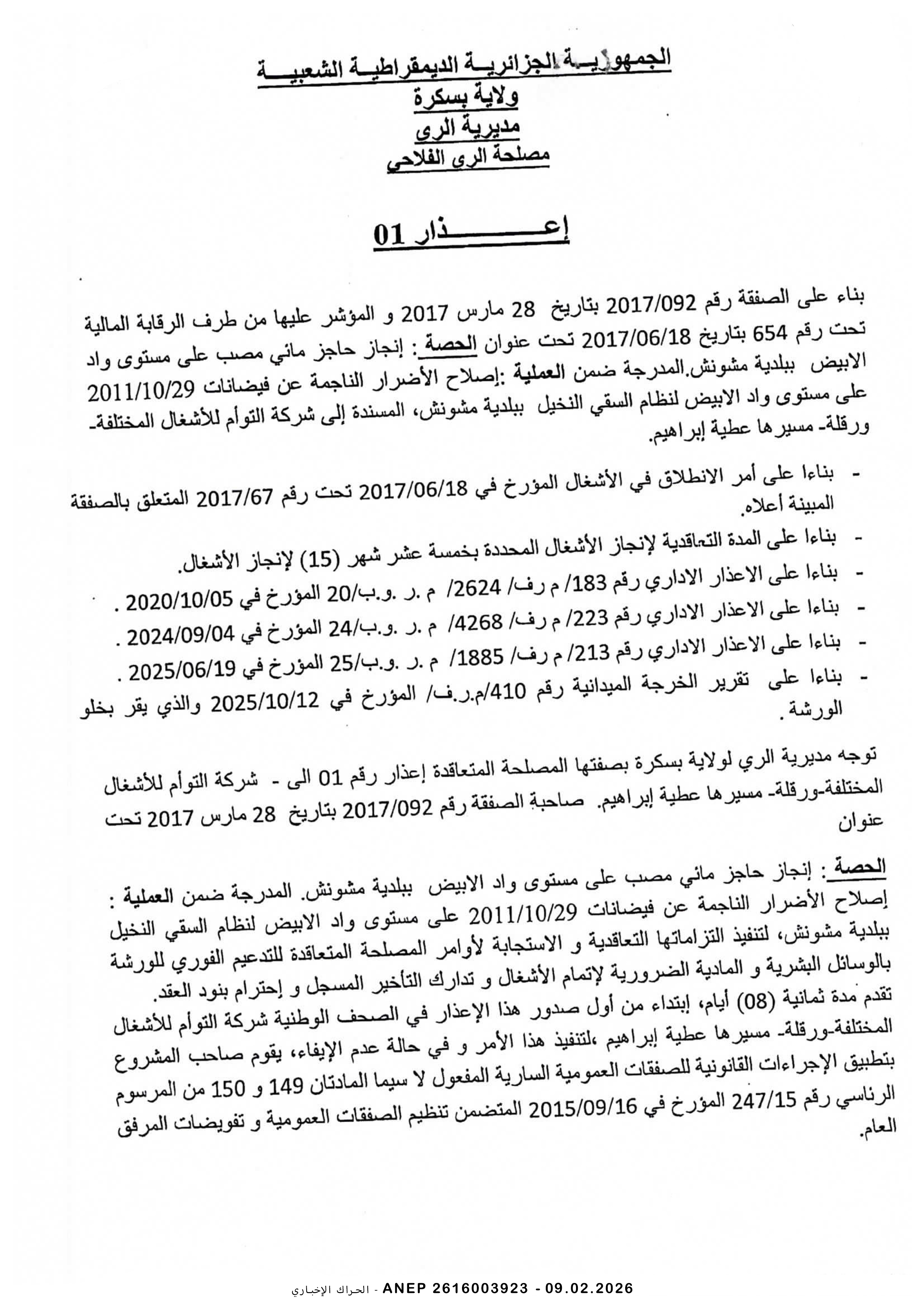 إنجاز حاجز مائي مصب على مستوى واد الأبيض بلدية مشونش