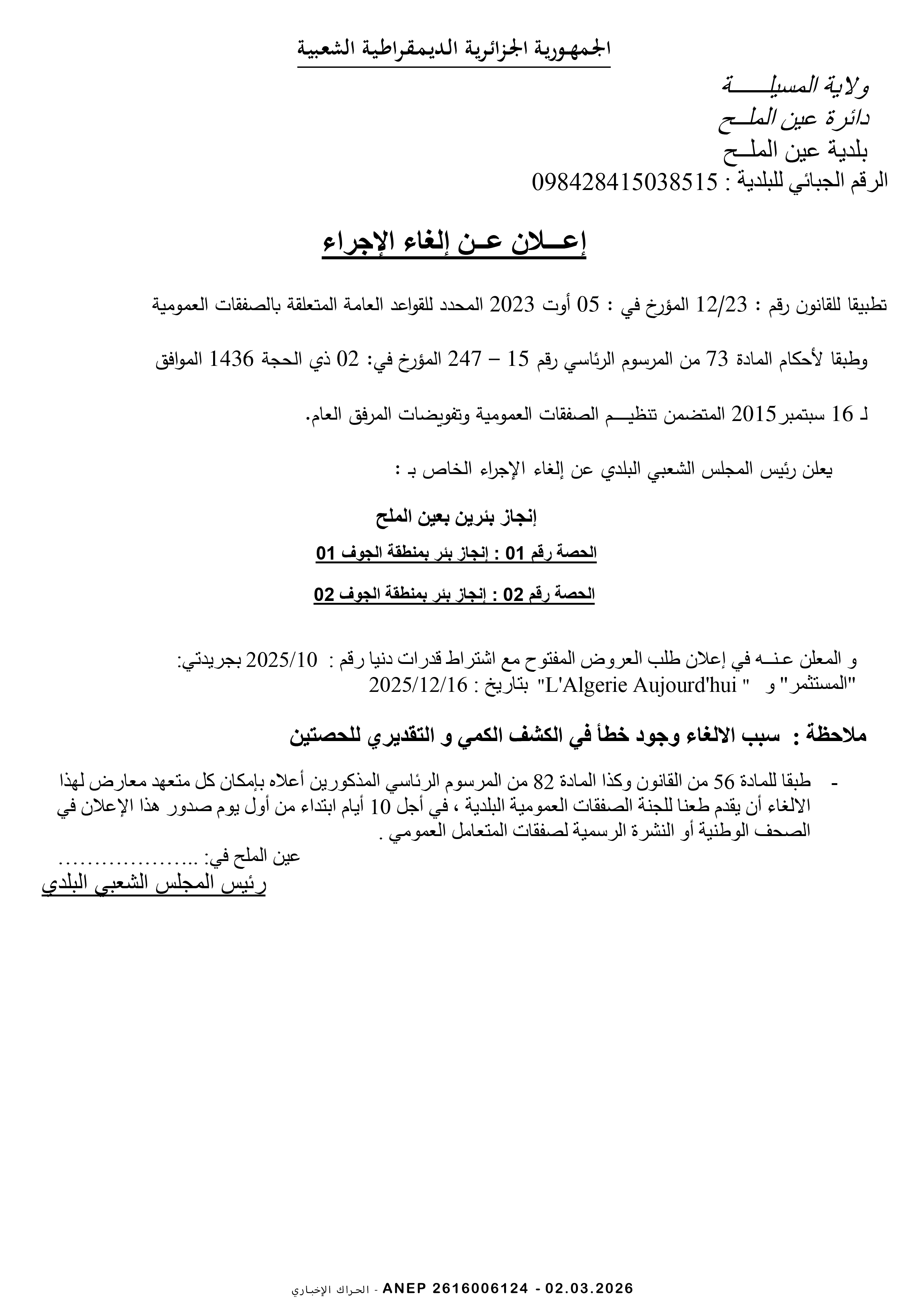 إعلان عن إلغاء الإجراء