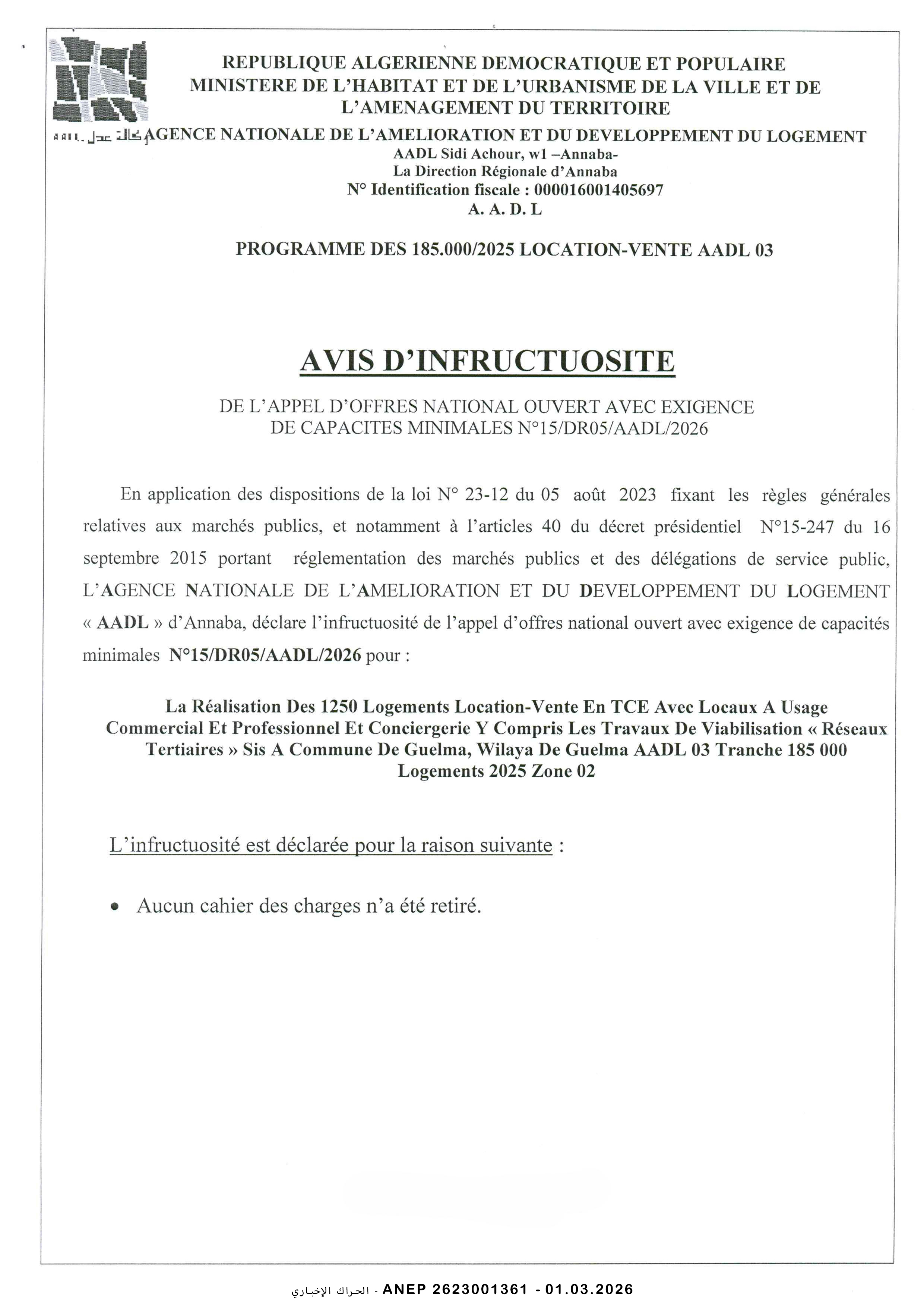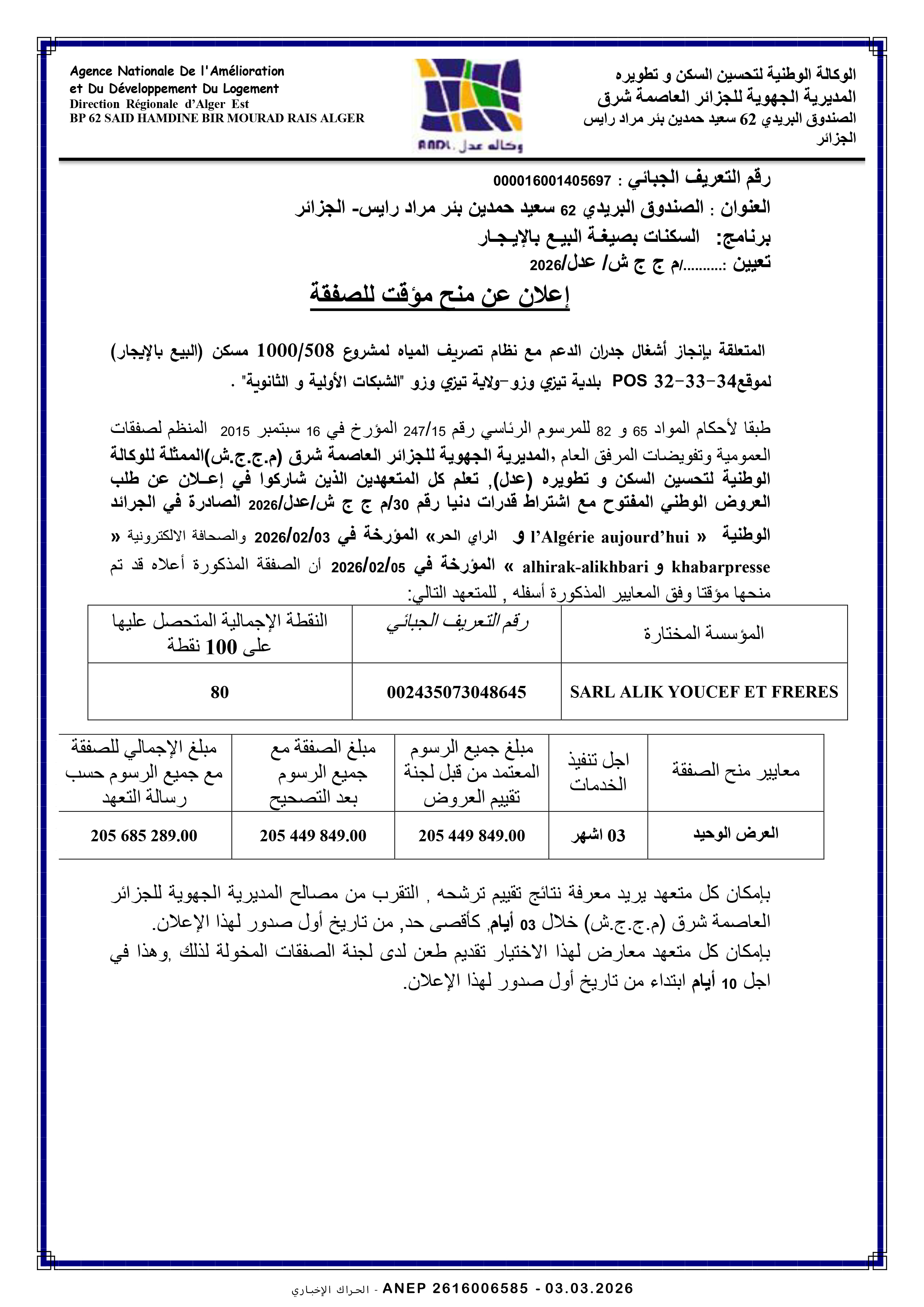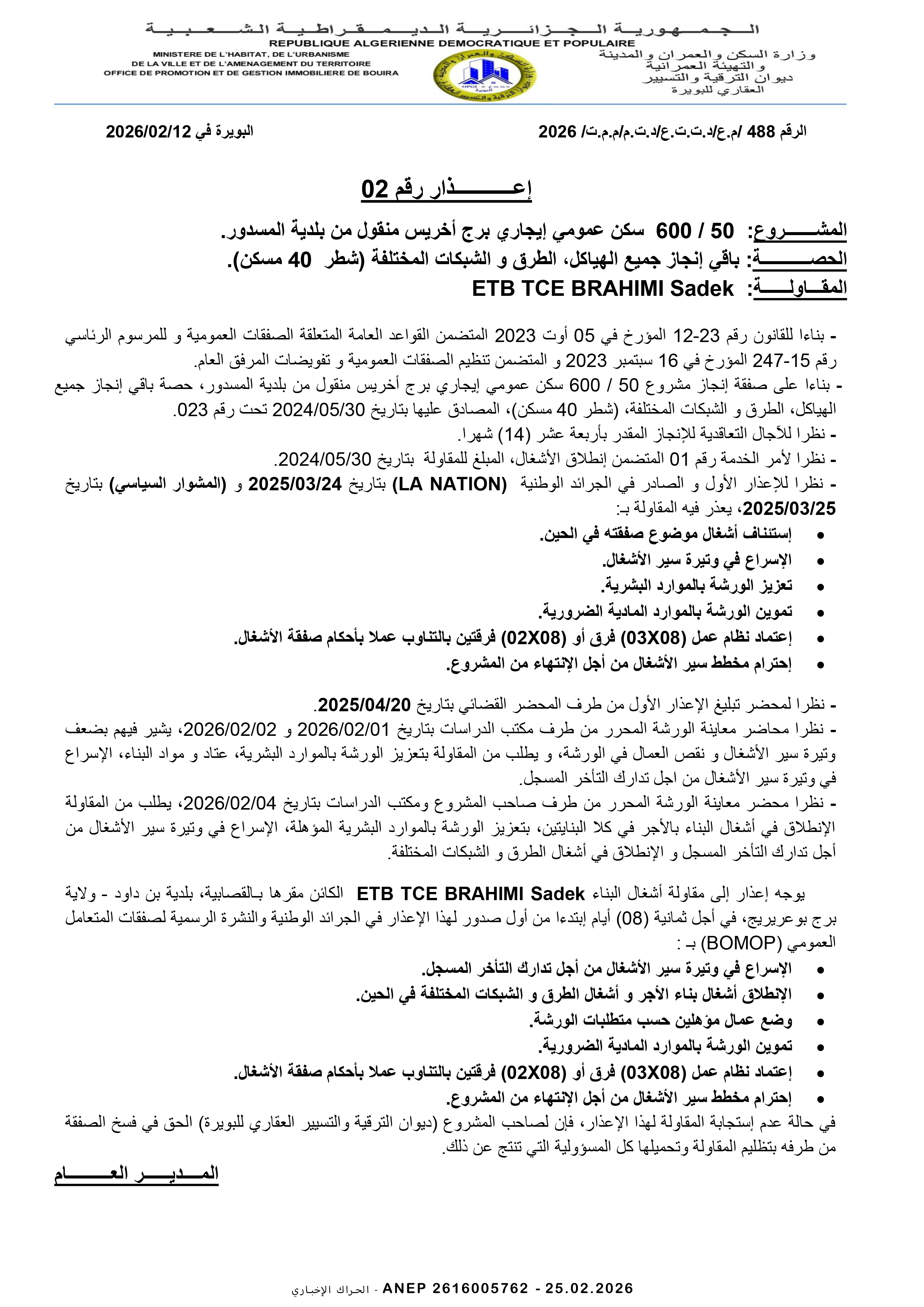 إنجاز 600/50 مسكن عمومي إيجاري برج أخريس