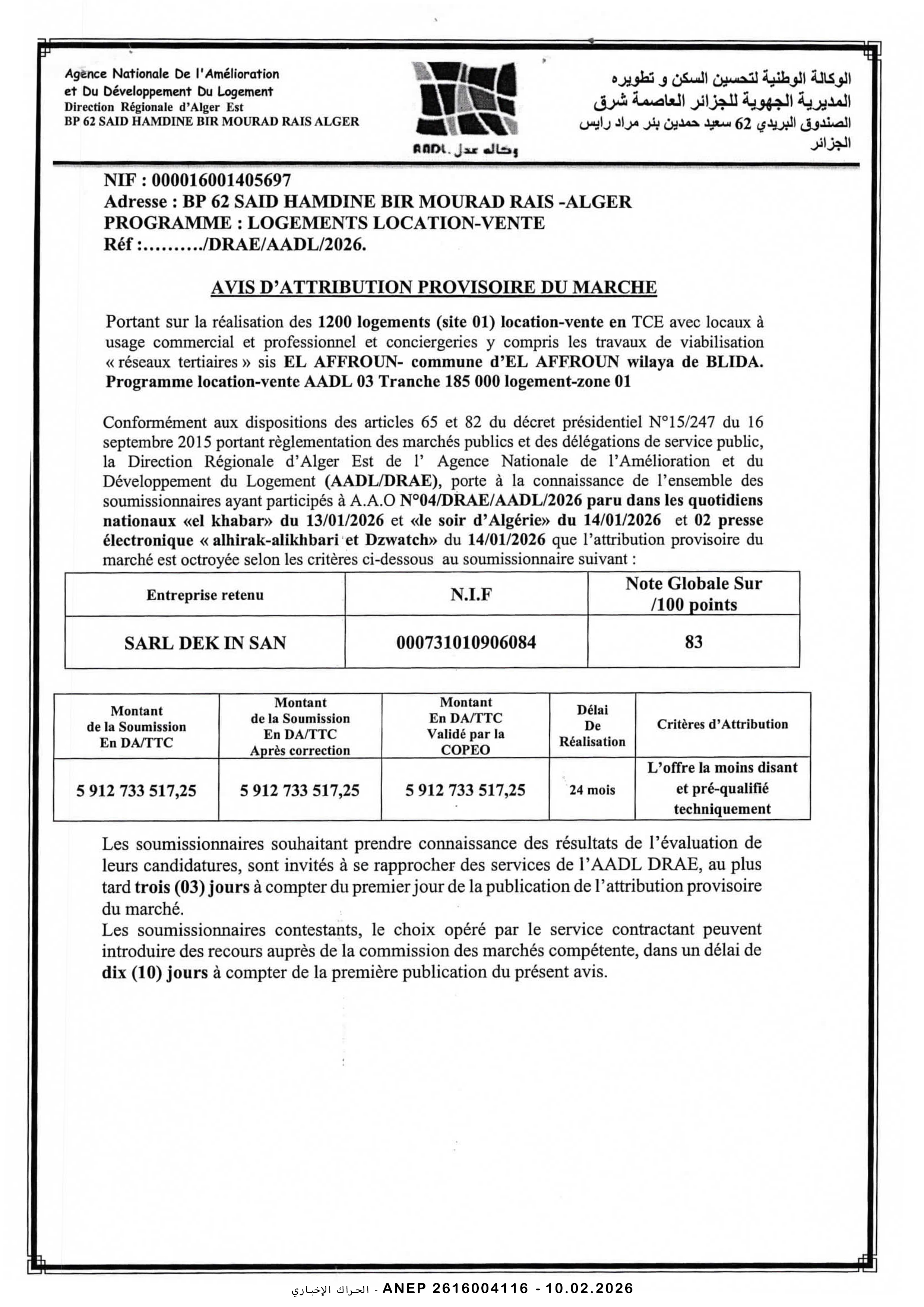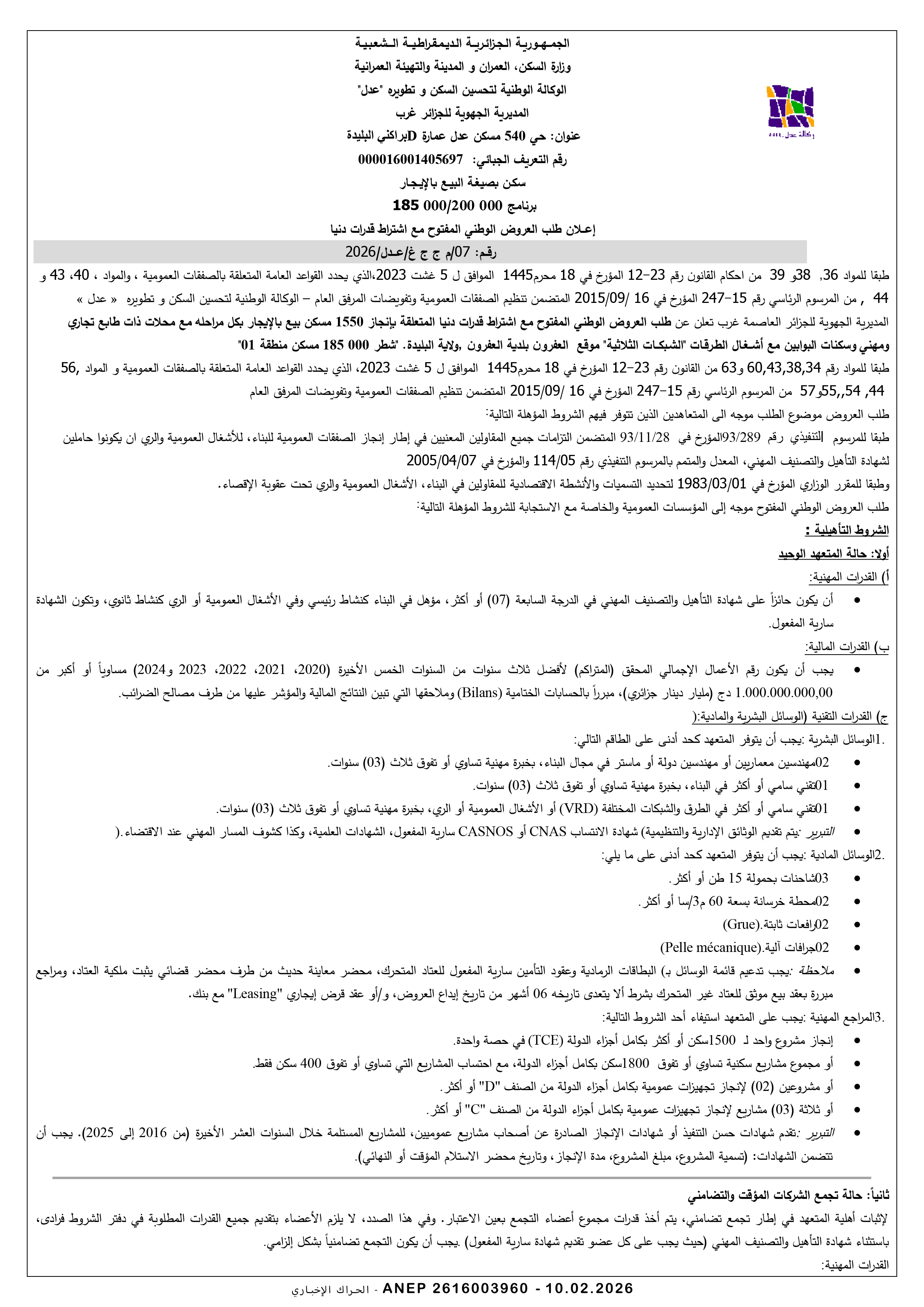 إنجاز 1550 مسكن بيع بالايجار مع محلات و مساكن بوابين و كل المرافق بلدية العفرون - البليدة
