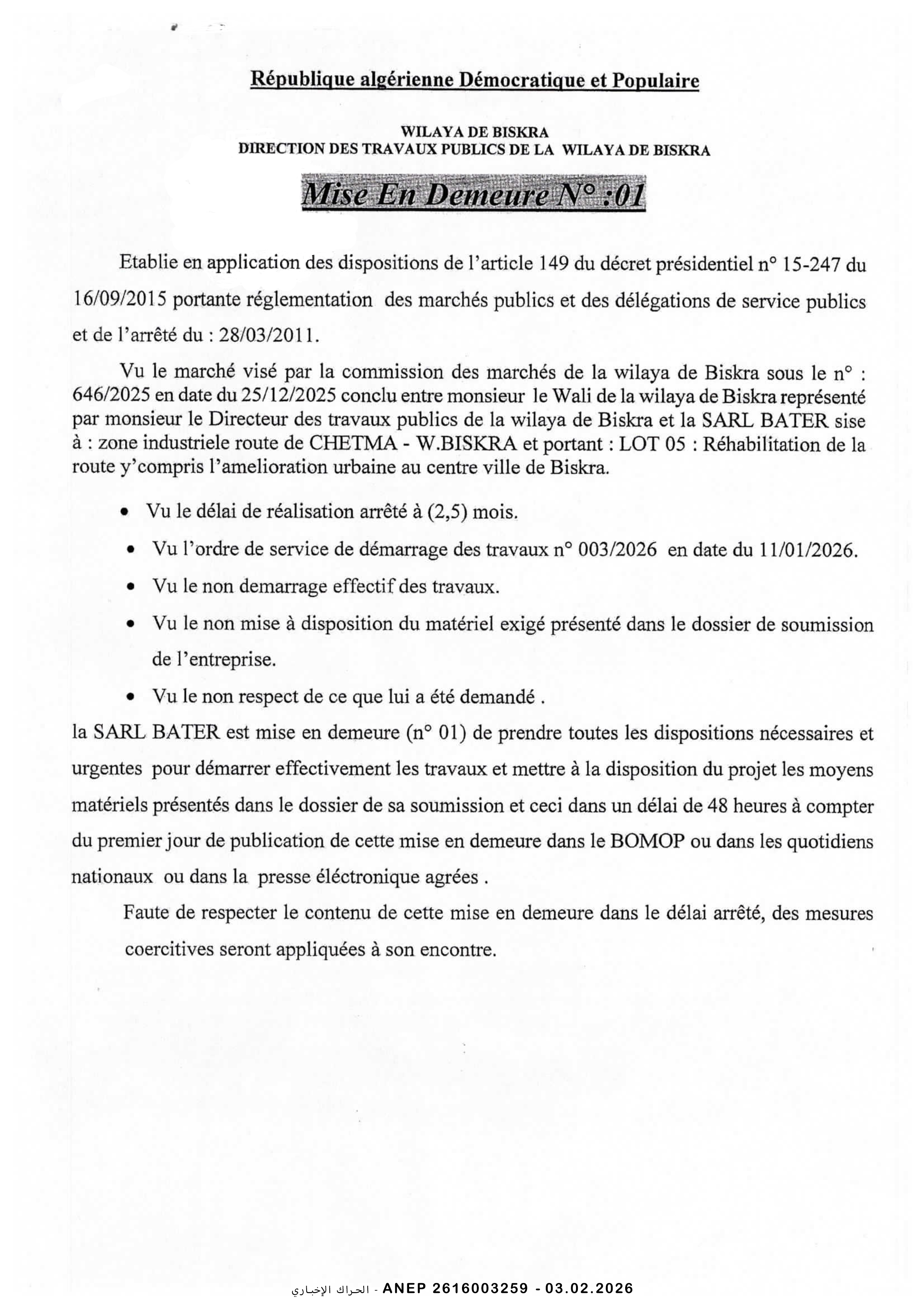 إعذار رقم 02 لمؤسسة بلعيش أمين