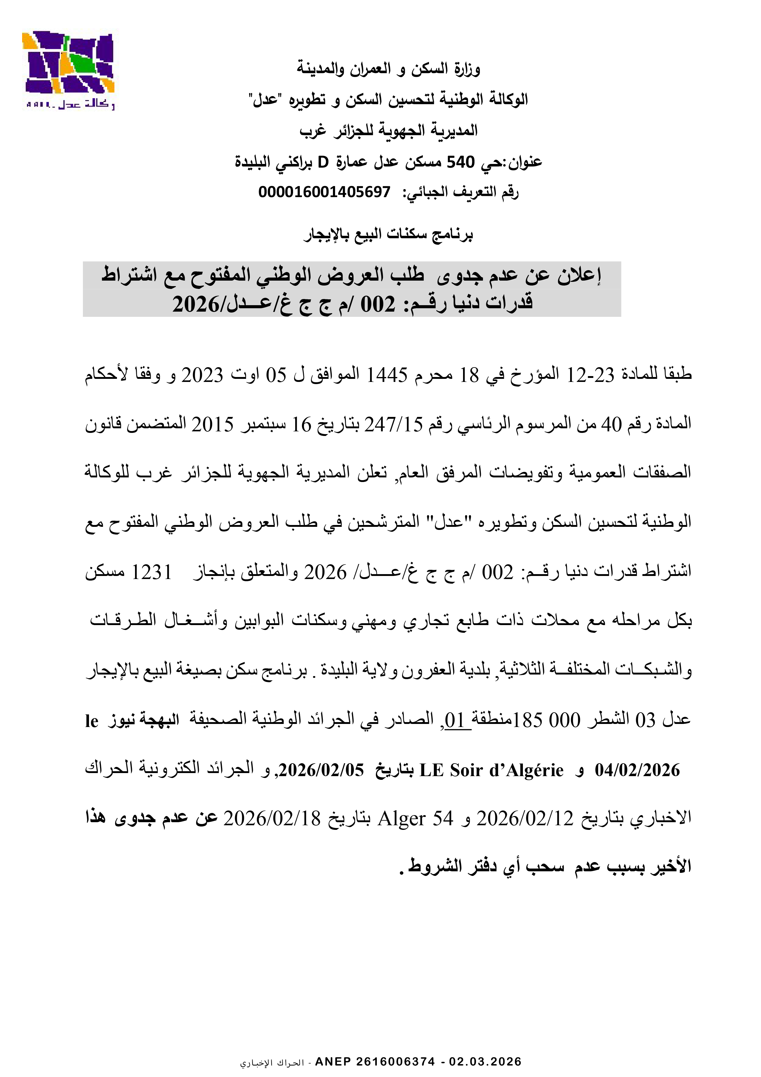وكالة عدل المديرية الجهوية الجزائر غرب
