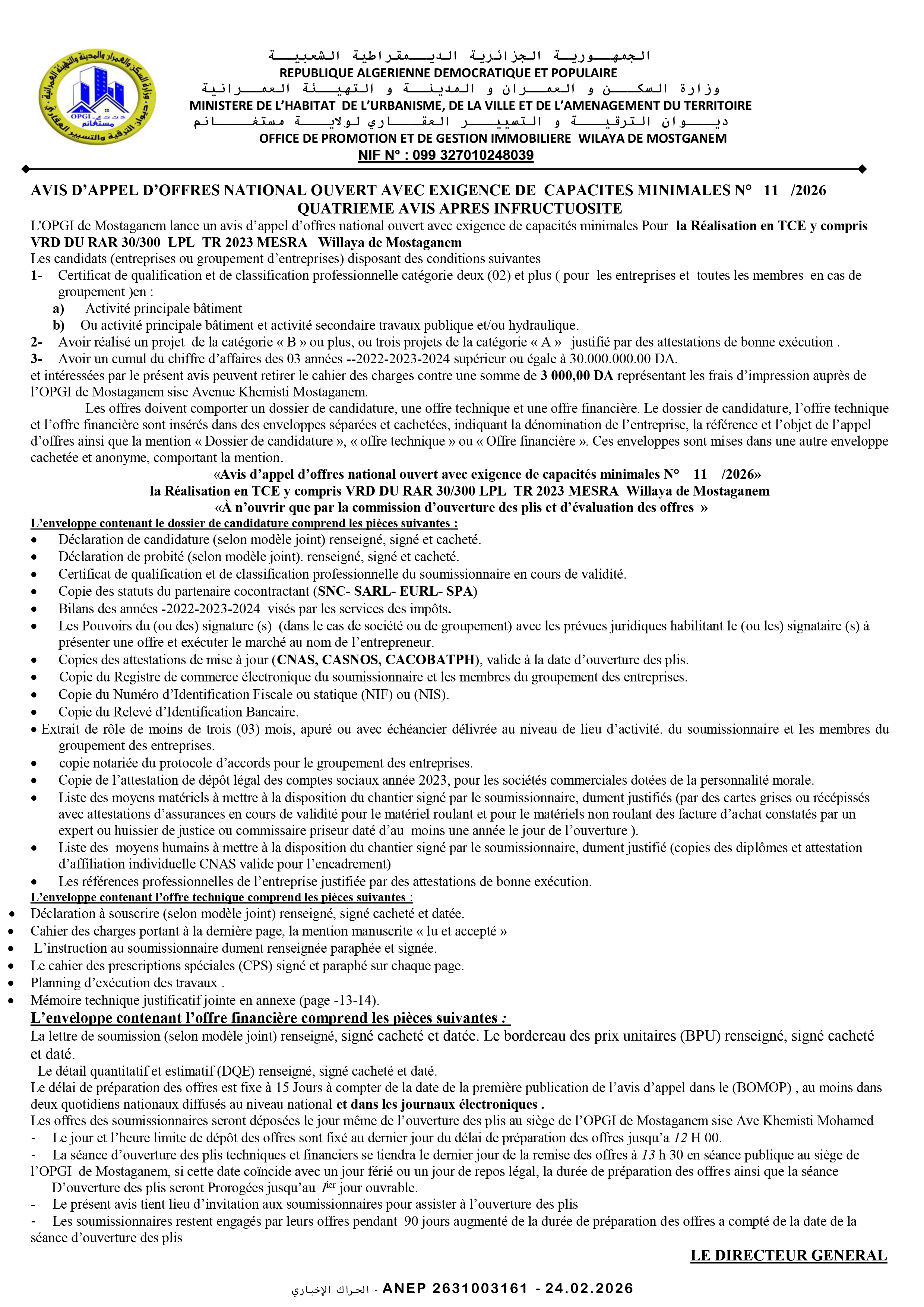 إنجاز ما تبقى من أشغال 30 مسكن عمومي إيجاري مع أشغال كل المرافق و الشبكات المختلفة