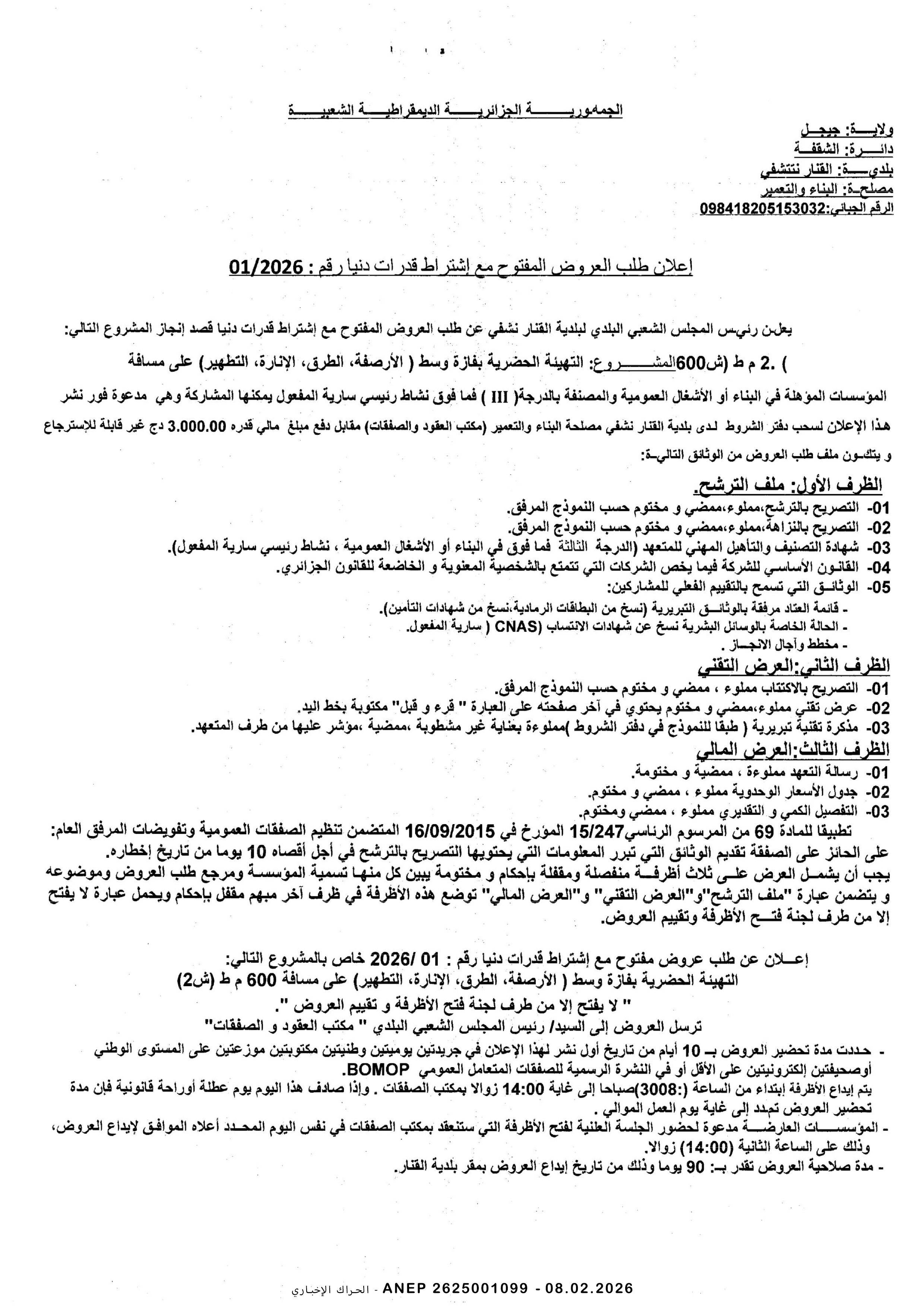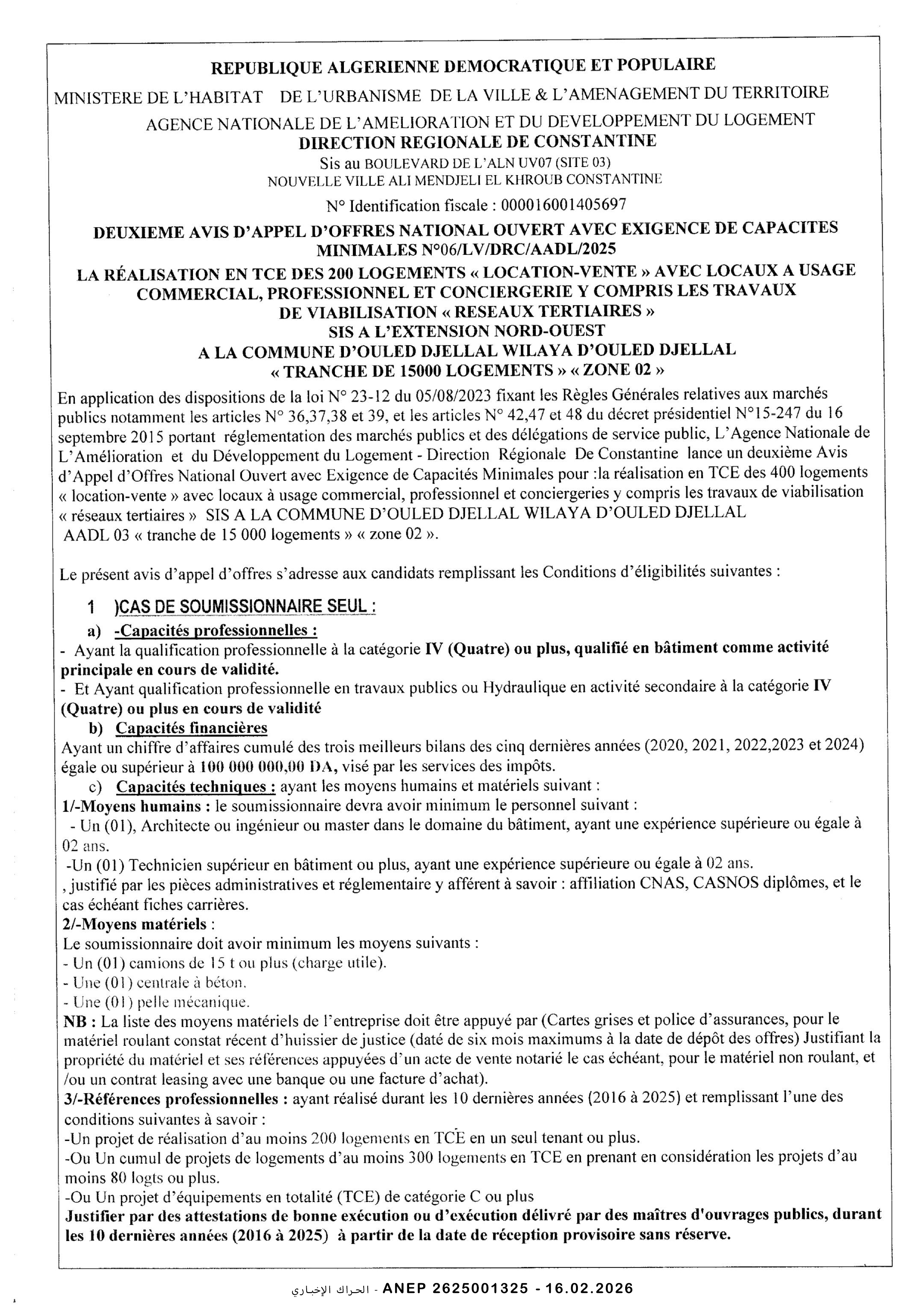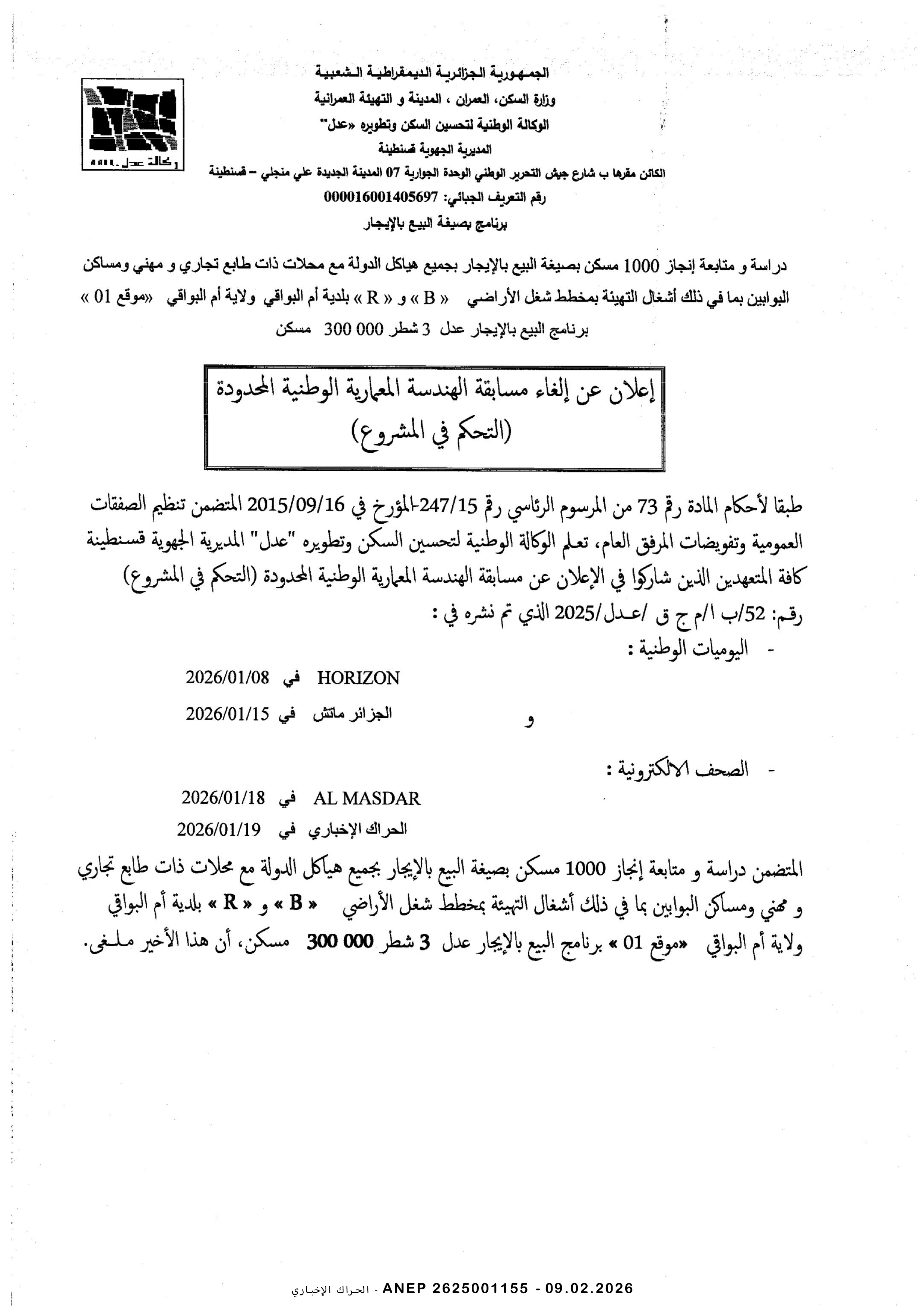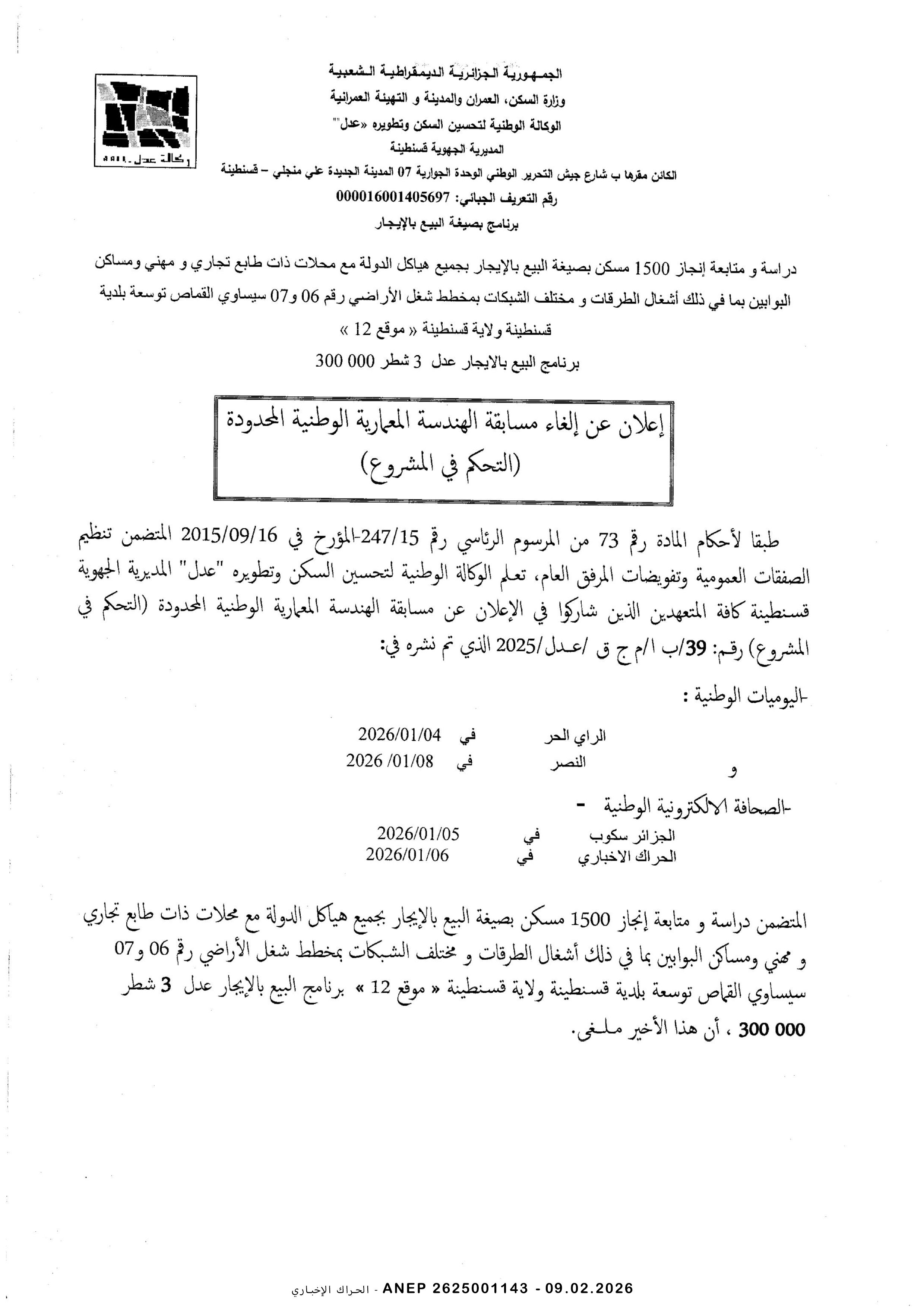 إنجاز 1500 مسكن بيع بالايجار مع محلات و مساكن للبوابين و كل المرافق بلدية قسنطينة
