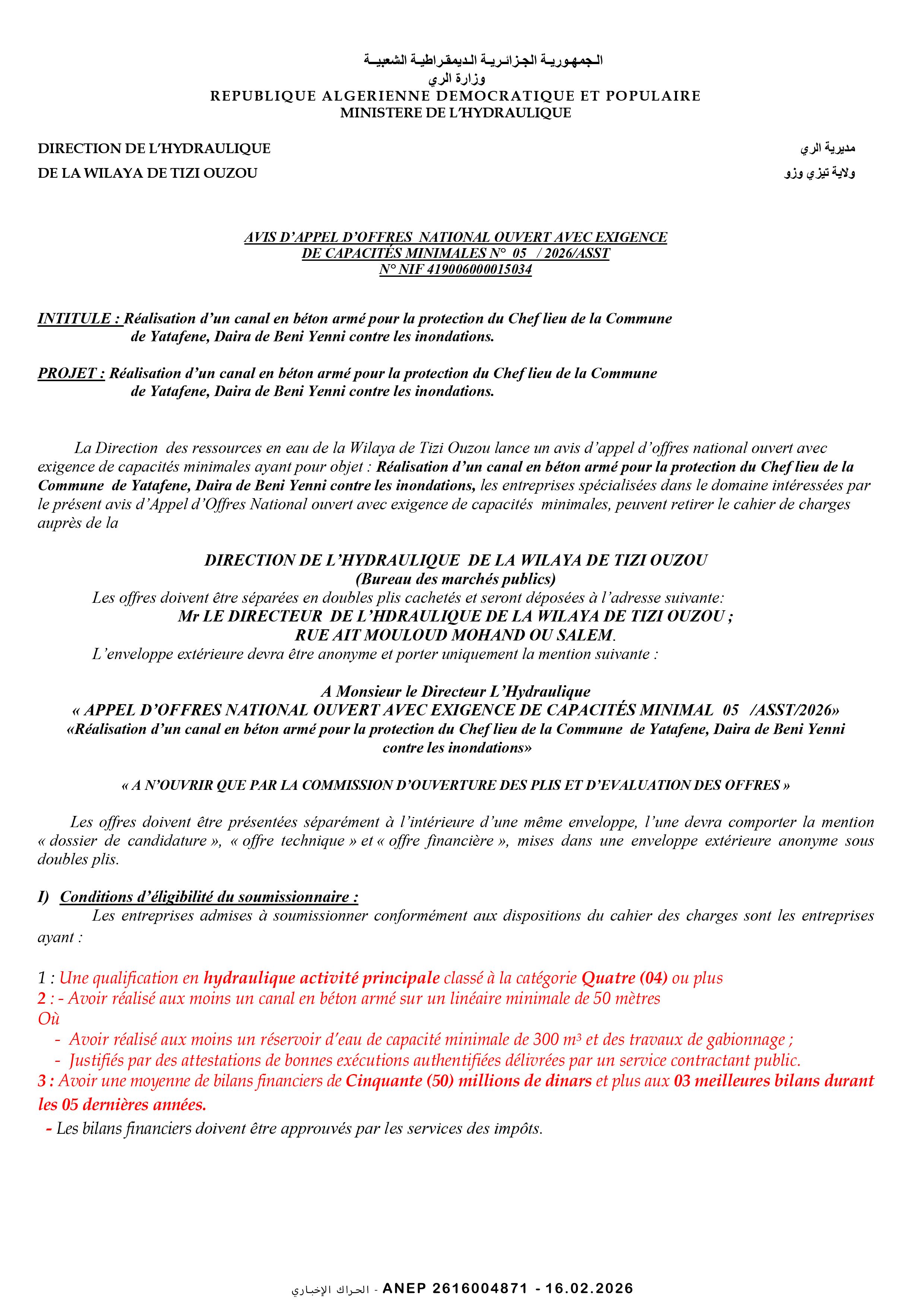 إنشاء قناة بالخرسانة المسلحة بلدية يطافن ولاية تيزي وزو