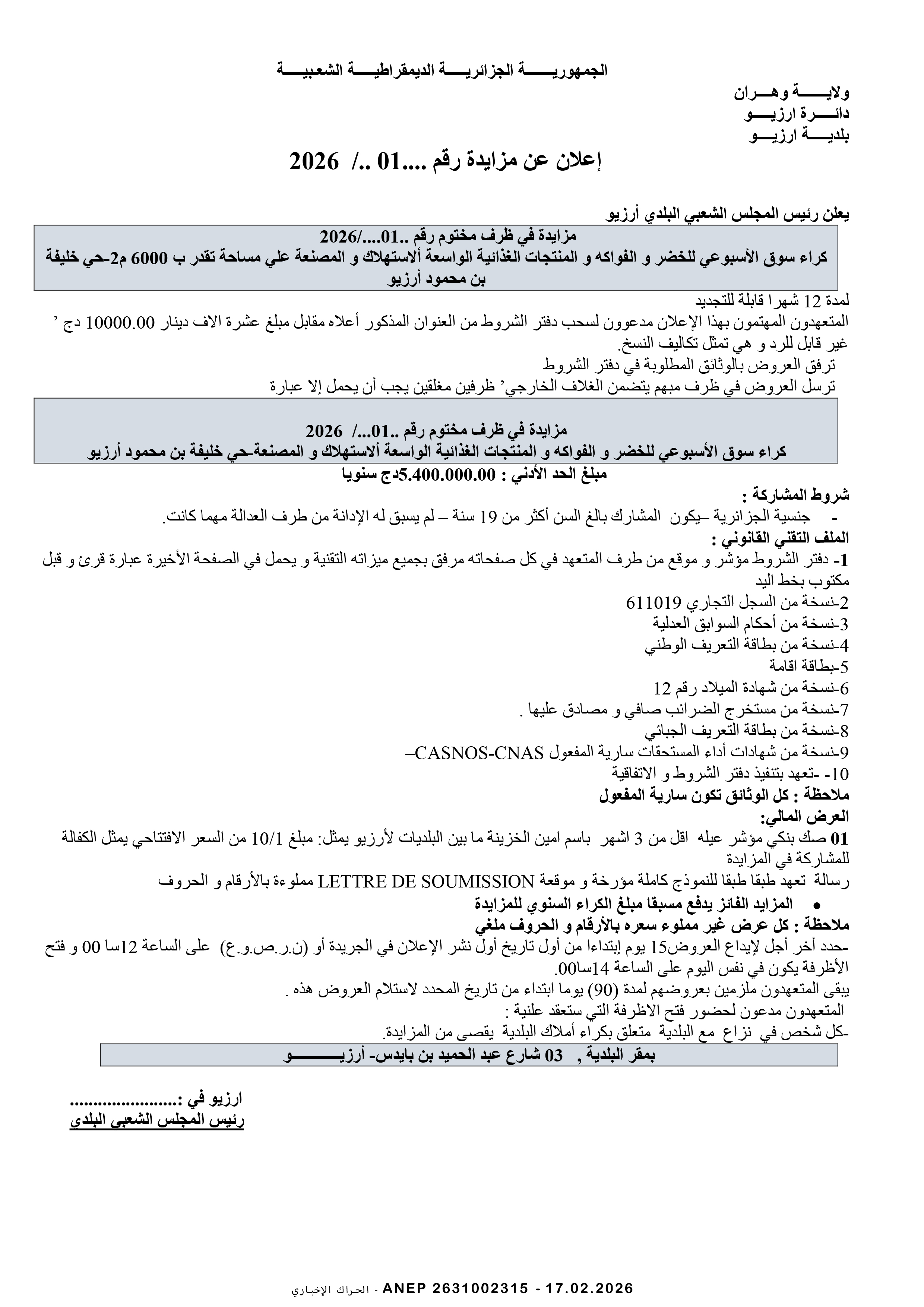 كراء سوق أسبوعي للخضر و الفواكه و المنتجات الغذائية
