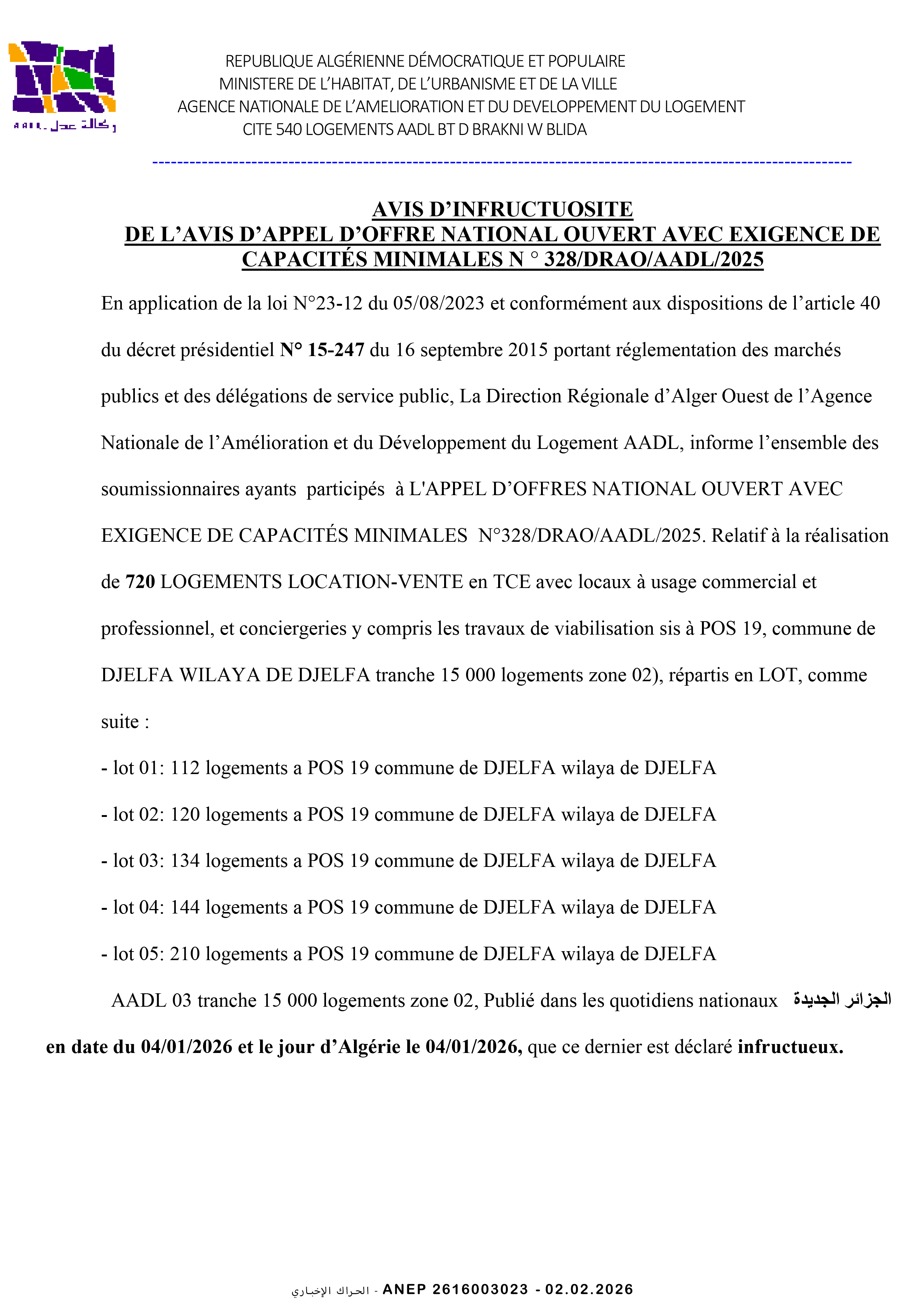 إعلان عن إلغاء طلب عروض وطني مفتوح مع اشتراط قدرات دنيا رقم 2025/04